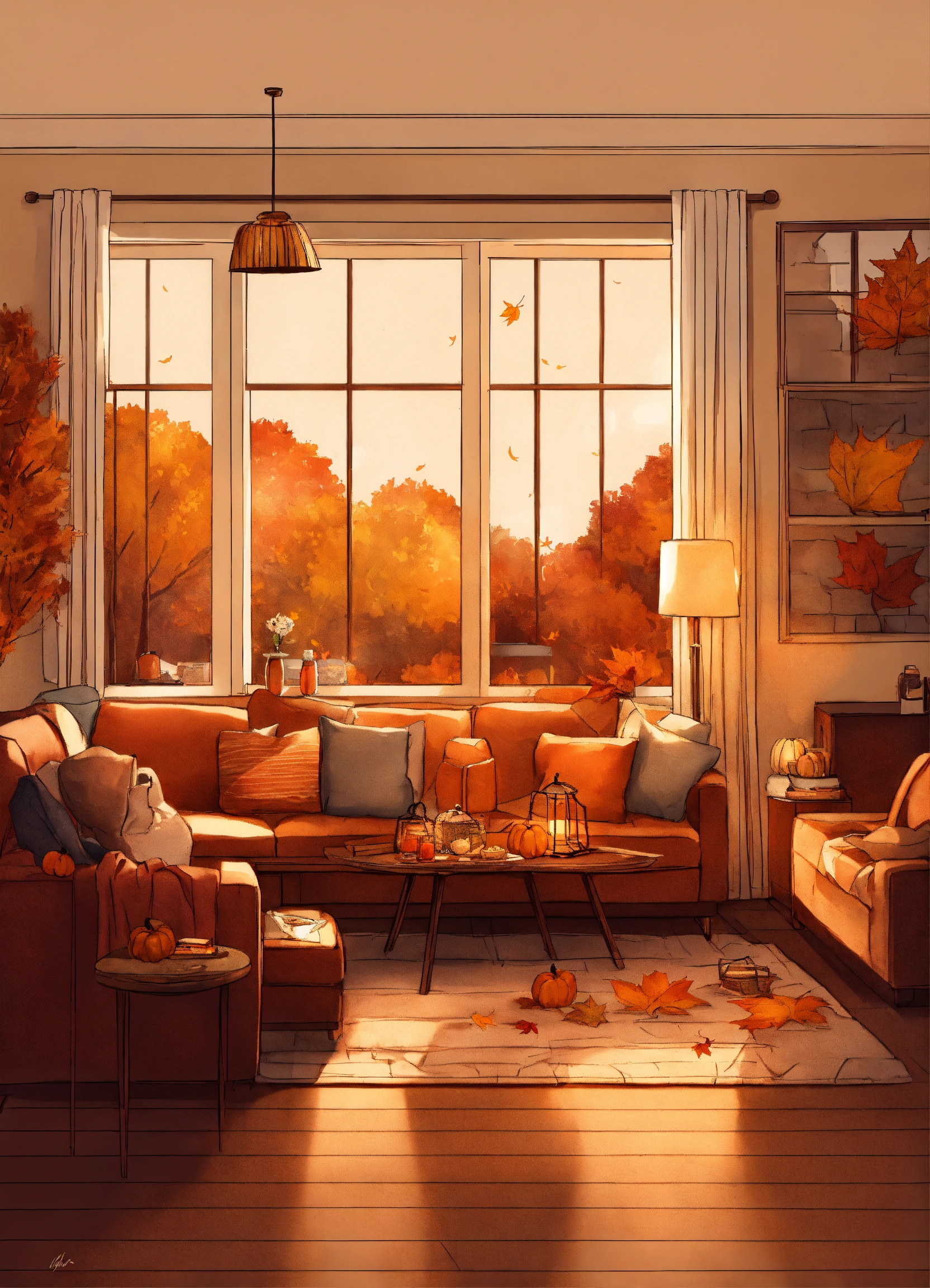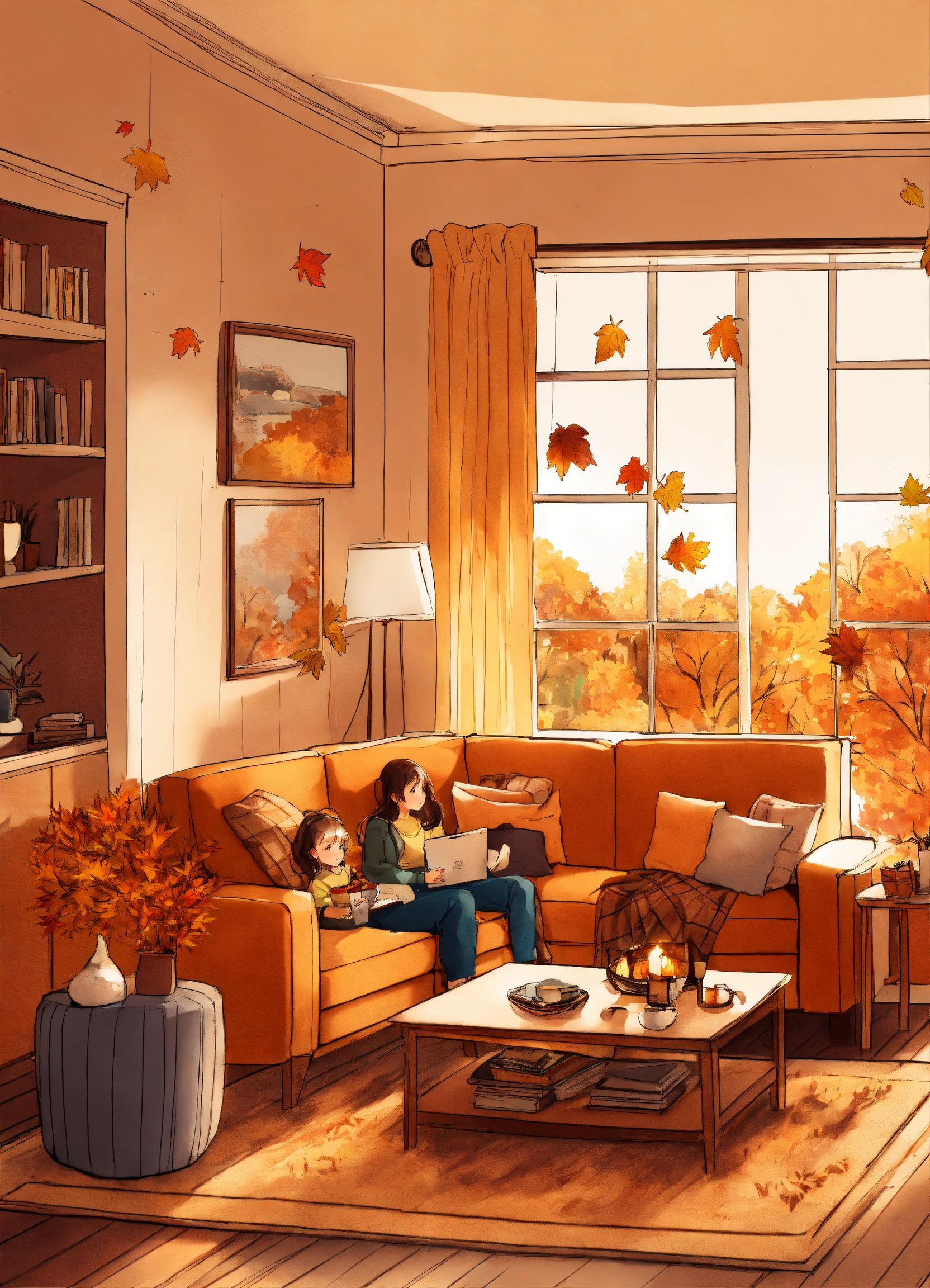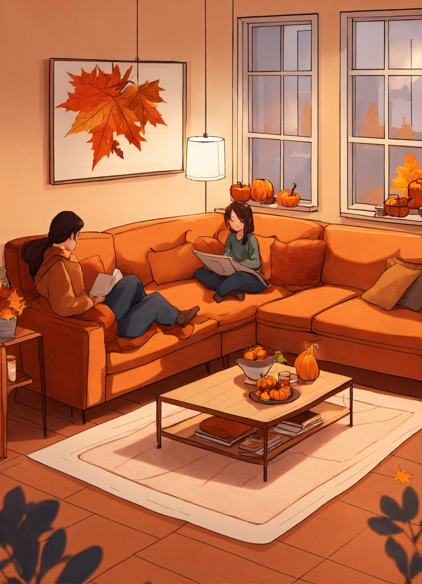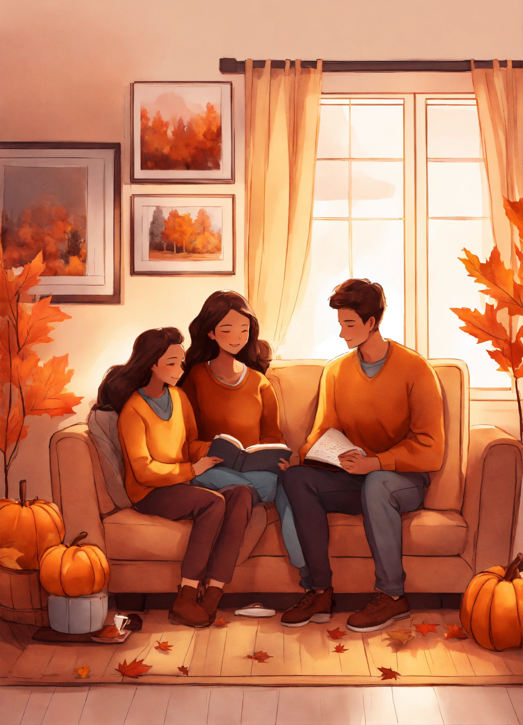 A drawing a cozy, autumn-themed living room with warm lighting and comfy seating with family sitting together on the sofa, on a white background
