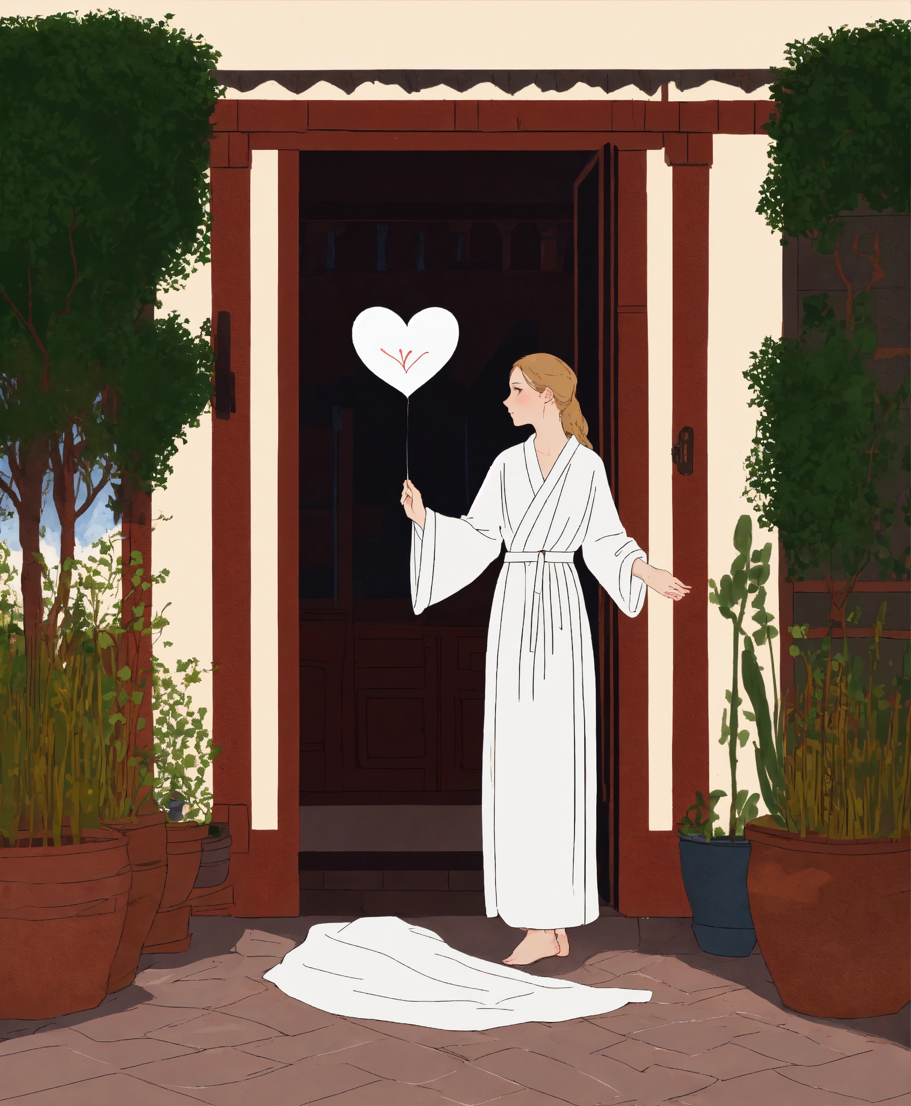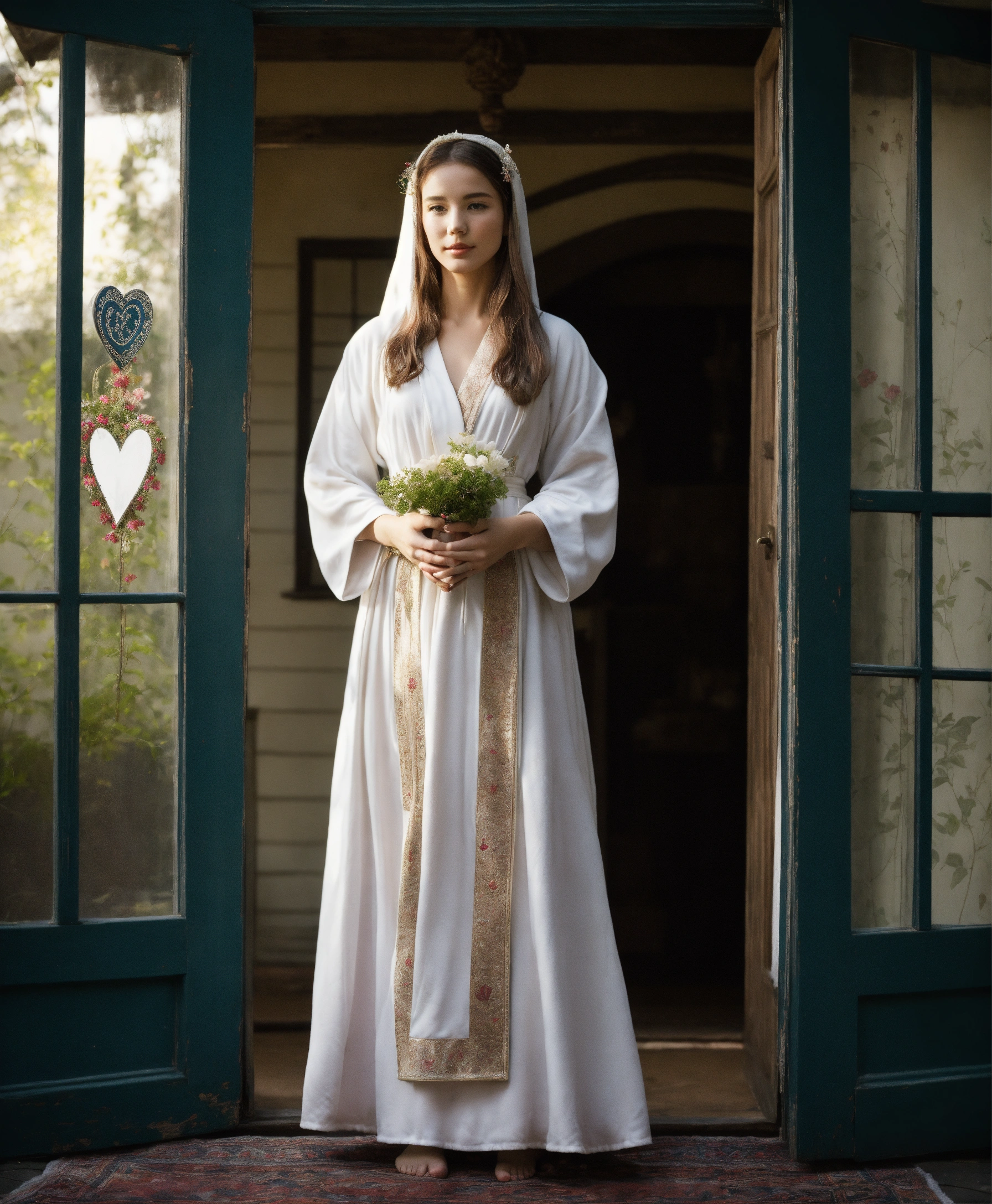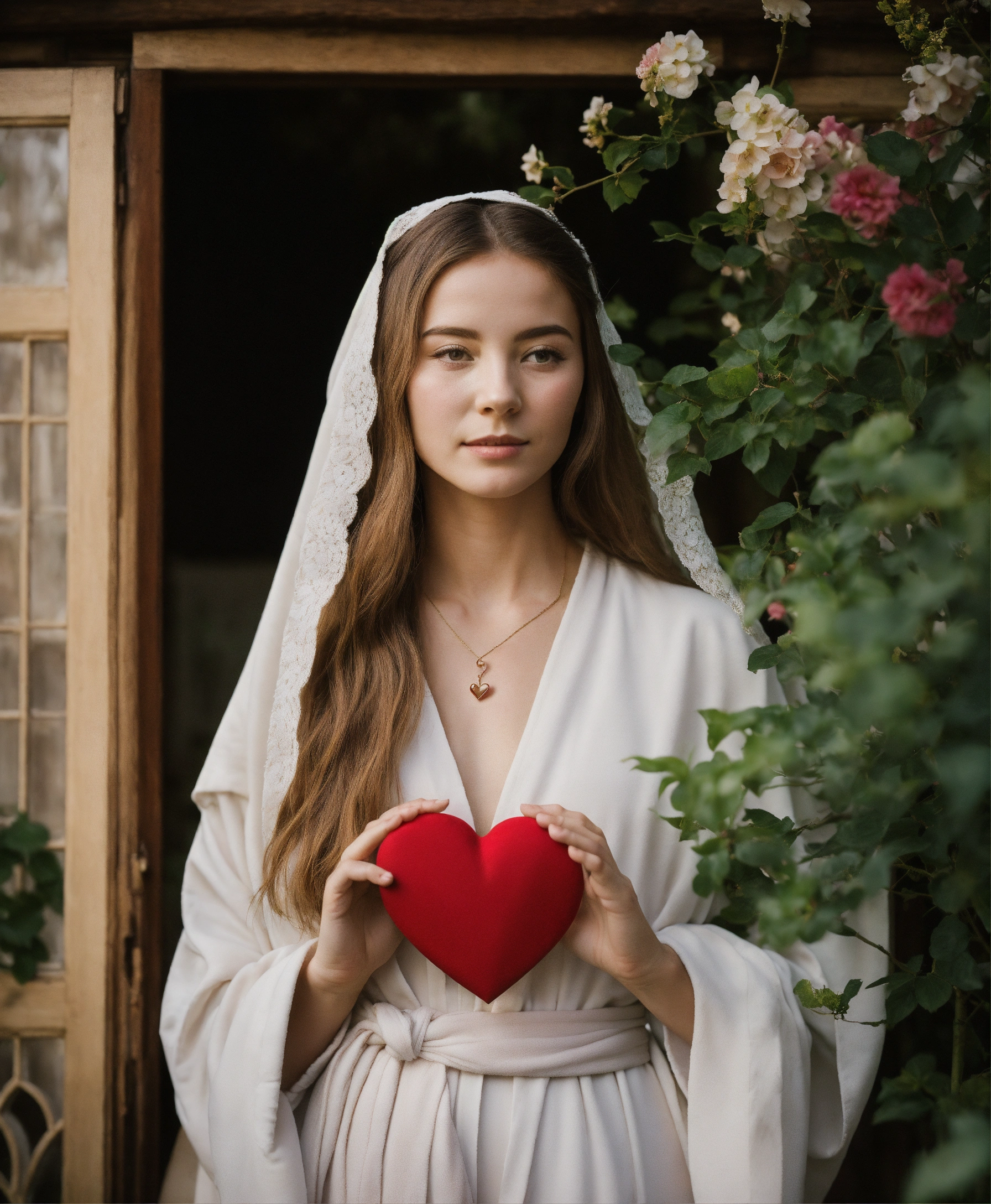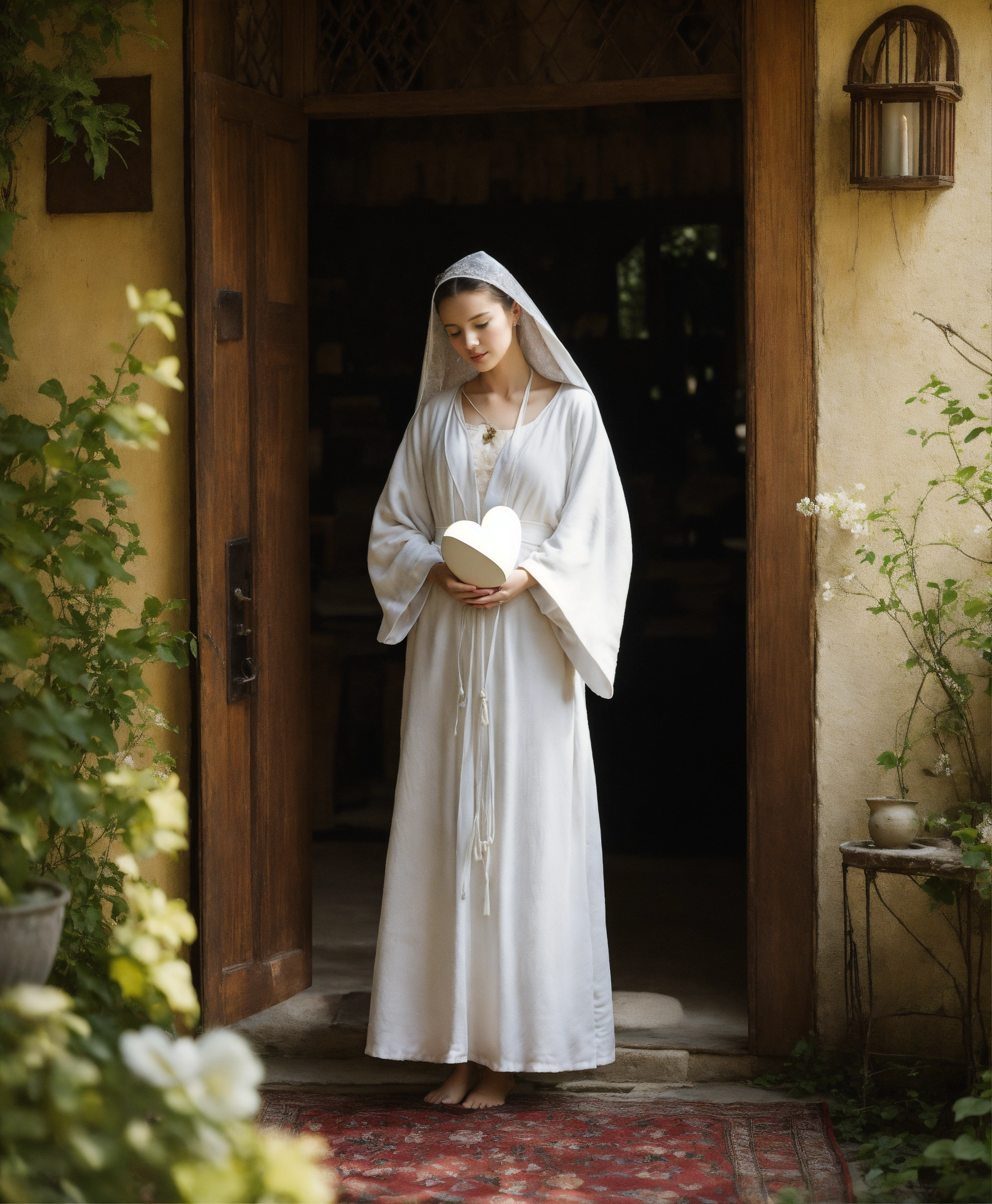 In front of the door of an old house with a beautiful garden around it, a young white woman, without a veil, she wears a traditional robe. she faces back and holds the white heart up with her hands, saying, "our heart is not black, rather, it is white."
