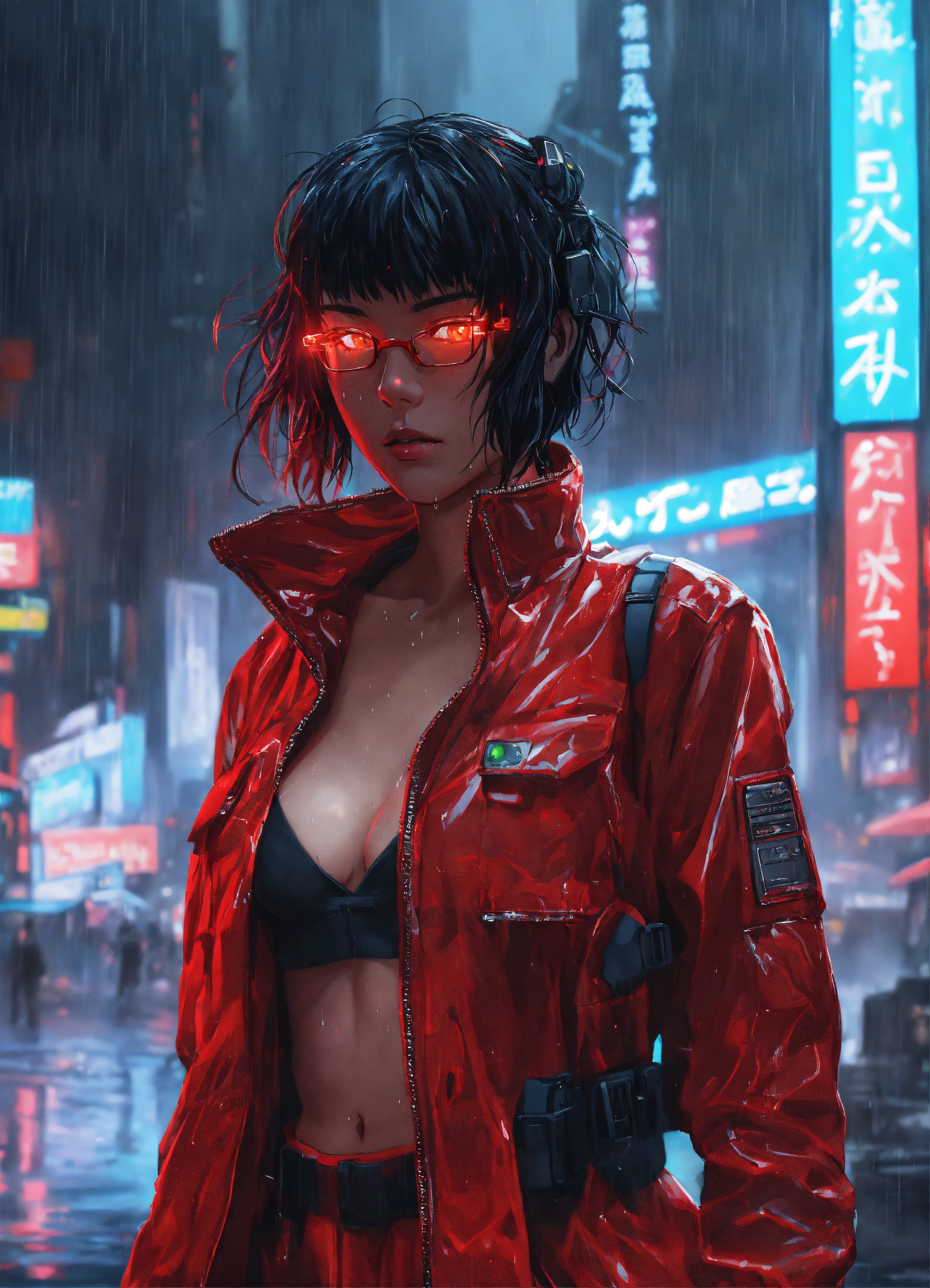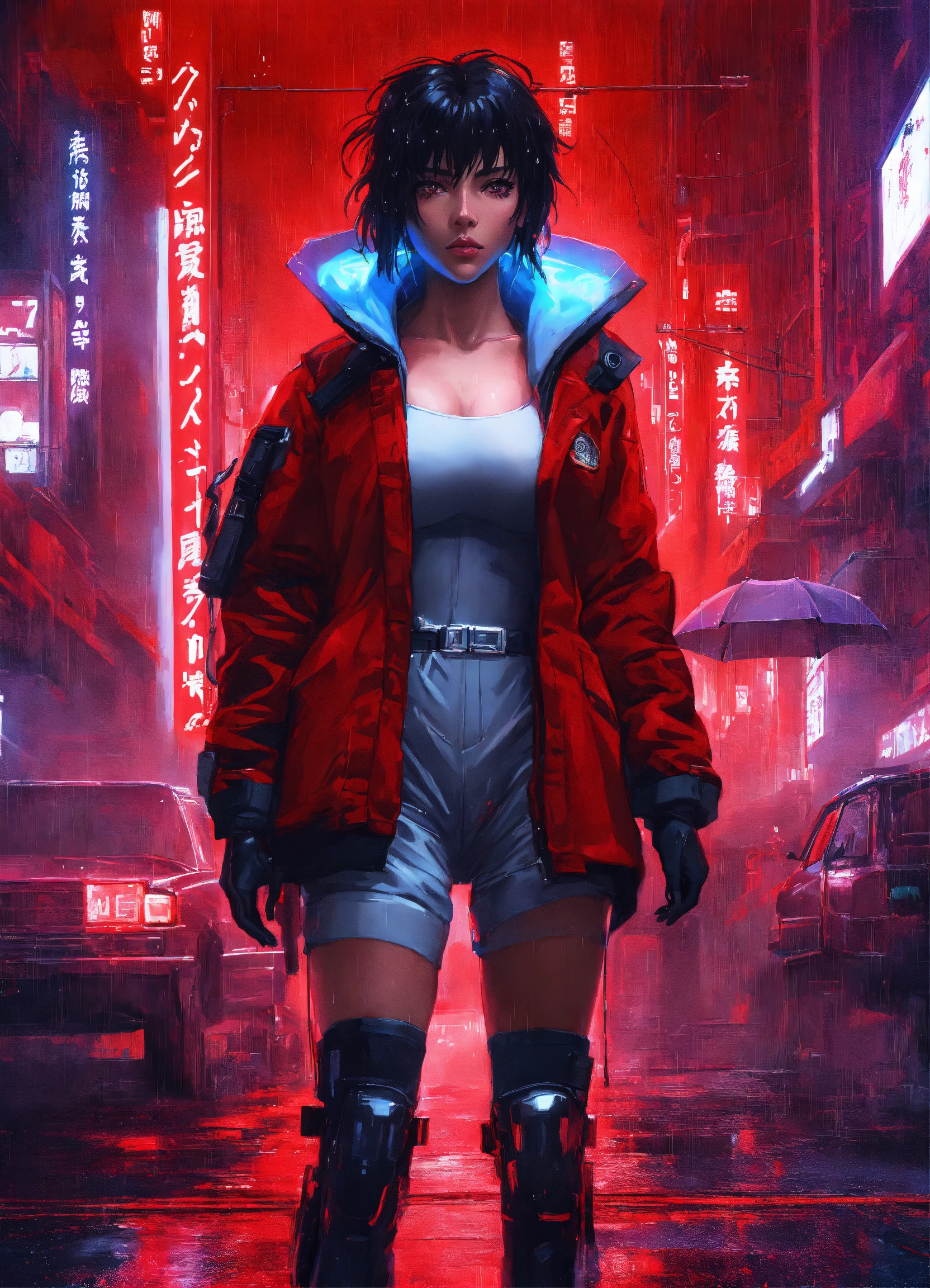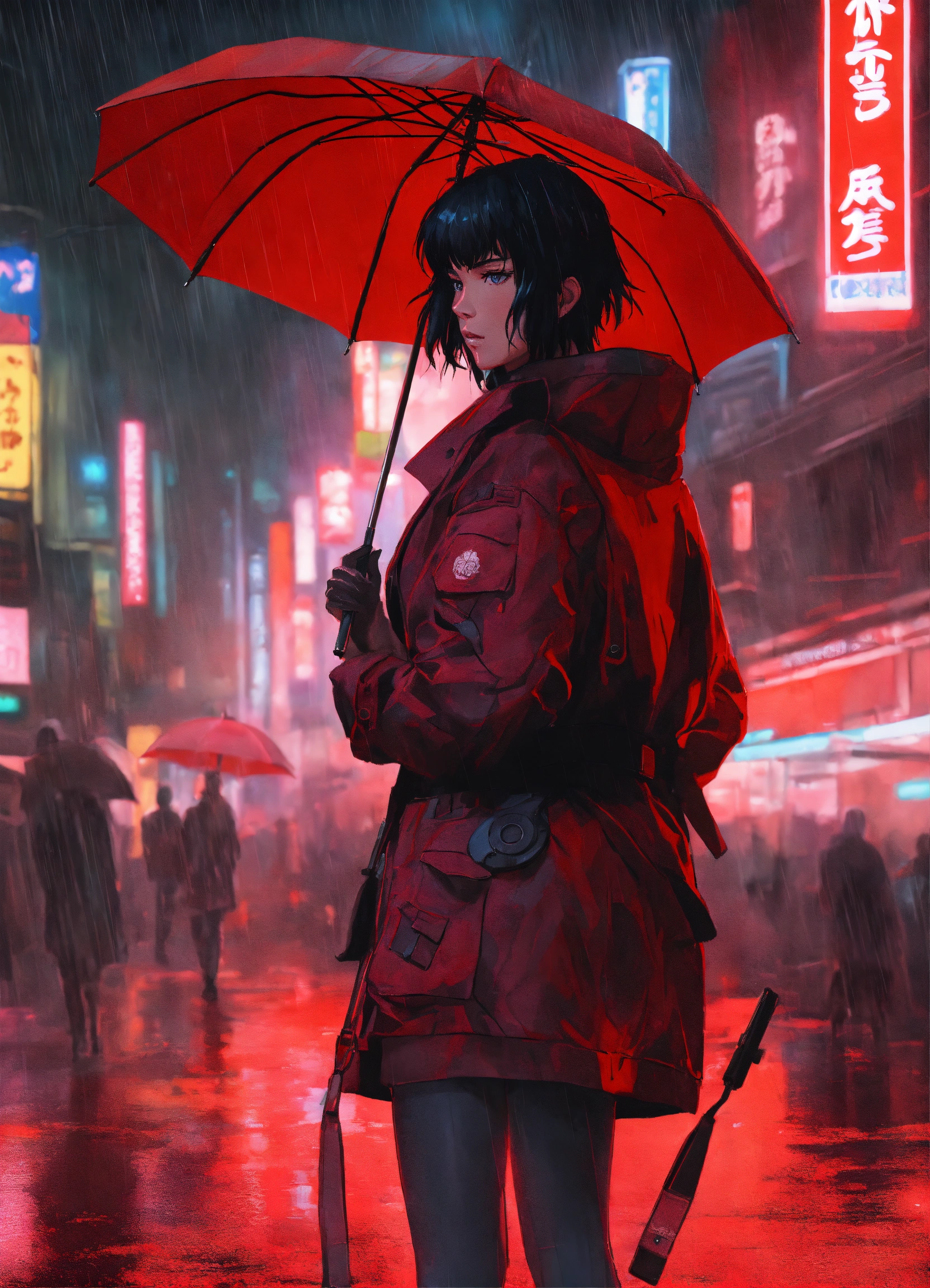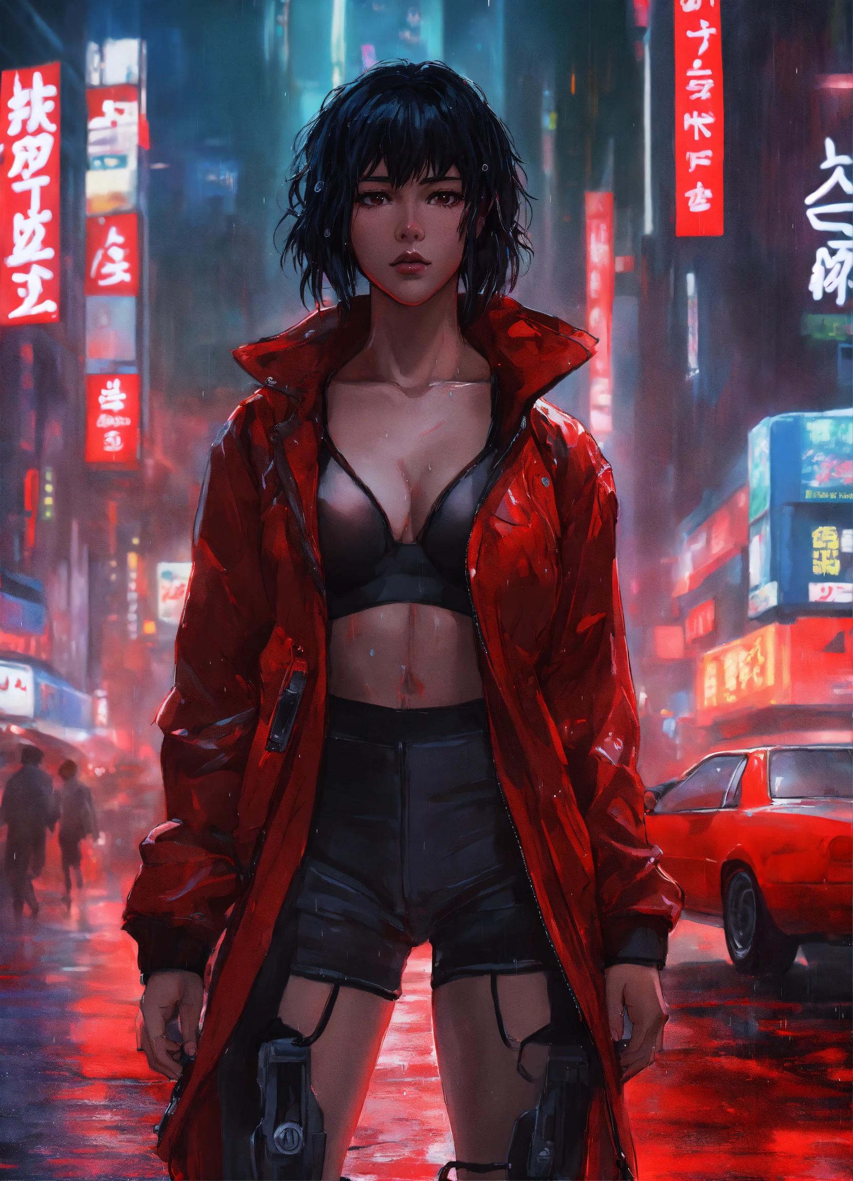 Anime art of ghost in the shell, detailed scene, red, perfect black face, intricately detailed photorealism, trending on artstation, neon lights, rainy day, stunning full body anime art
