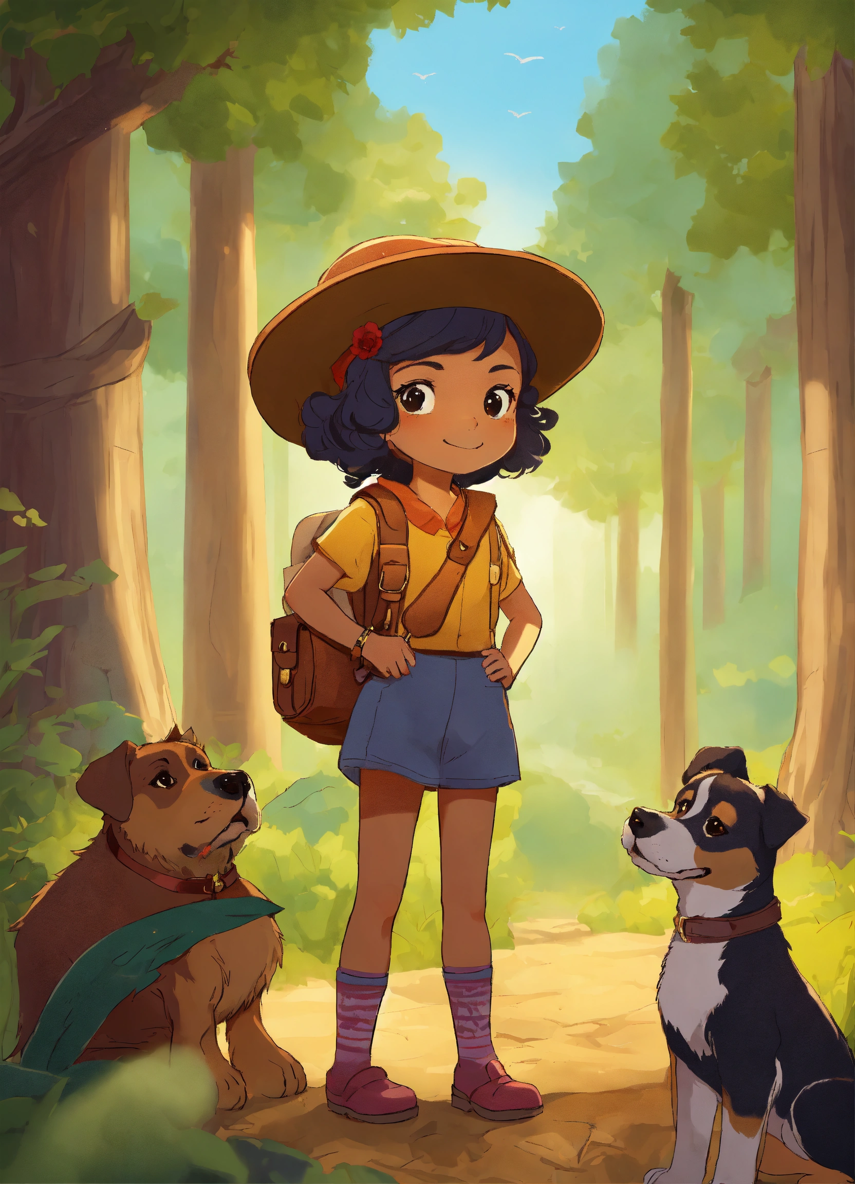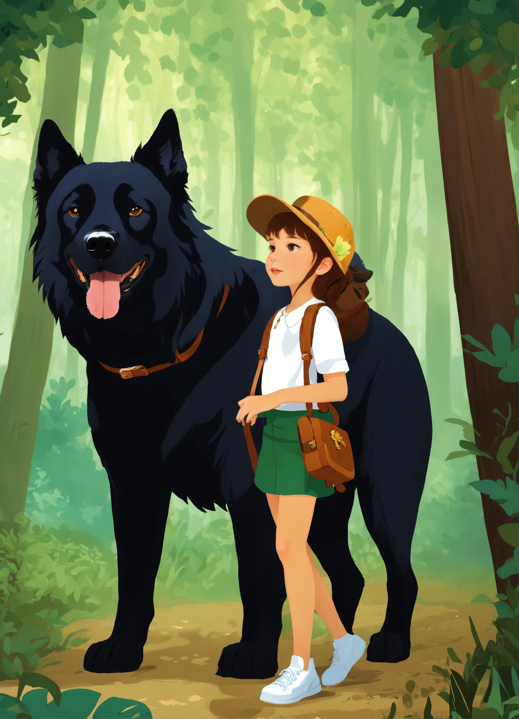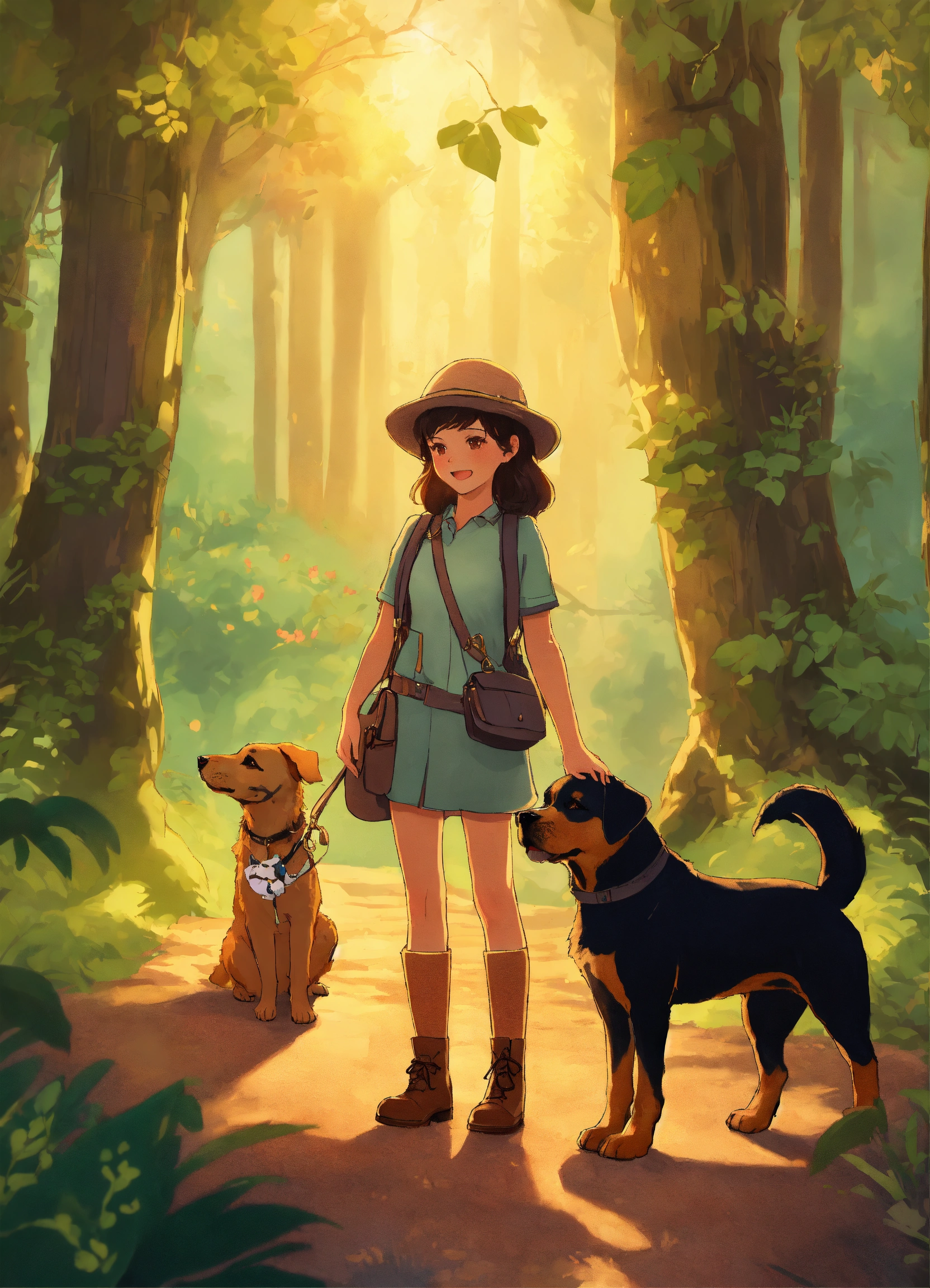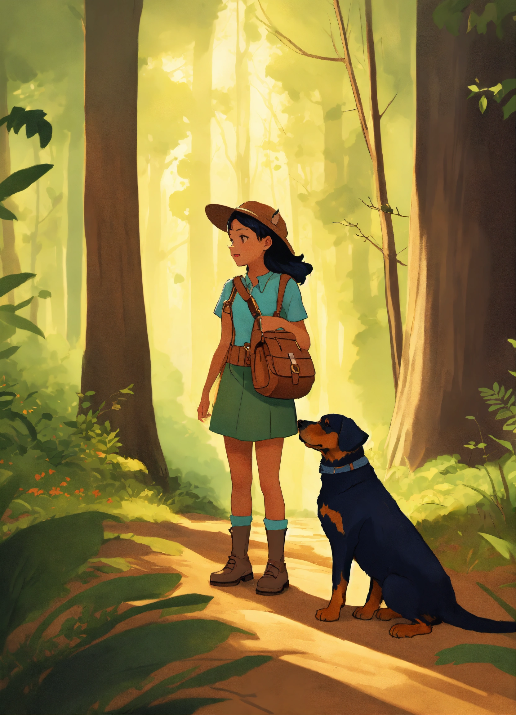 Forest scene begin with a detailed illustration of a whispering wood forest. showing tall, ancient trees with leaves that appear to whisper secrets, and rays of sunlight filtering through the trees creating a magical atmosphere. lila and rocco, in the center of the illustration, depict a young girl named lila with her trusty rottweiler, rocco. lila could be wearing a whimsical outfit, perhaps a hat and a satchel, to reflect her adventurous spirit, rocco can be shown beside her, looking loyal and protective.