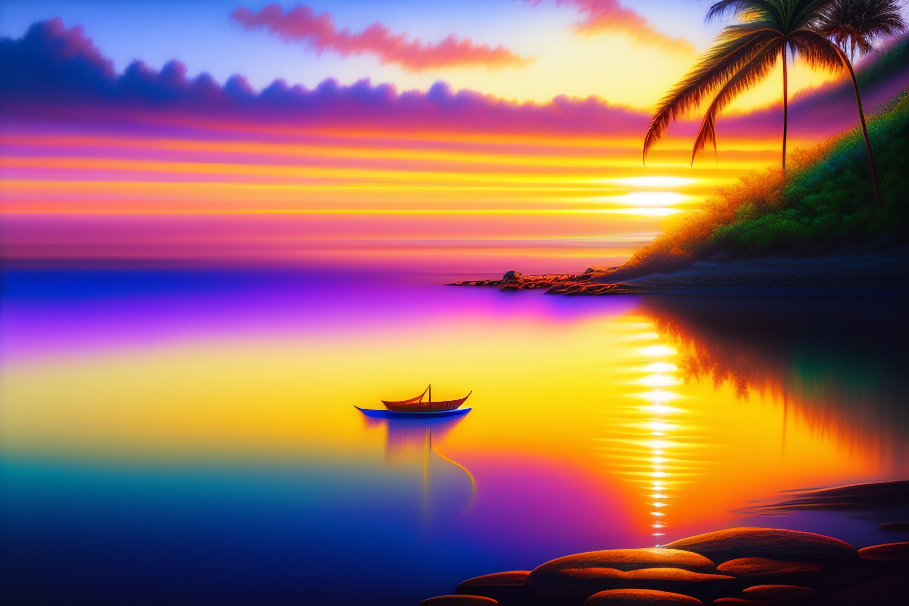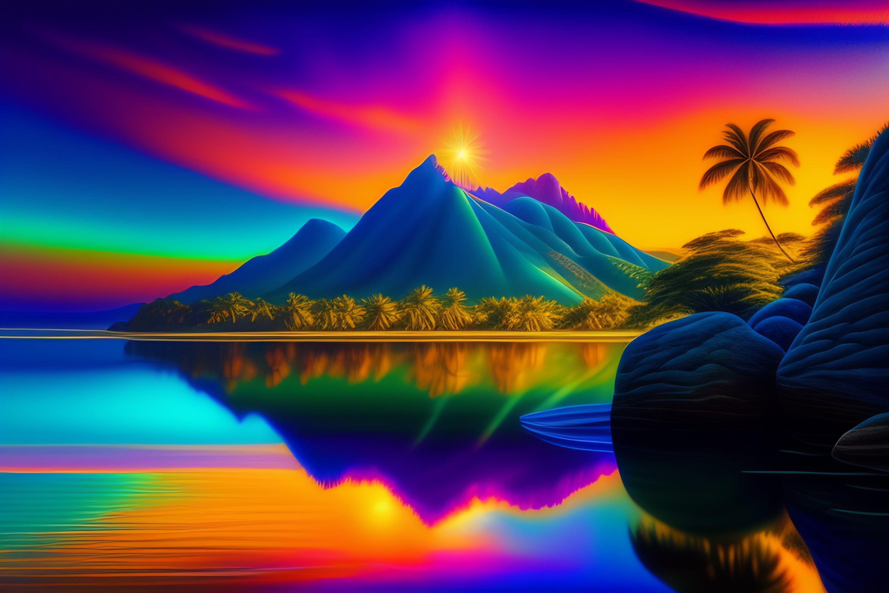 Colored pencil art on paper, tropical island sunset reflecting light of the water, highly detailed, artstation, masterpiece, award-winning, caran d'ache luminance, altermodern, detailed and intricate clearly structured, sharp focus, 3d, intricate details, complex composition! complementary rich colors! imaginative, inspiring, surrealistic, hyper-realistic oil painting, 8k, magic! above & beyond humans fantasy! stunningly beautiful, k hdr, soft light, hdr, high detail + aperture 1.2, intricate