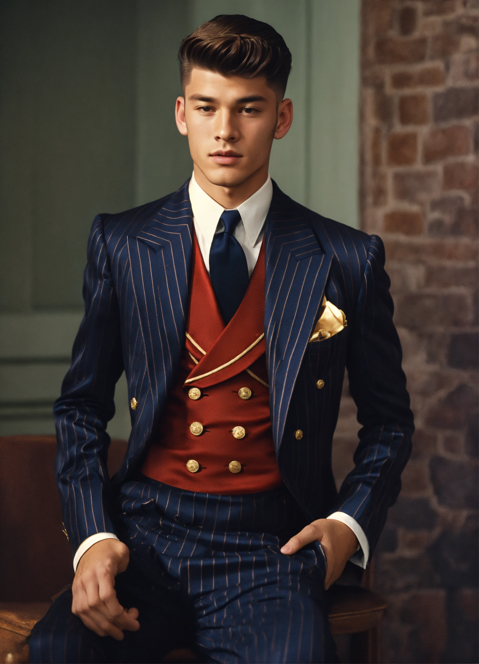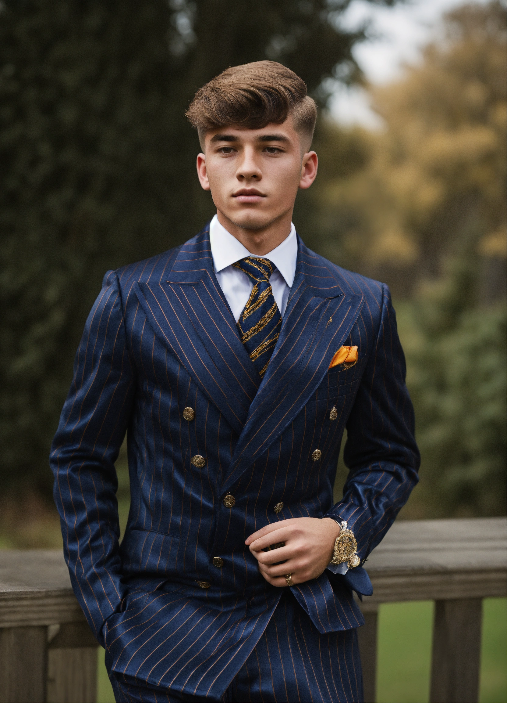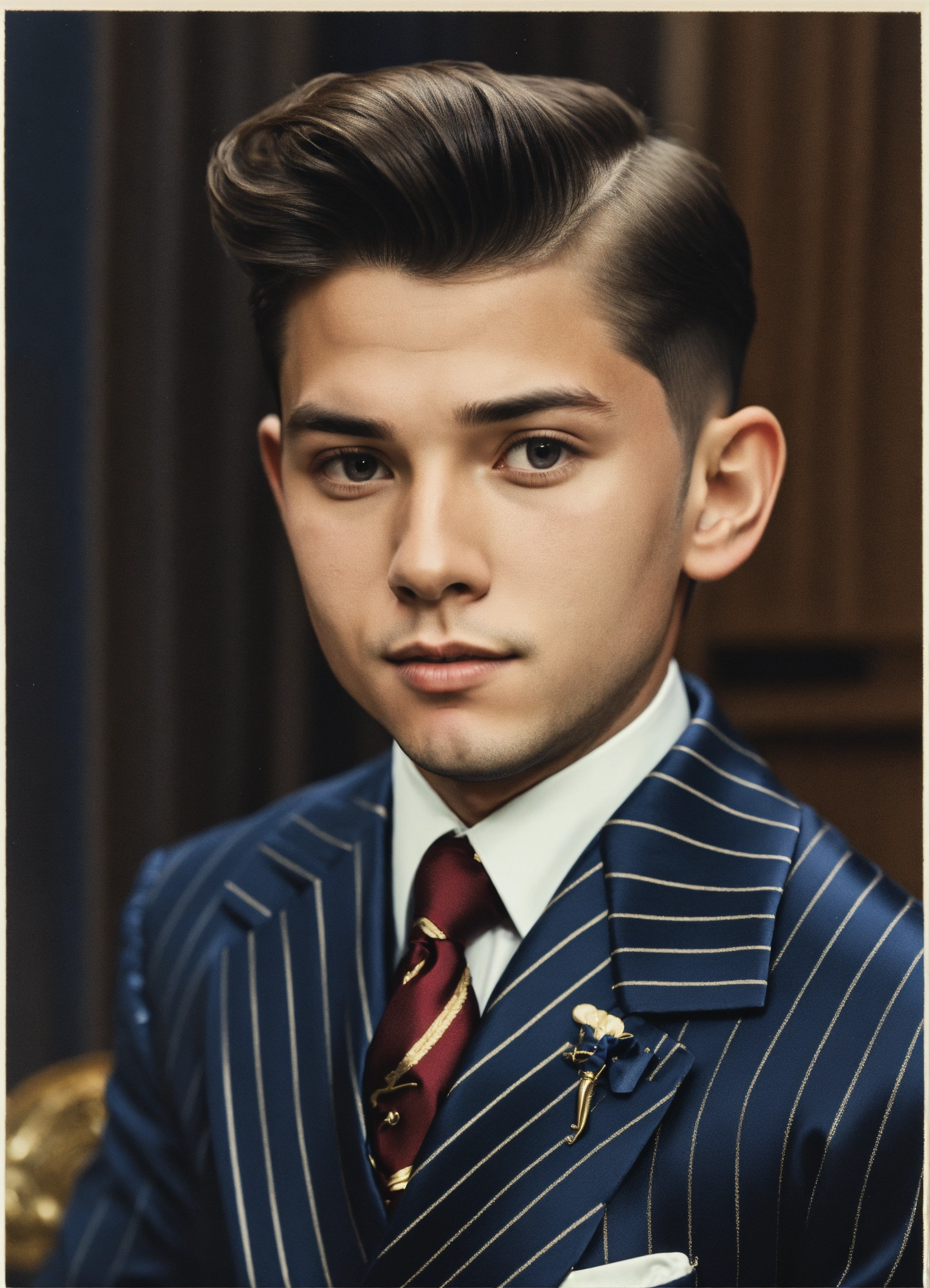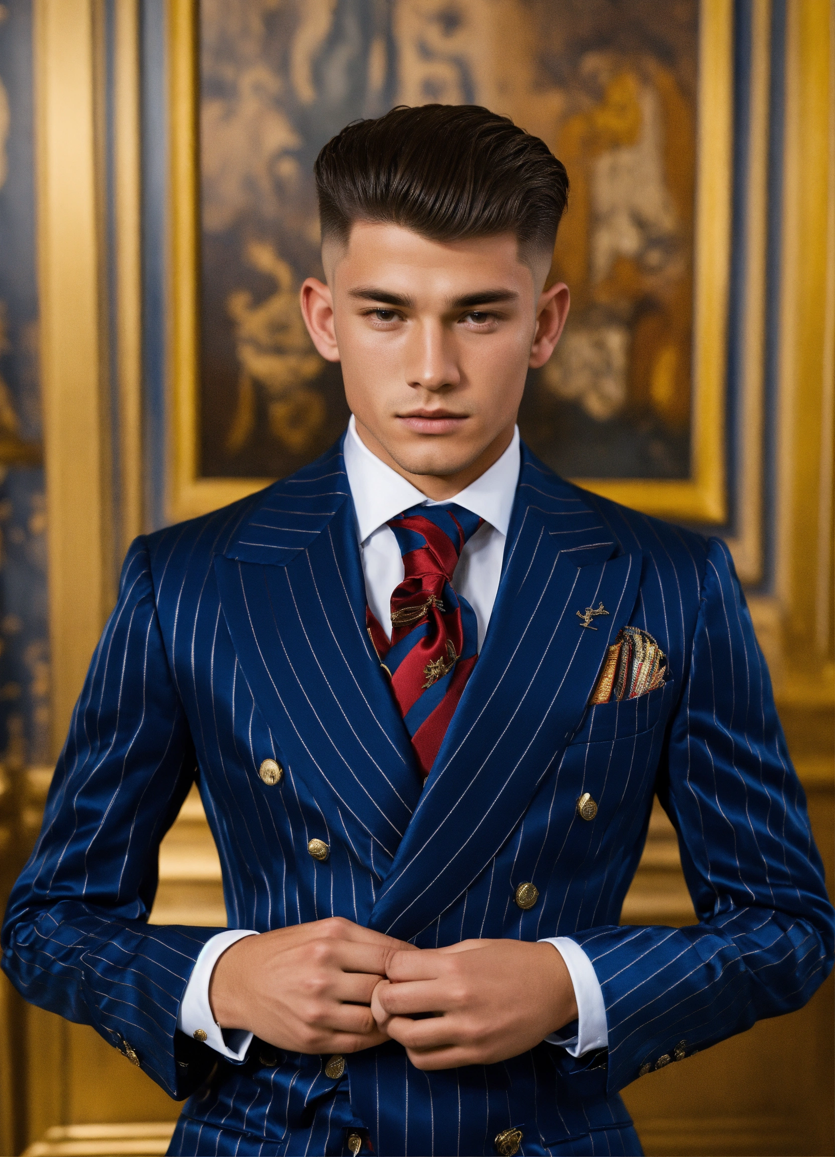 A young sportsman with wizard outfit in navy satin large pinstripe double breasted suit, club tie, pompadour haircut