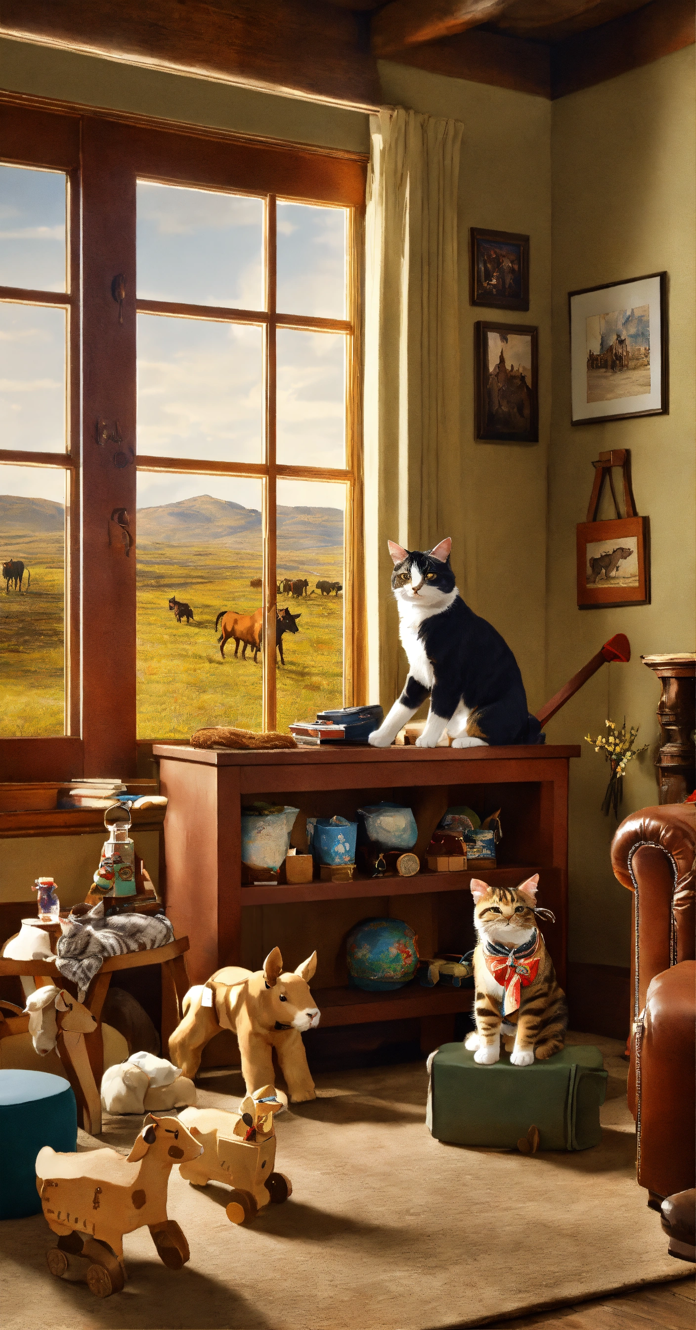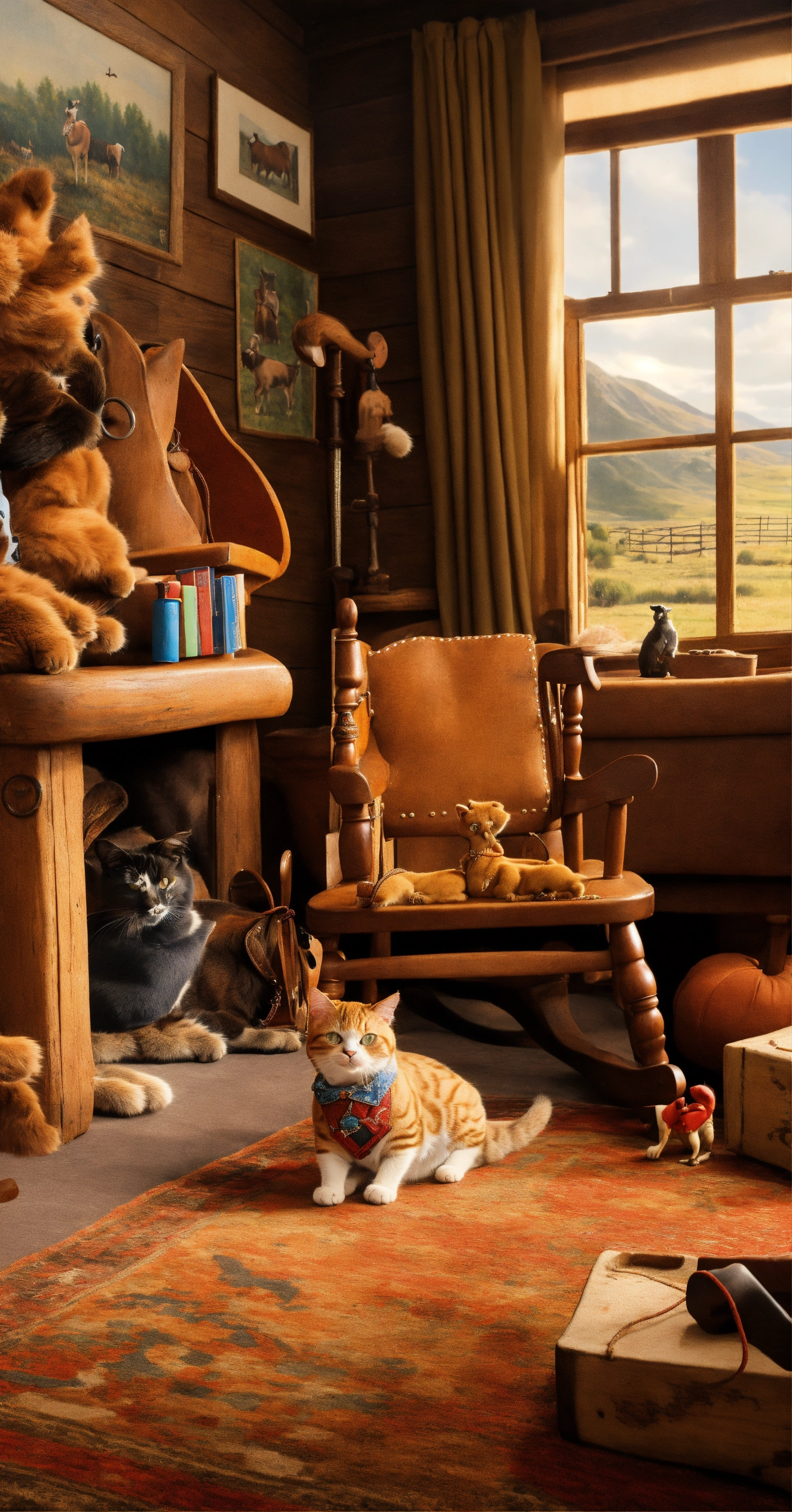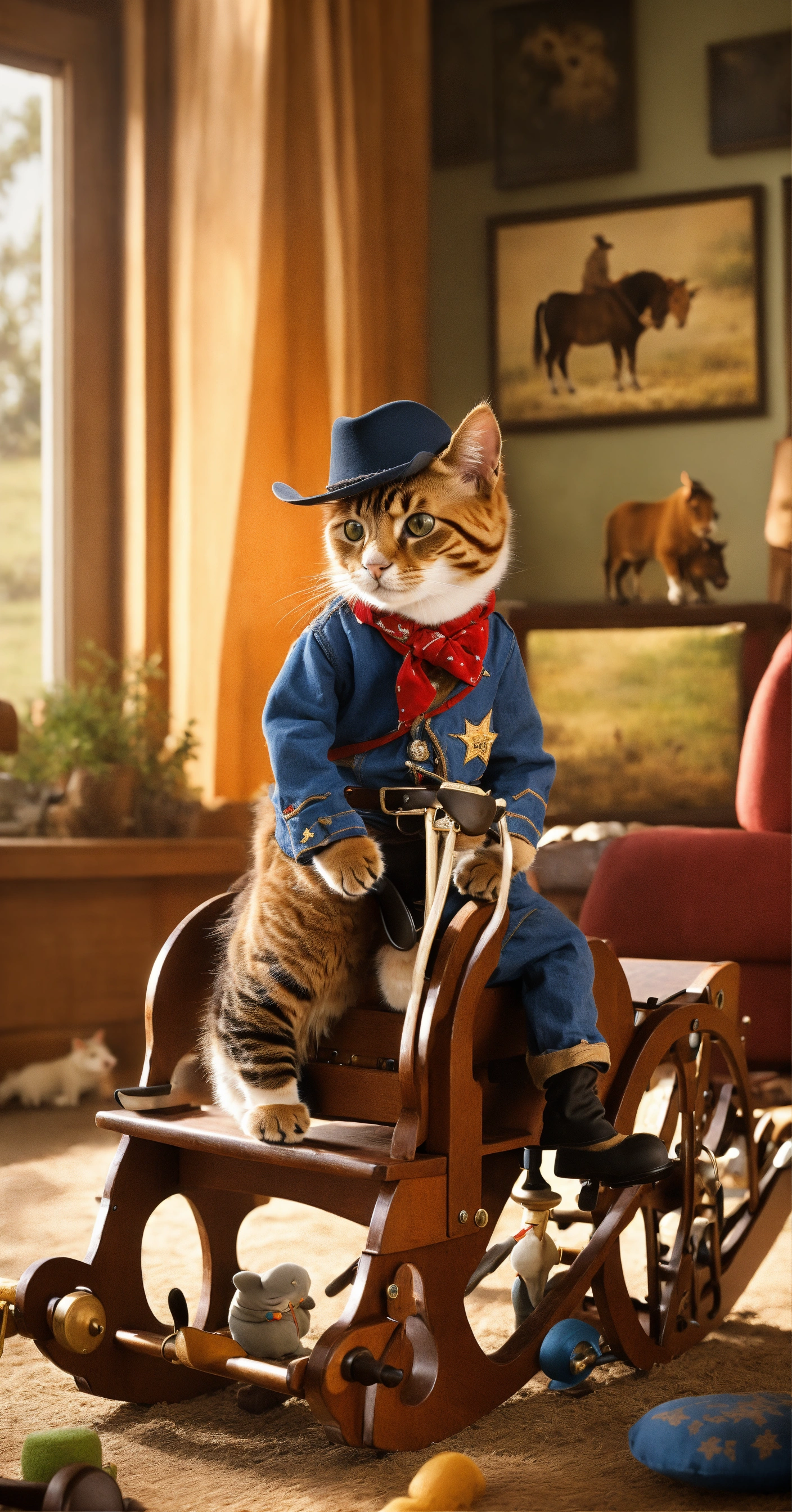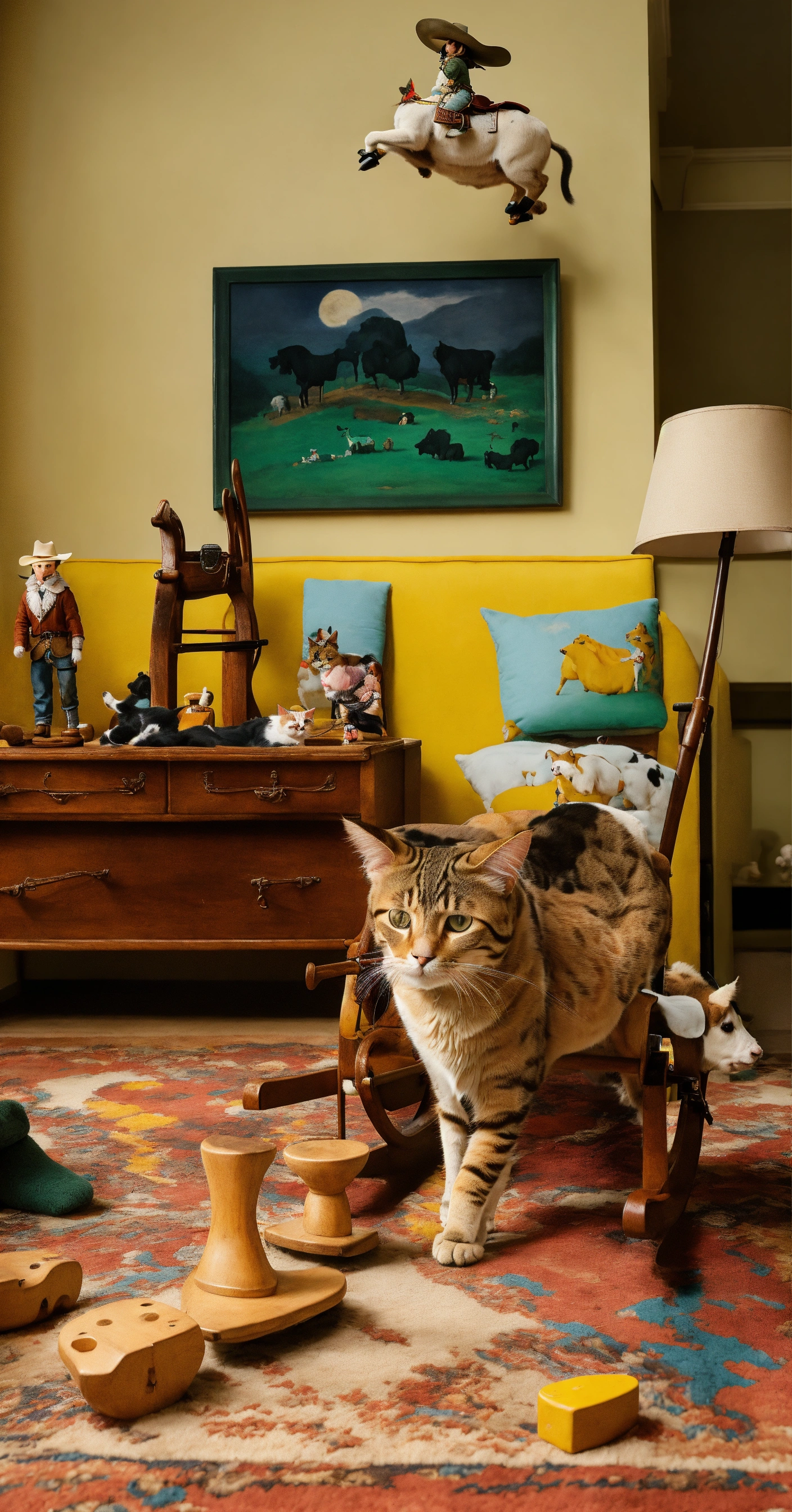 Create a picture of a cat dressed as a cowboy, 'lassoing' toy cattle and 'riding' a rocking horse on the wild 'plains' of the living room