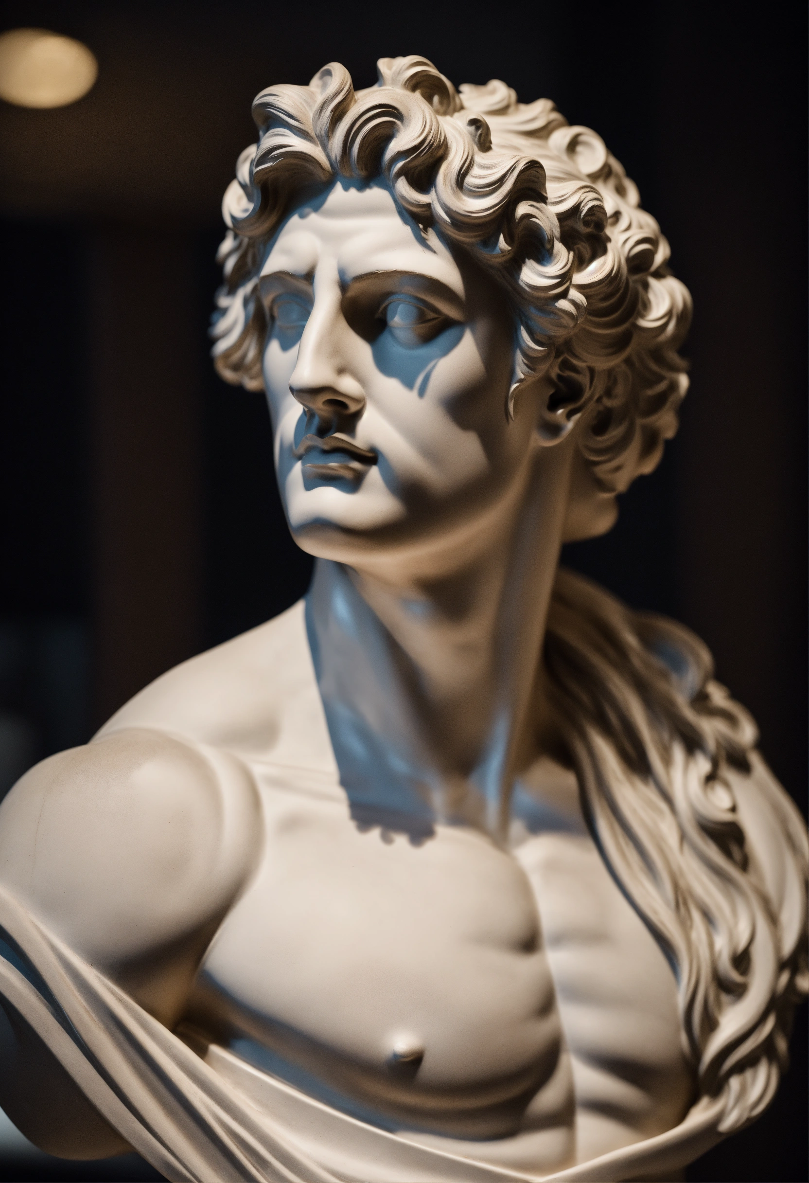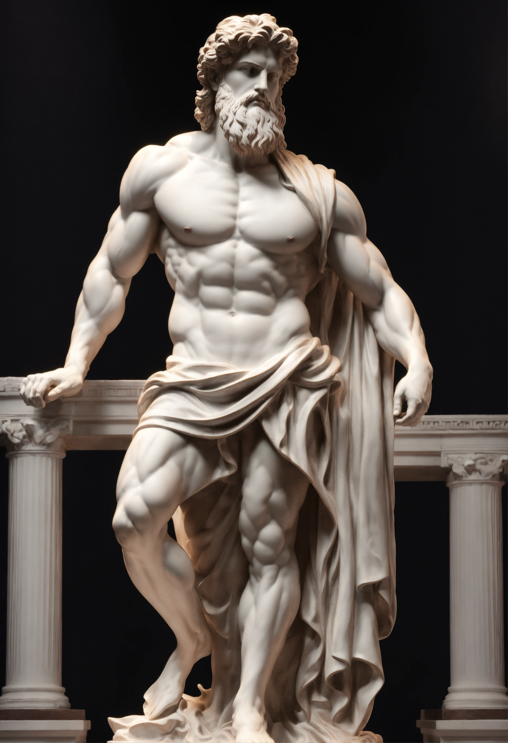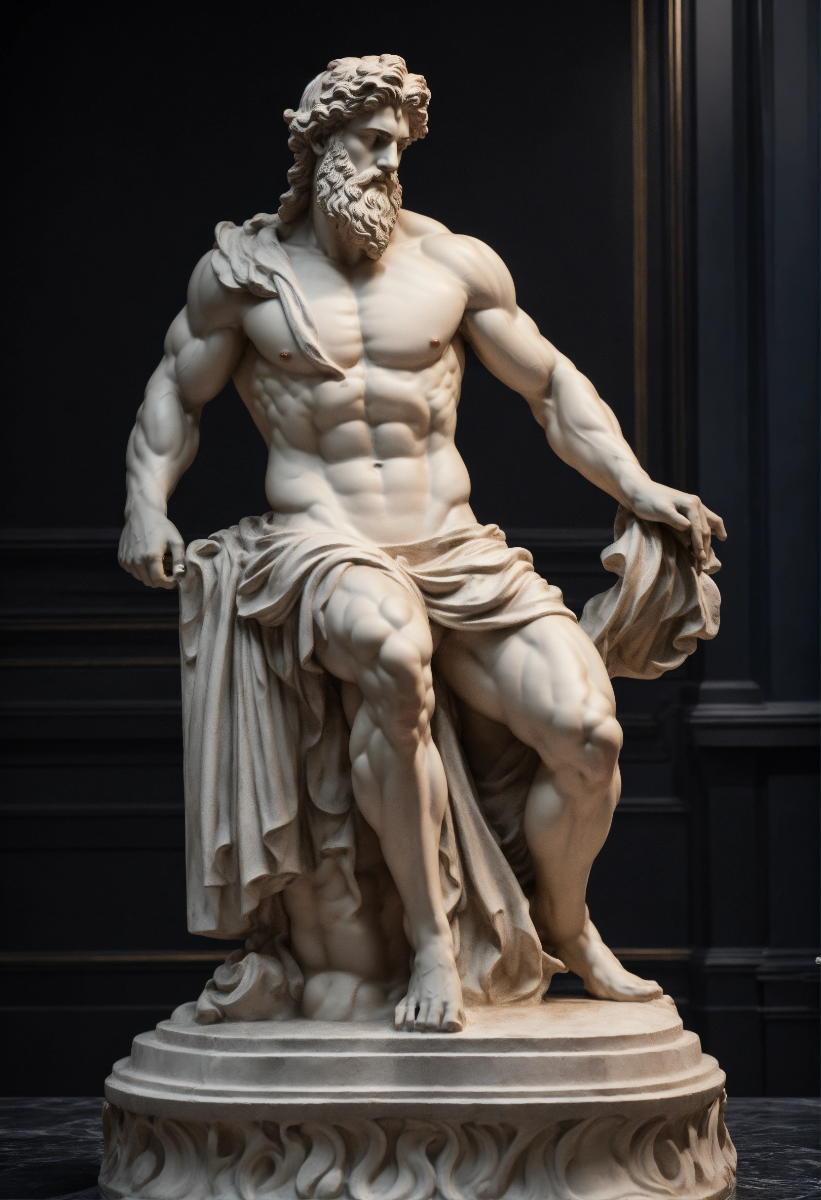 A statue from a muscular greek god statue with a wavey middel parting hair out of white marbel with a black backround standing on a podest animeted style 8k