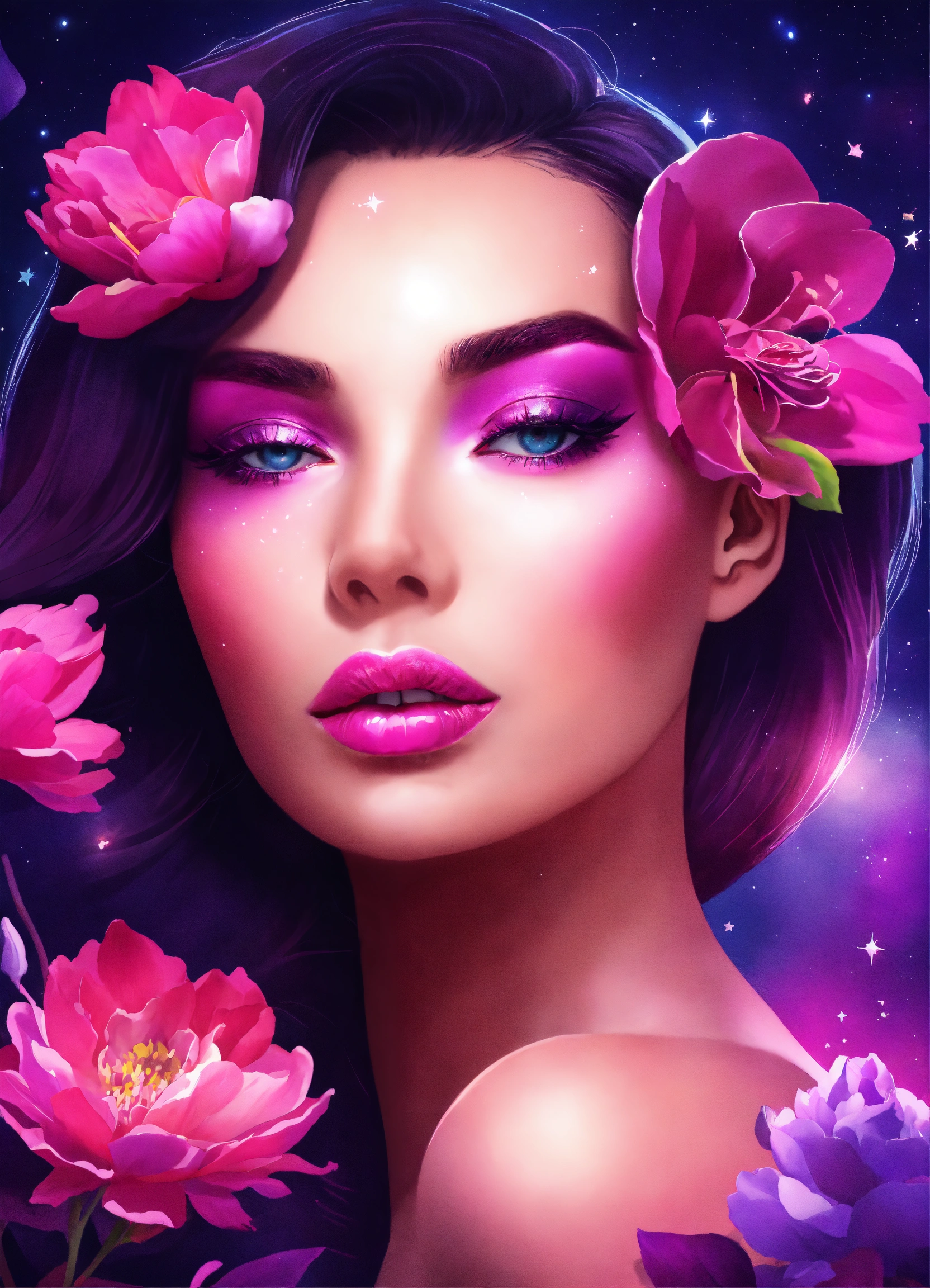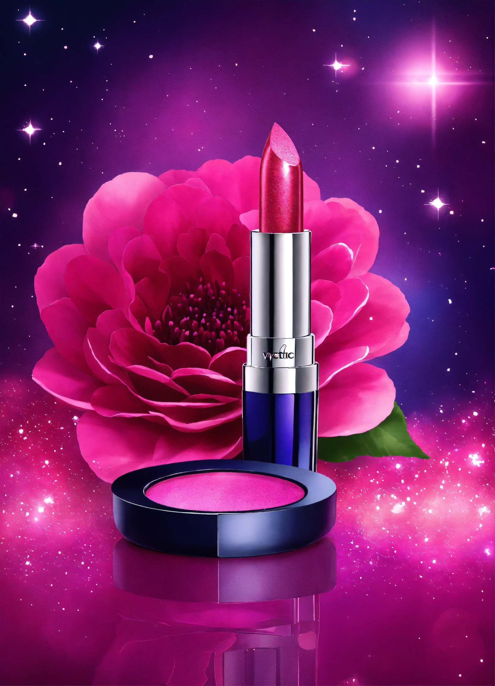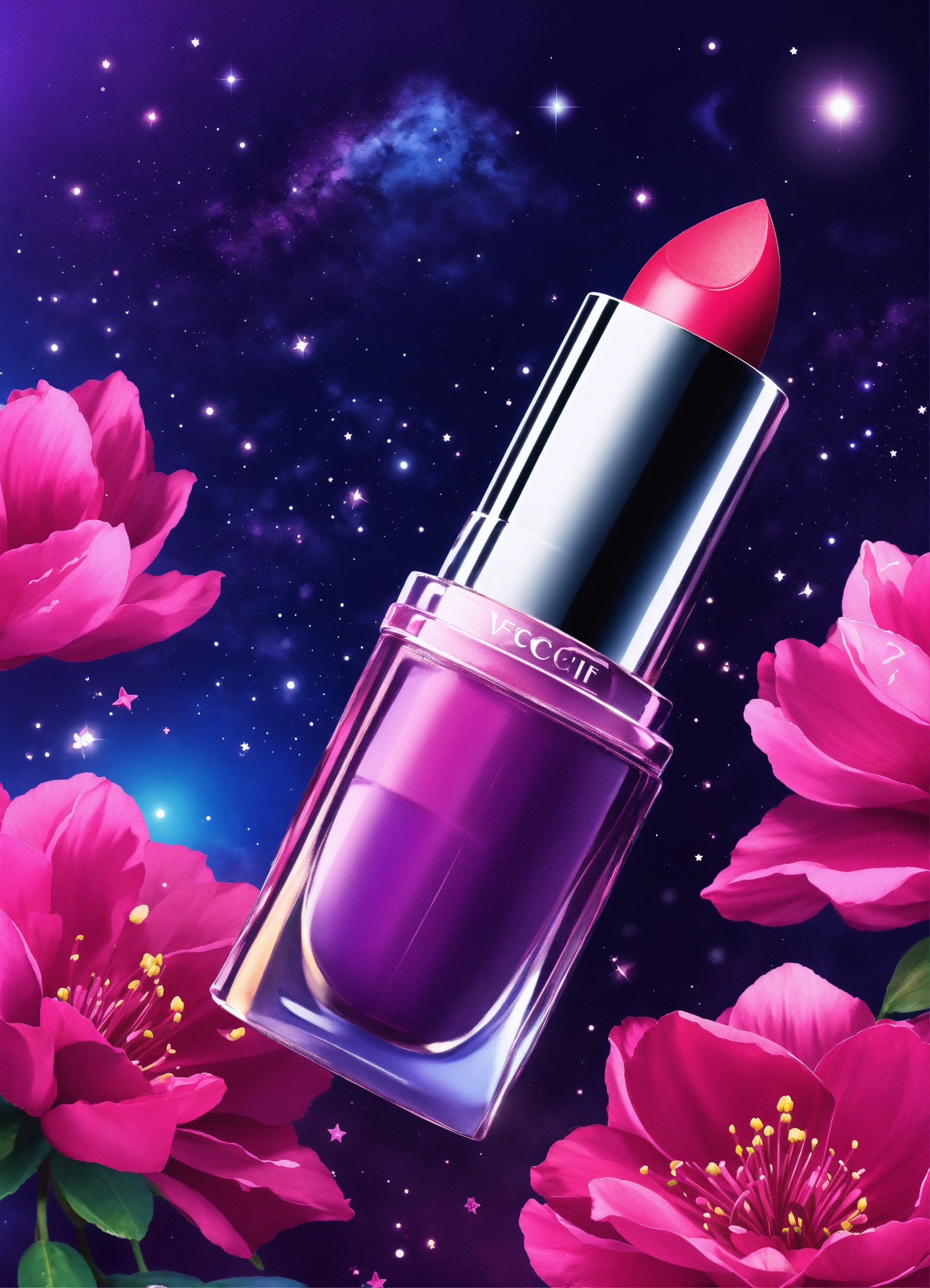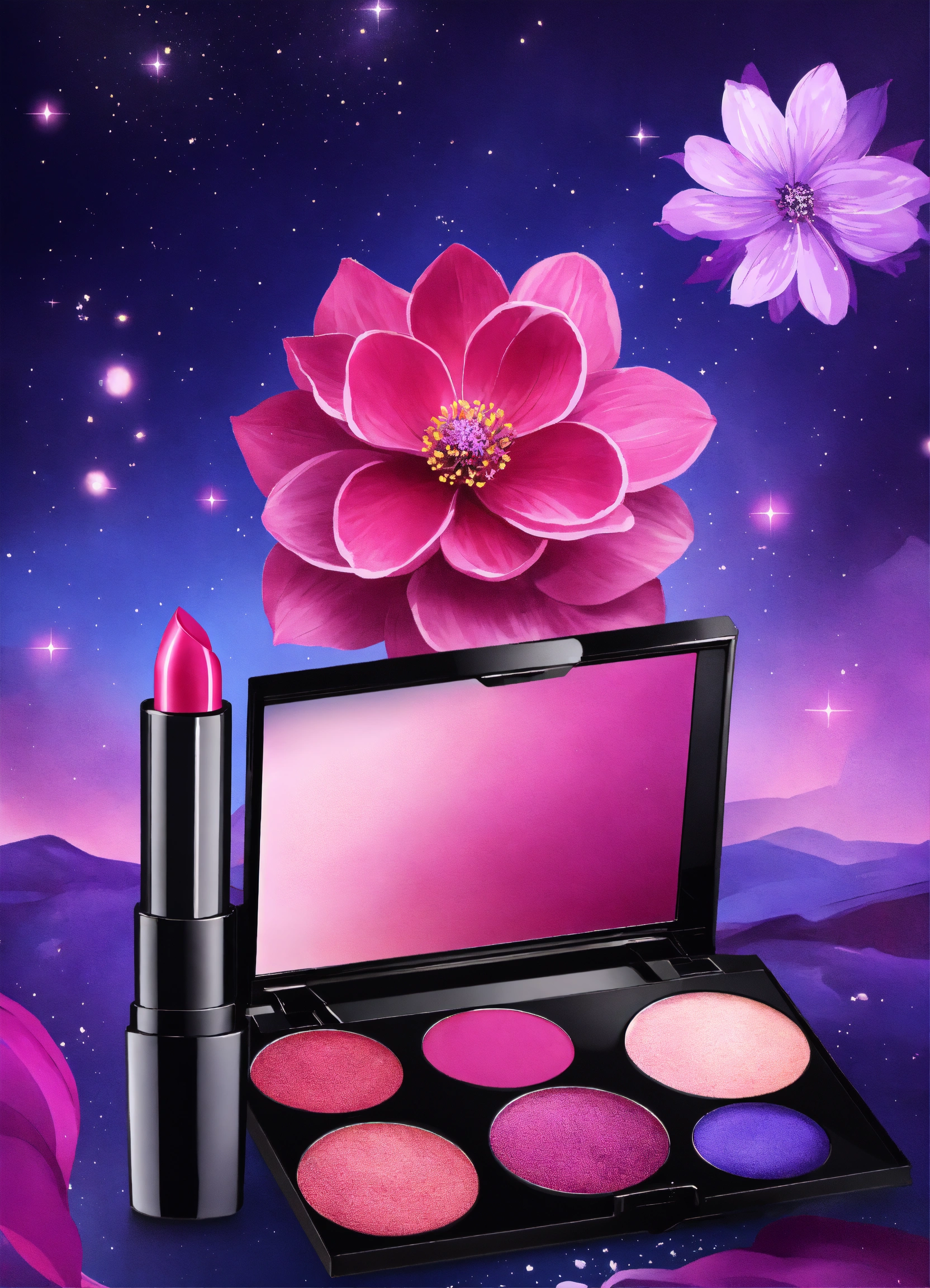 Vector graphics, bright design advertising fuchsia lipstick and eye shadow palette. stylized image, high quality, background - night sky, stars and violet flower