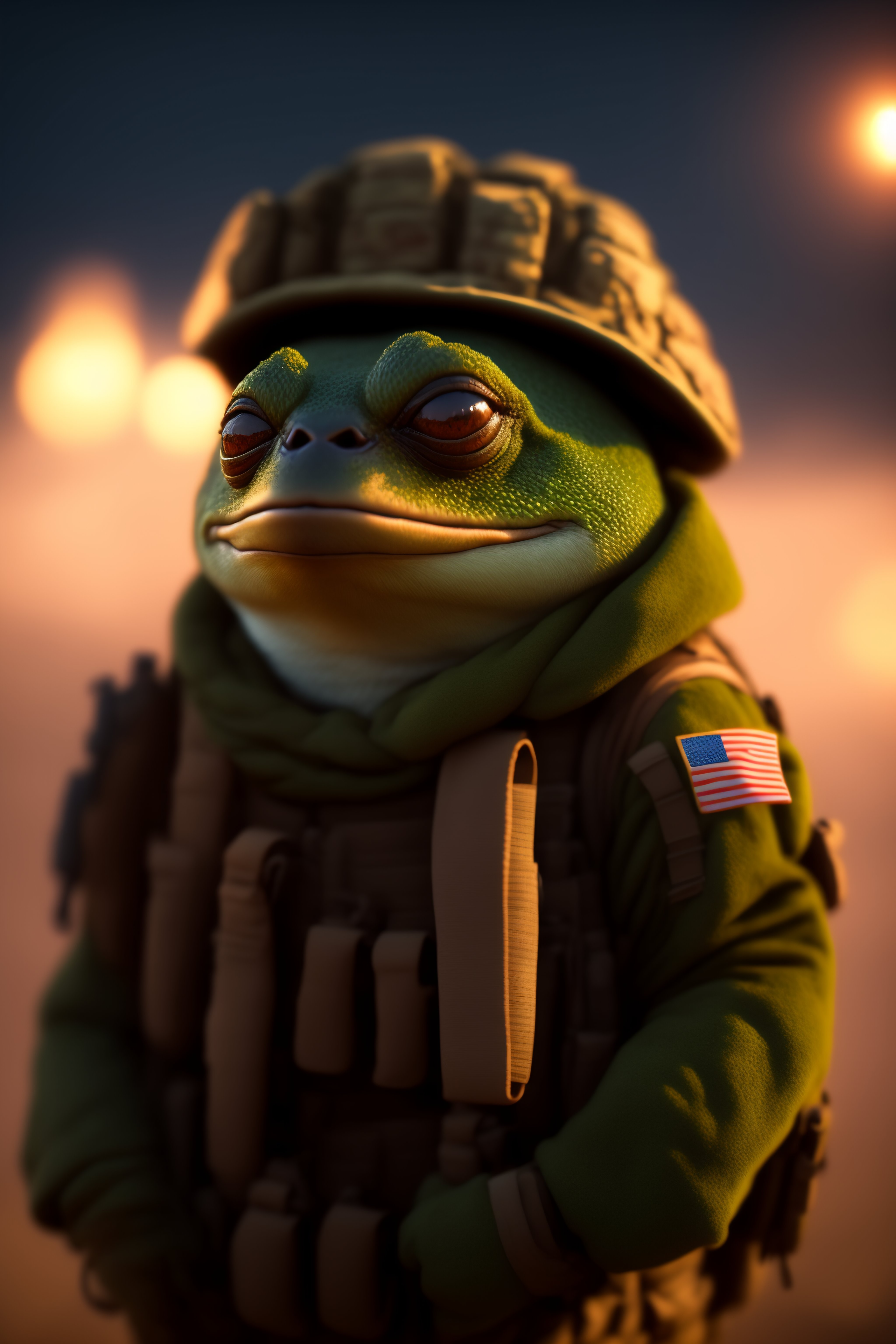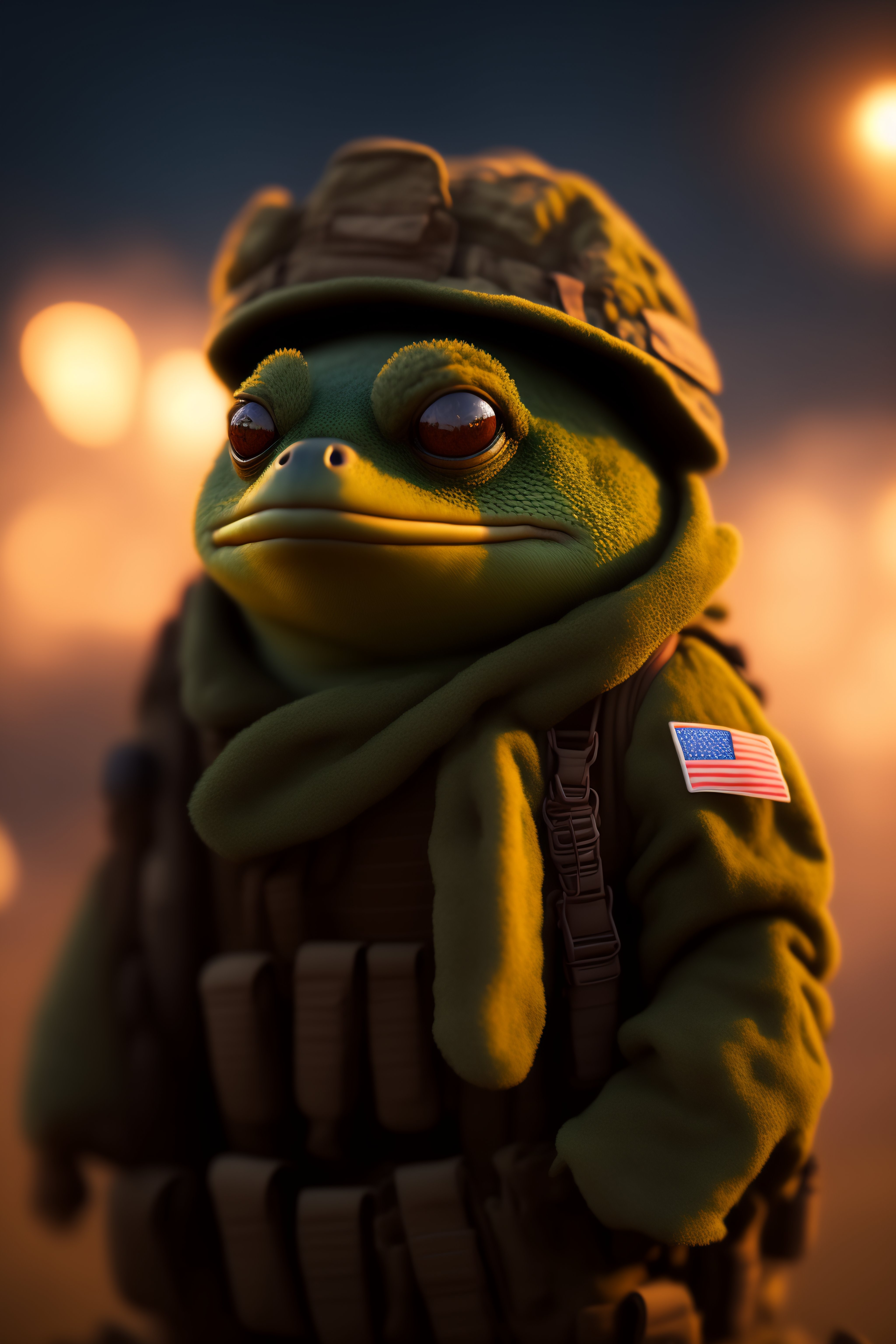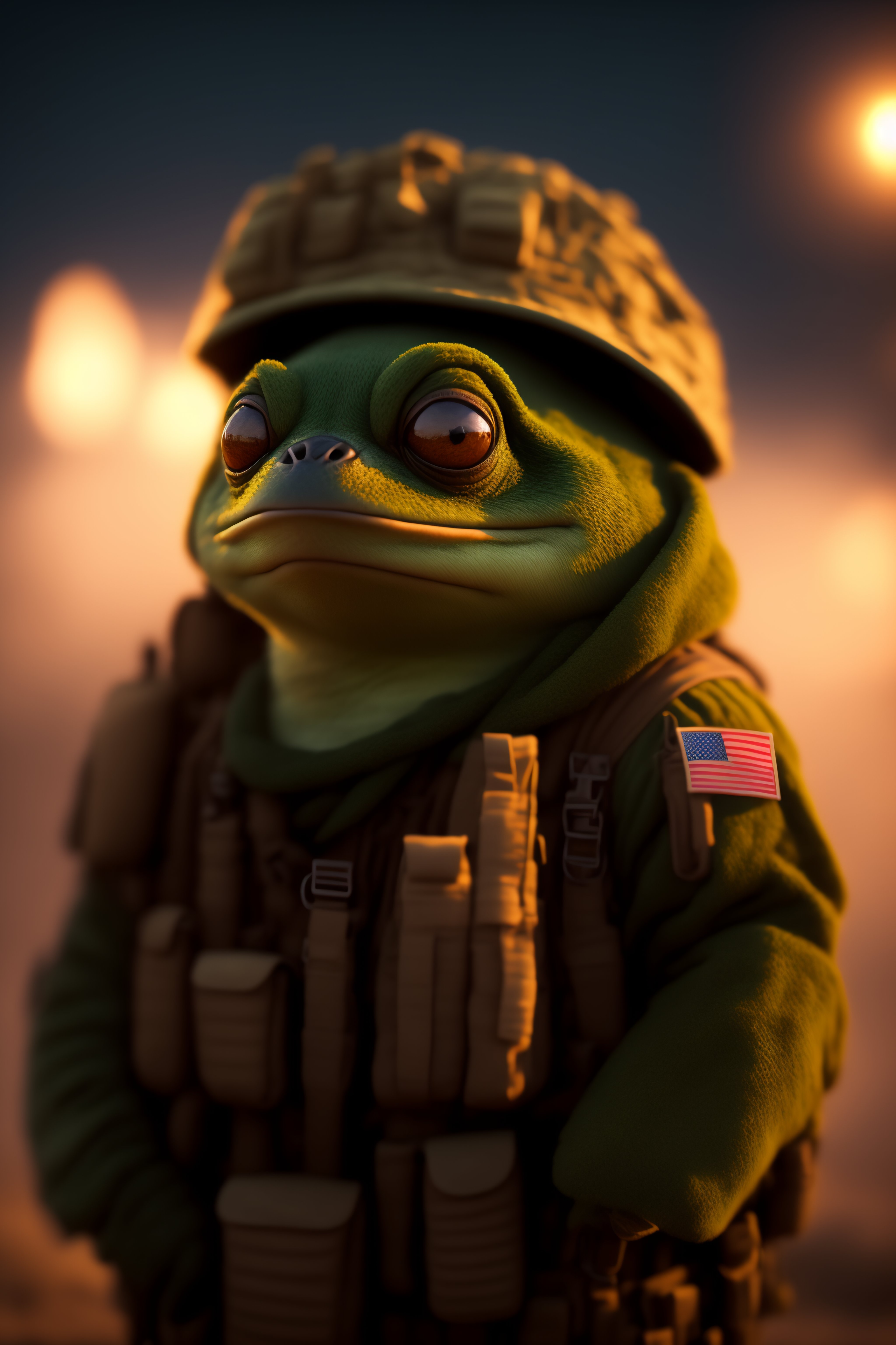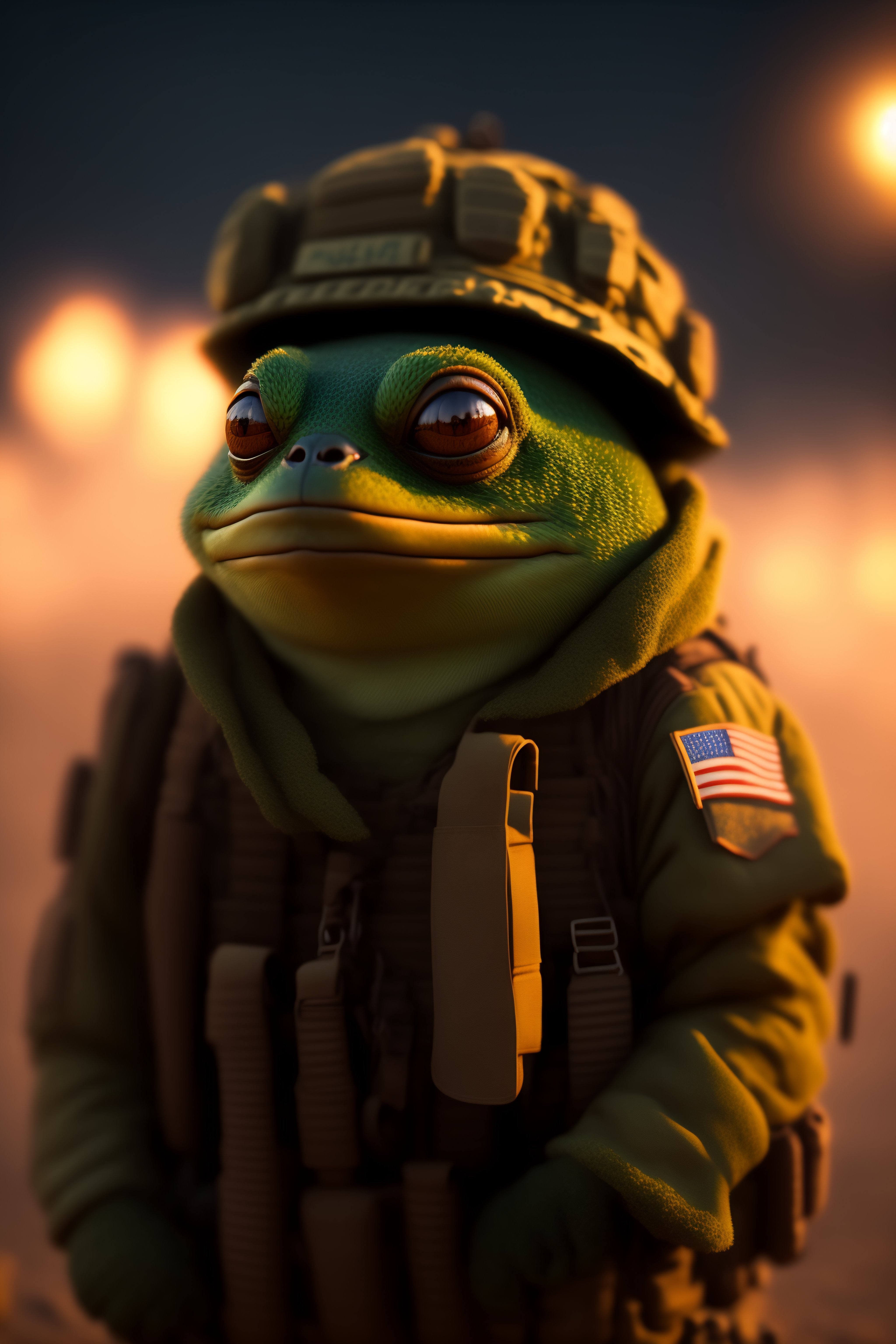 An exhausted pepe the frog at the frontlines in the army at night with his platoon fighting, key lighting, soft lights, foggy, by steve hanks, by lisa yuskavage, by serov valentin, by tarkovsky, 8 k render, detailed, cute cartoon style, very cute adorable face
