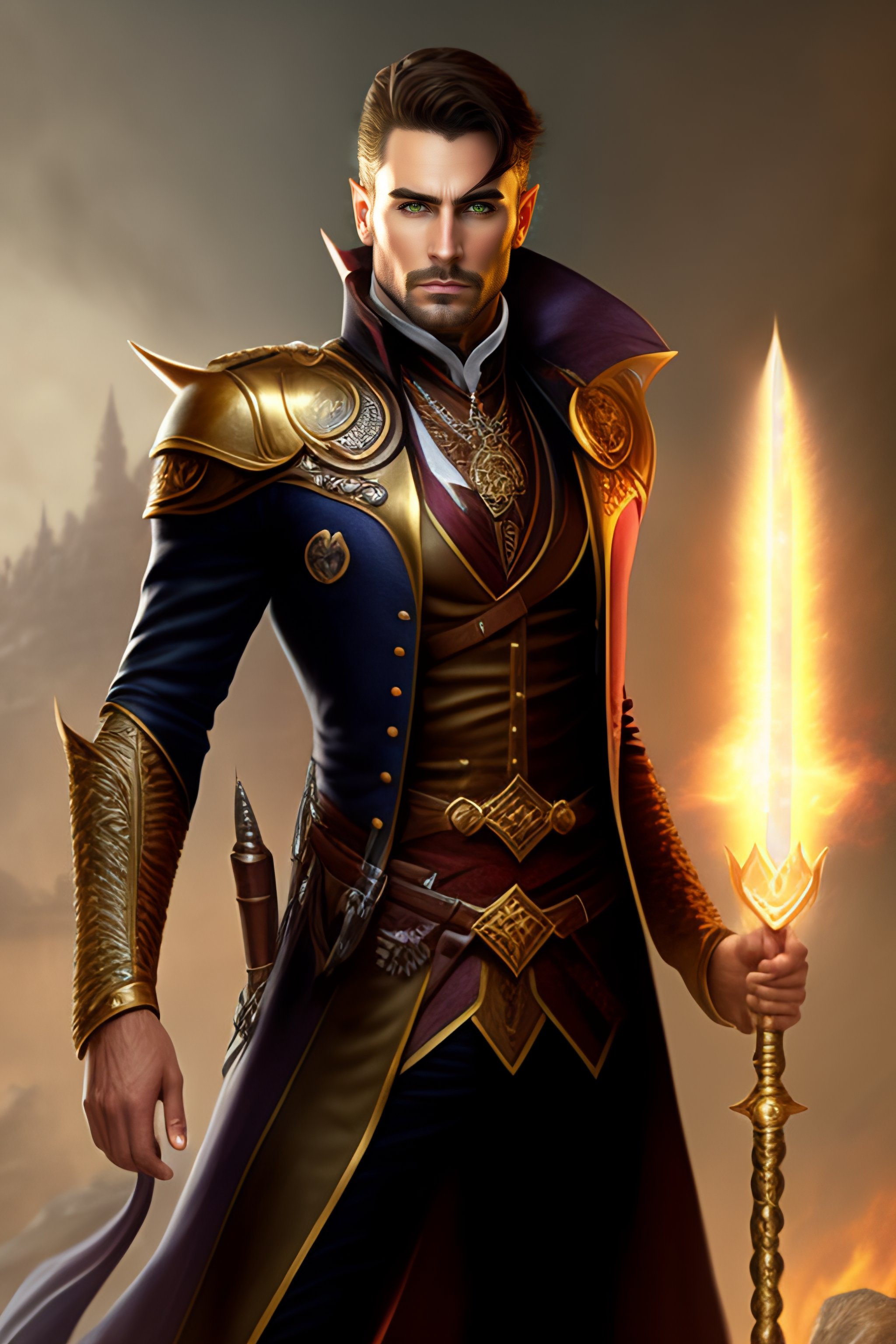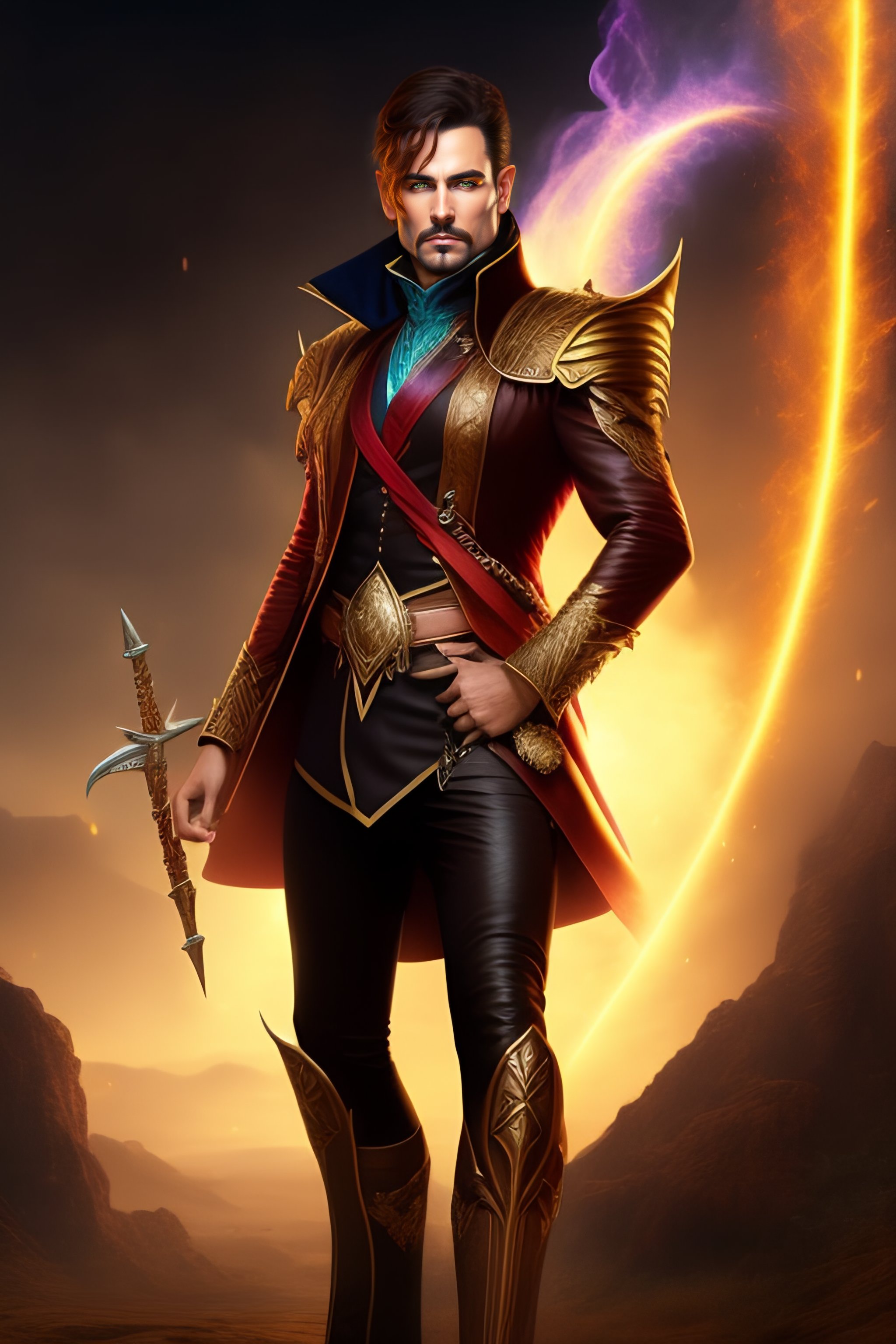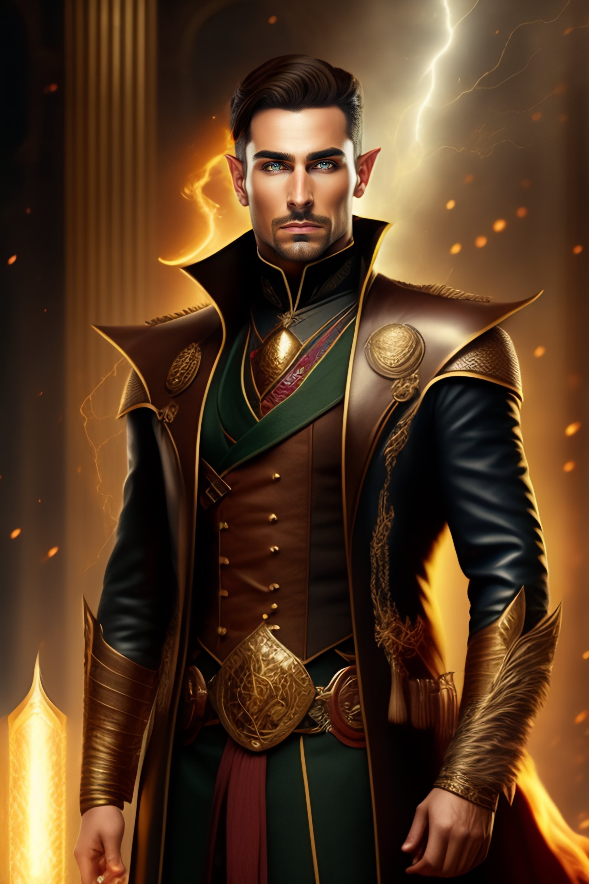 Full body portrait of a male half-elf lightning sorcerer with short brown hair and a goatee, holding a pistol in a steam punk setting. in the style of h.g. wells