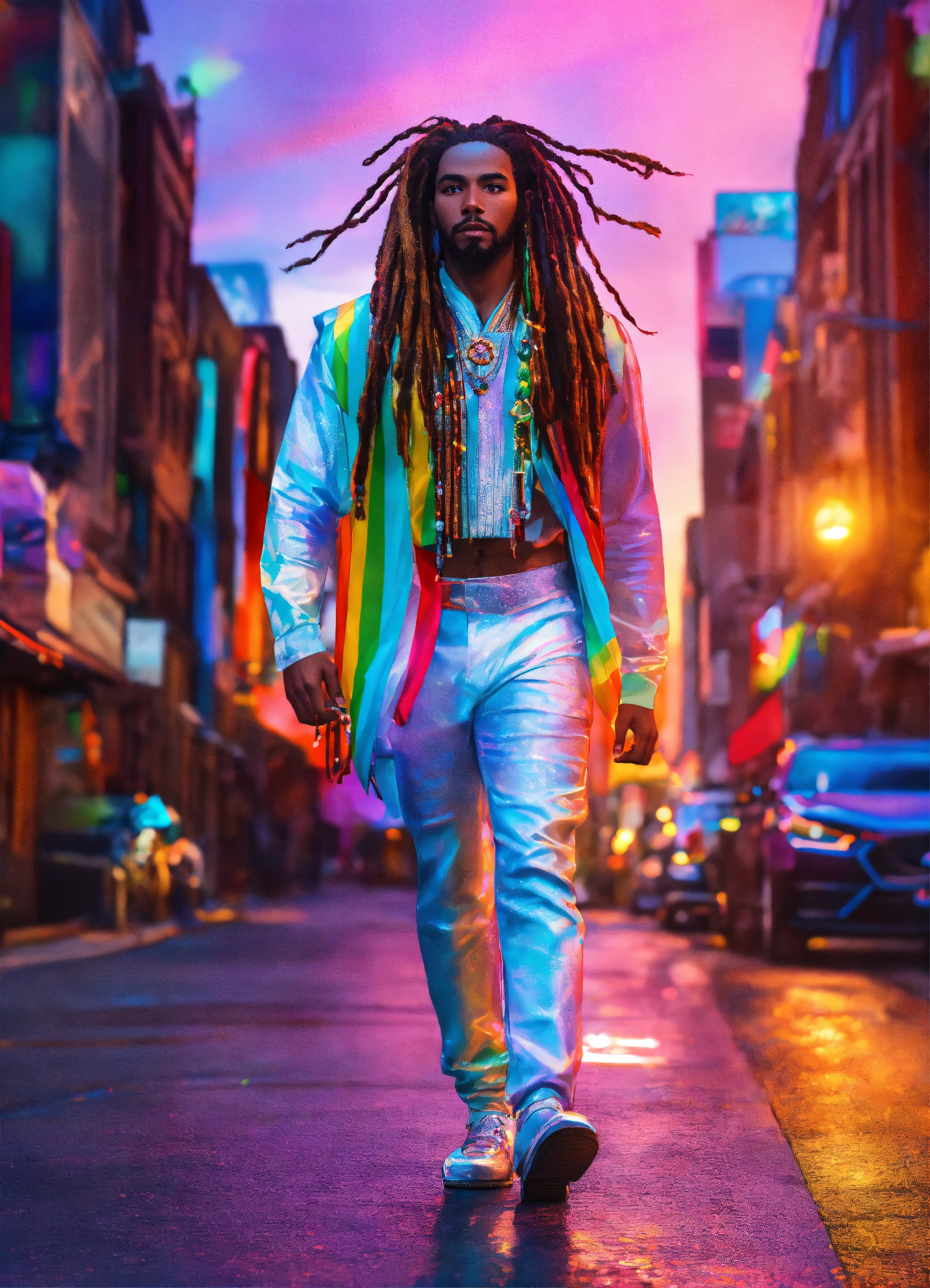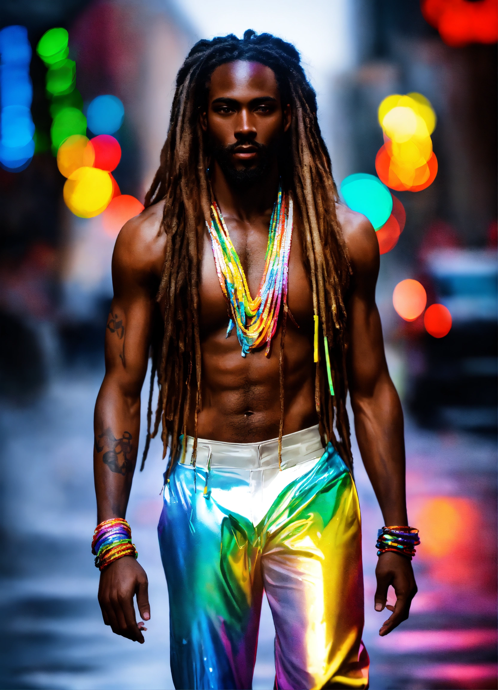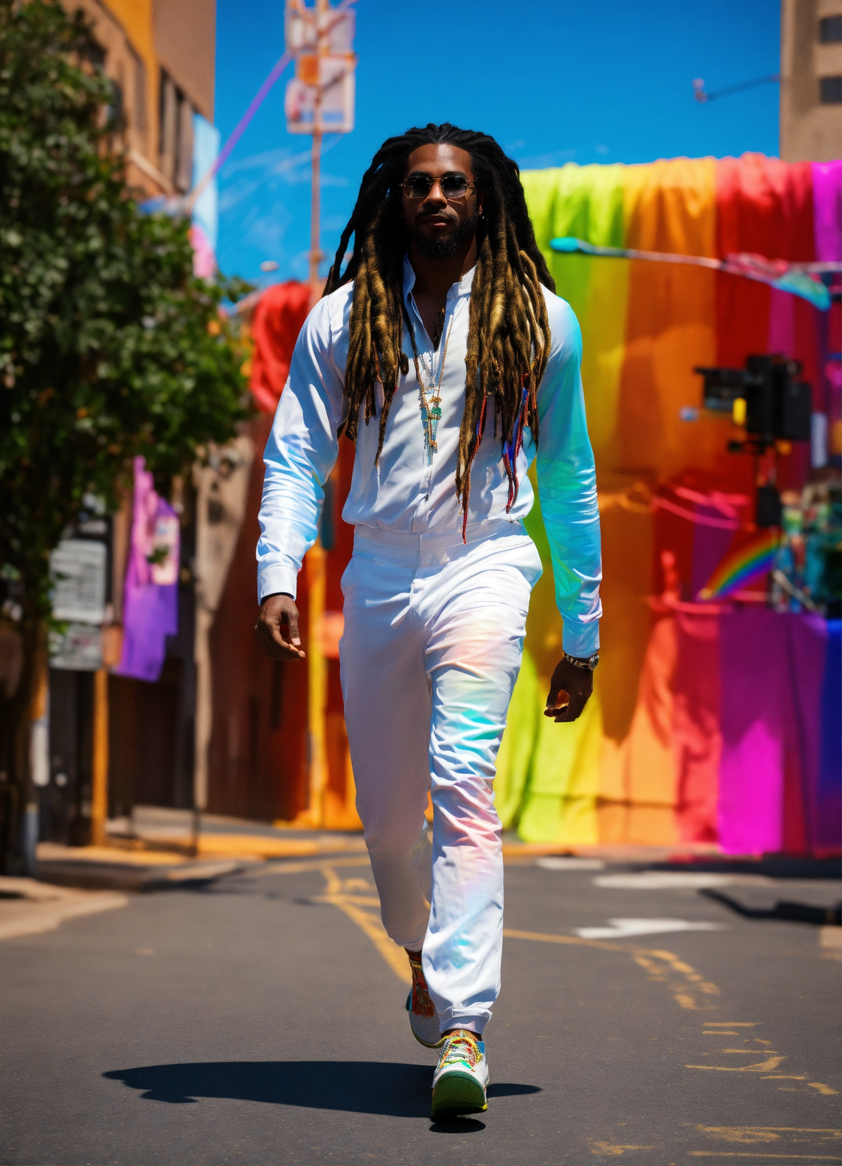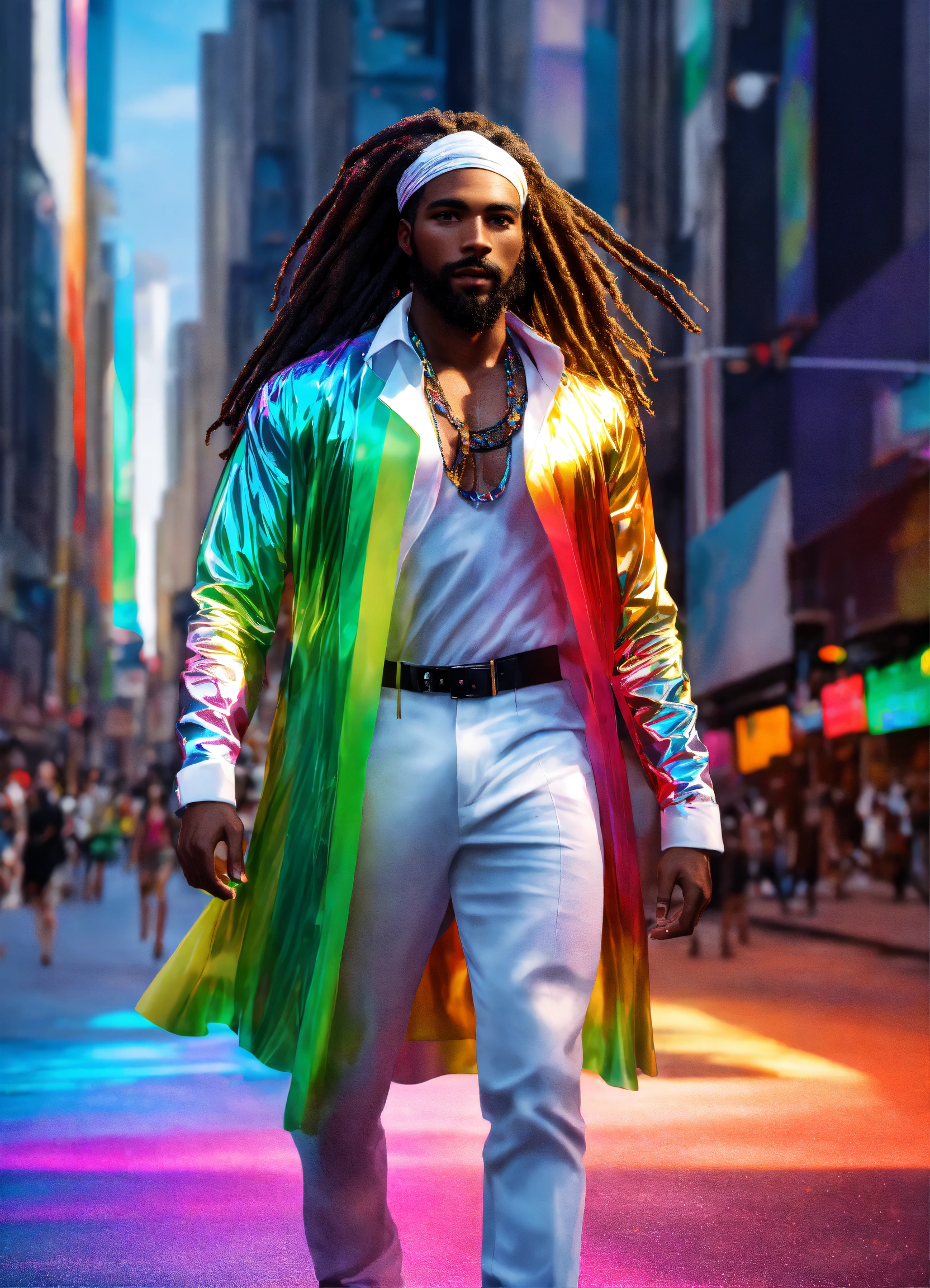 Hologram of a black man with long flowing dreadlocks, well-built, virile, 6' 5" tall, he has iridescent black skin that reflects all the colors of the rainbow, full body shot, striding up the street confidently, looking directly into camera, wearing white iridescent clothing, african style iridescent clothing that reflects all the colors of the rainbow, 3d render