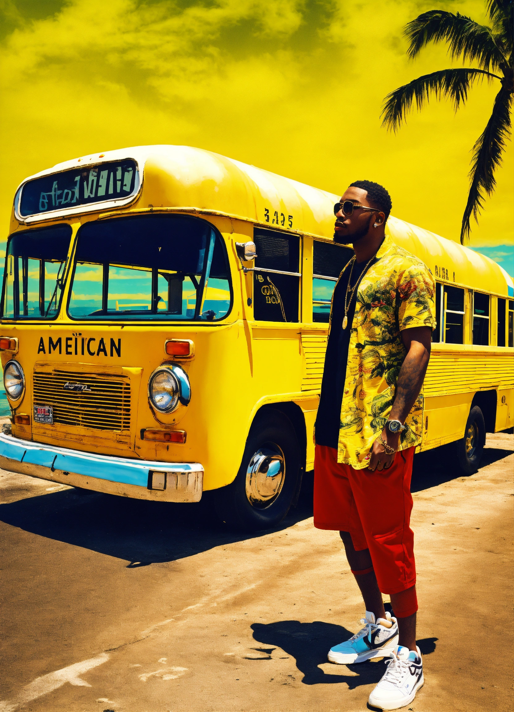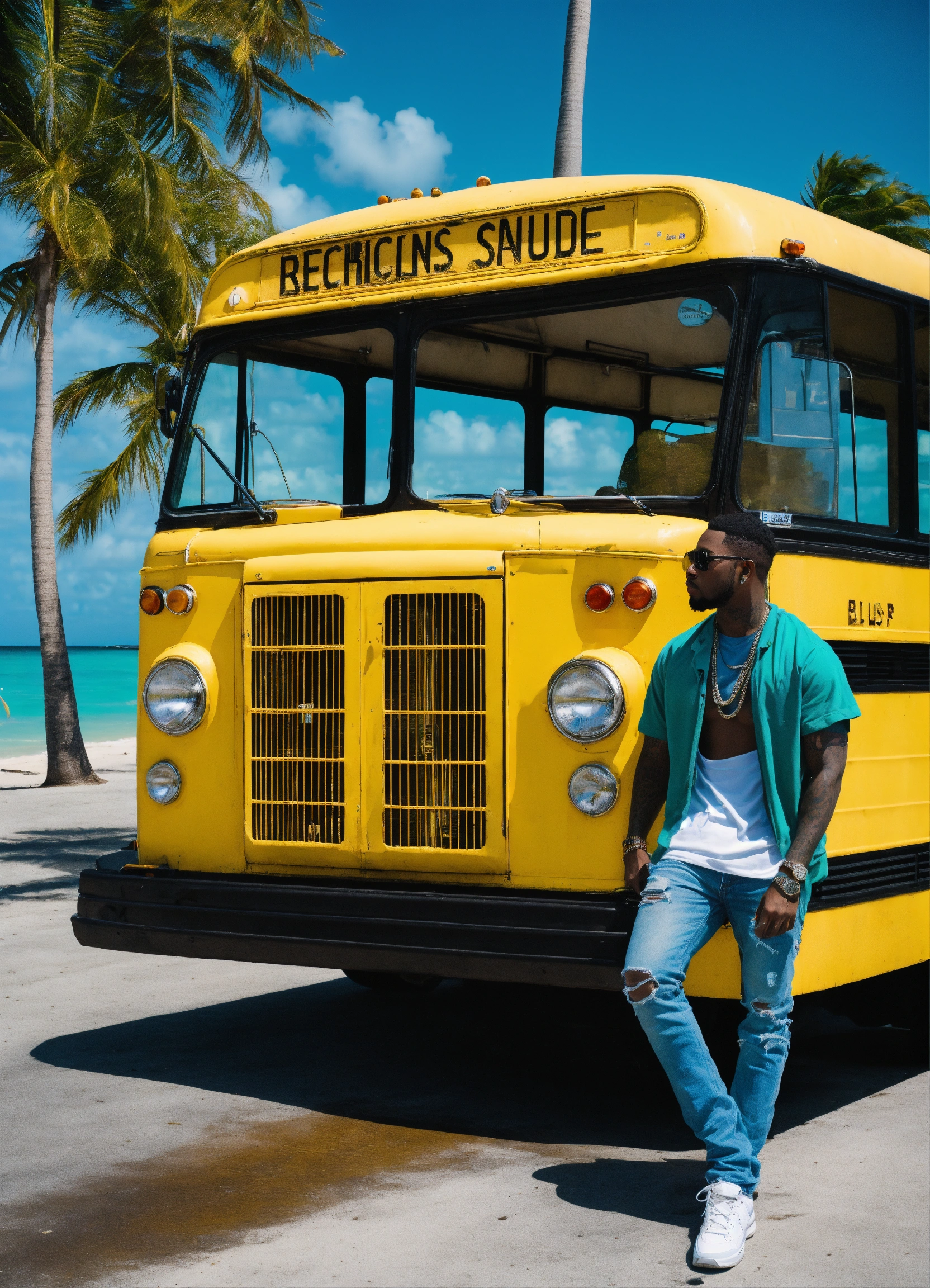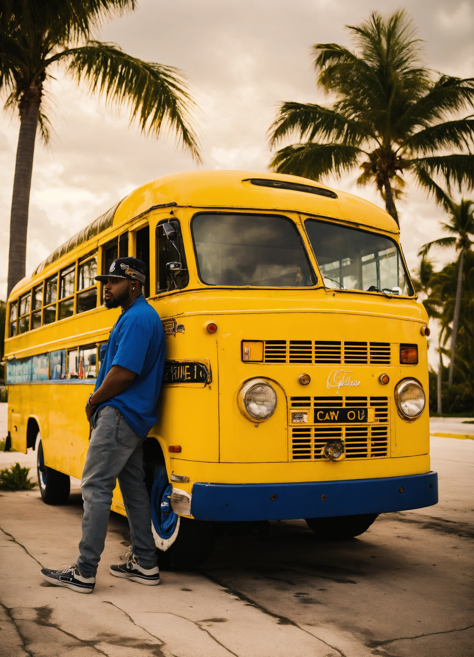 Iper realistic american yellow bus in miami bech with rapper