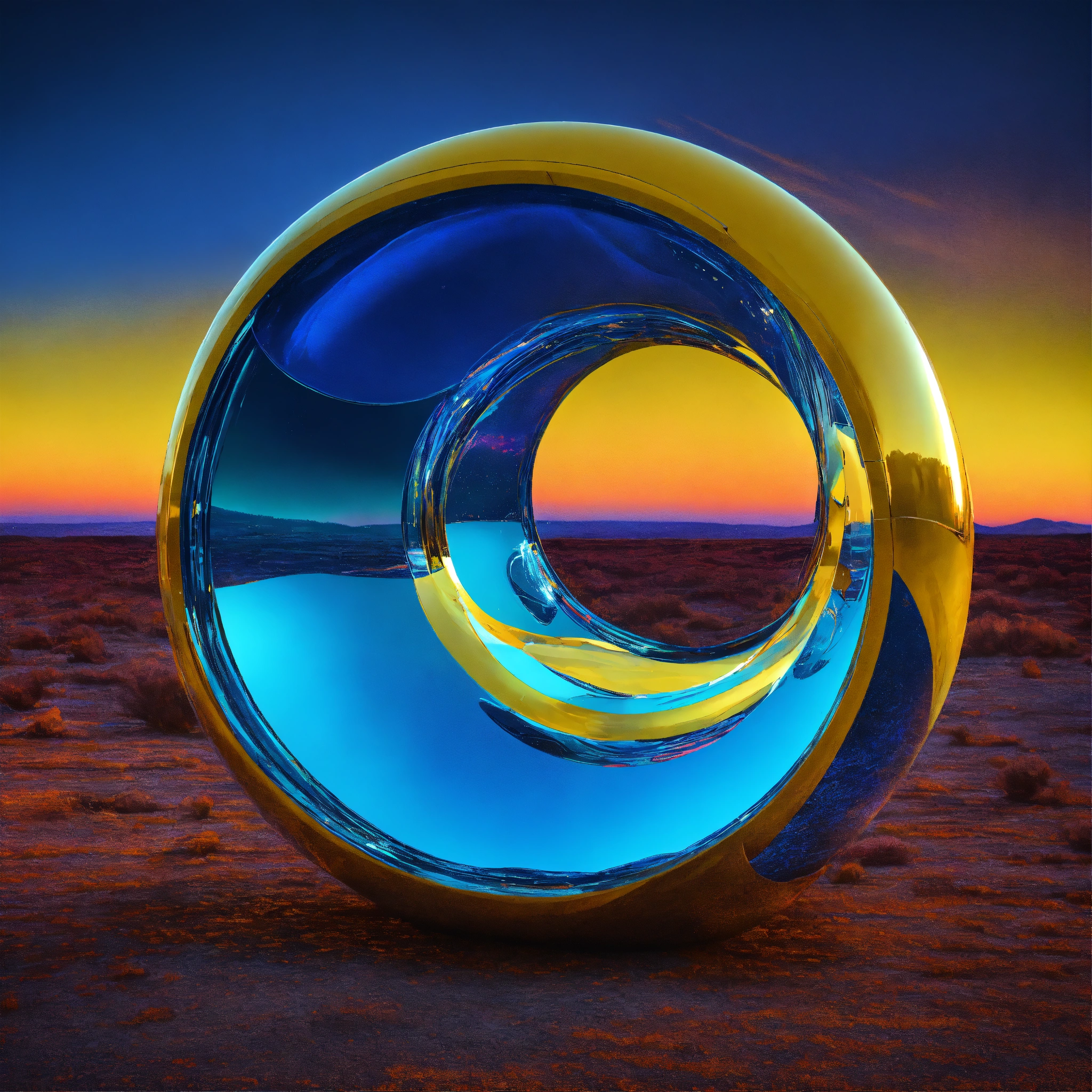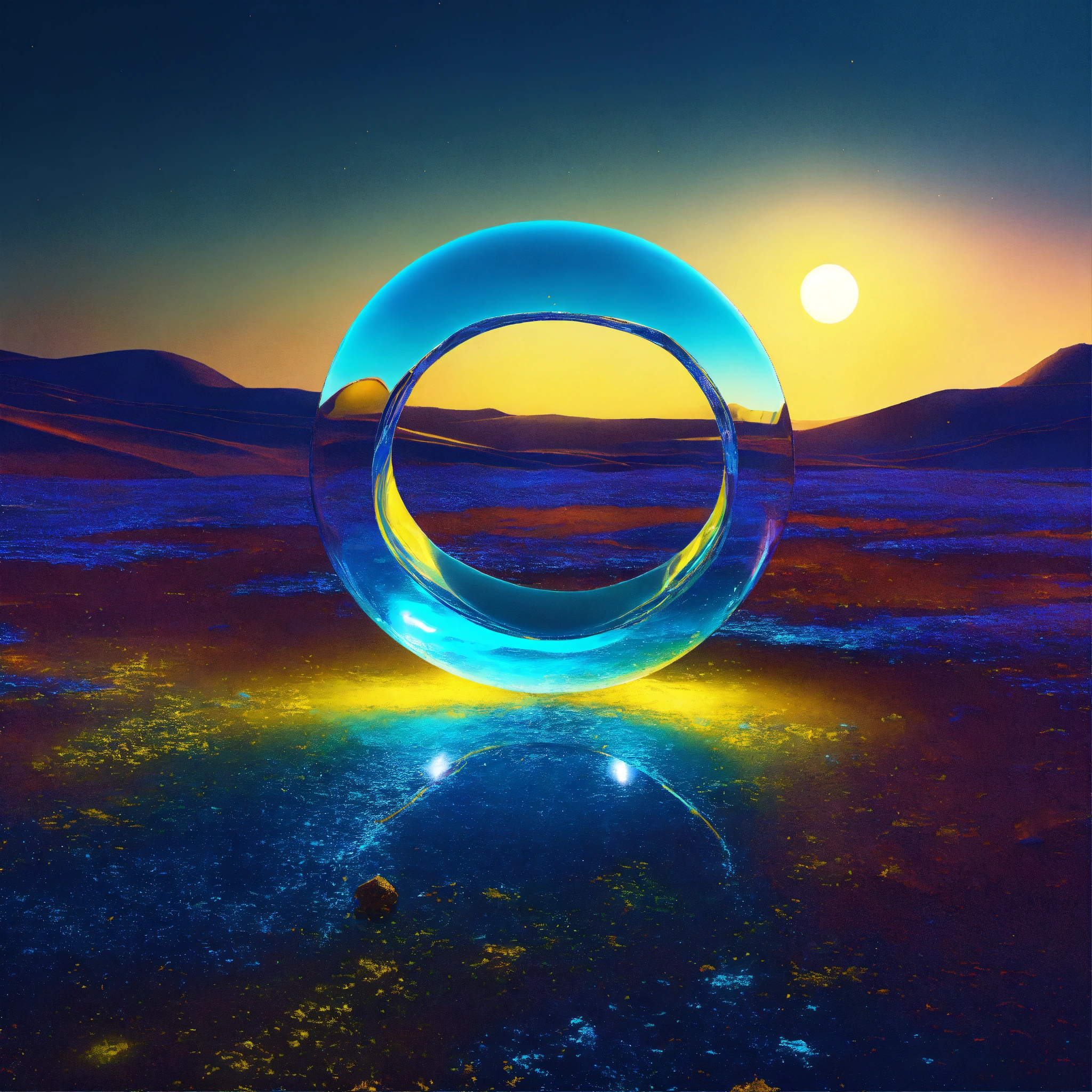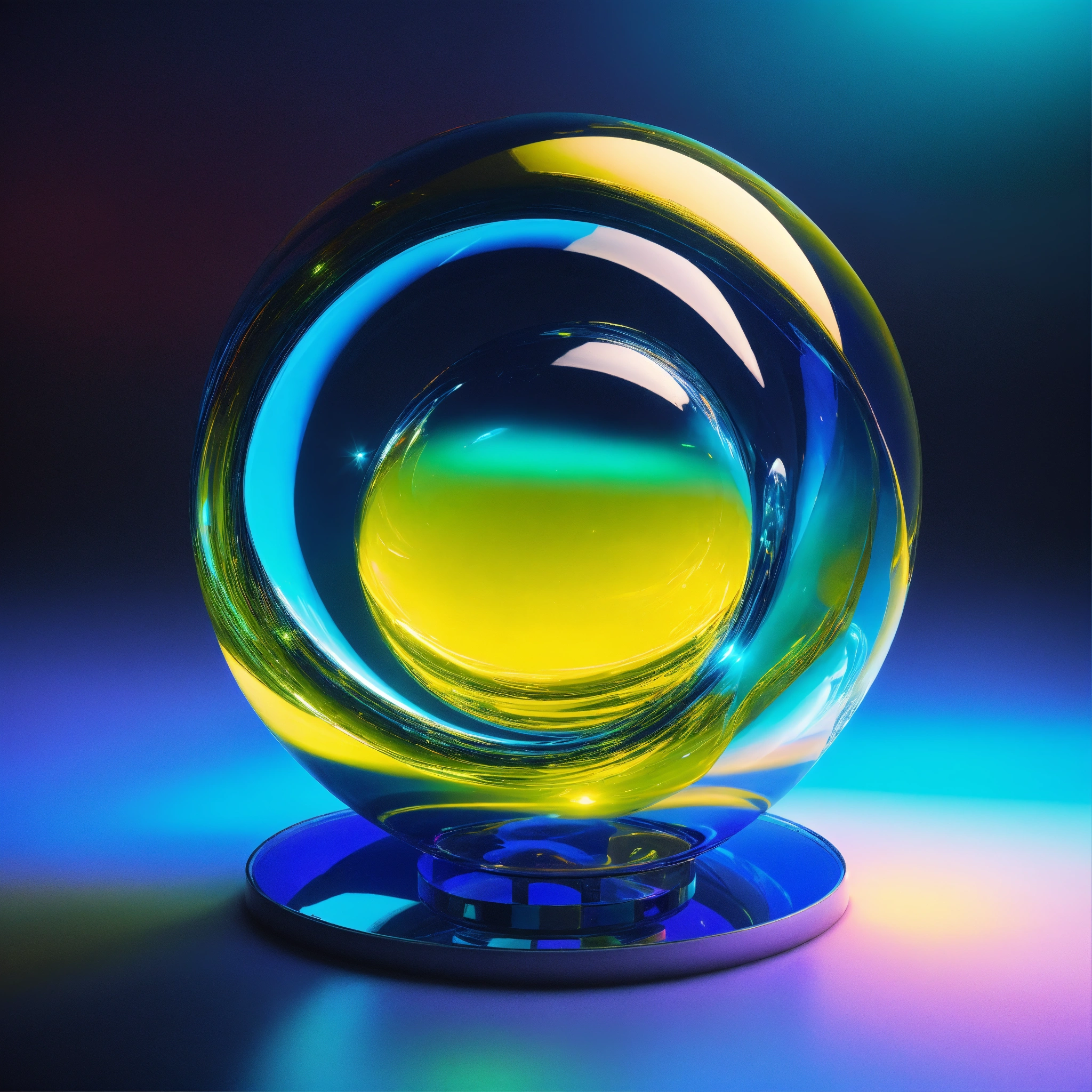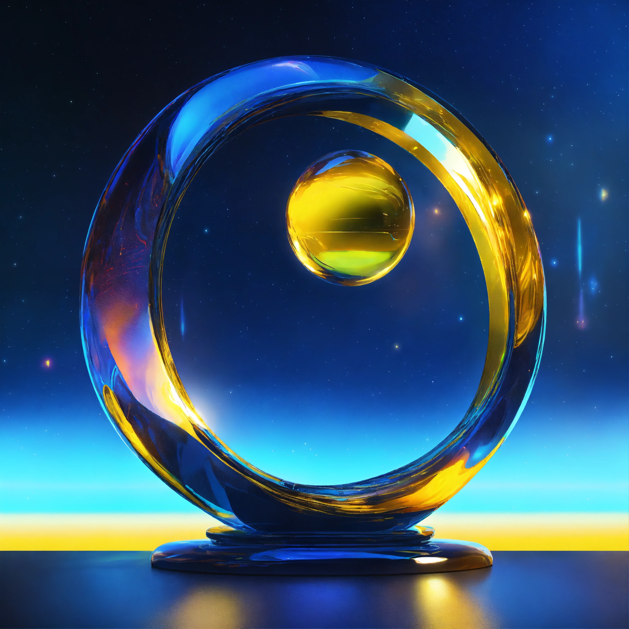 Metallic and glassy surface, vivid tones of blue and yellow, surreal futuristic neatly object, heavenly and intense neon lights, a glass installation on the open land without. background of a dreamy world. symbolizing a portal to another dimension. one abstract representative object floating. --ar 169 --s 1000 --c 15
