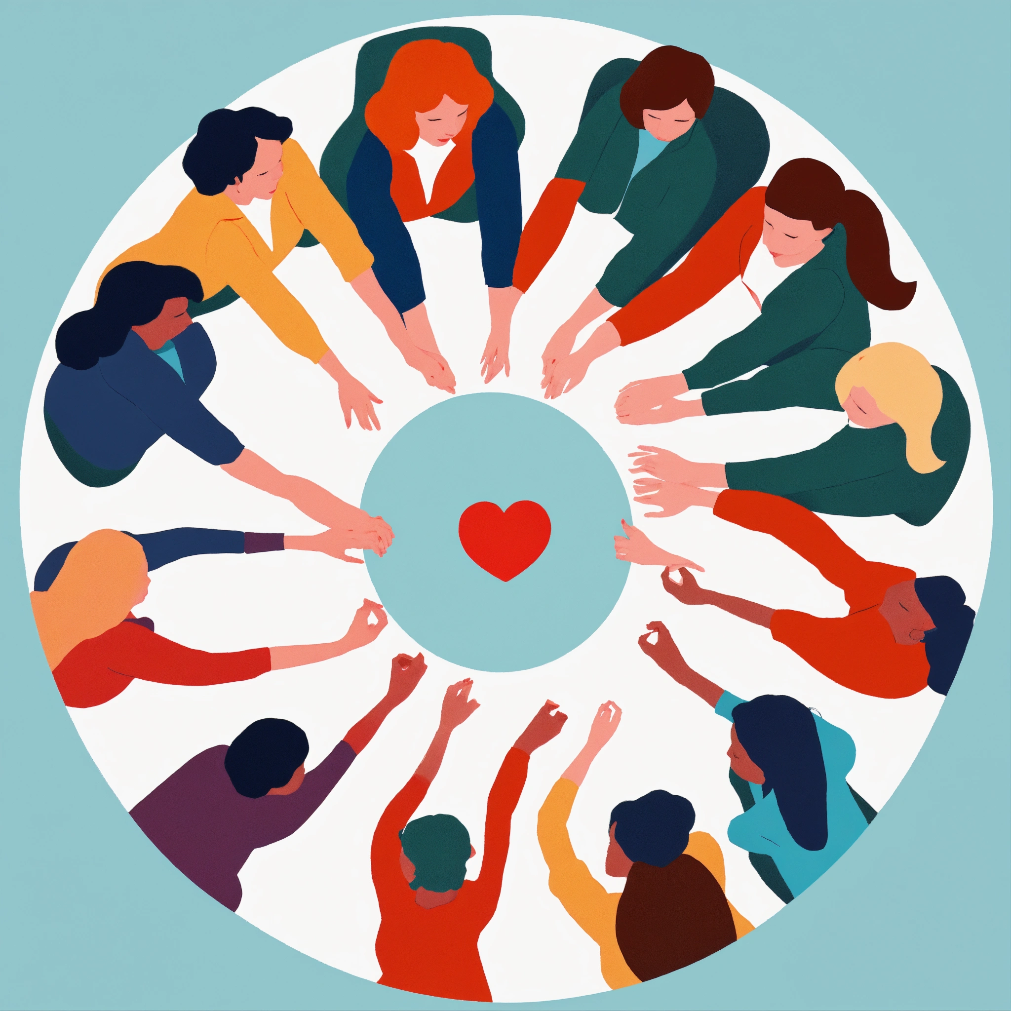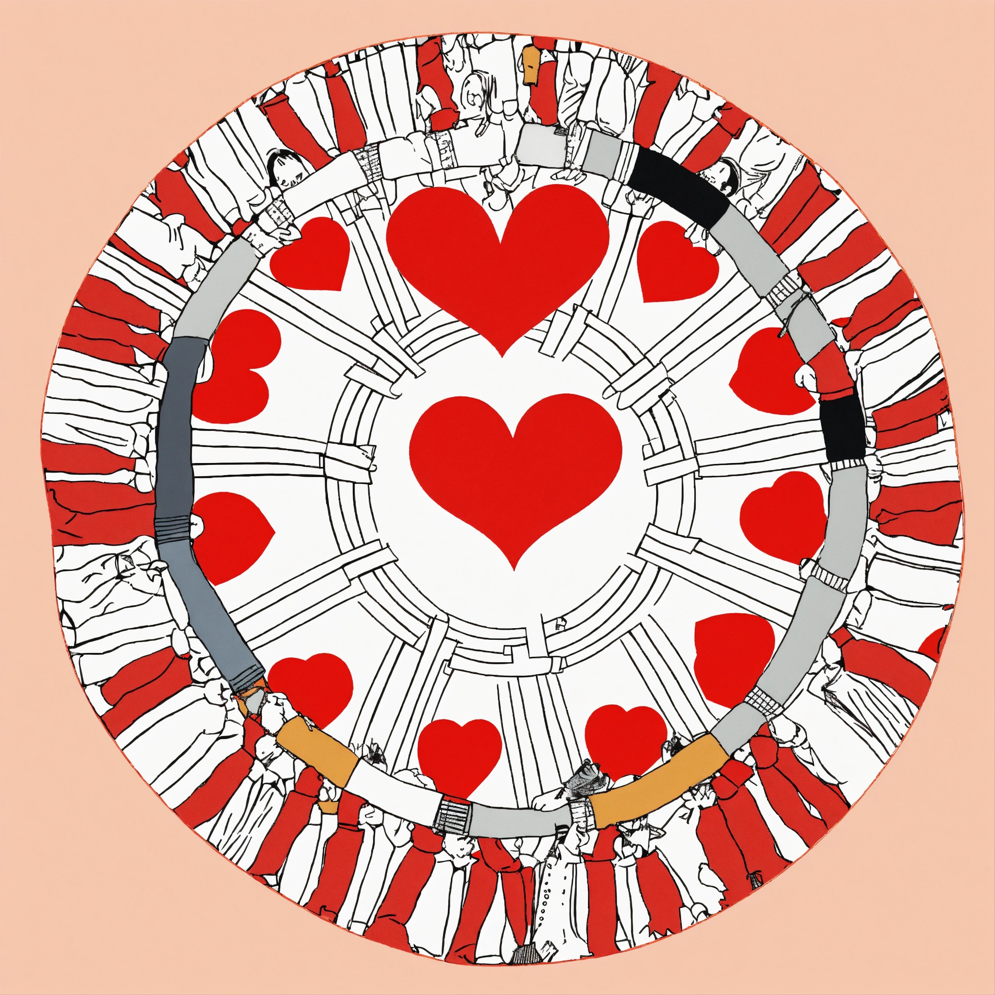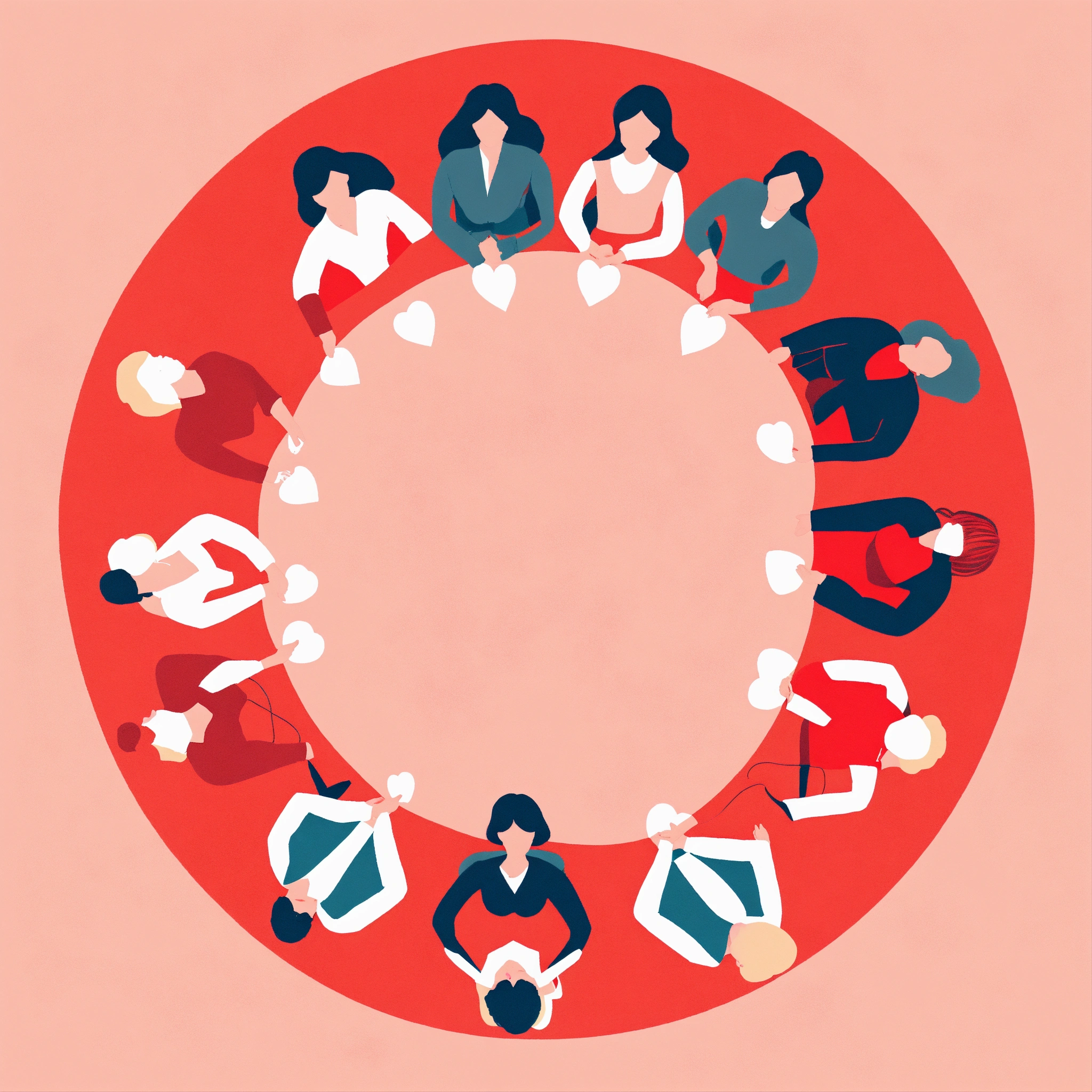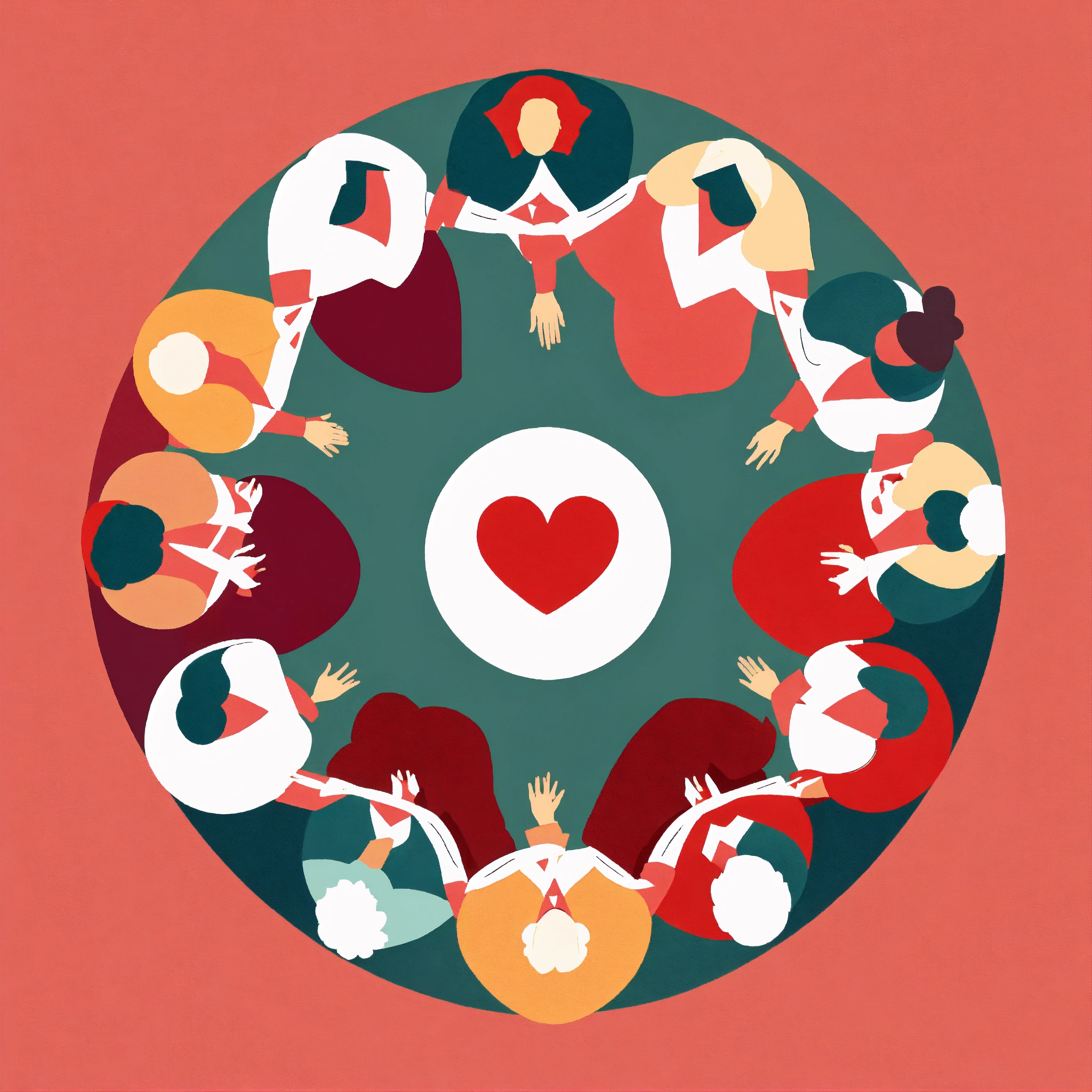 Illustration of eight white women linking arms in a circle, large red heart in the center, aerial view, minimalist style.