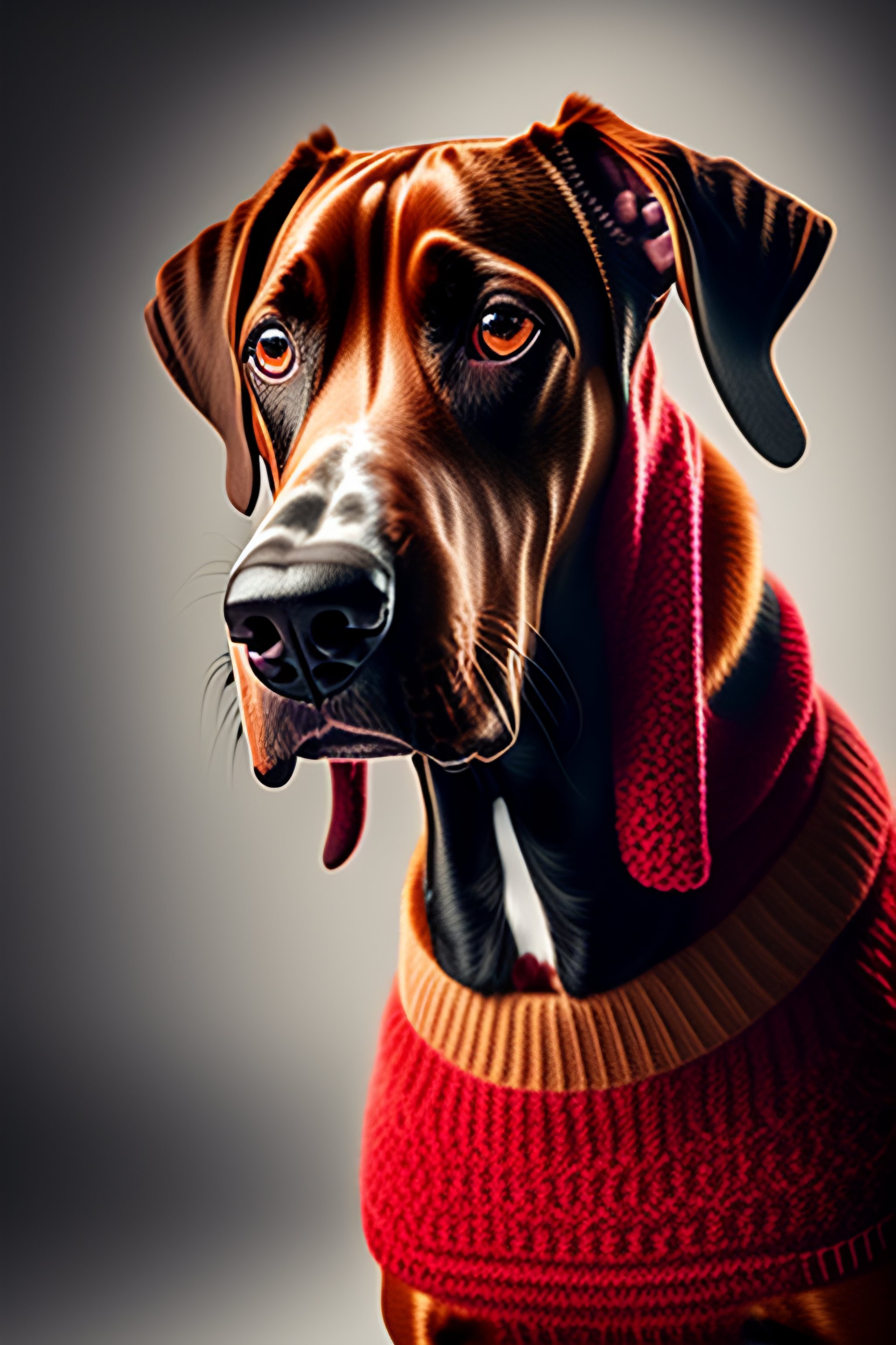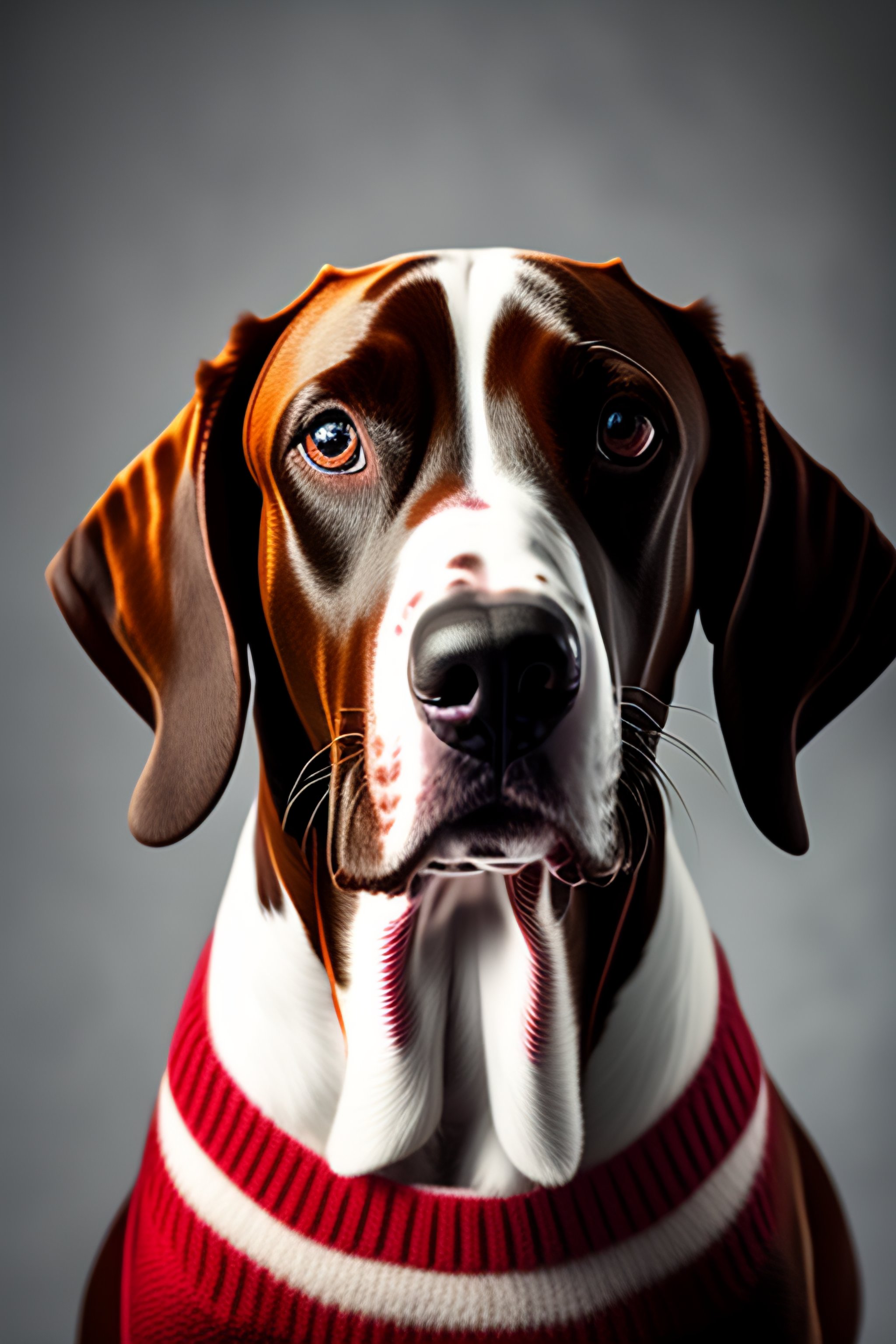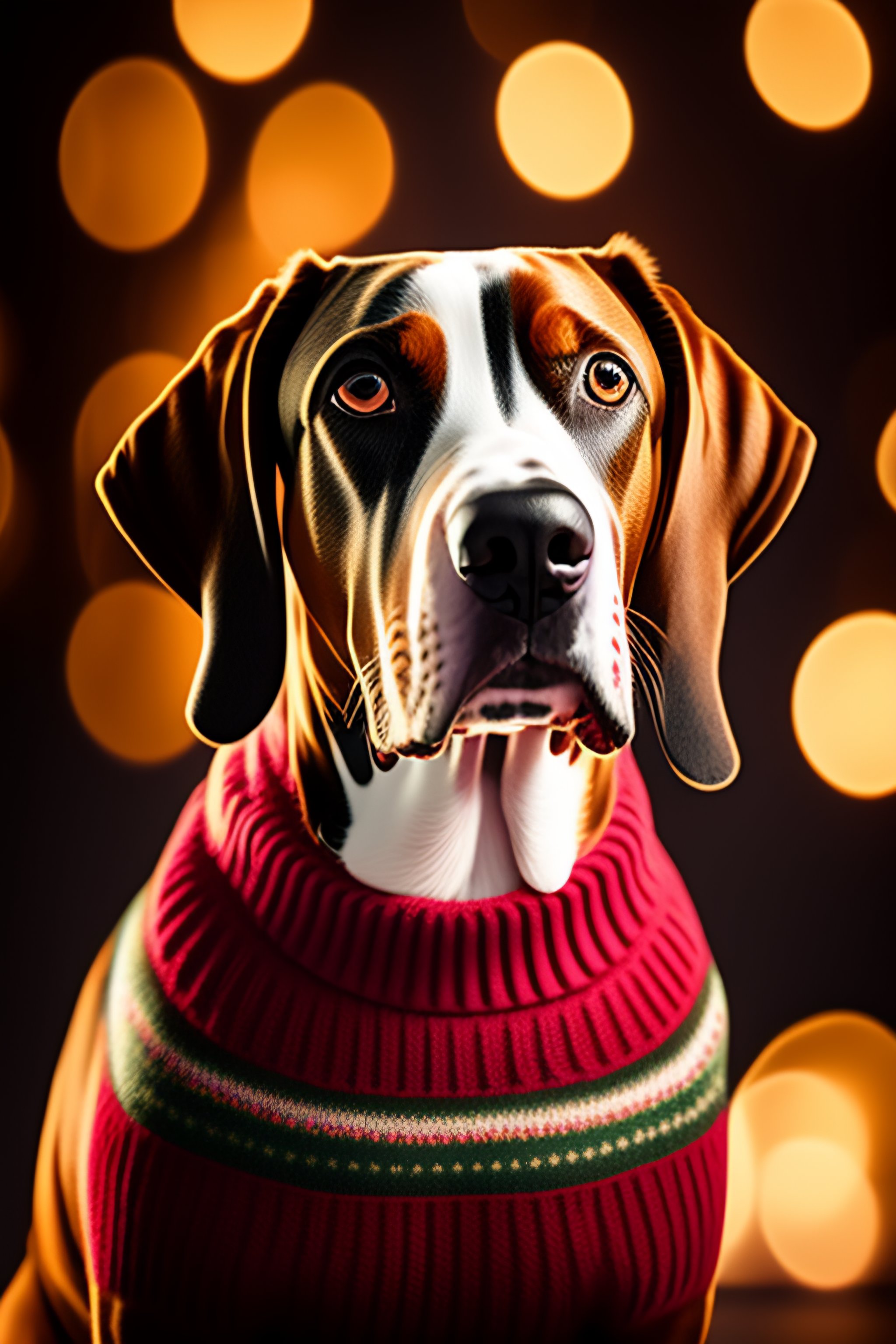 Studio photography of a german shorthaired pointer dog wearing a woolen christmas sweater, detailed face, cinematic lighting, 8 k