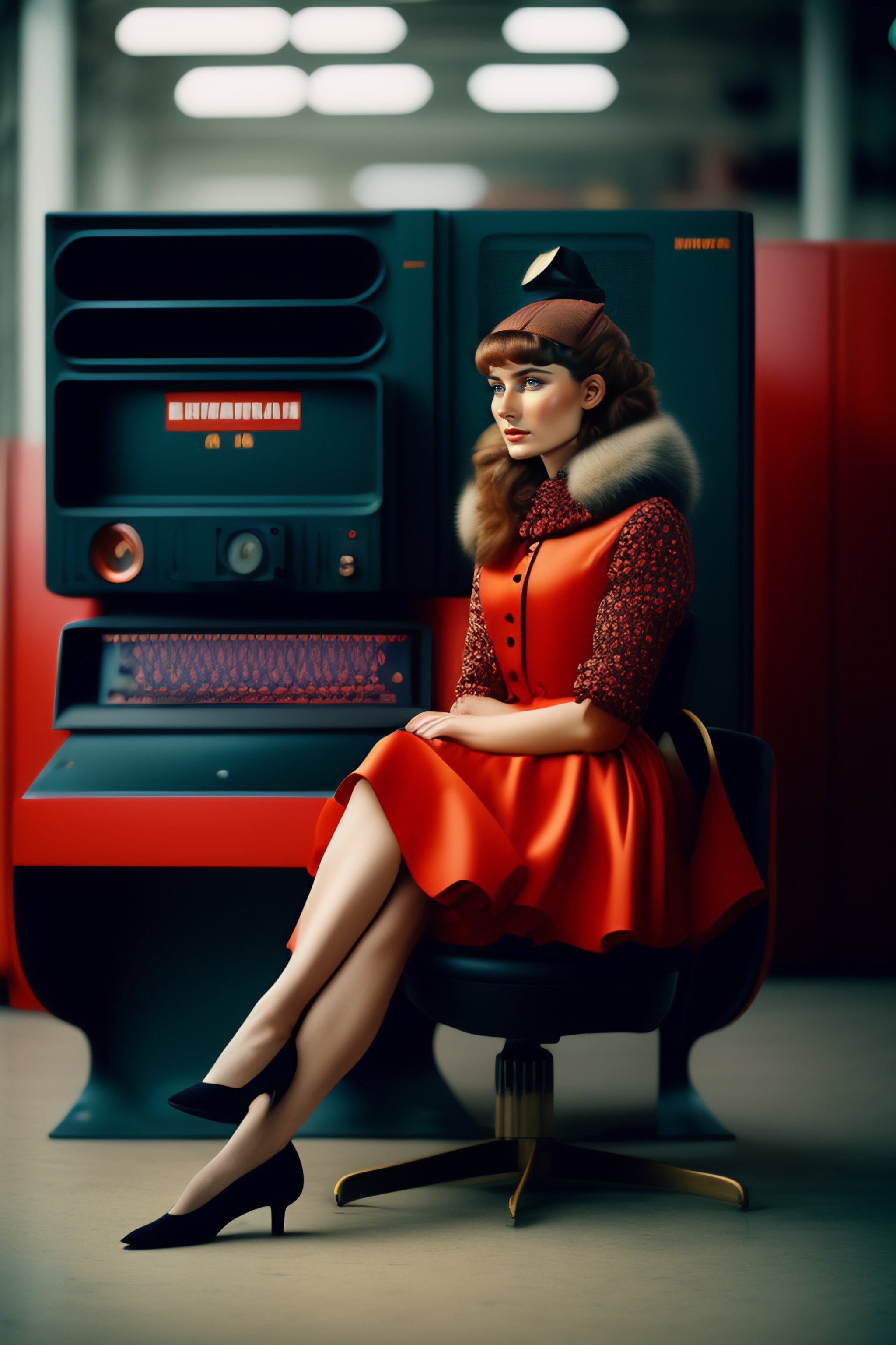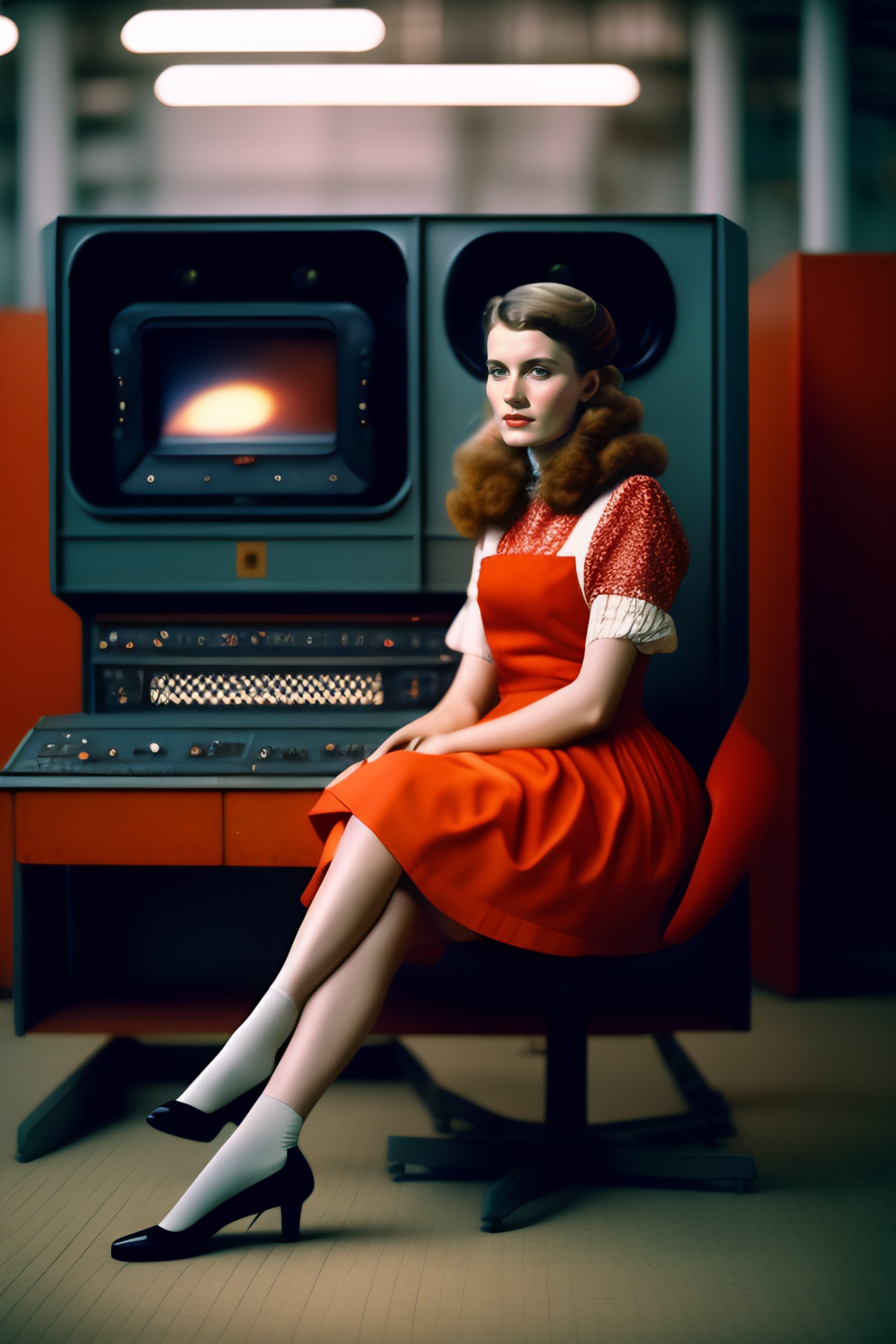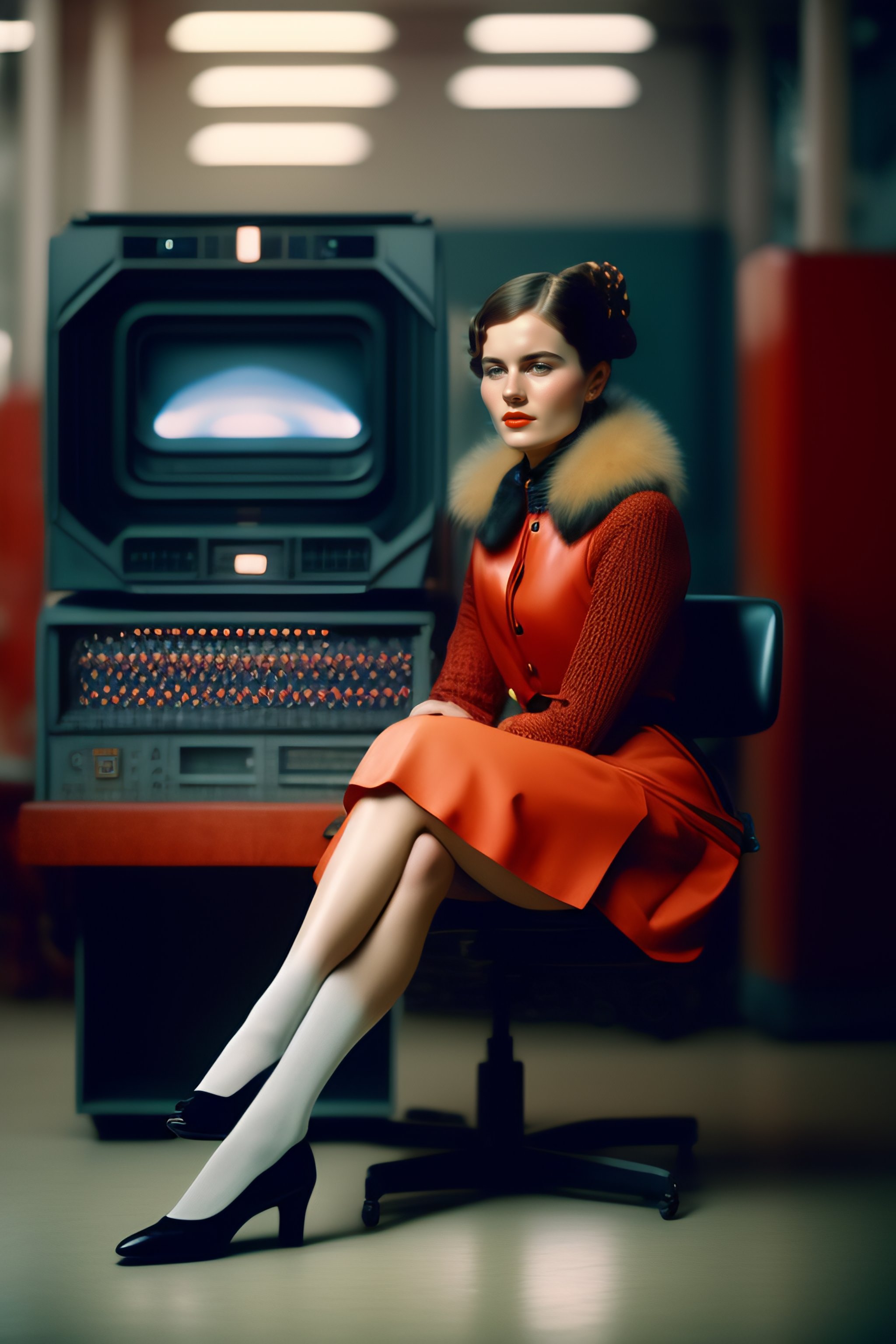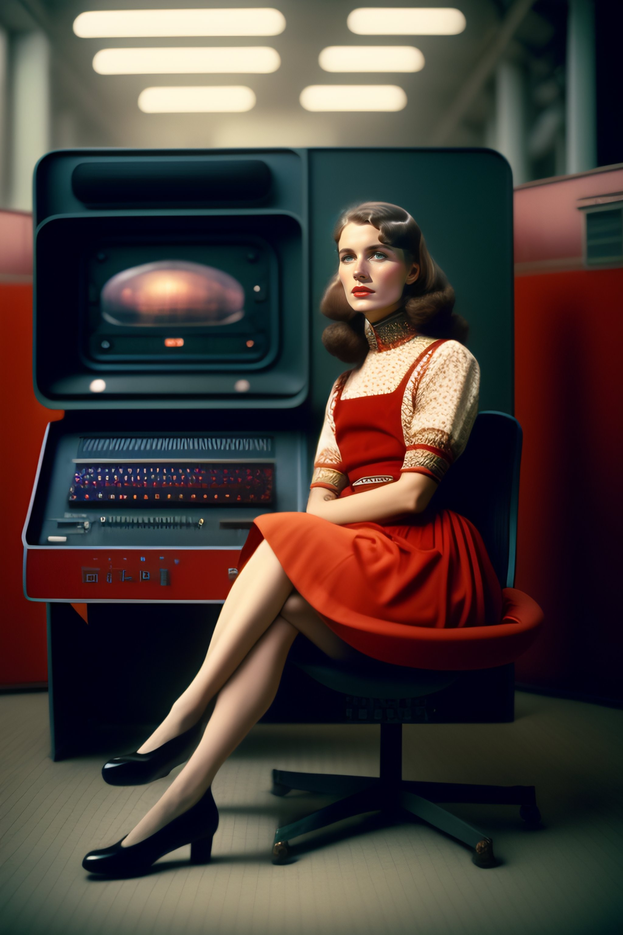 A soviet girl sitting in a chair in front of a soviet computer in the communal factory, 8k, cinematic lighting, photographic, eastman kodak color negative film 5251 50t shot on panavision super ps . no arms