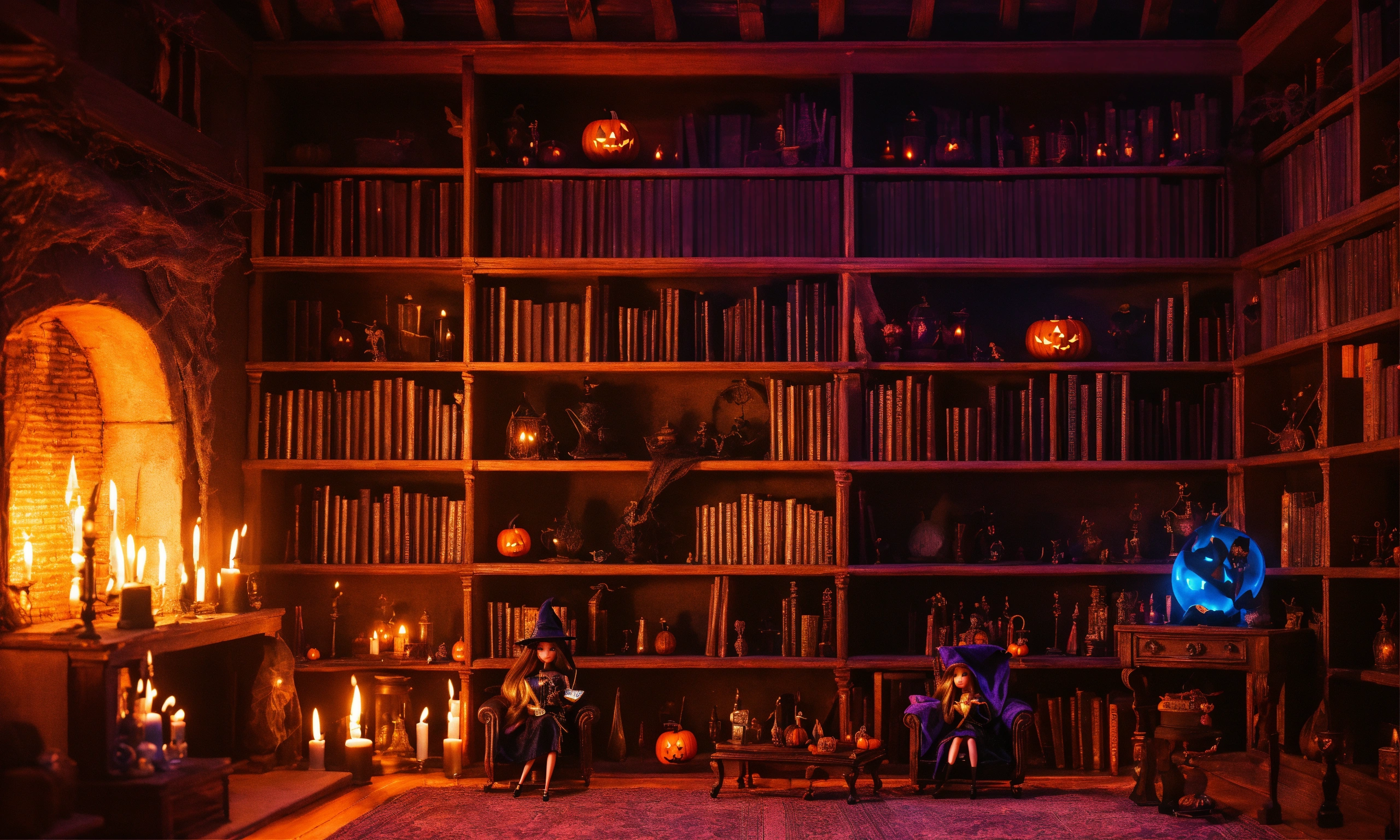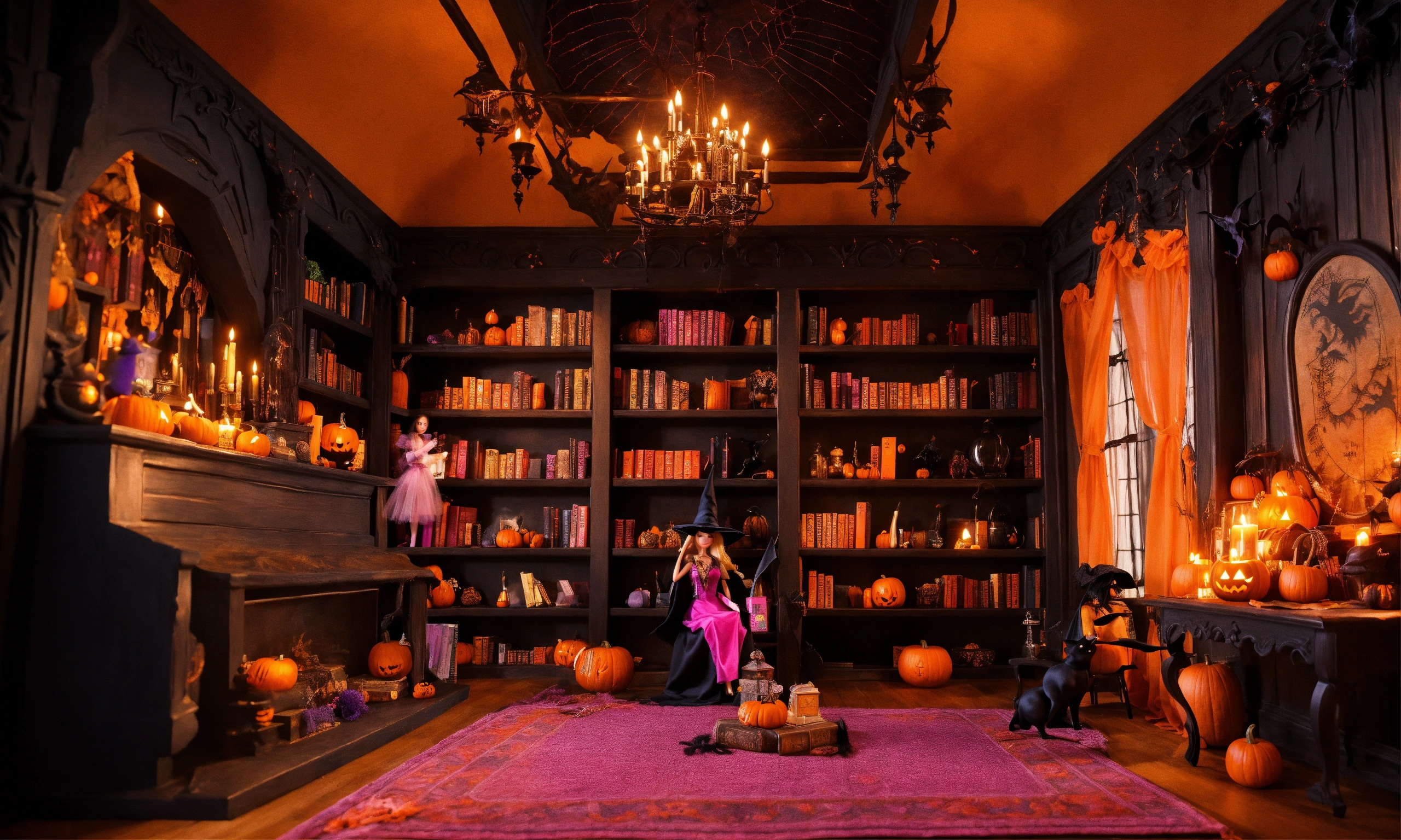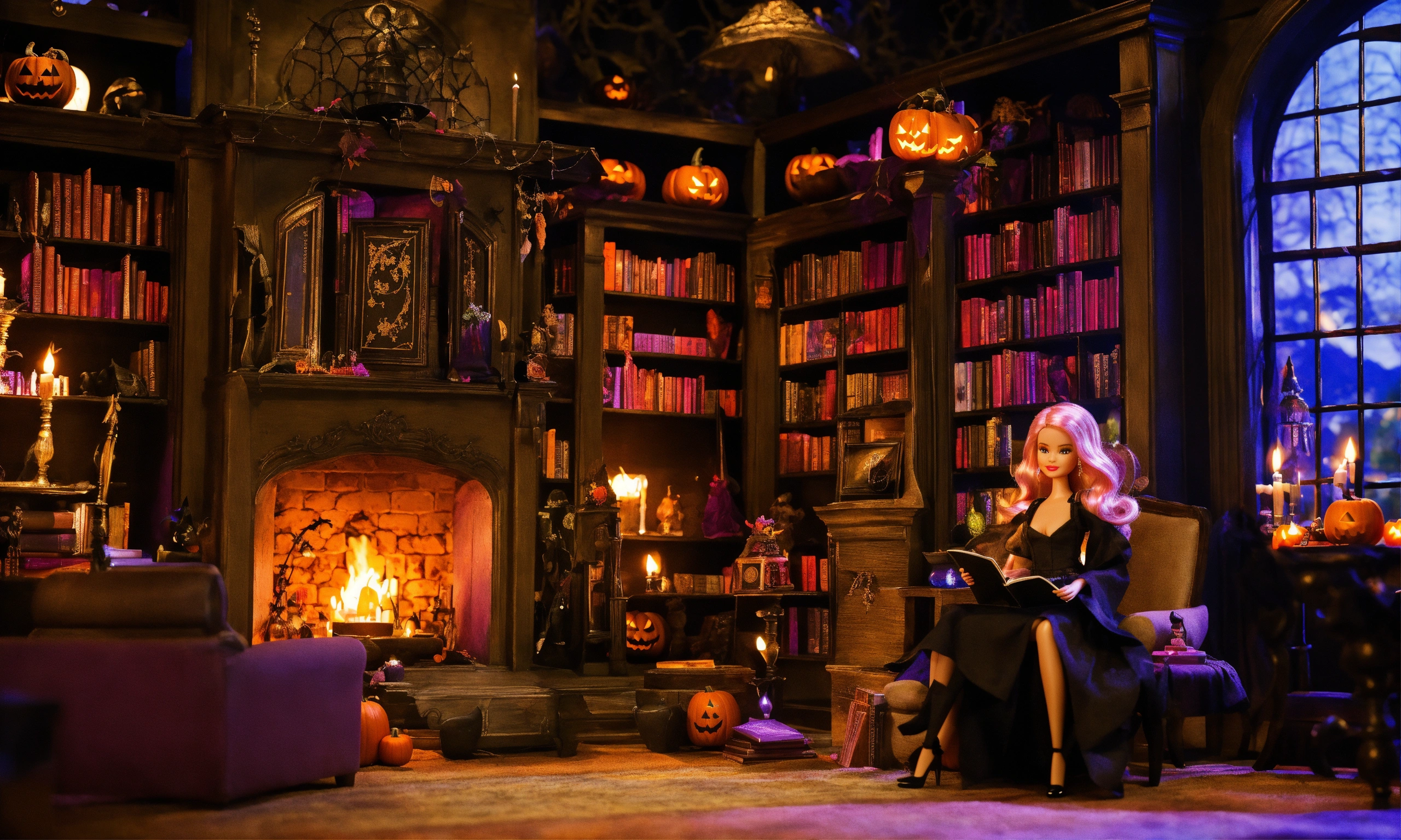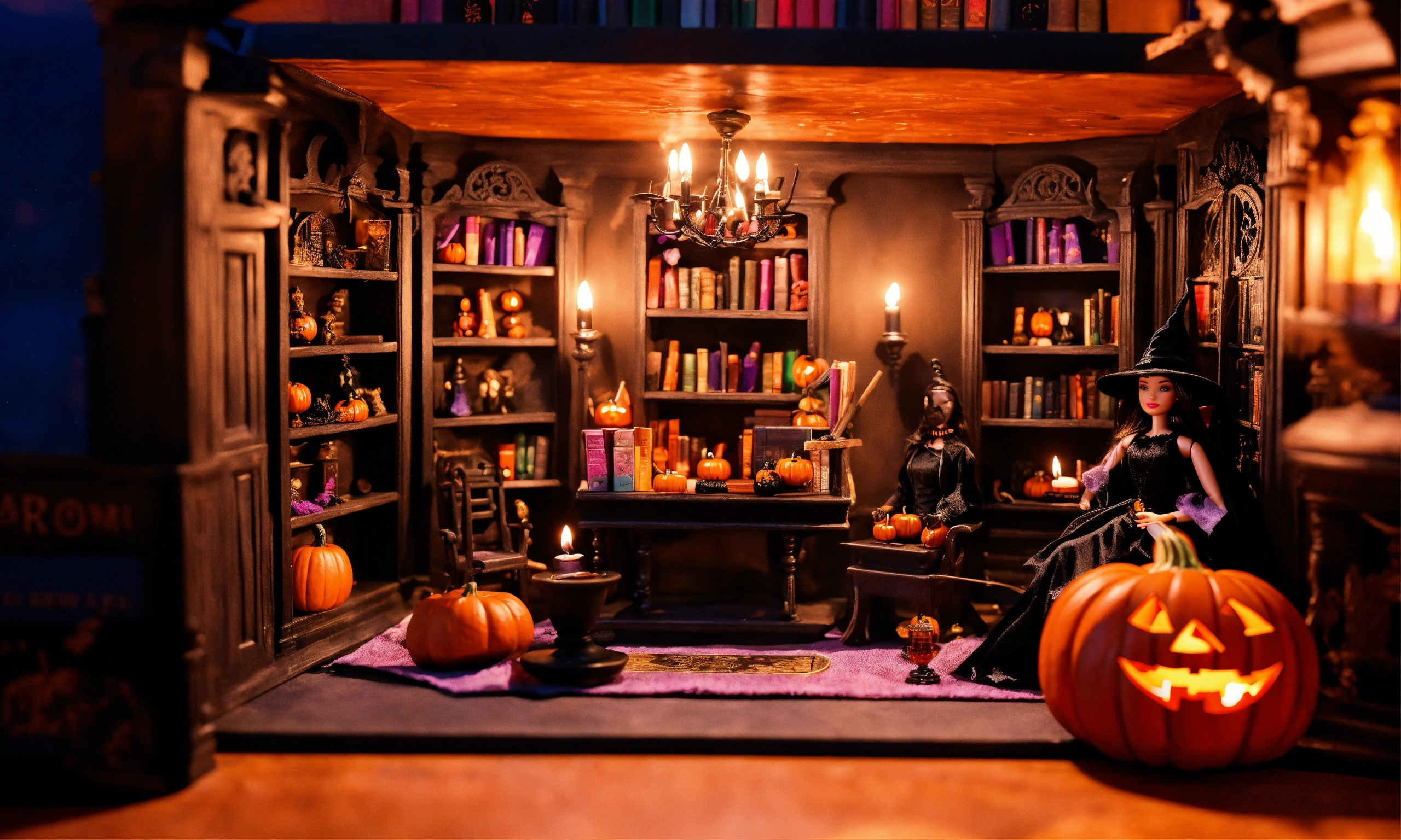 Barbie dolls, halloween witch, black, witches house interior design, potion room, with a spell book, creepy library