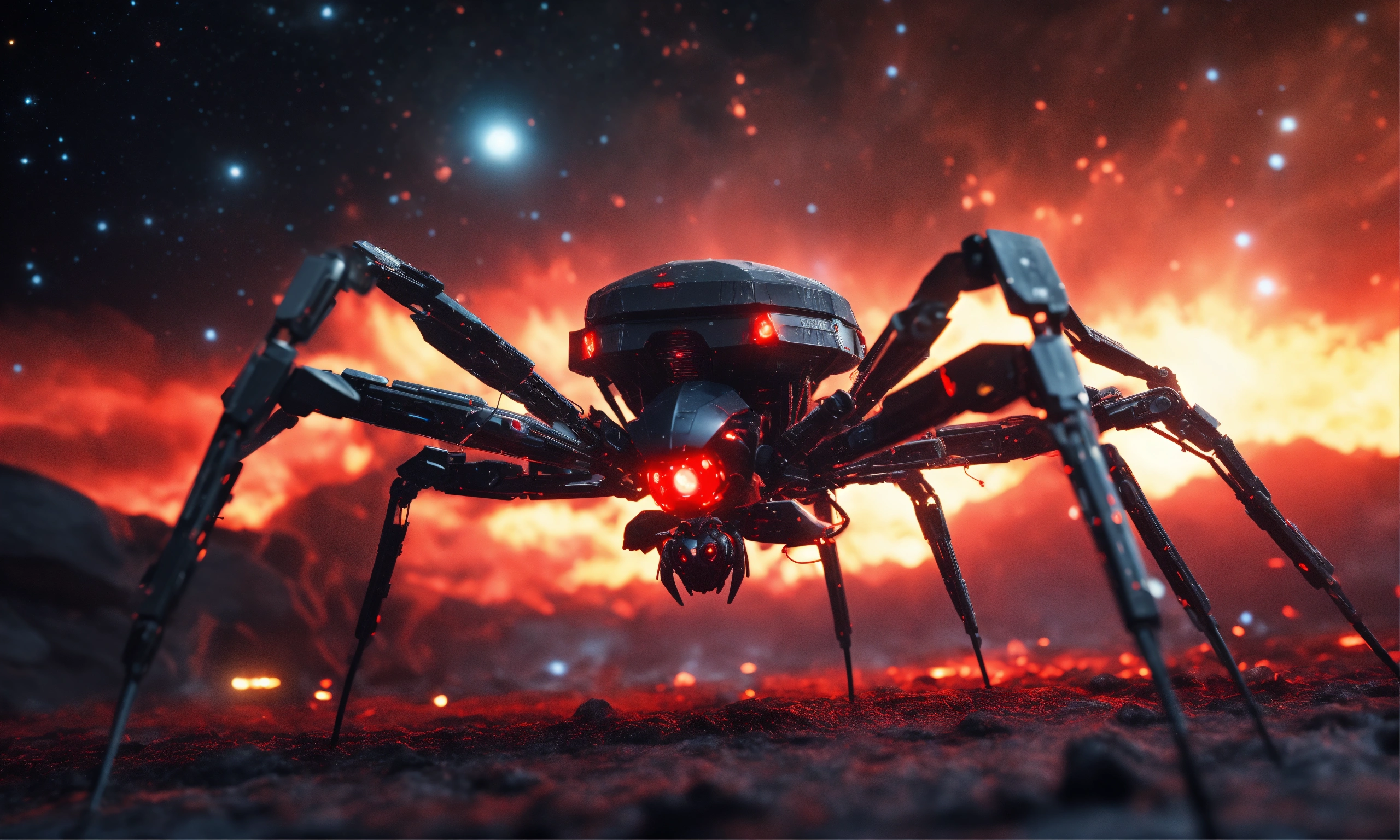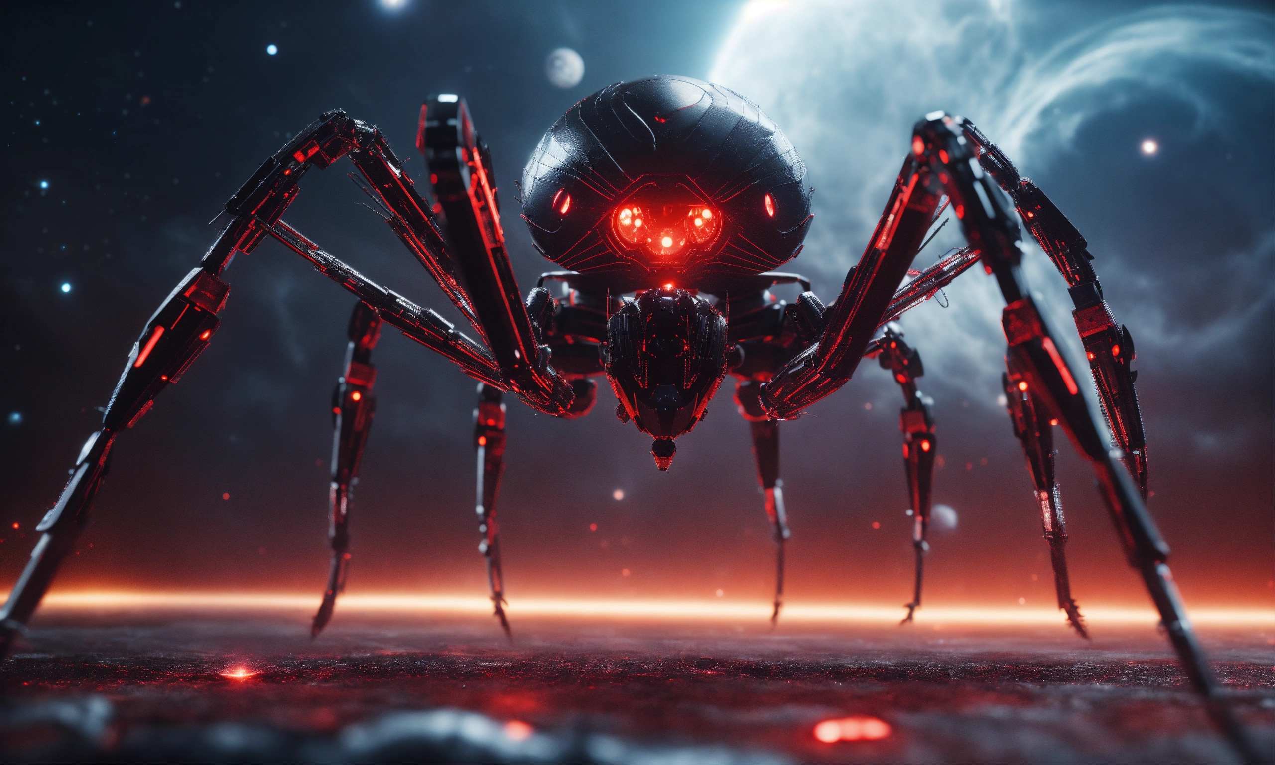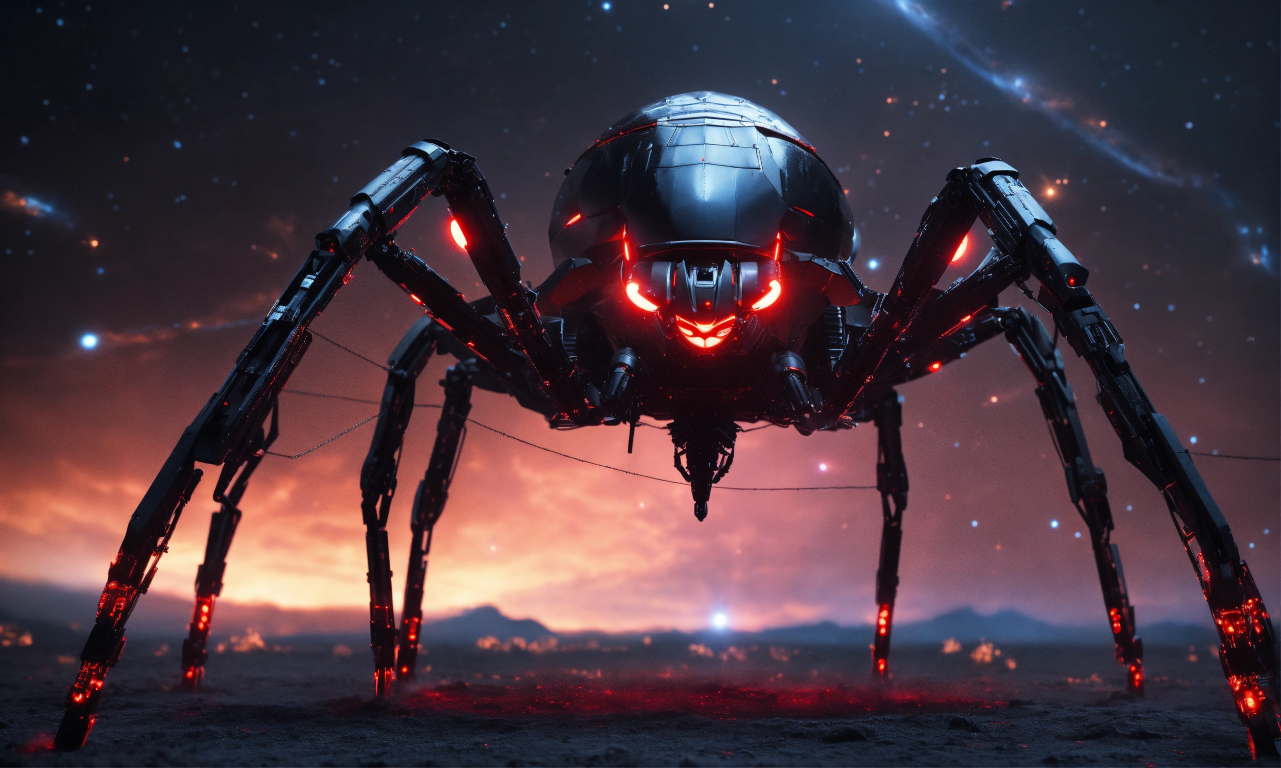 Gigantic black armored robotic spider with red glowing eyes flying in space, feeding off an energy field, the electricity flows surging with power, realistic, 8k
