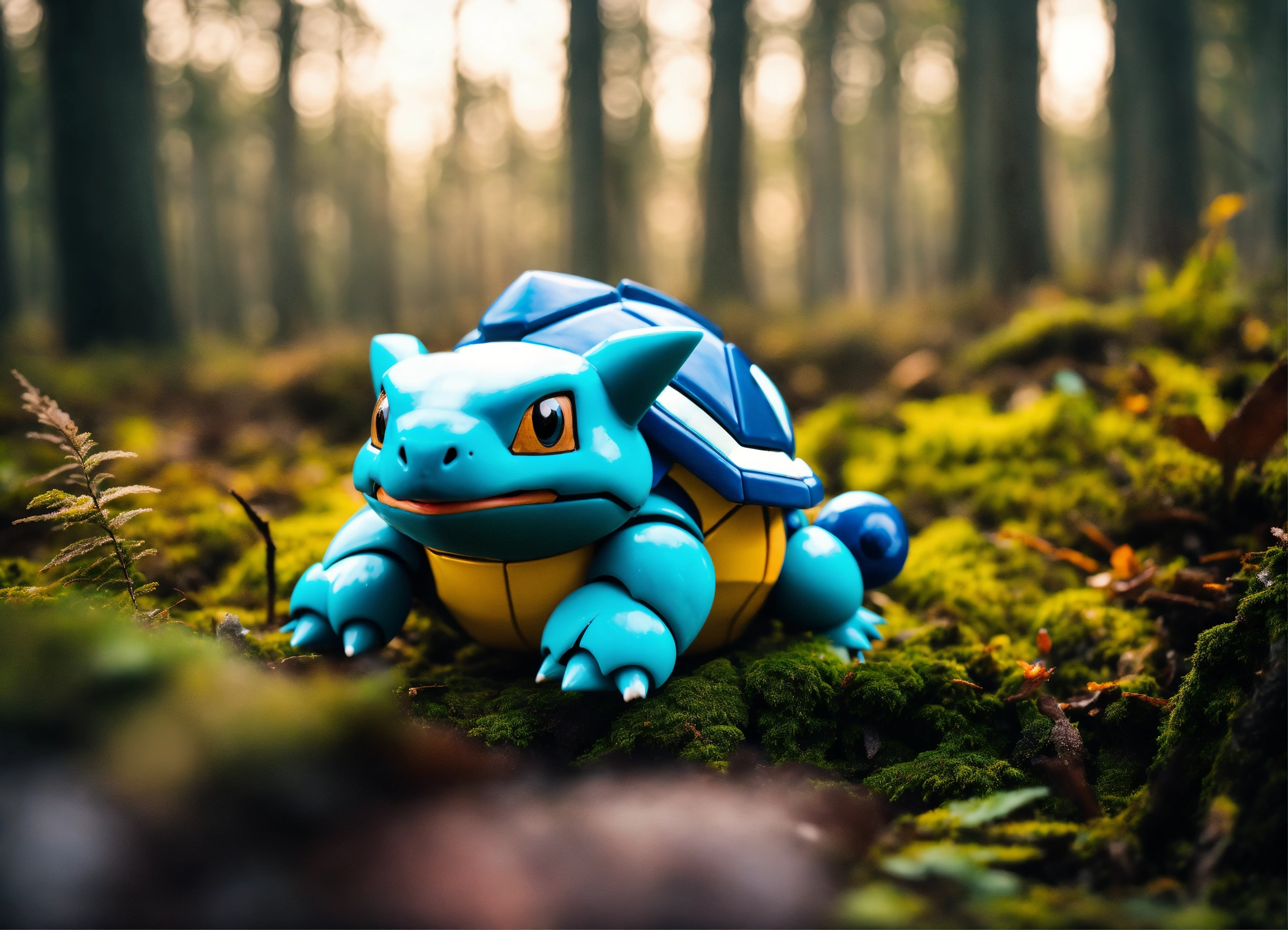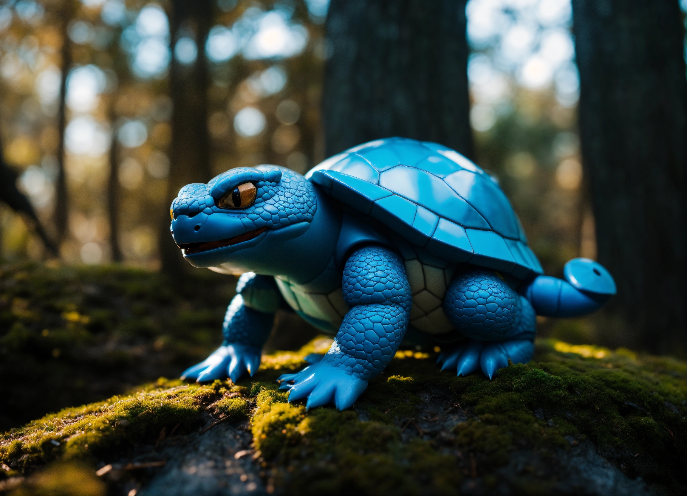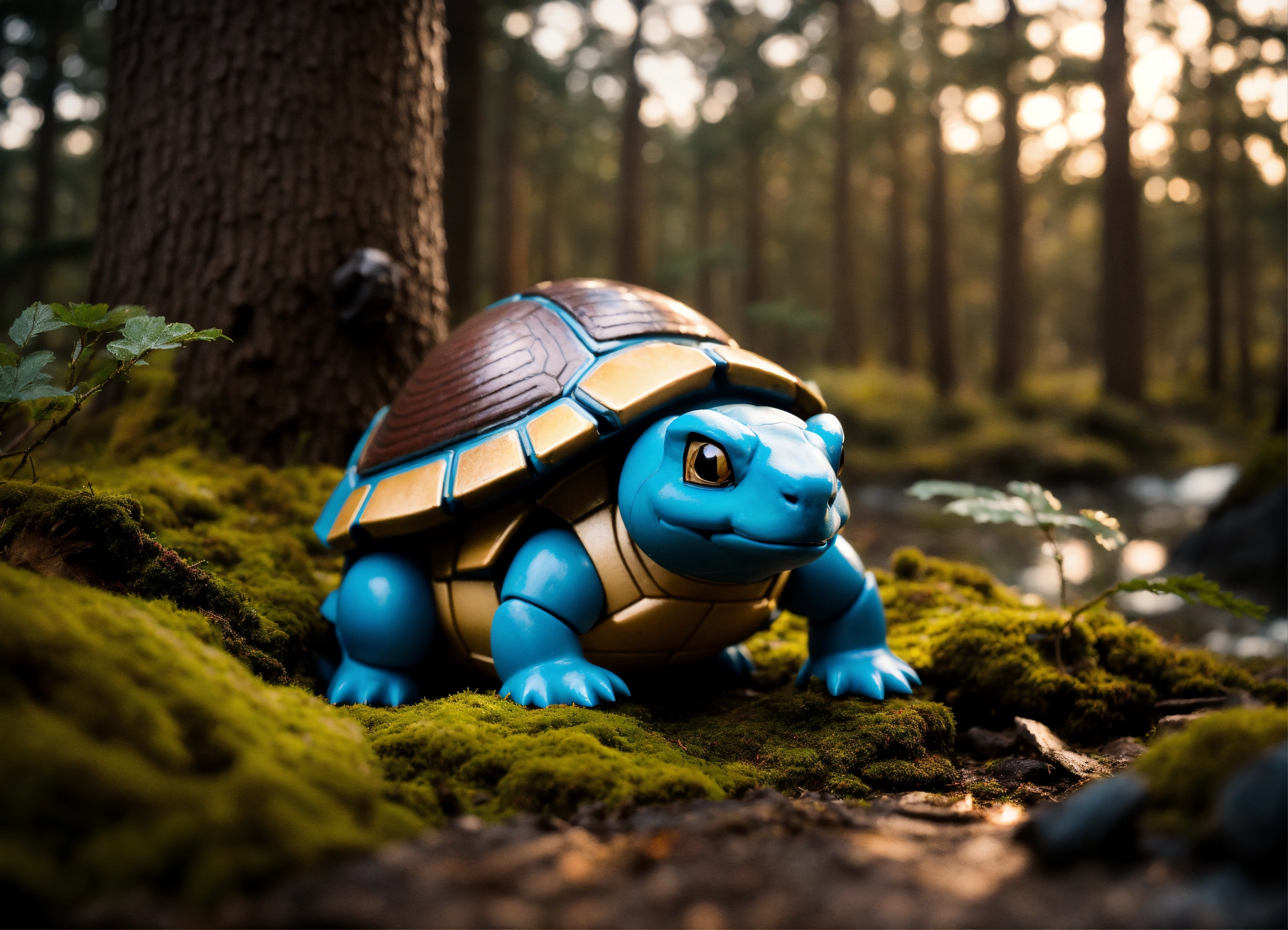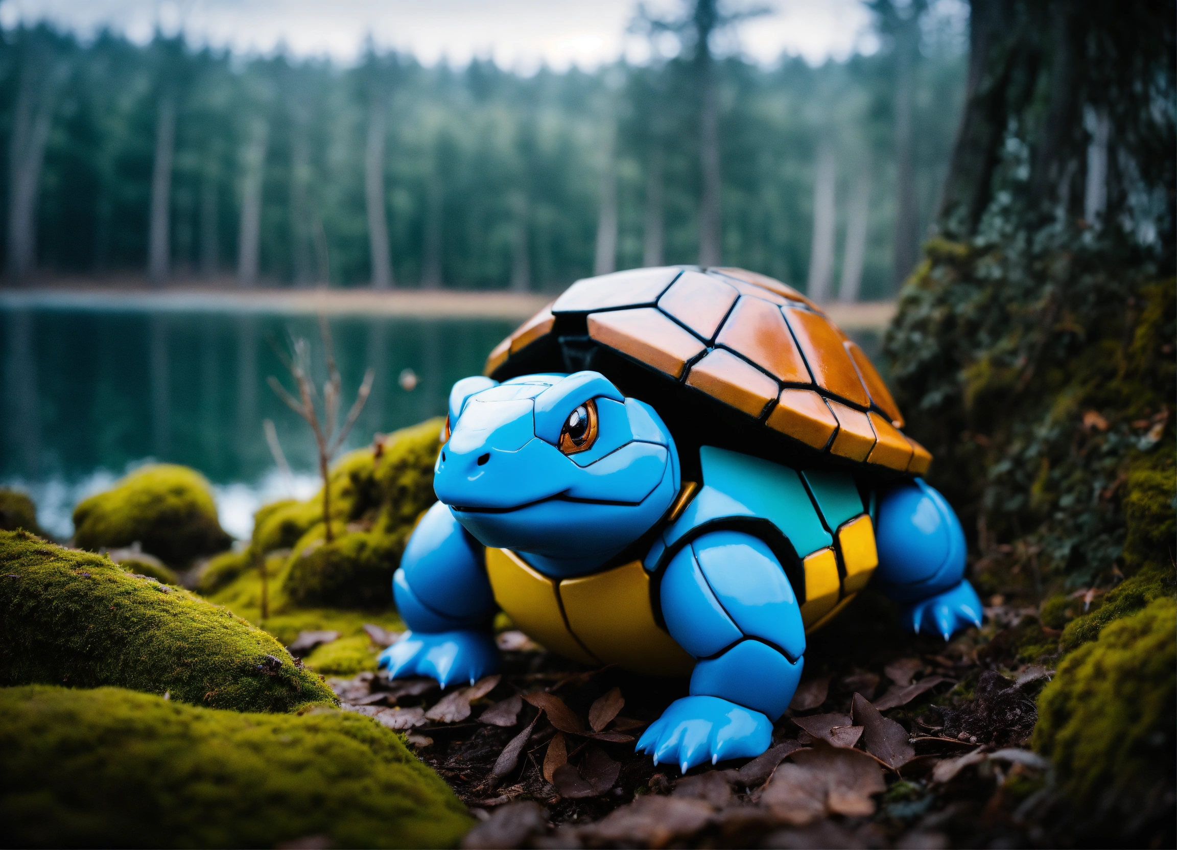Minimal, cinematic, a realistic blastoise pokemon among the trees, forest lake, moss, cold weather, dark teal and amber, sony a7 iv