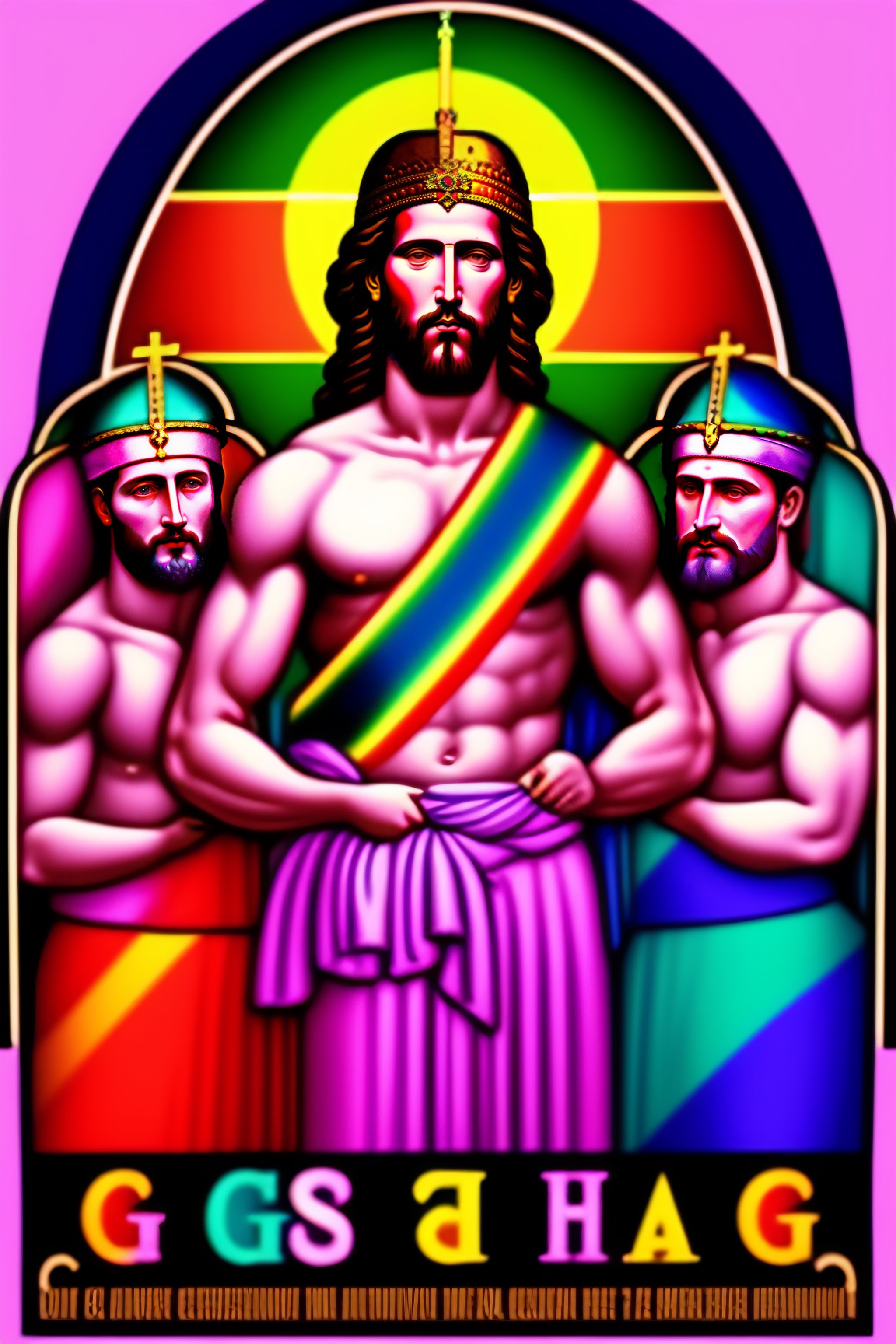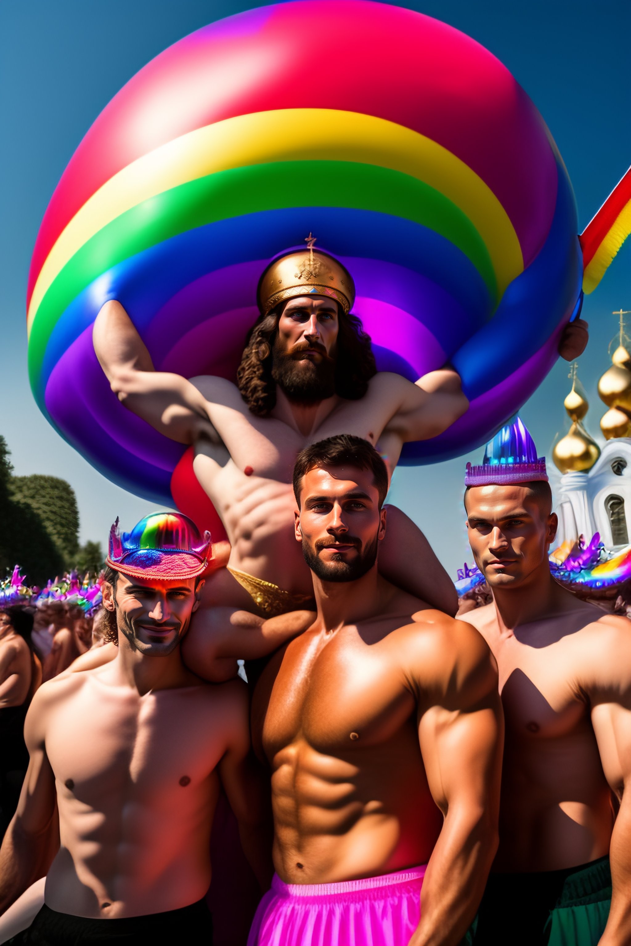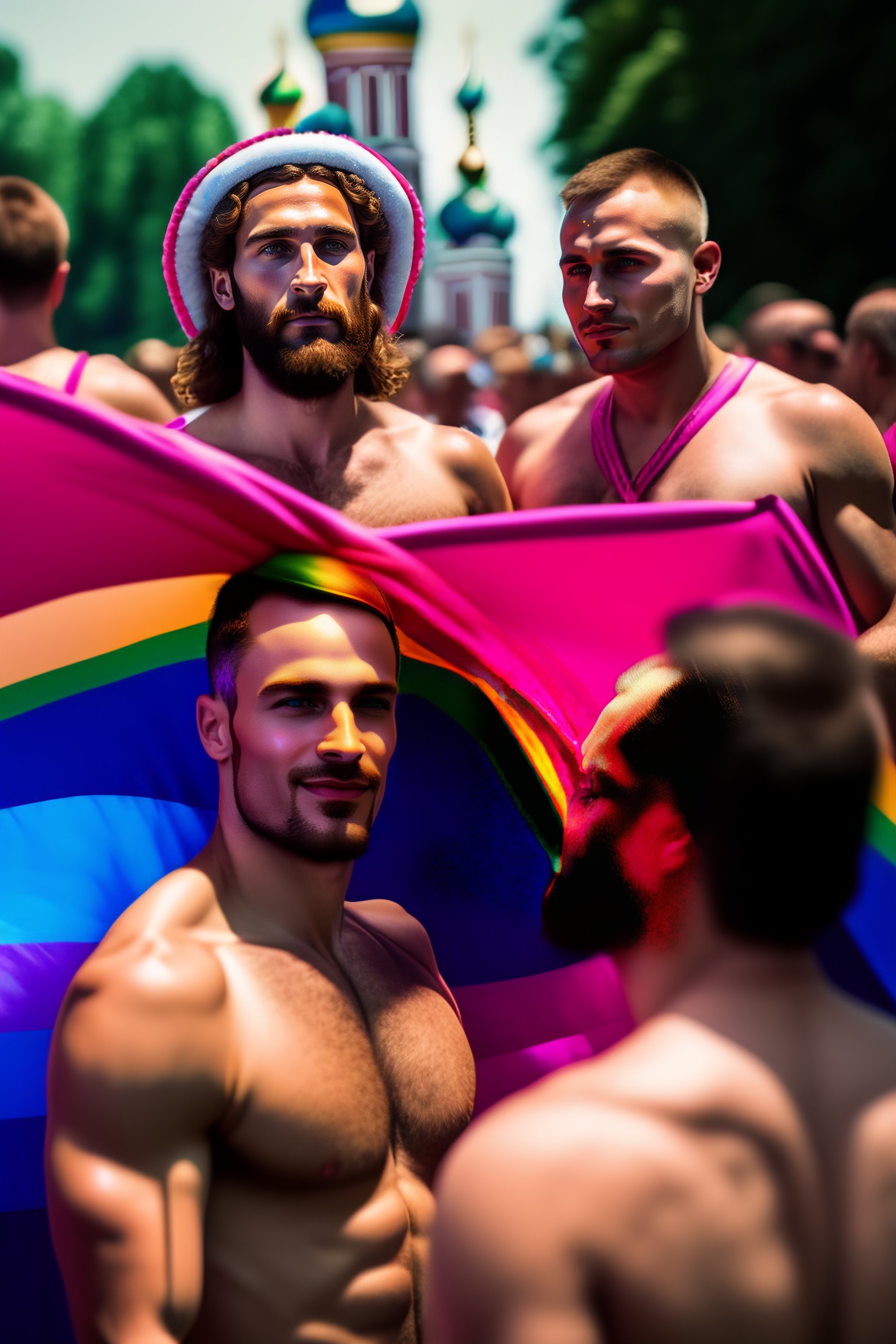 Russian christian ortodox priests wearing pink underpants and bunny ears at gay pride parade with pride rainbow flags, russian church with rainbow dome, andrei rublev's icon of jesus christ sufferings, crusifixion, golgotha