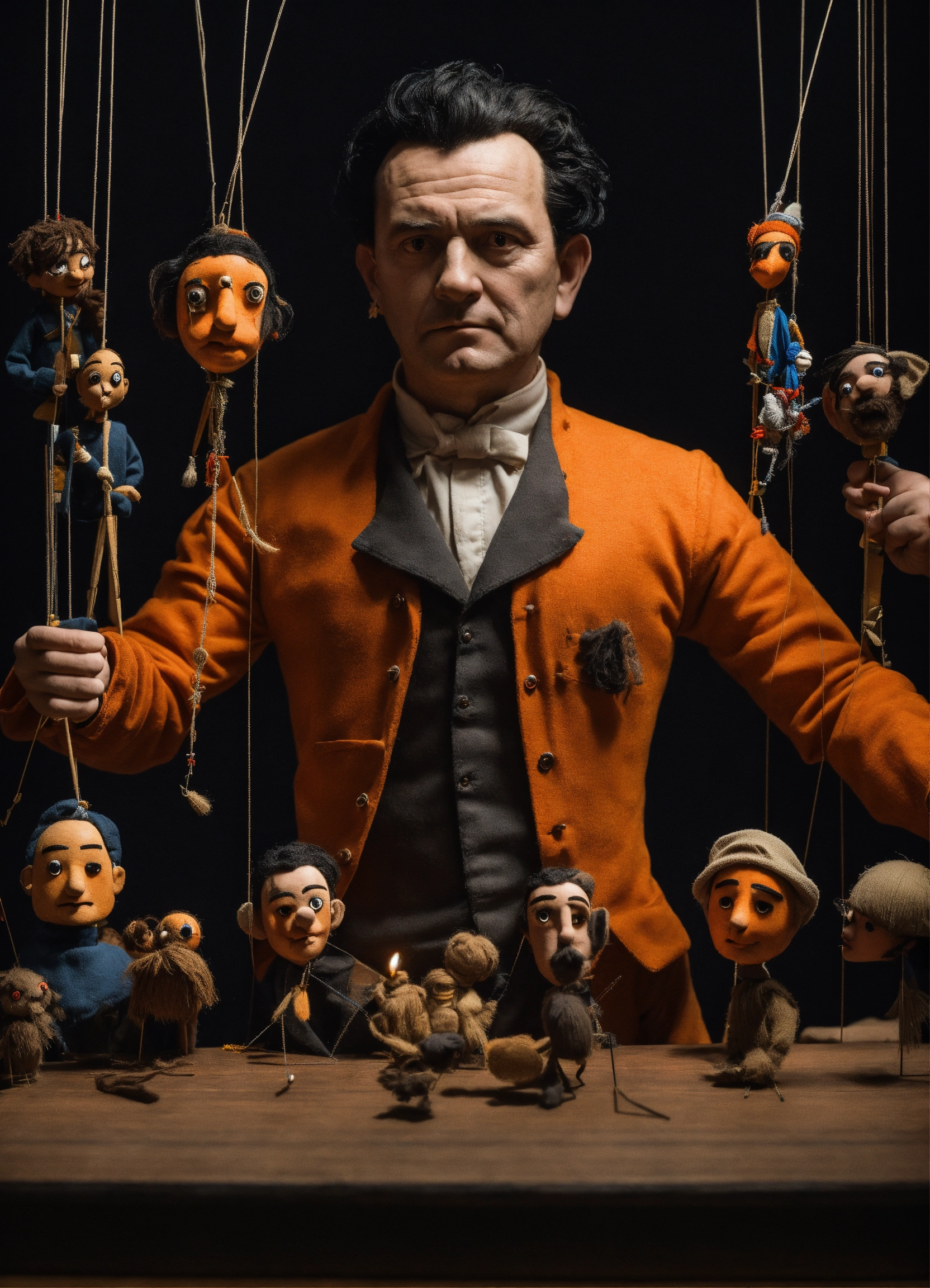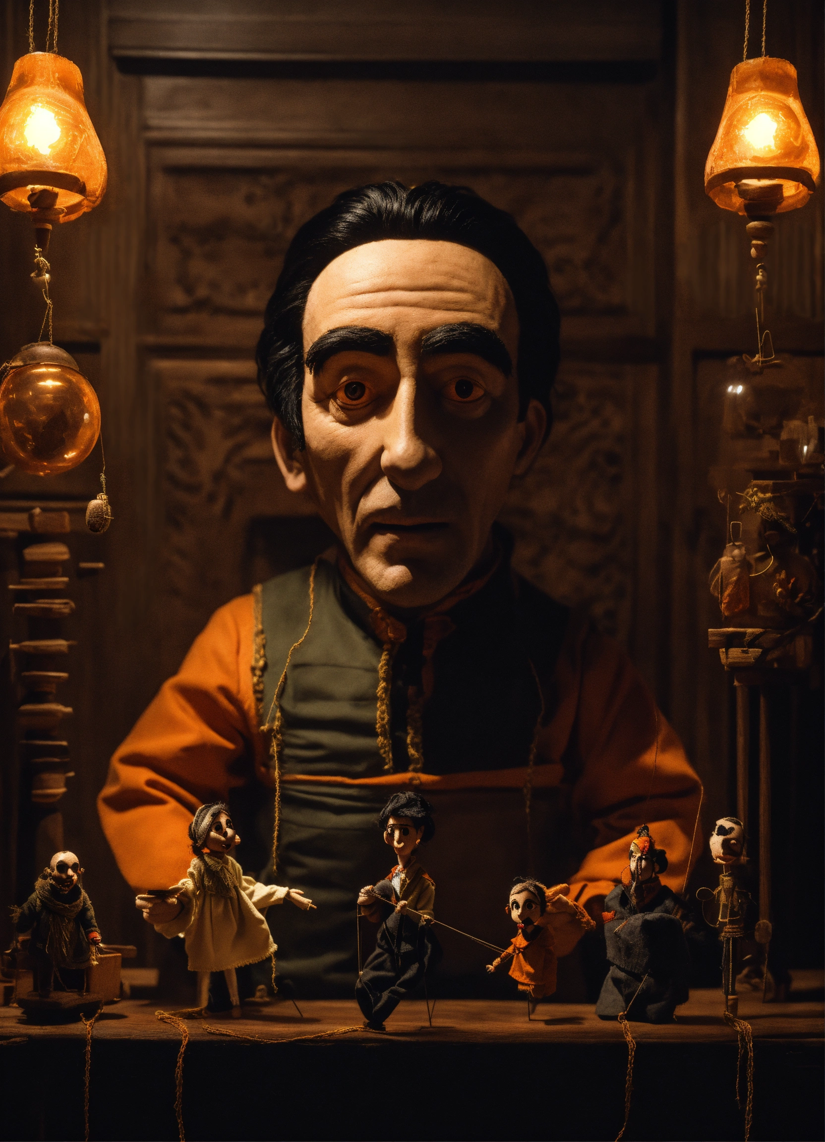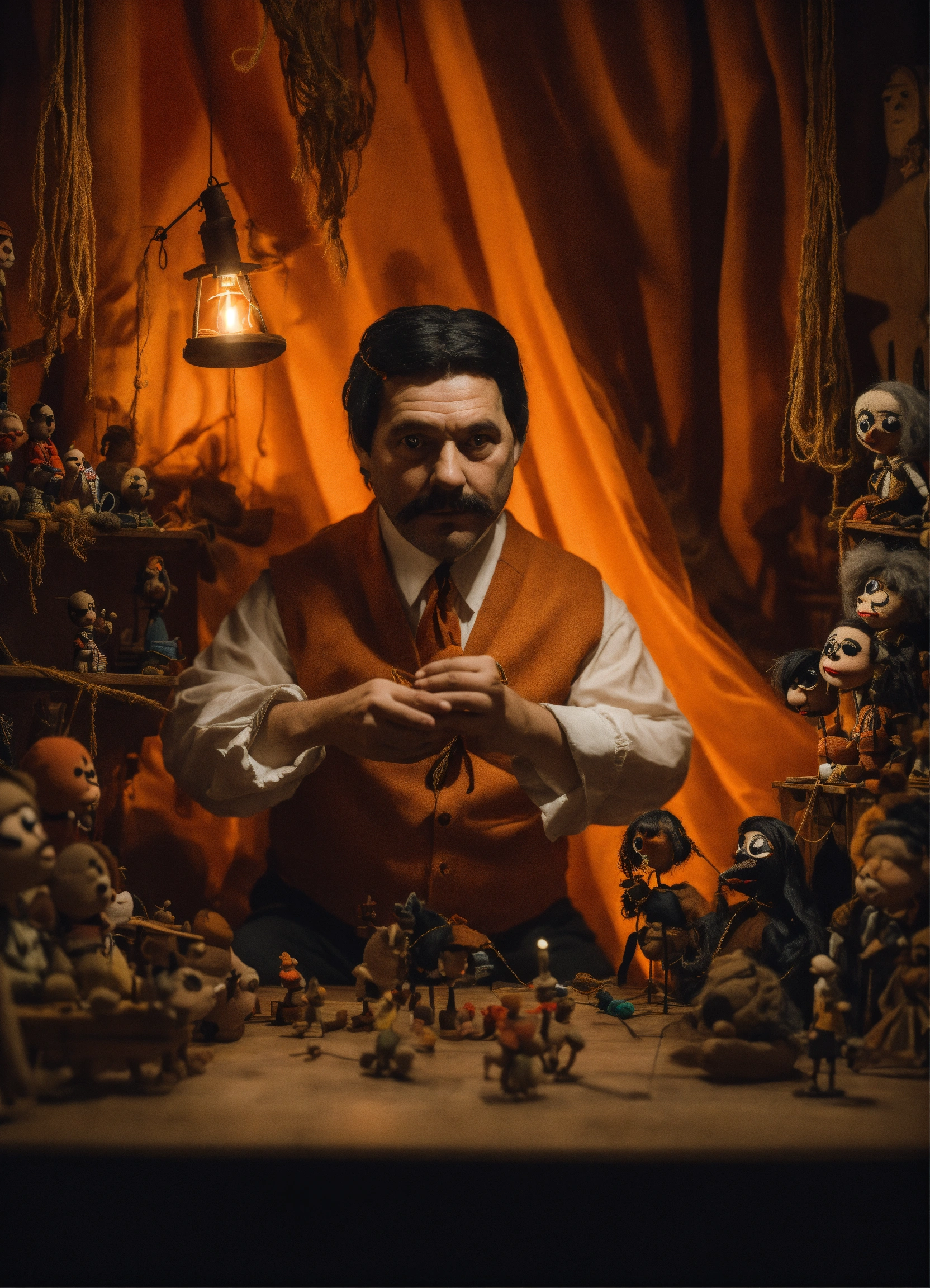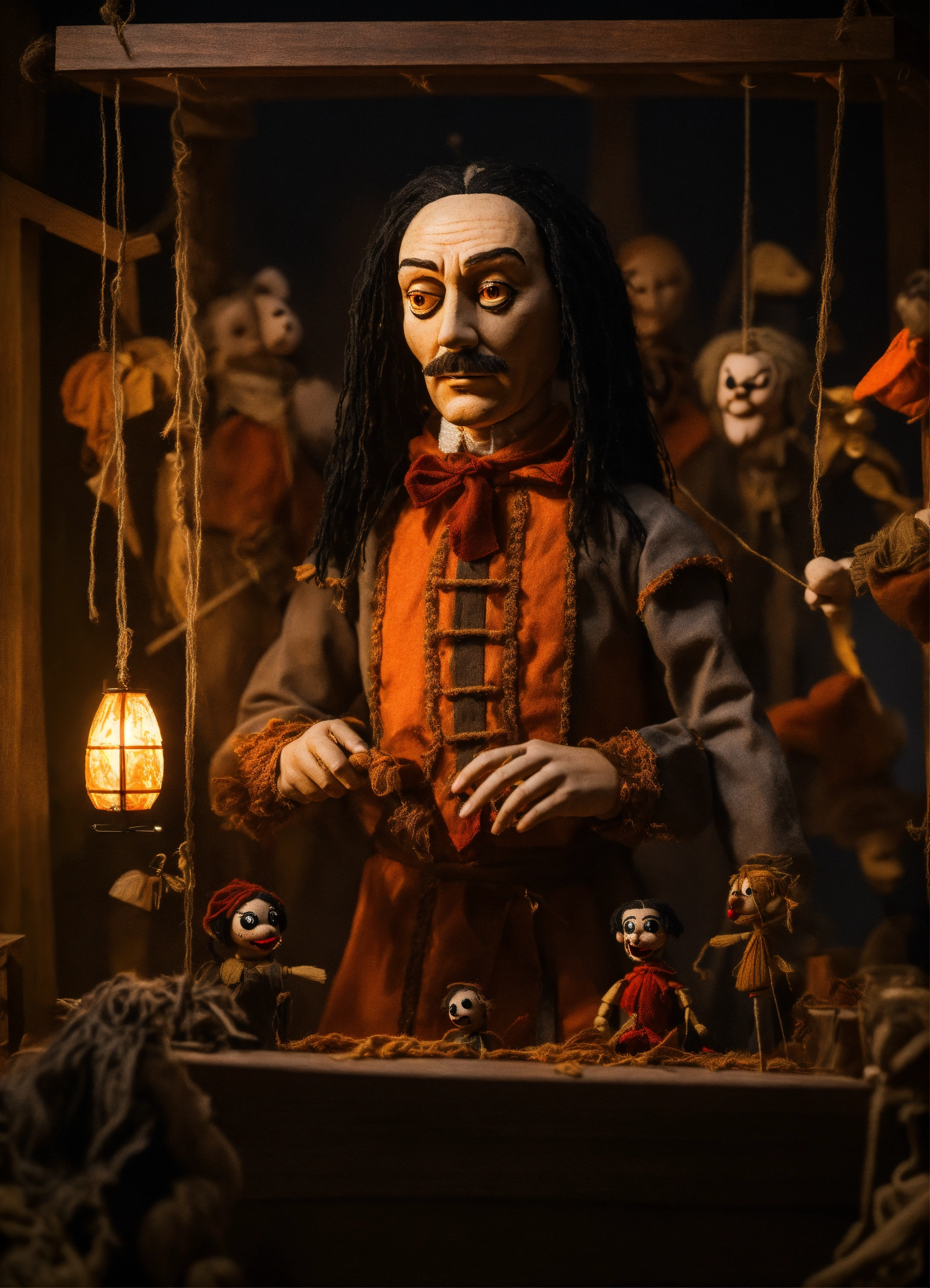 Voratus, god of consuming dread, paranoia and fear. he is a creepy, middle-aged man. he has black hair. he is a puppeteer. he is giving a puppet show with wooden marionettes. dark orange. 4k, ultra-realistic. high definition.
