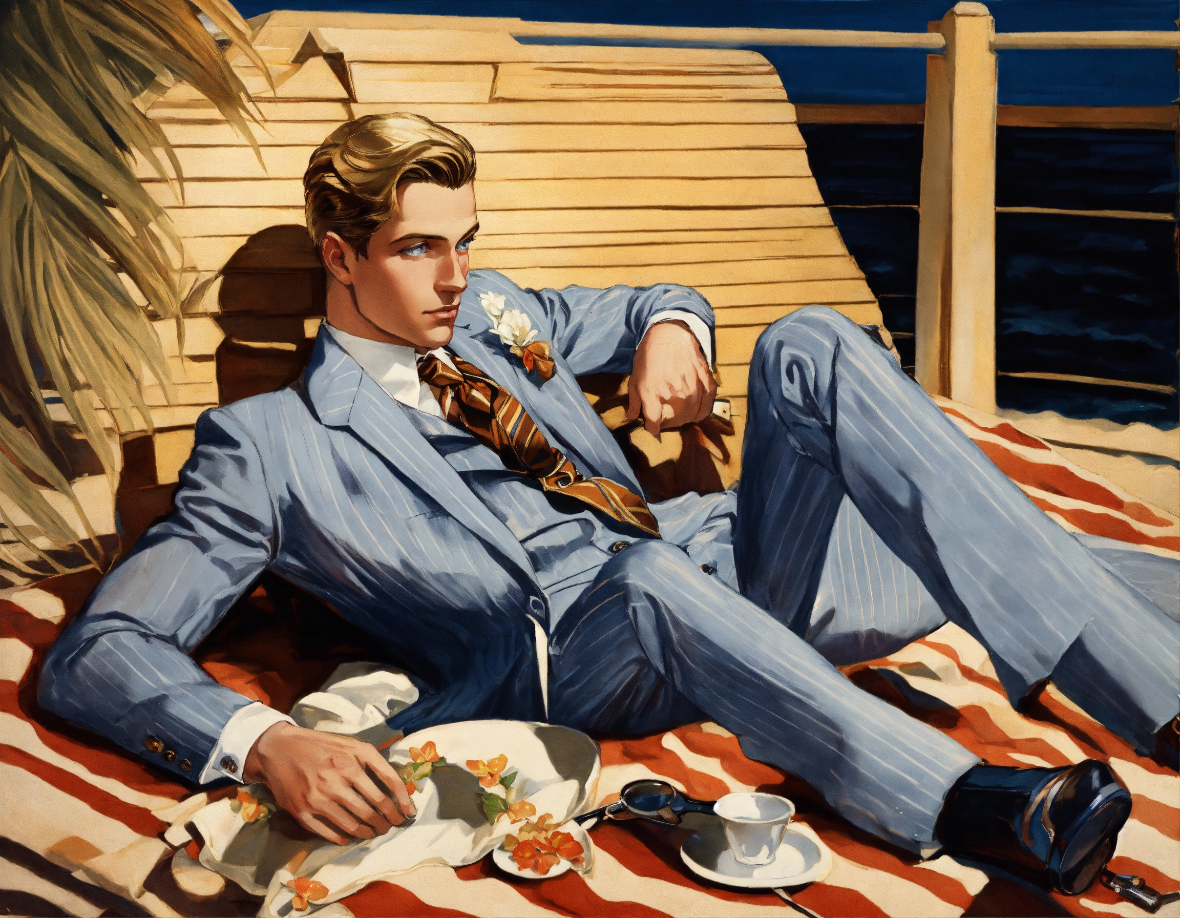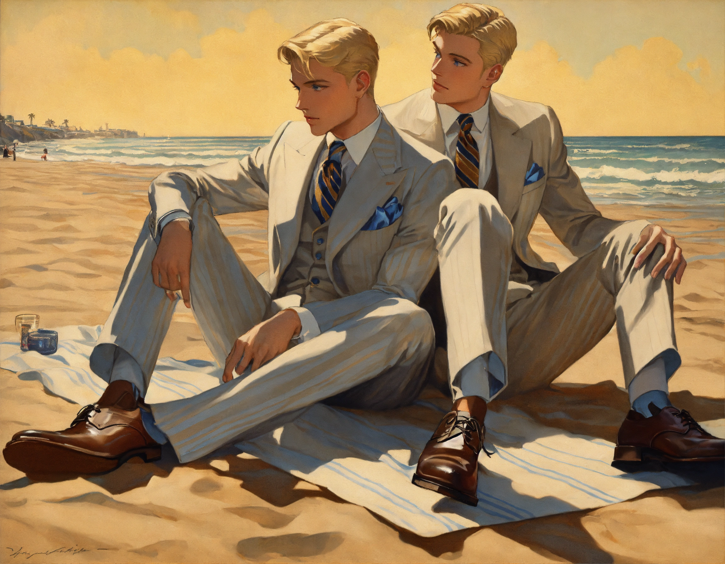 Two blonde gentlemen in light grey pinstripe suit, club tie, blue eyes, lying on a beach towel, leyendecker style