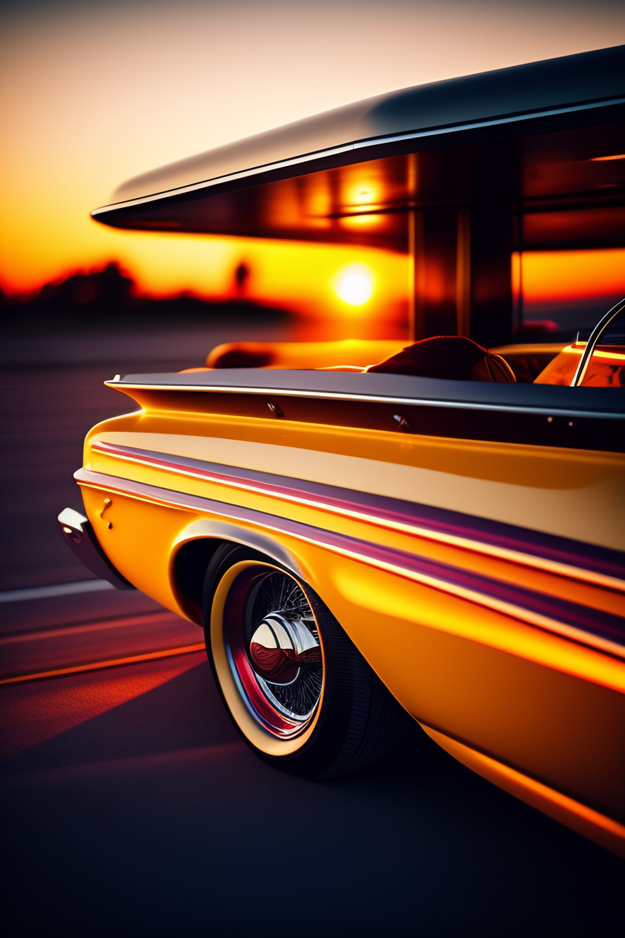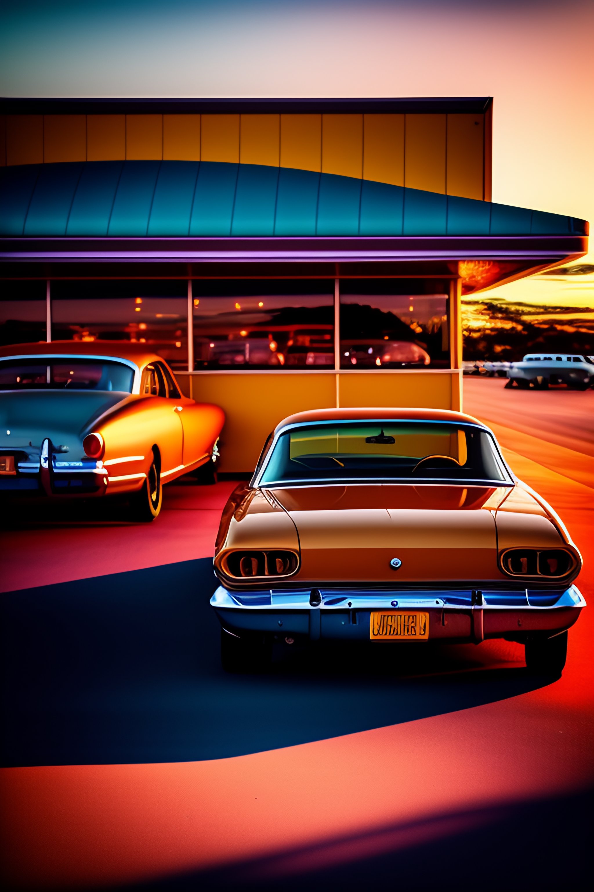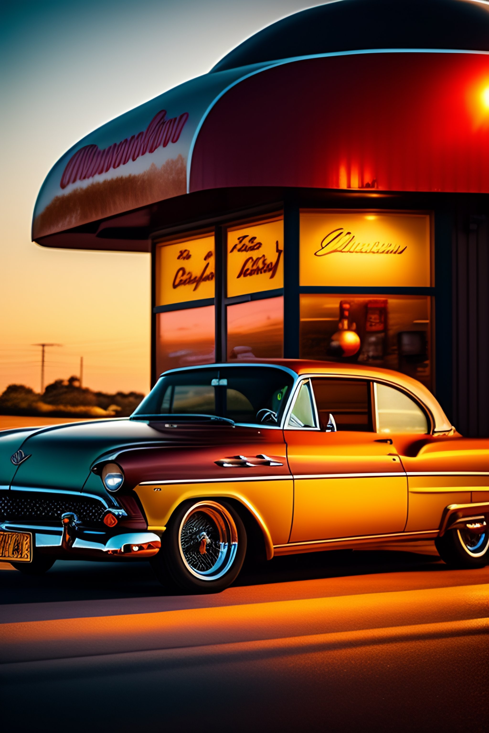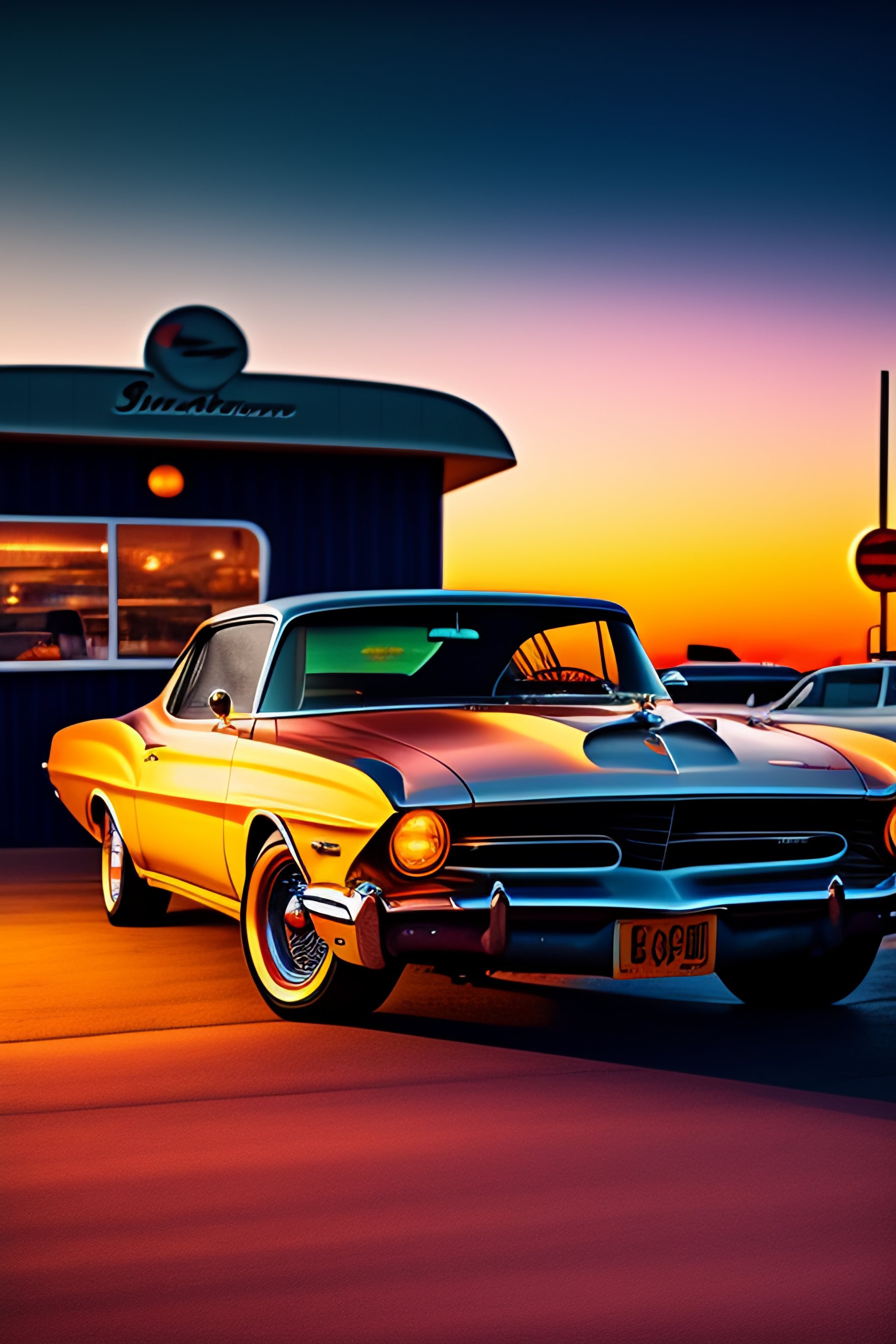 Xlightmoon sitting on vintage car infront of a 90's diner at sunset, far long distance cinmetaic shot