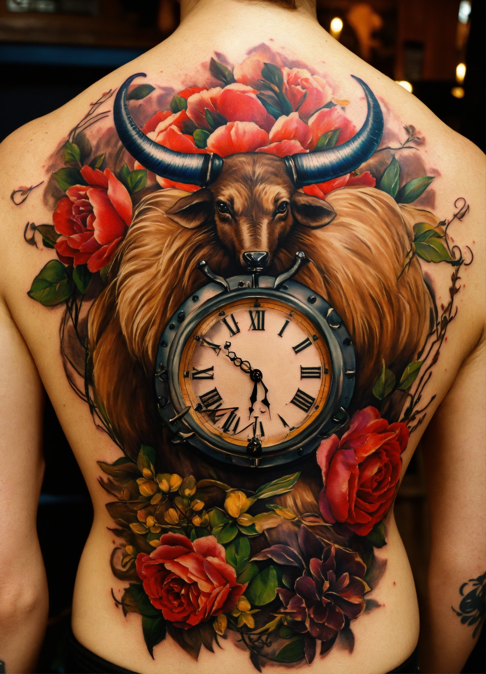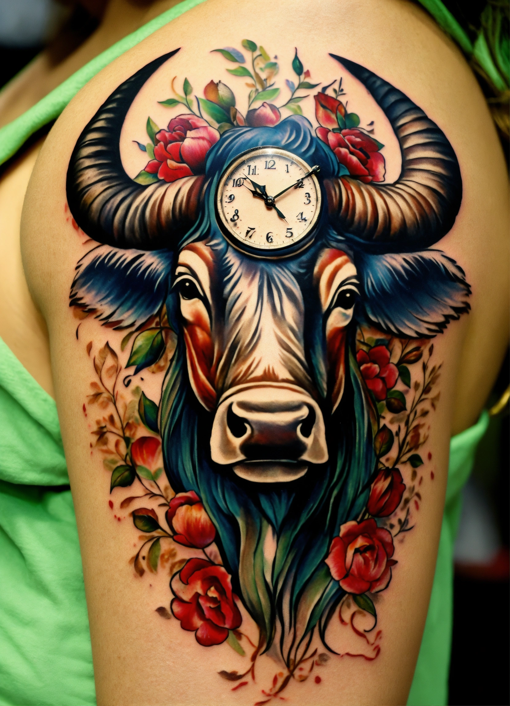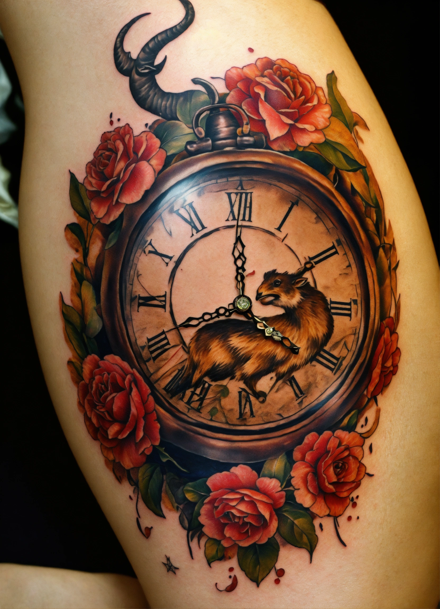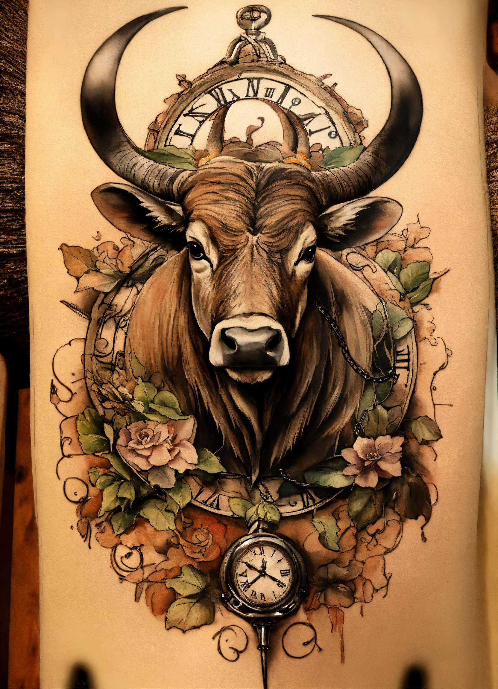 Crée un tatouage, épée avec une garde en corne de taureau et un pommeau avec un "l" inscrit dessus. sur la lame une horloge qui se casse.