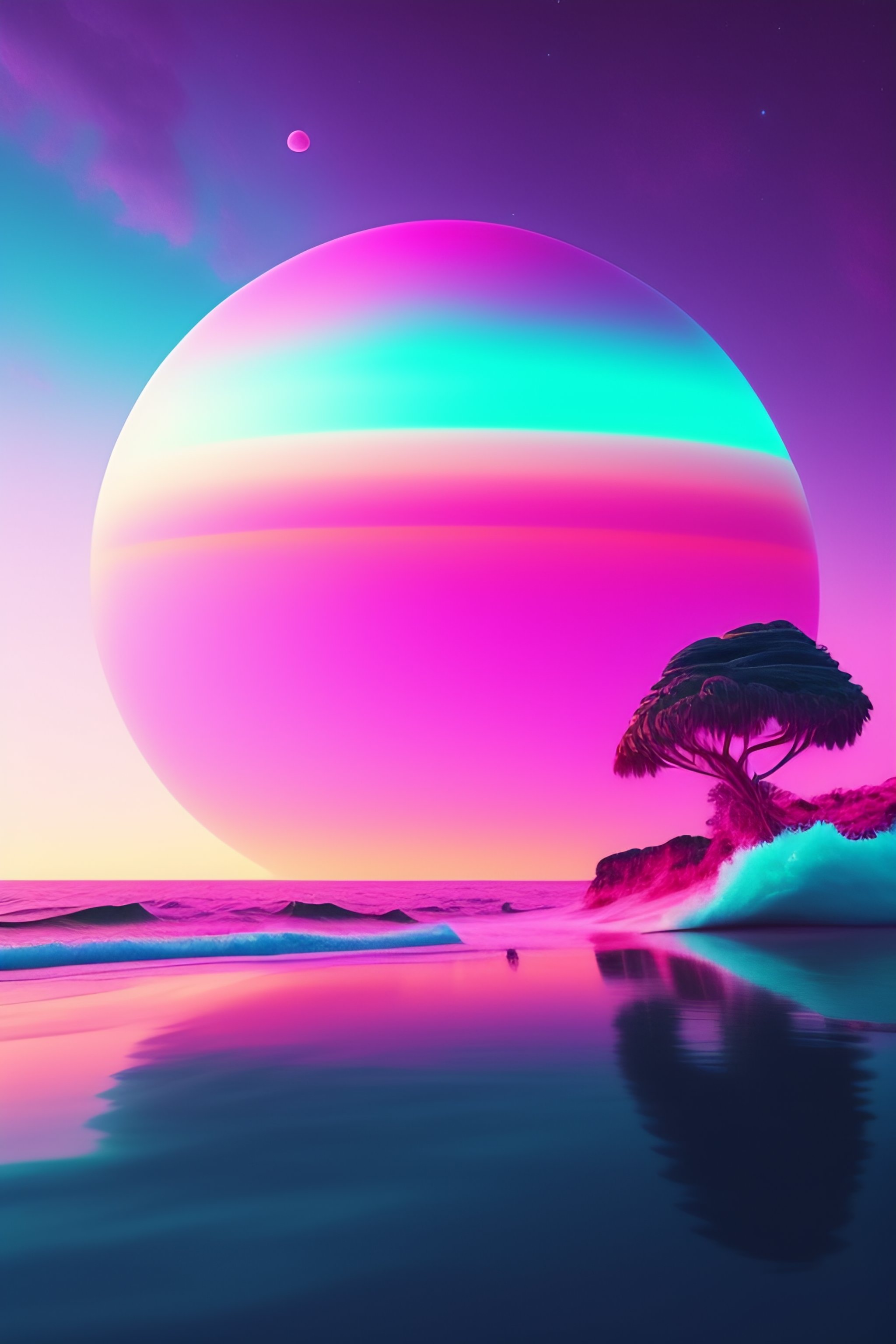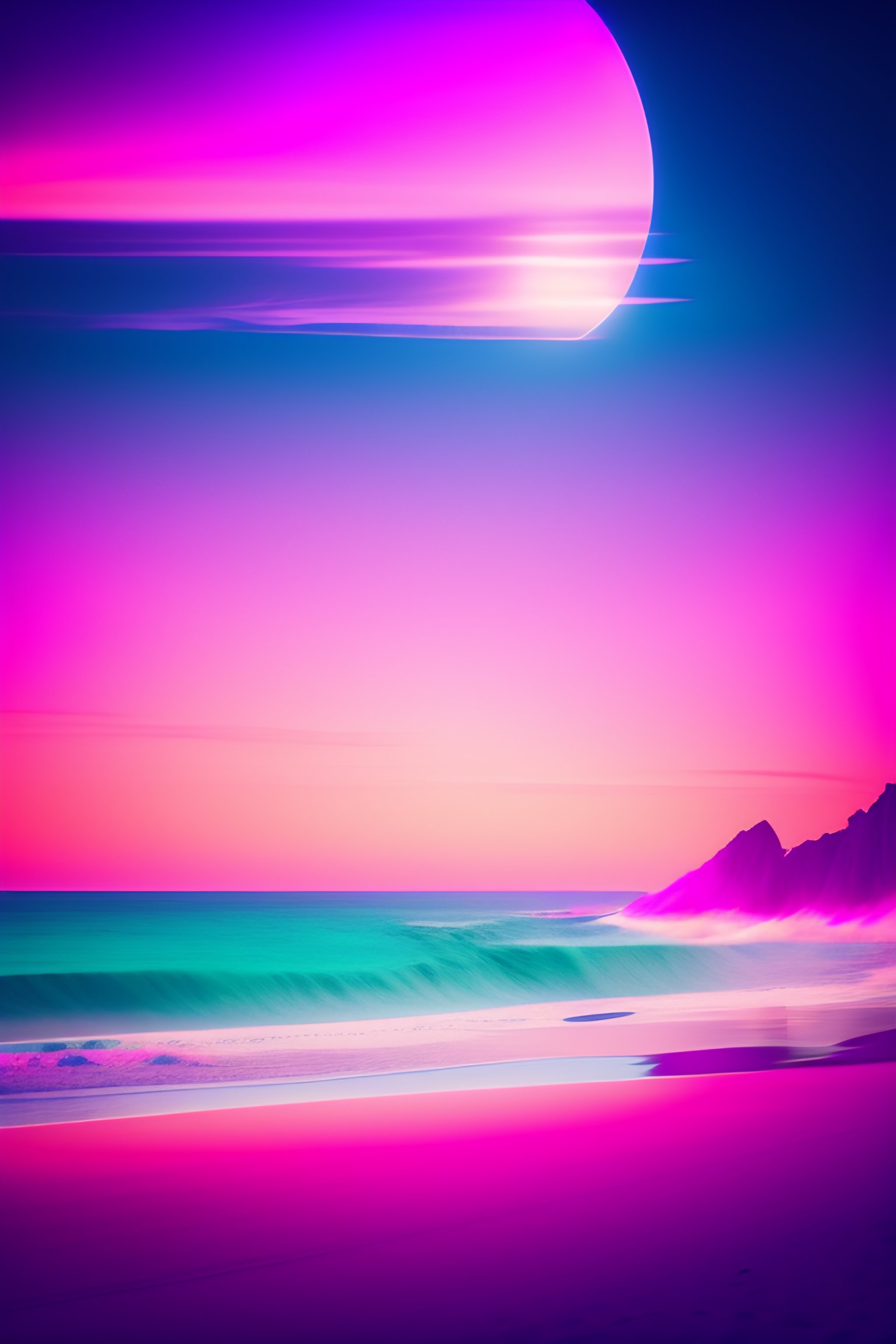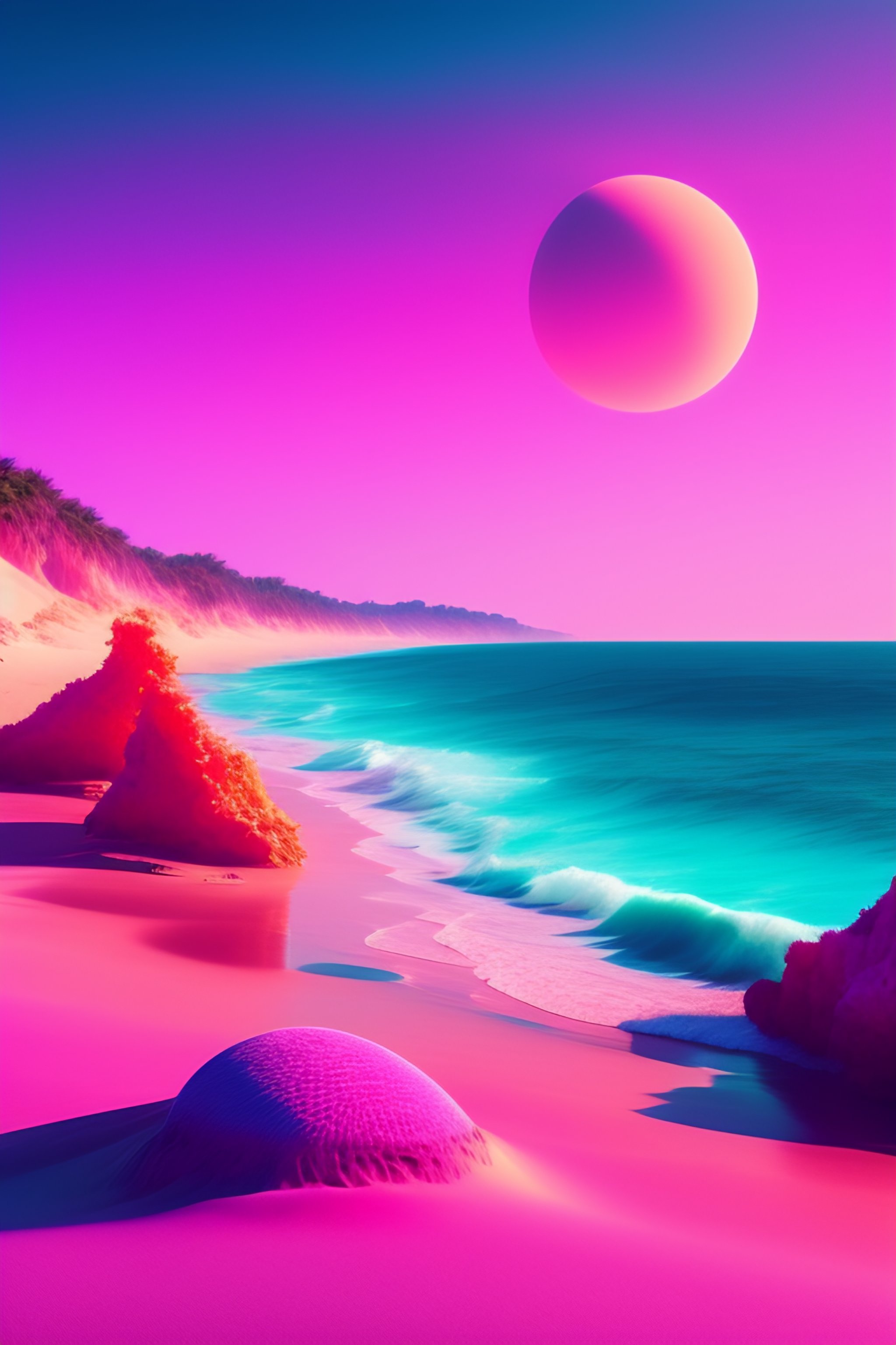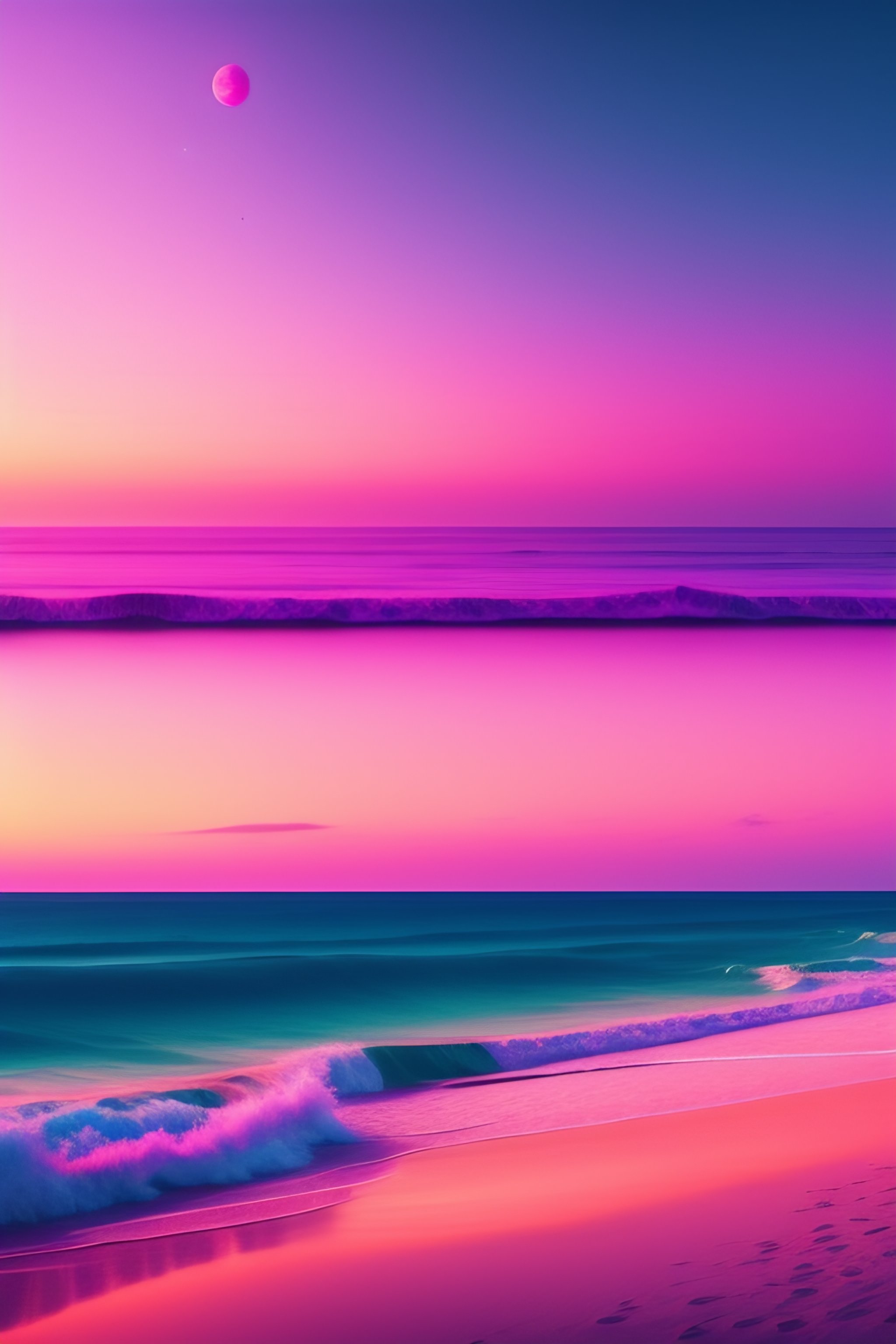 Beautiful beach horizon view of the tropical pink ocean on an alien planet, pink vaporwave ocean, clear sky, planet in space over the horizon, trending on artstation, digital art by beeple
