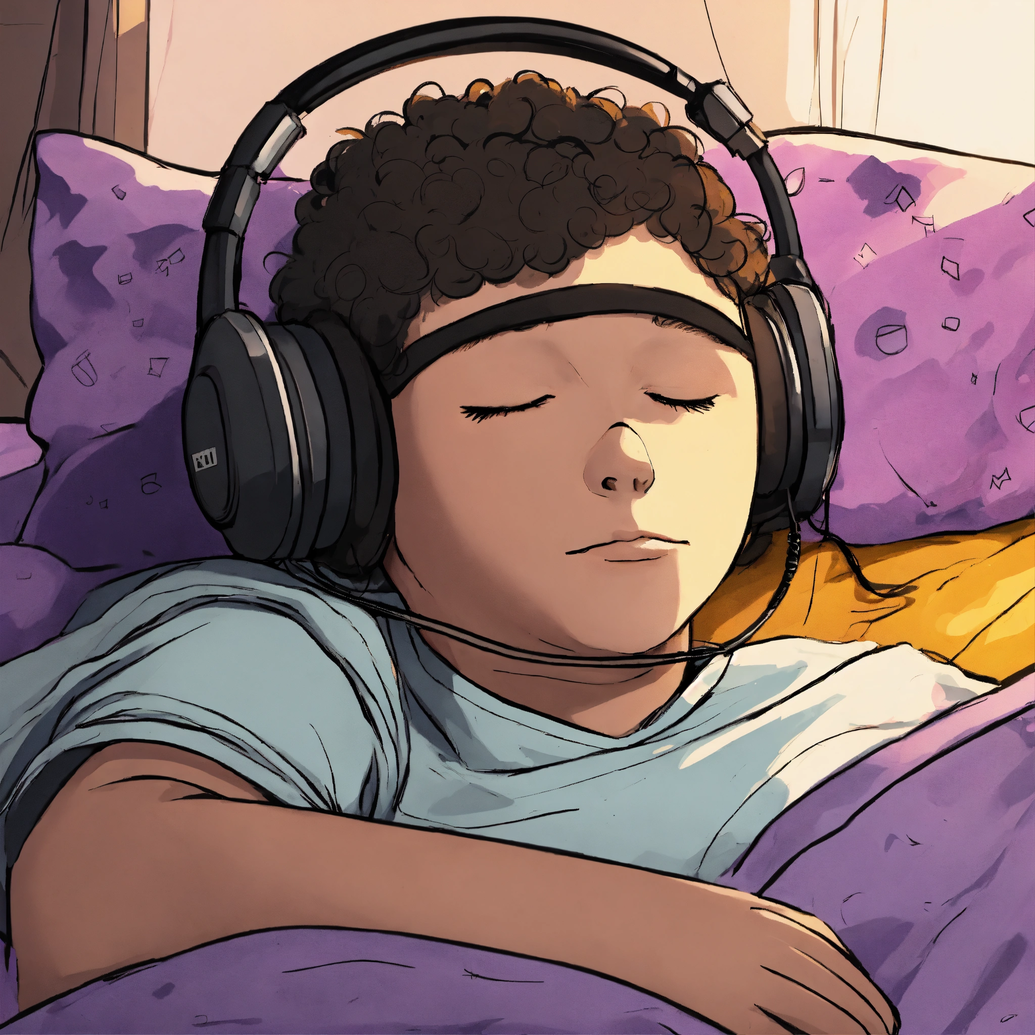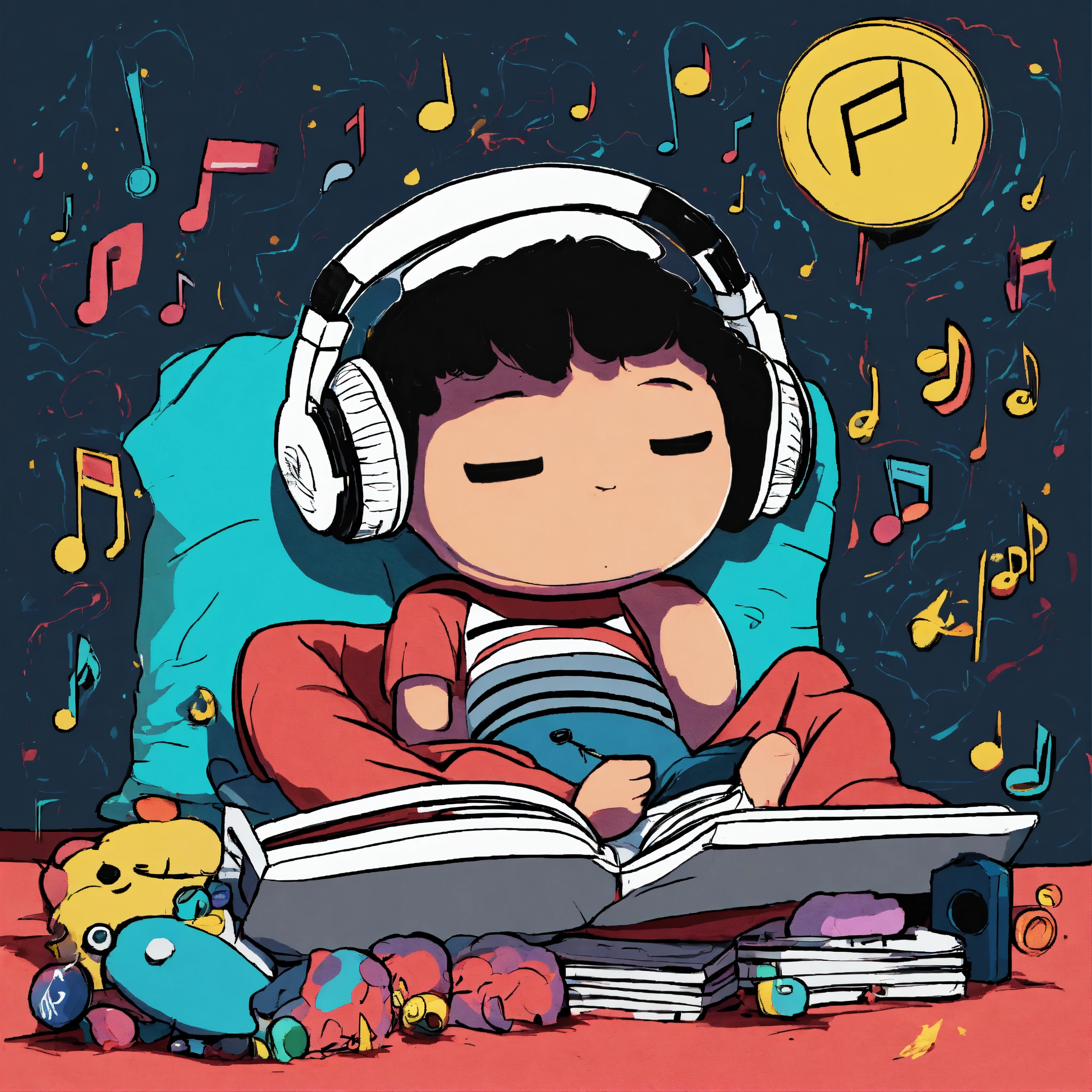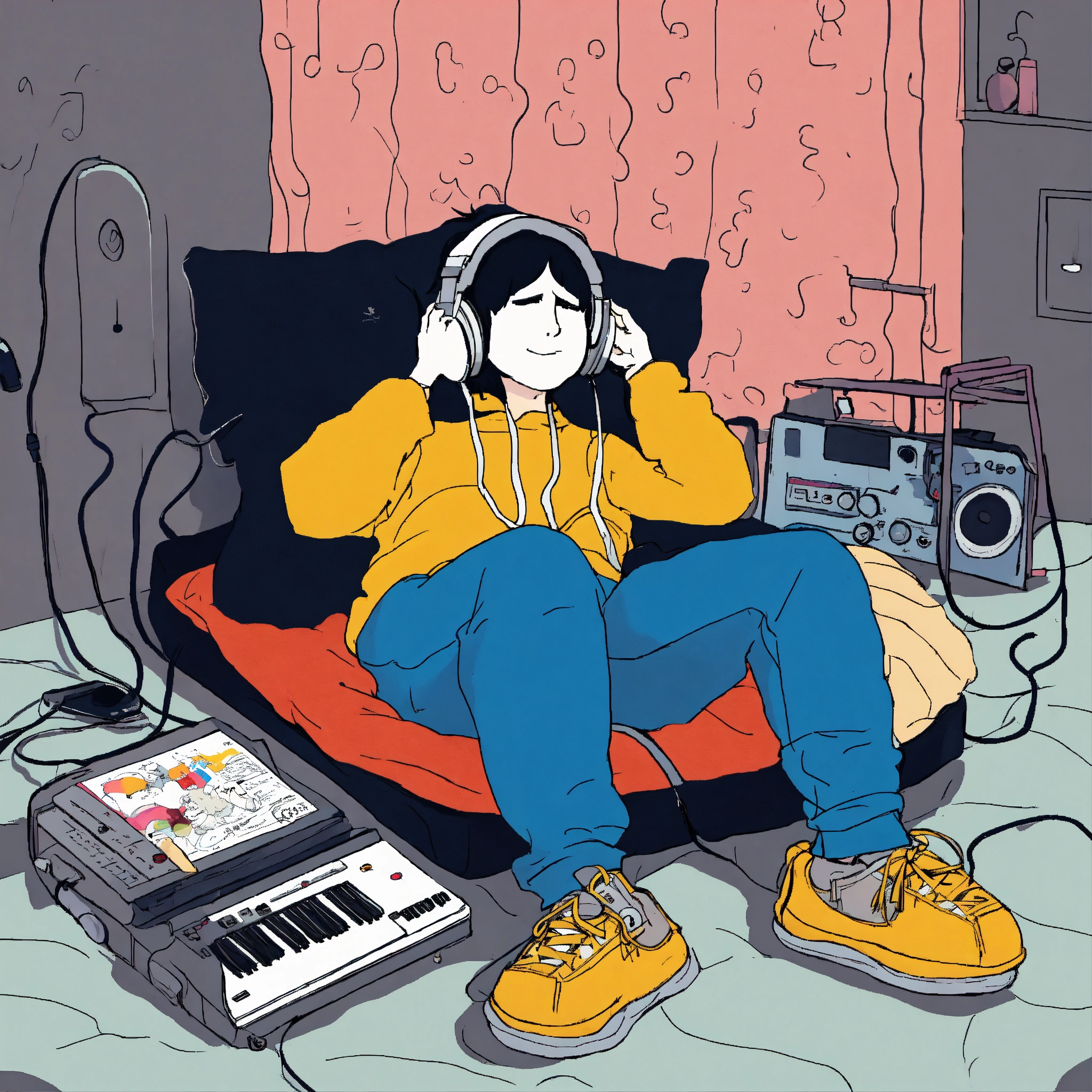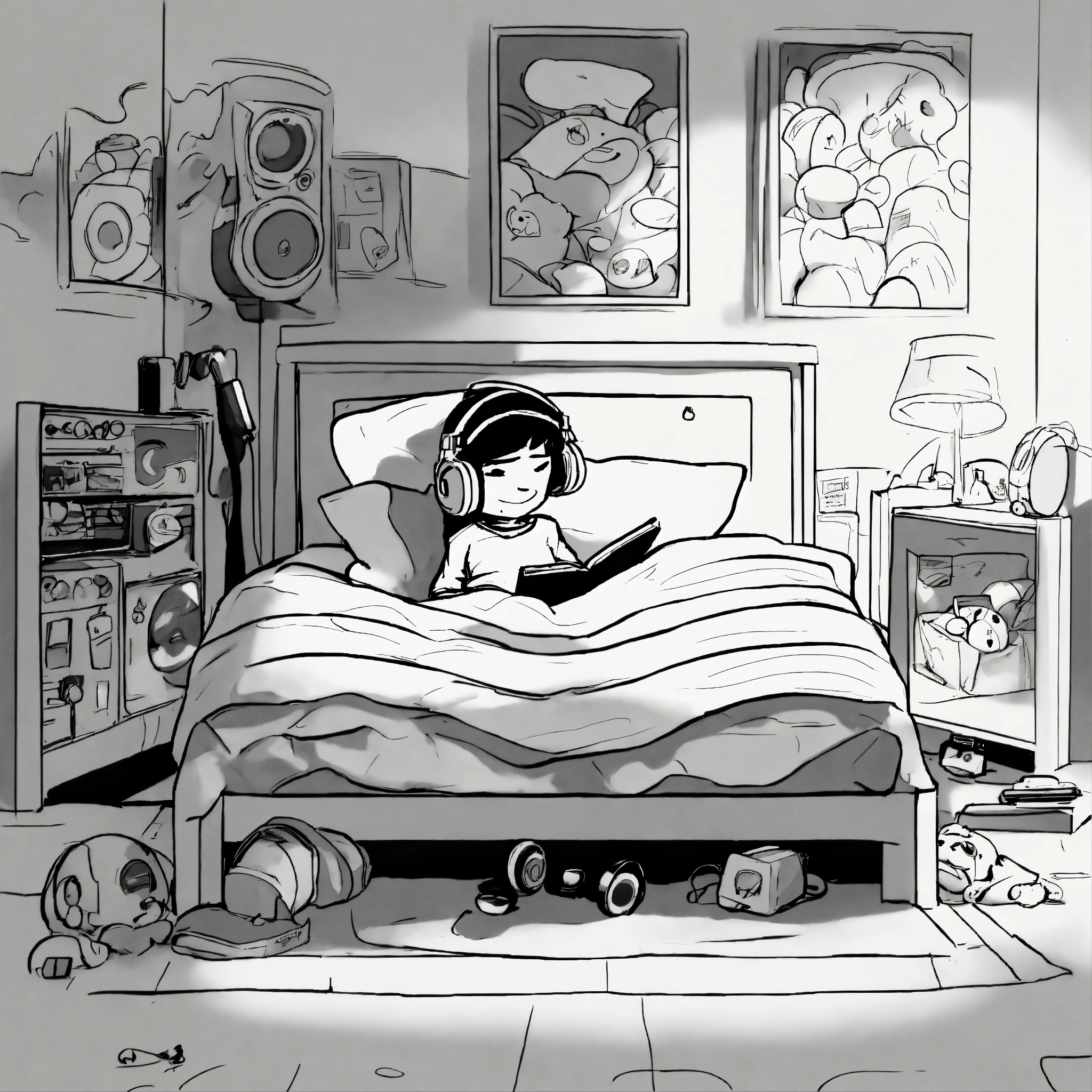 2d drawing of a cartoon type character lying in his bed listening to music, type nvscvr (musical group from chile) drawin with colors black and withe and the boy