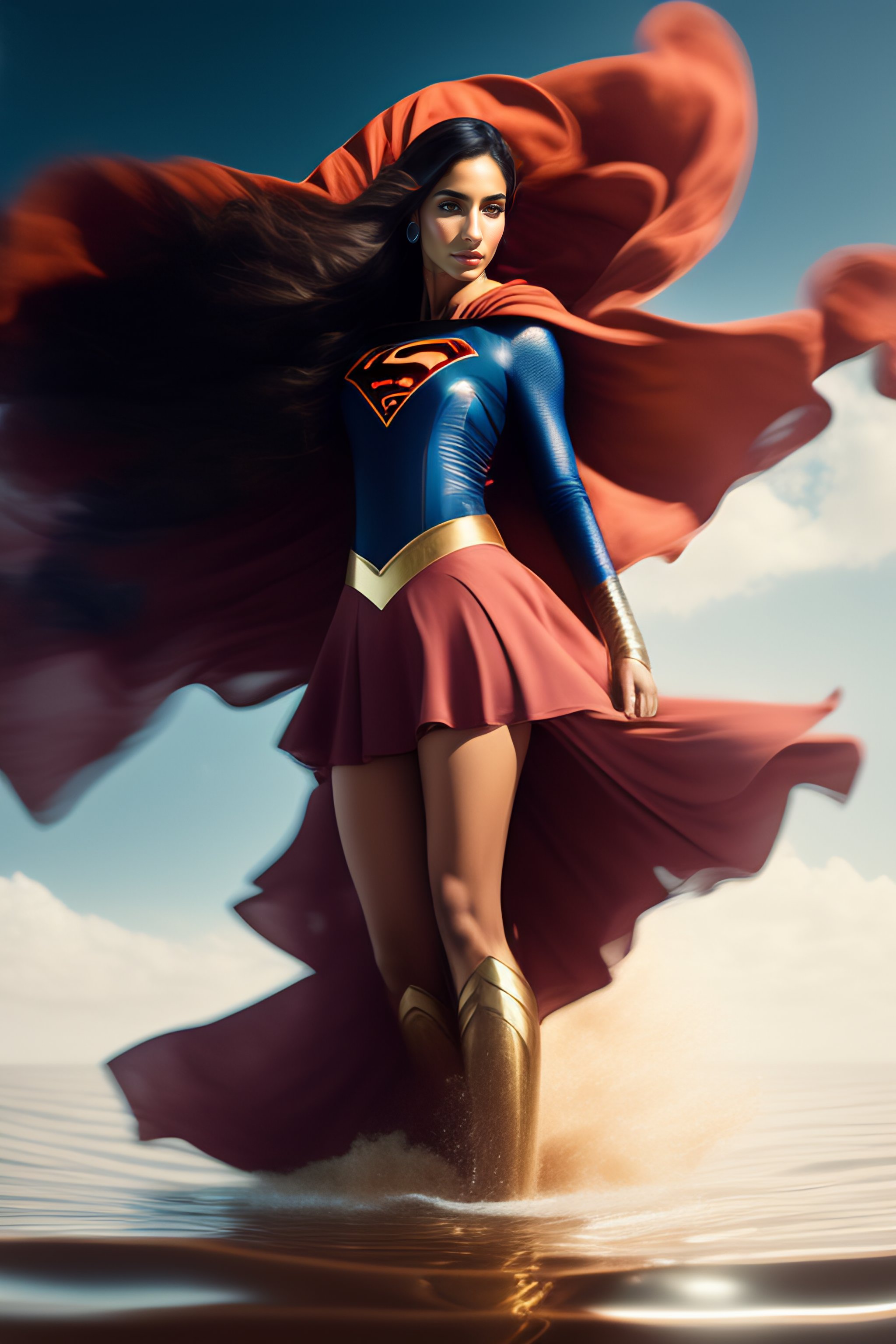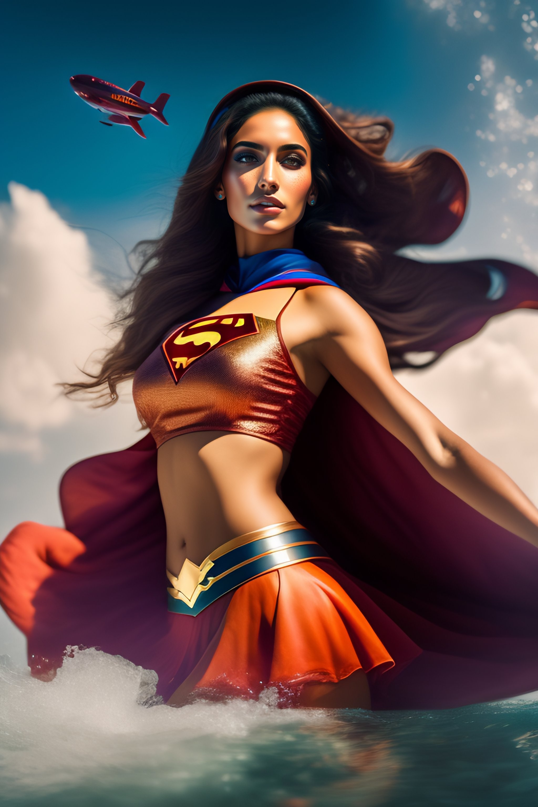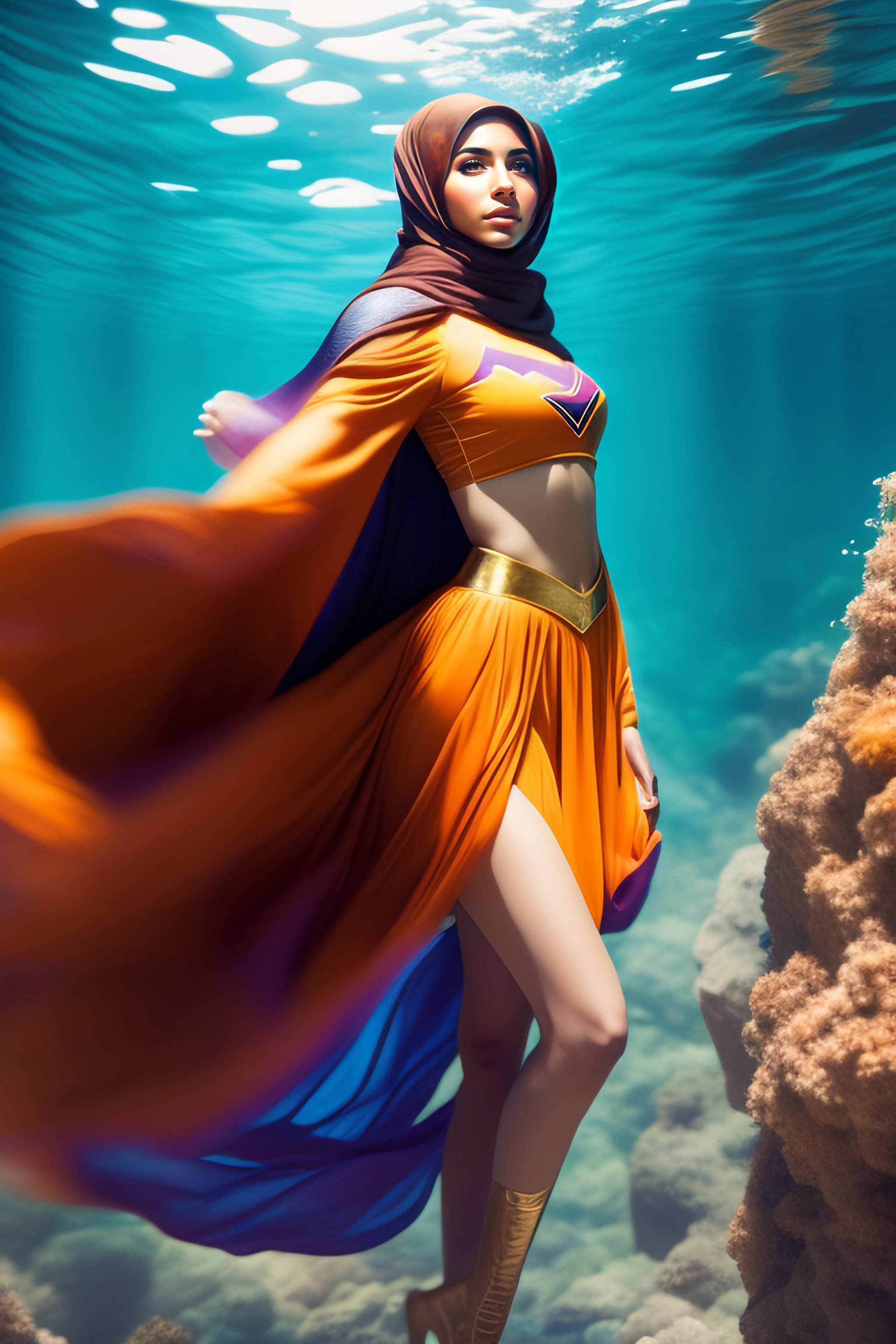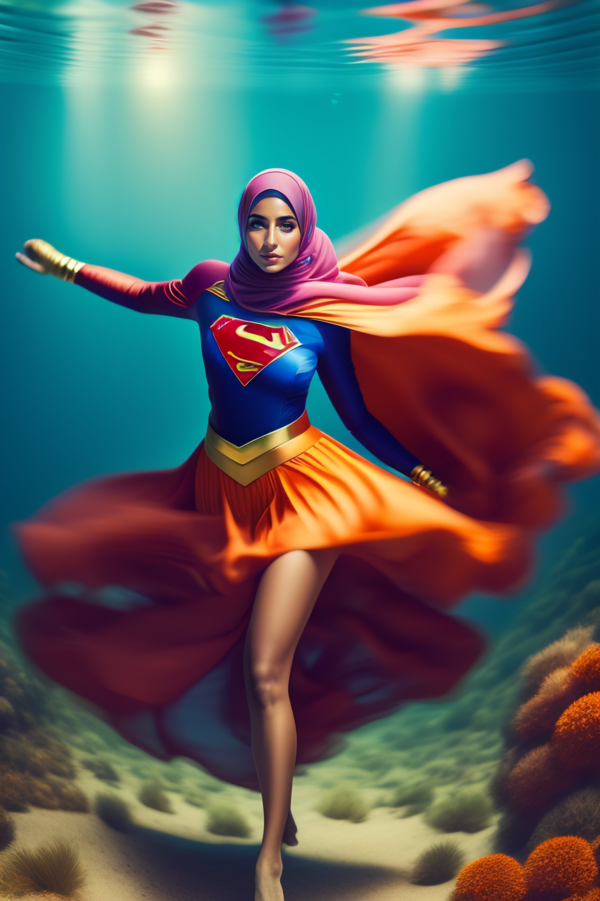 Full body shot, beautiful young woman, middle eastern, hijab, flying in the air, supergirl, underwater, brown hair, fighting pose, photorealism, cosmic, extremely detailed, photography, looking determined, portrait, digital painting, art station, concept art, beautiful face, fit in shot, symmetric face, cinematic, by artgerm and greg rutkowski and alphonse mucha