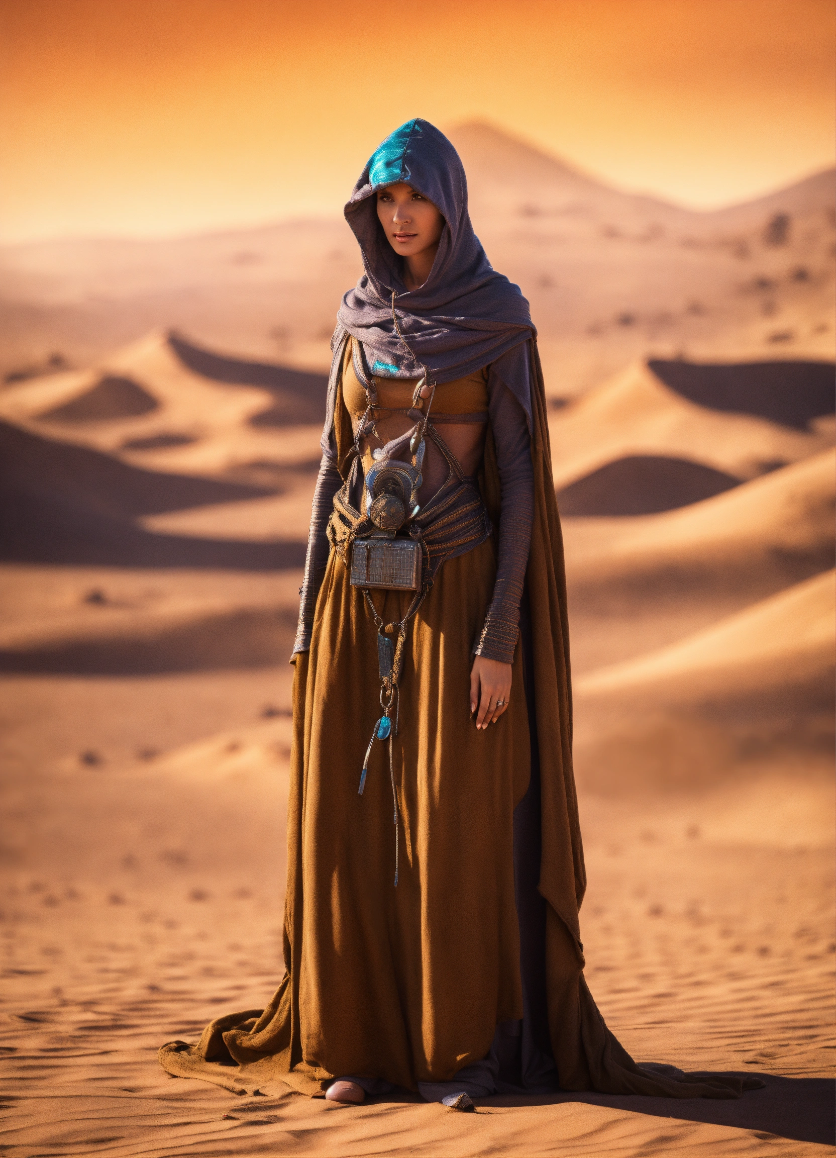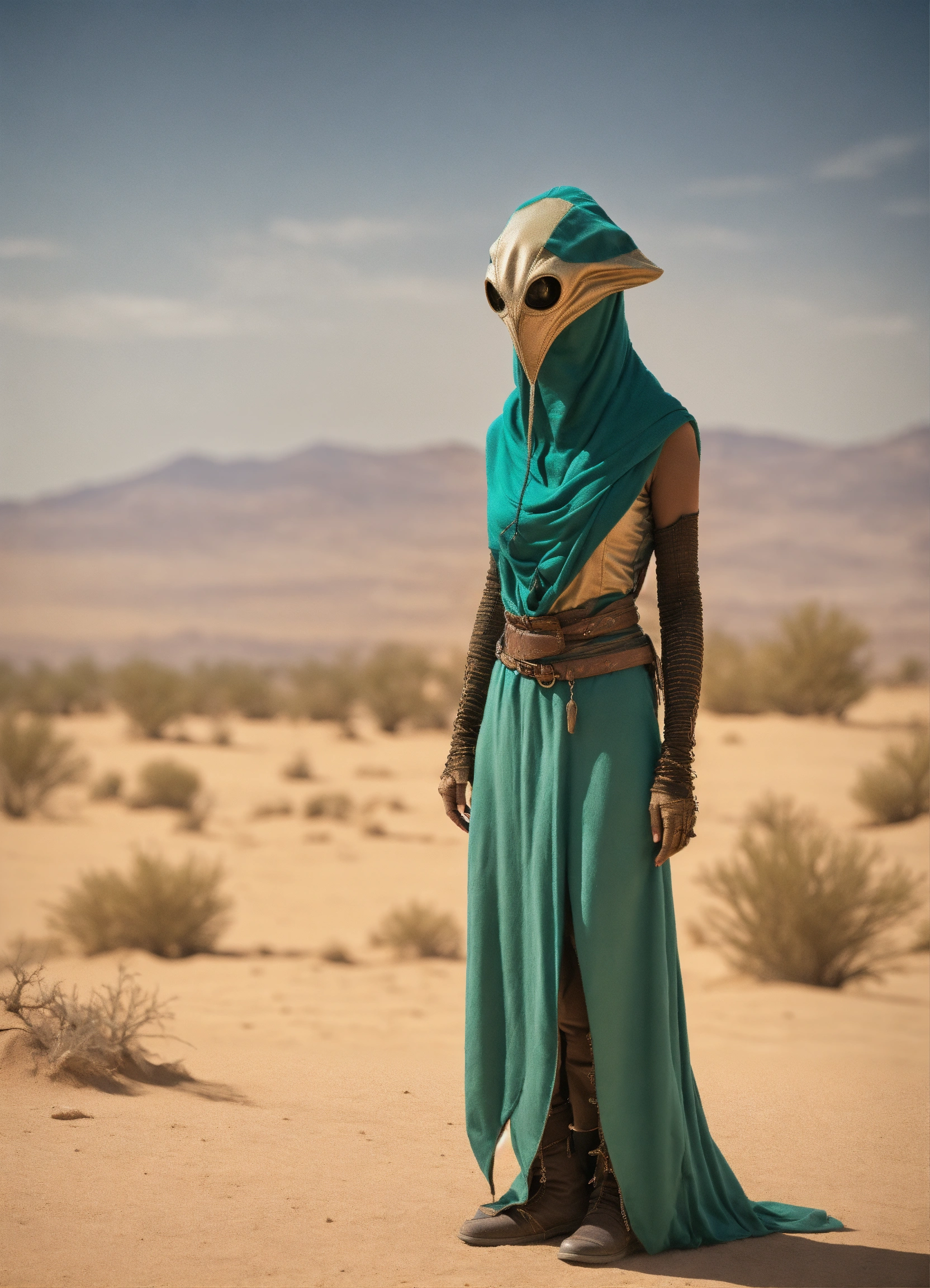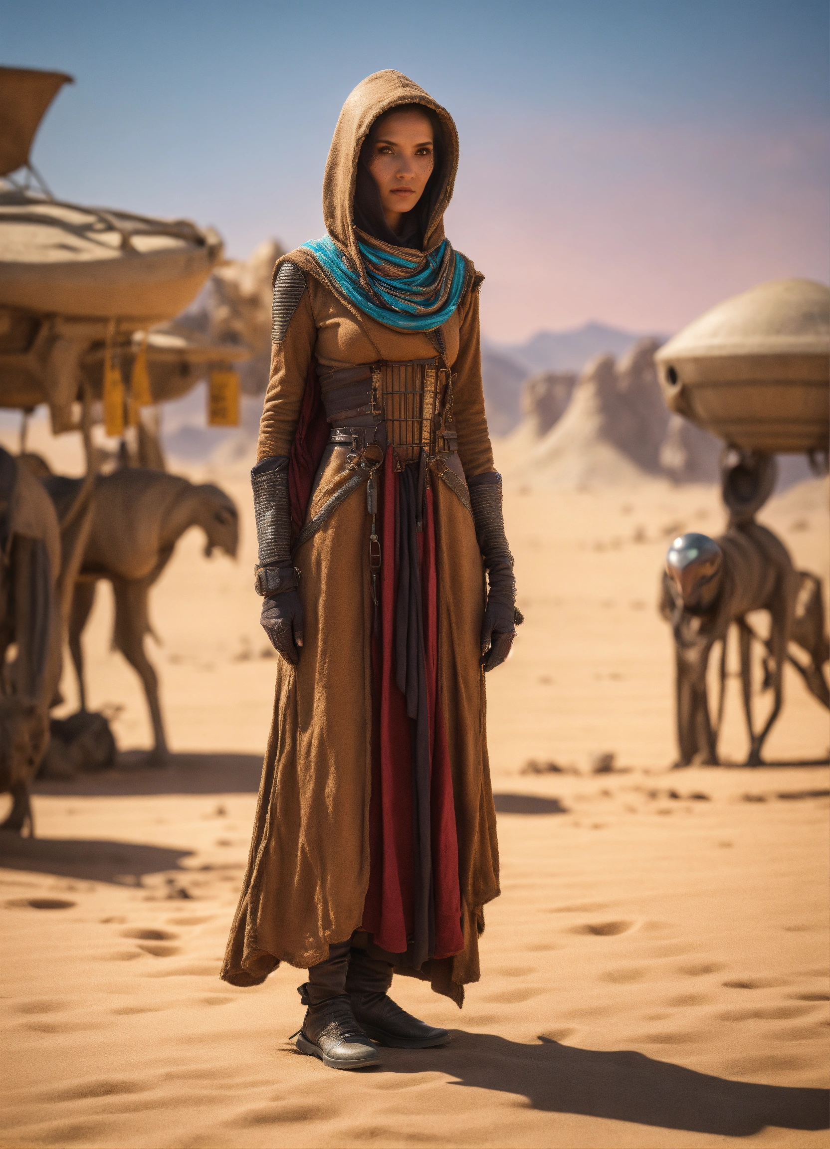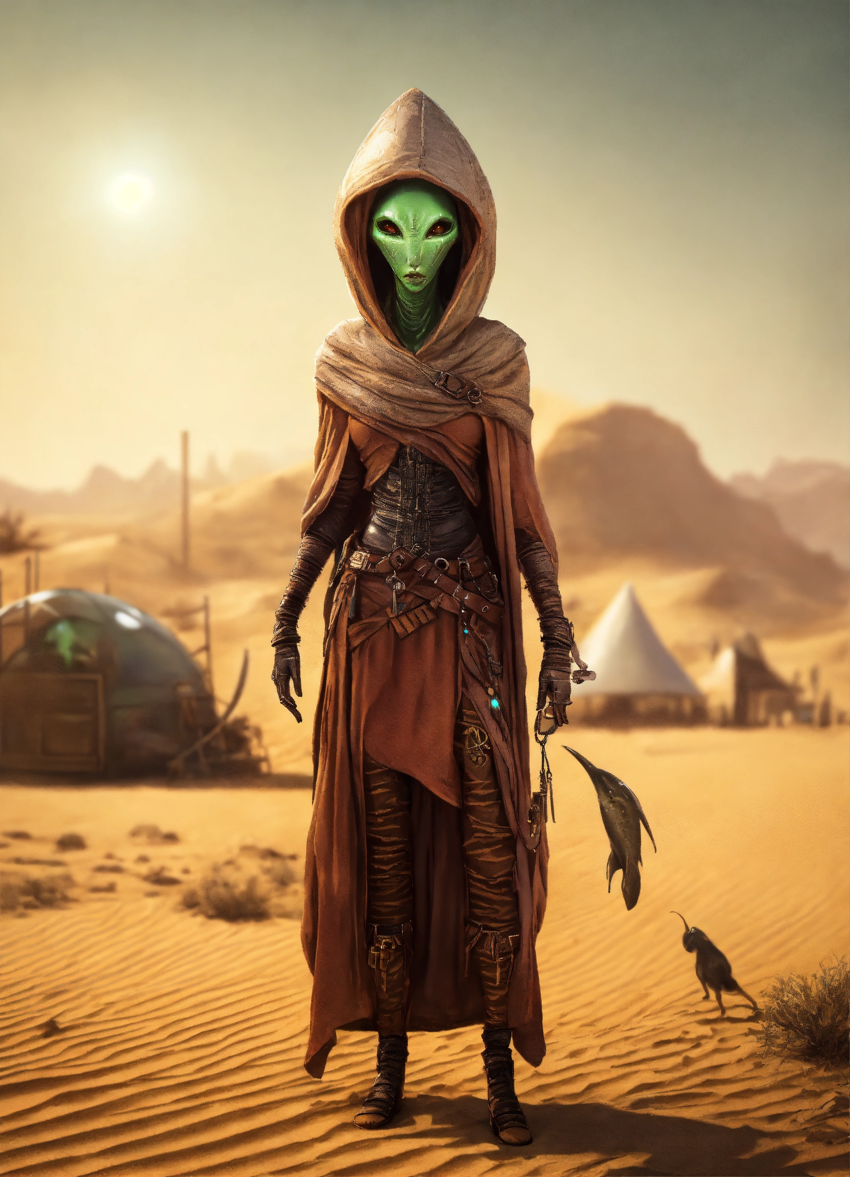 Very slim and tall female alien creature merchant on a desert un the market of a alien planet, suspicious look, hooded, hyperrealistic, selling caged alien vermin, western shot