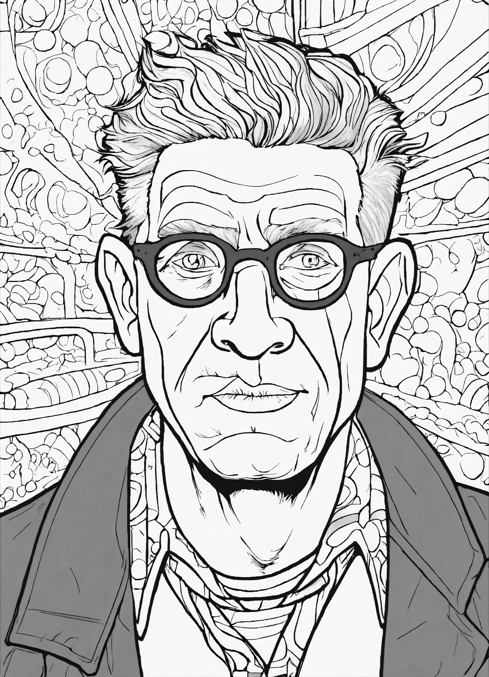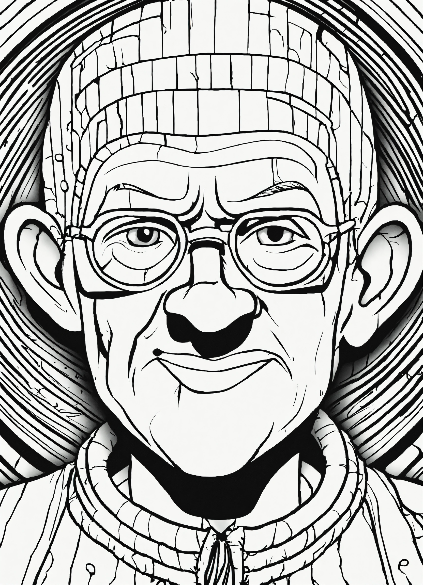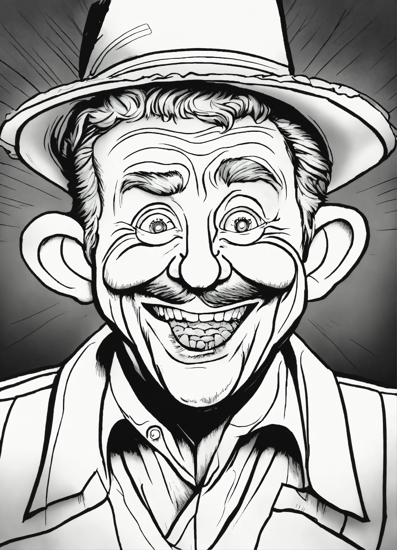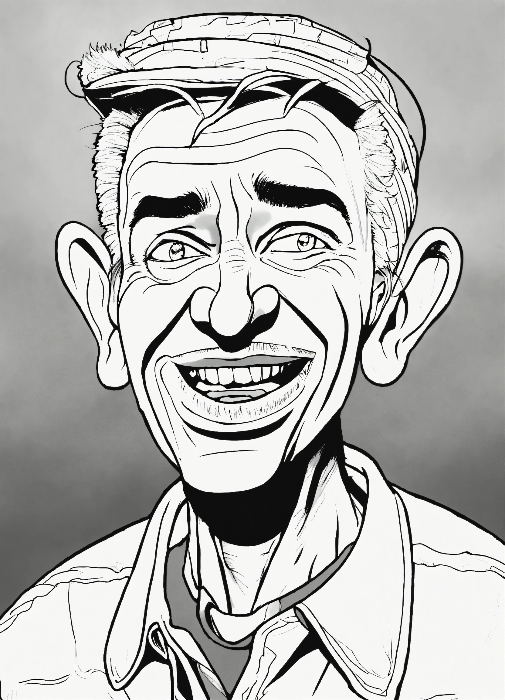 Coloring page for adults, bold lines, dark lines, mad magazine character moron face, black and white, cartoon, white background