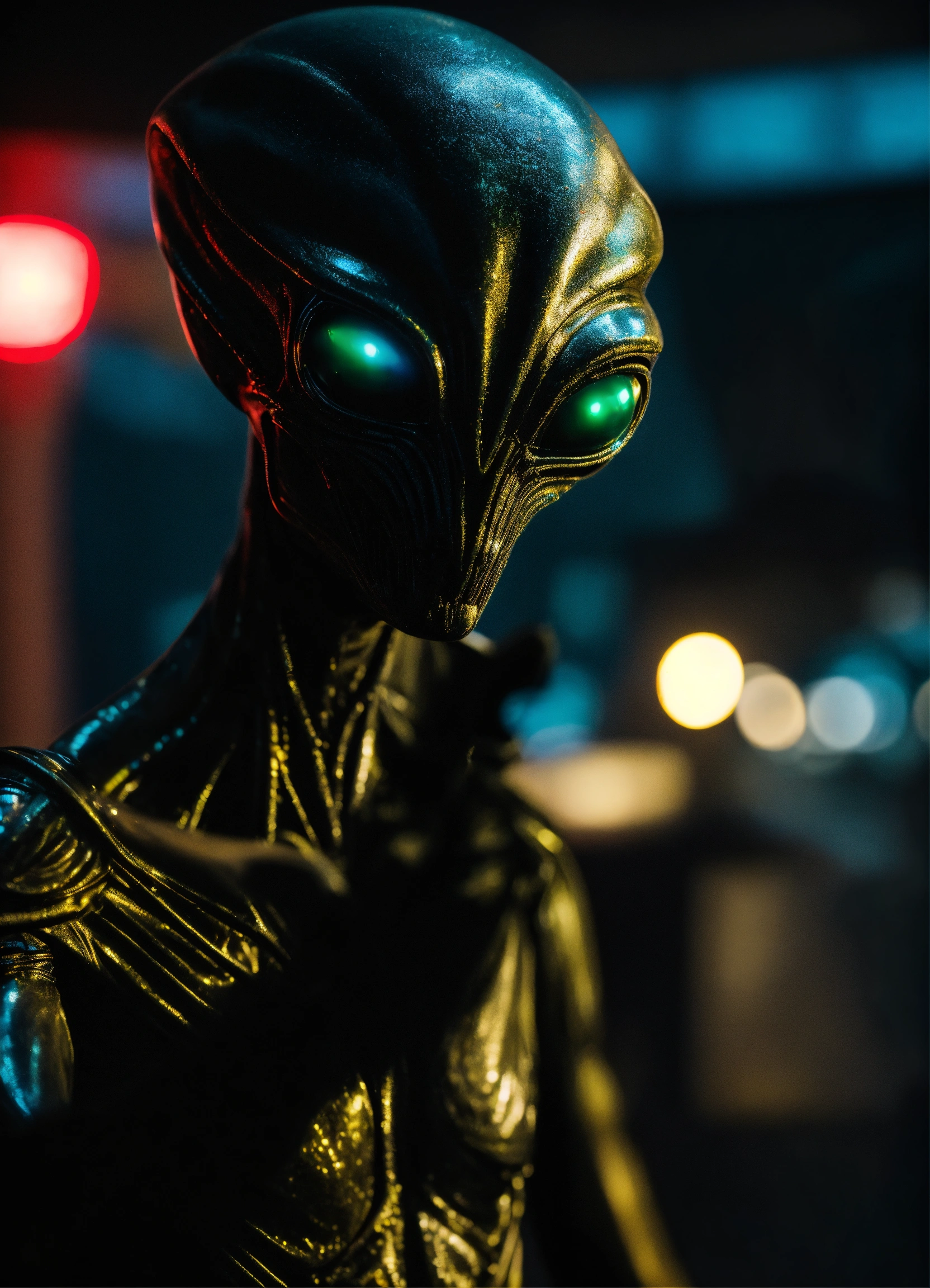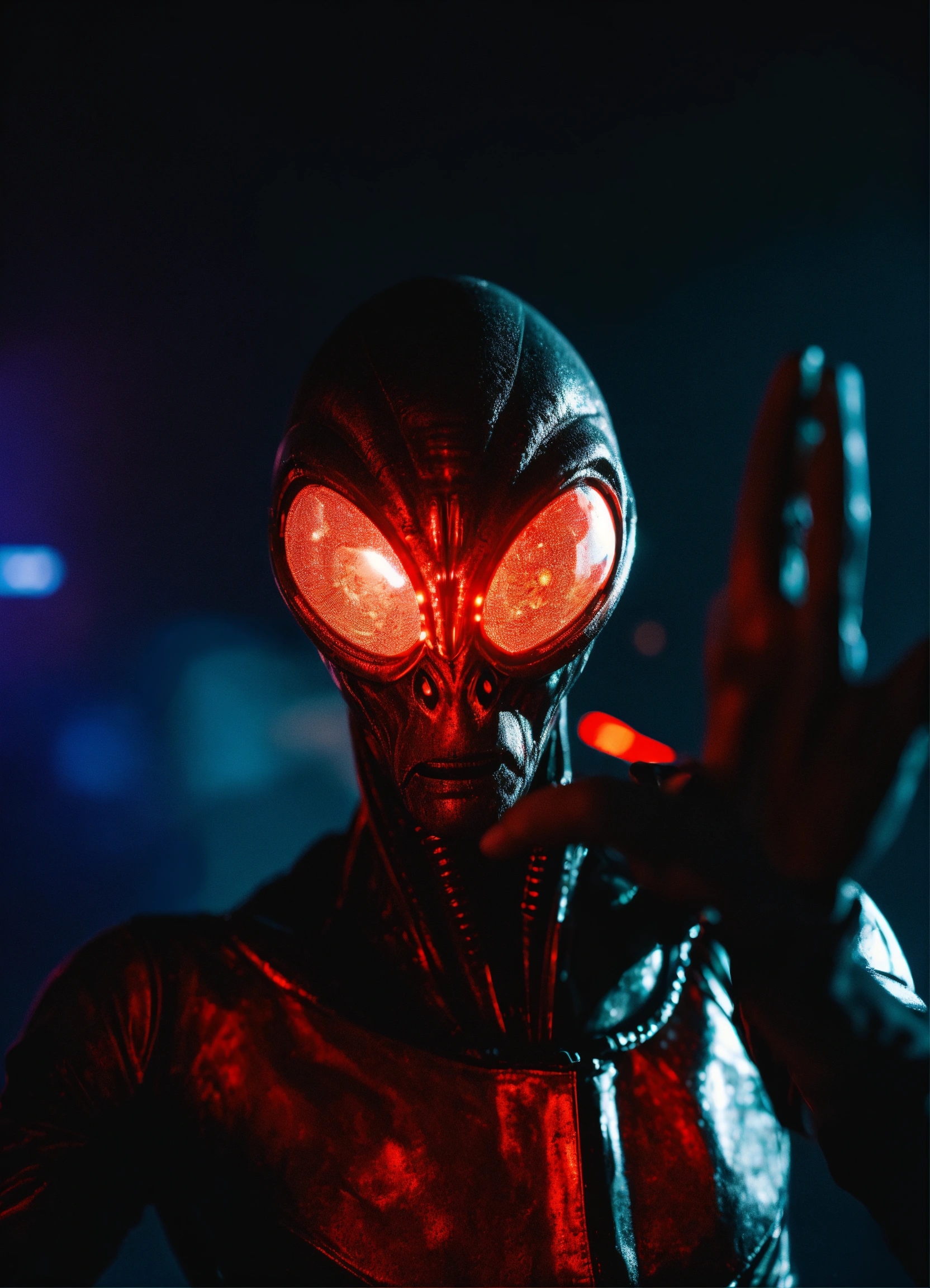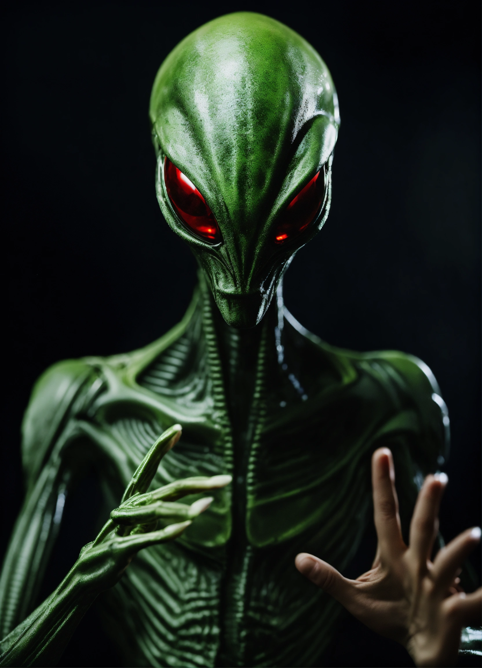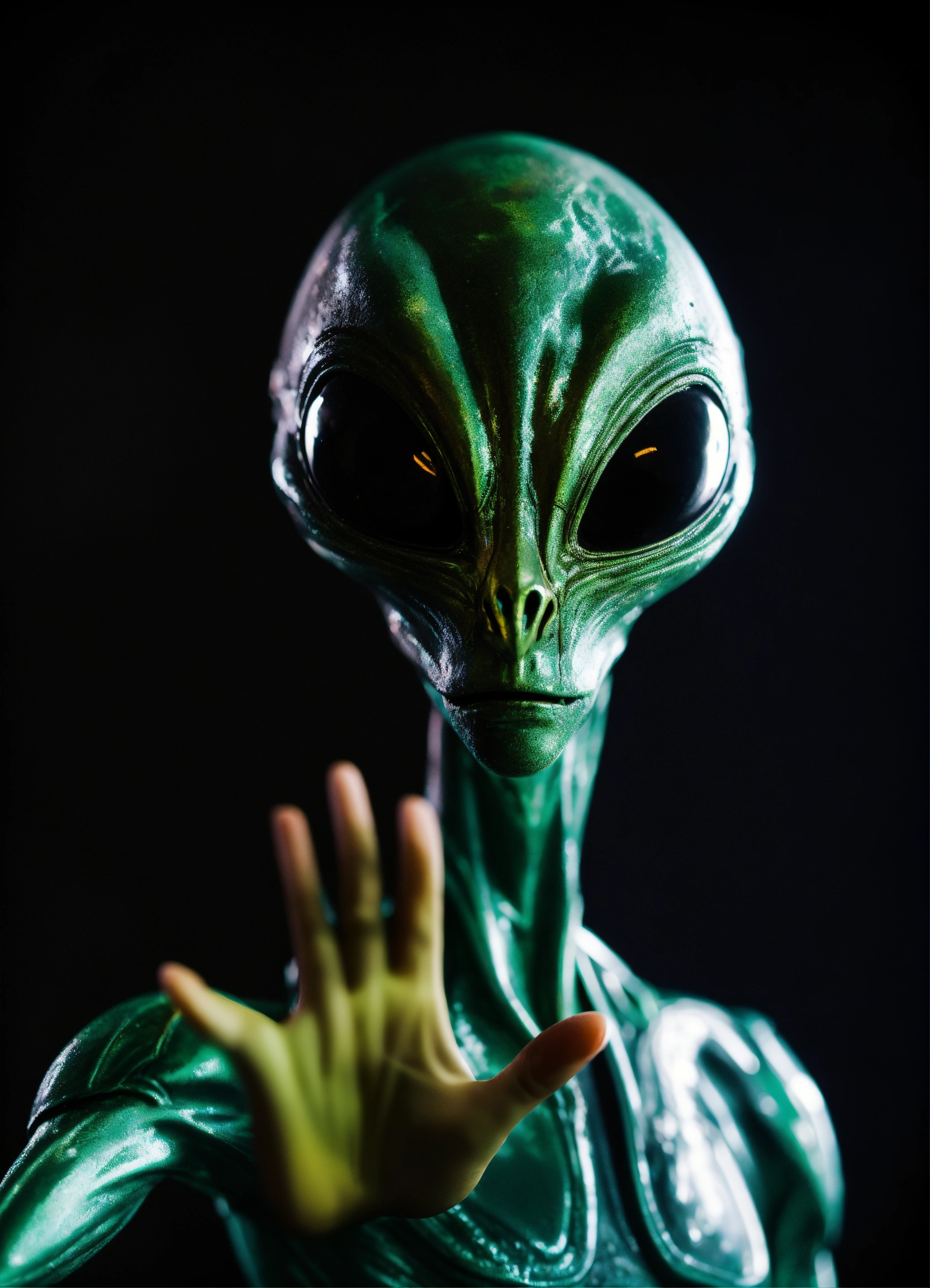 Closeup portrait picture against a black background of a blurry alien with a sharp focus at foreground on his hand open doing the stop sign to the camera
