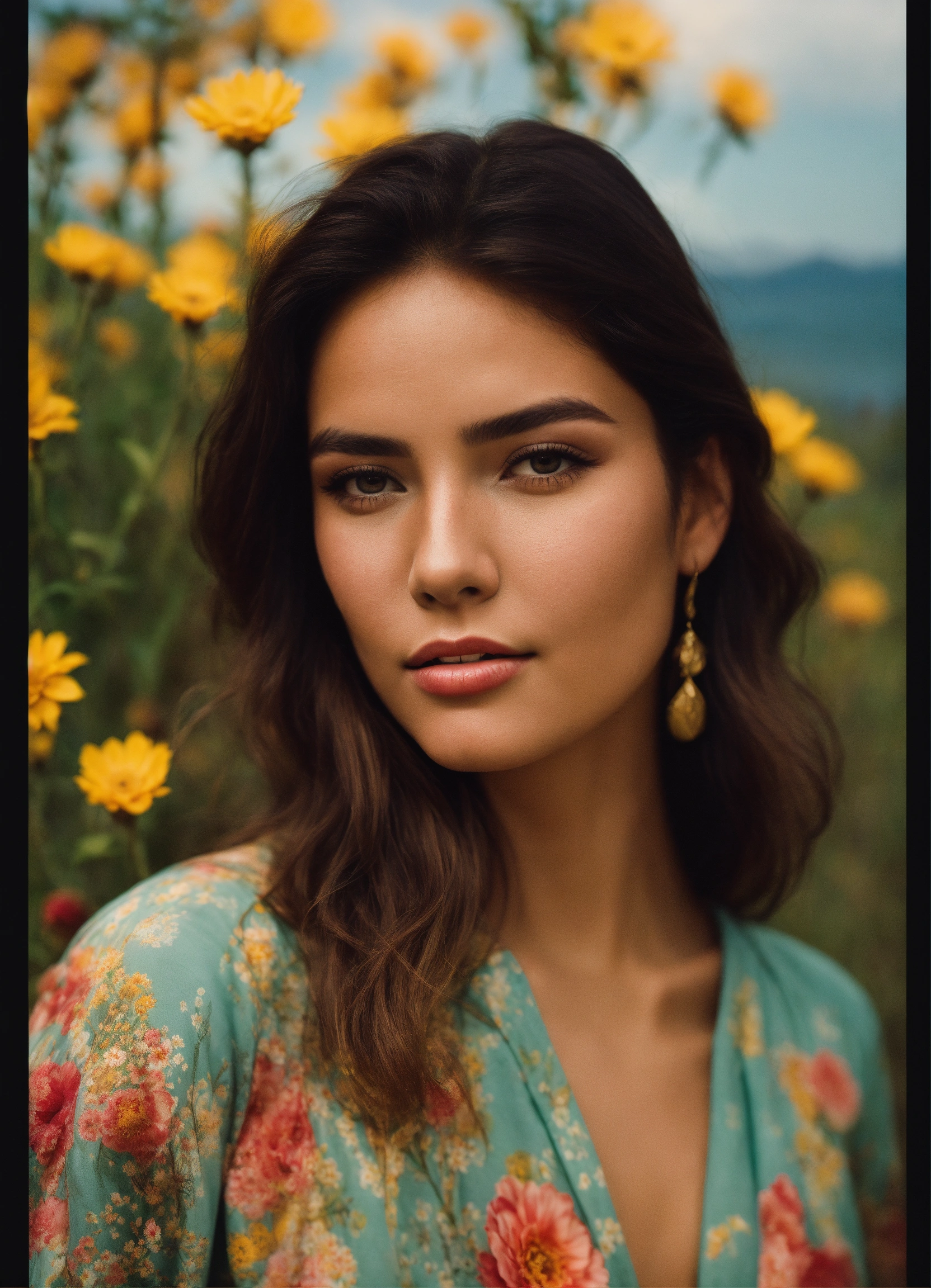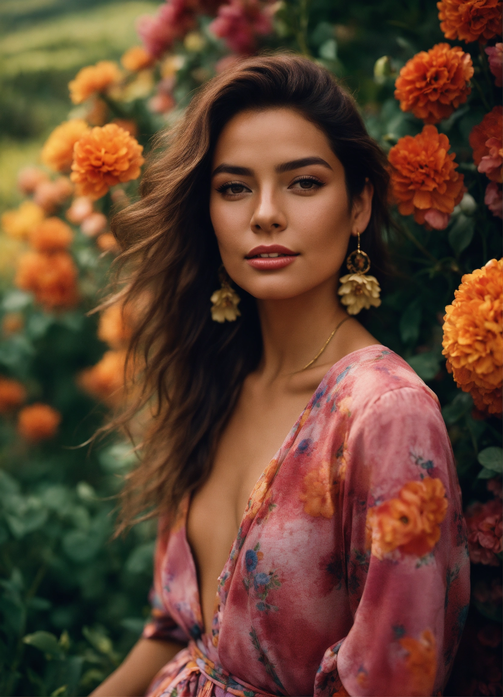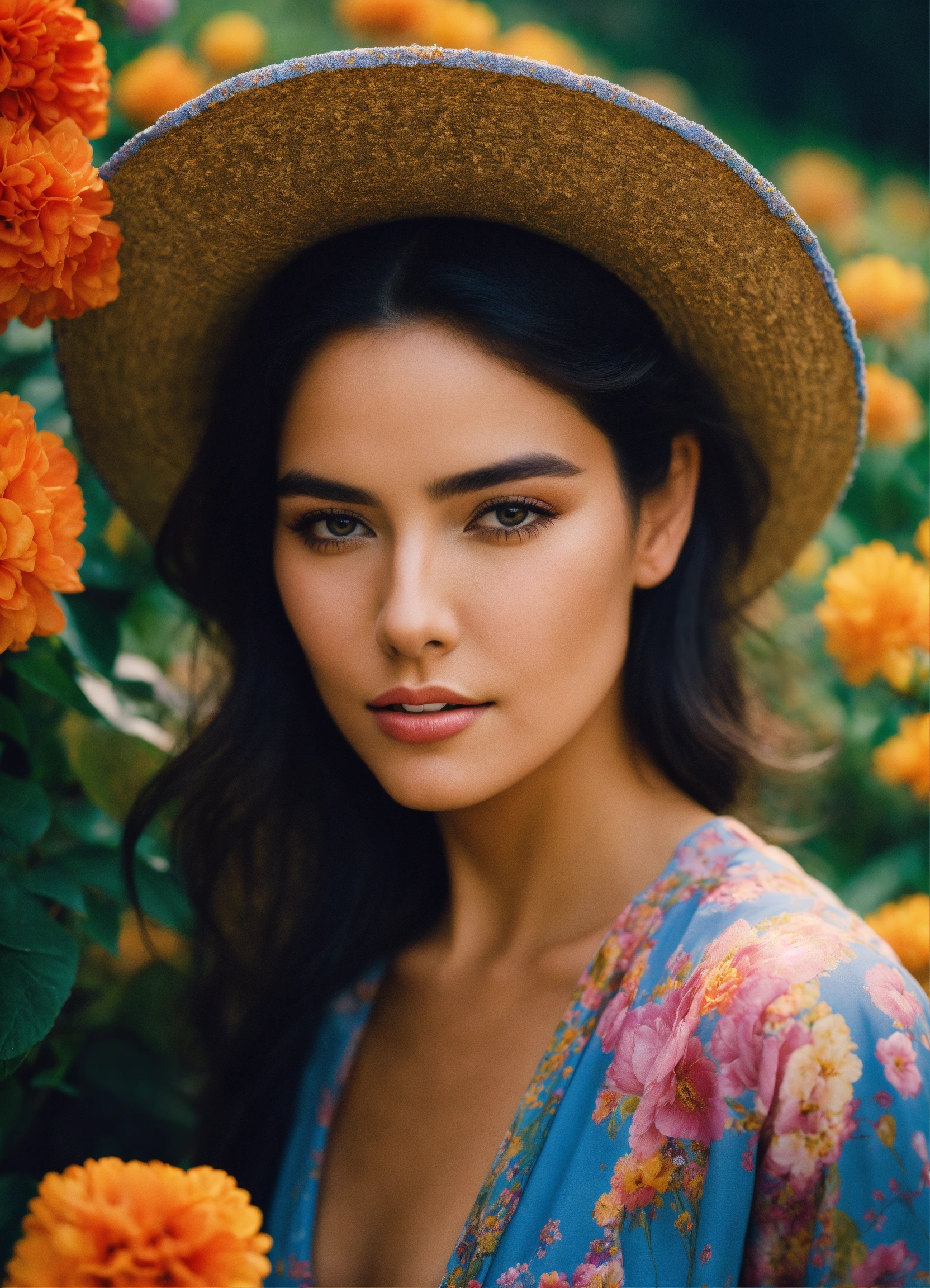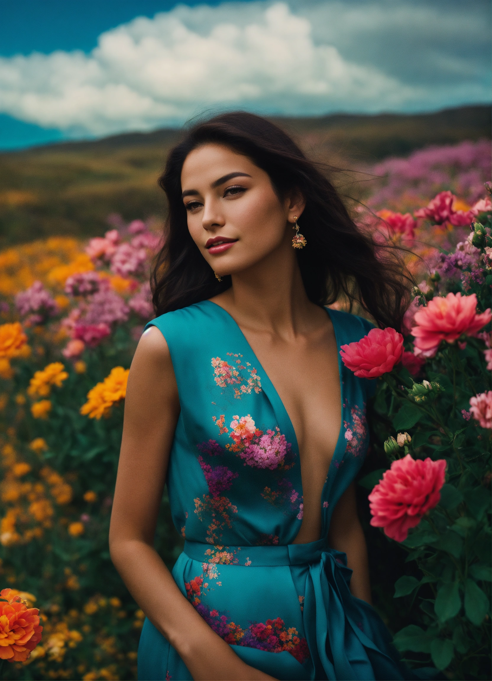 Portrait of beautiful latin fashion model, dreamy, photoshoot by annie leibovitz, editorial fashion magazine photoshoot, fashion poses, in front of landscape with colorful flowers film grain. a soft smile