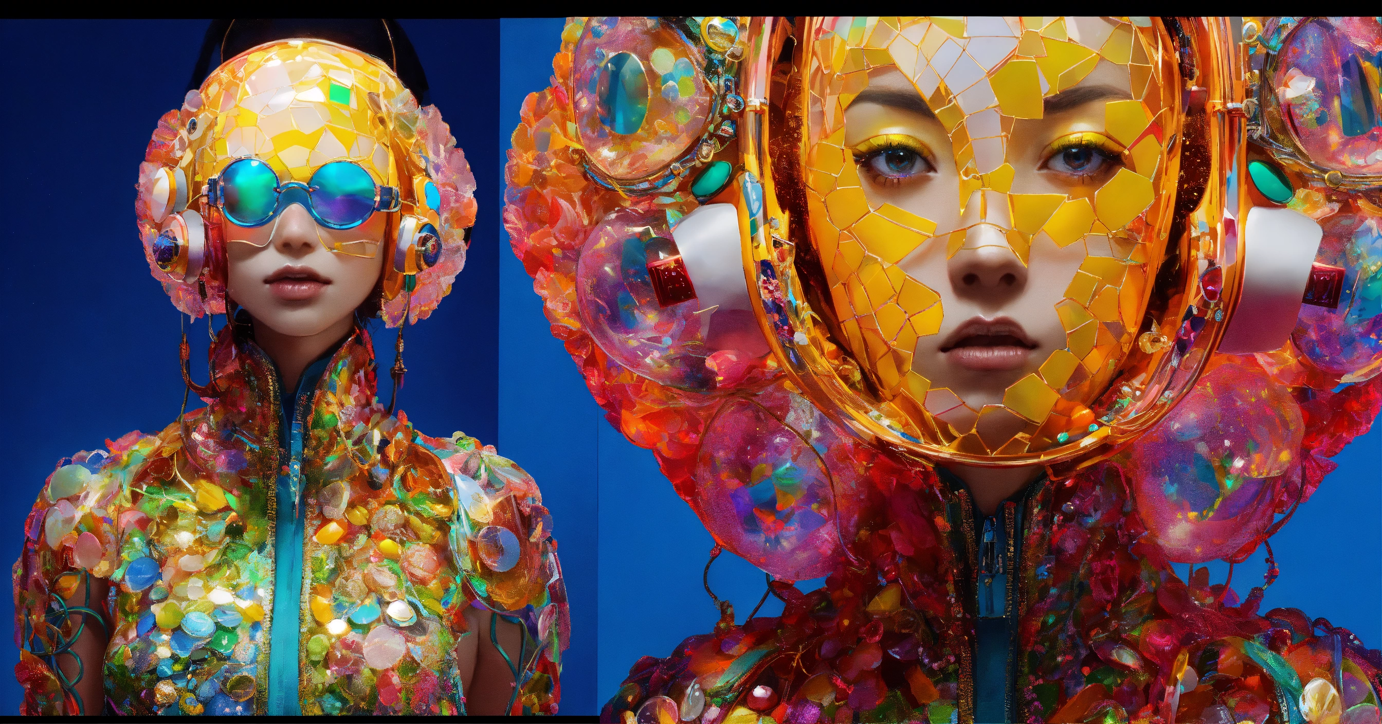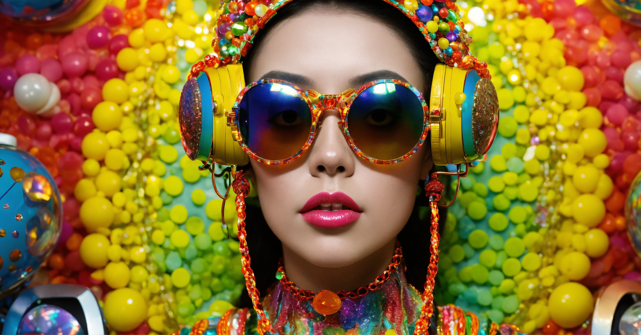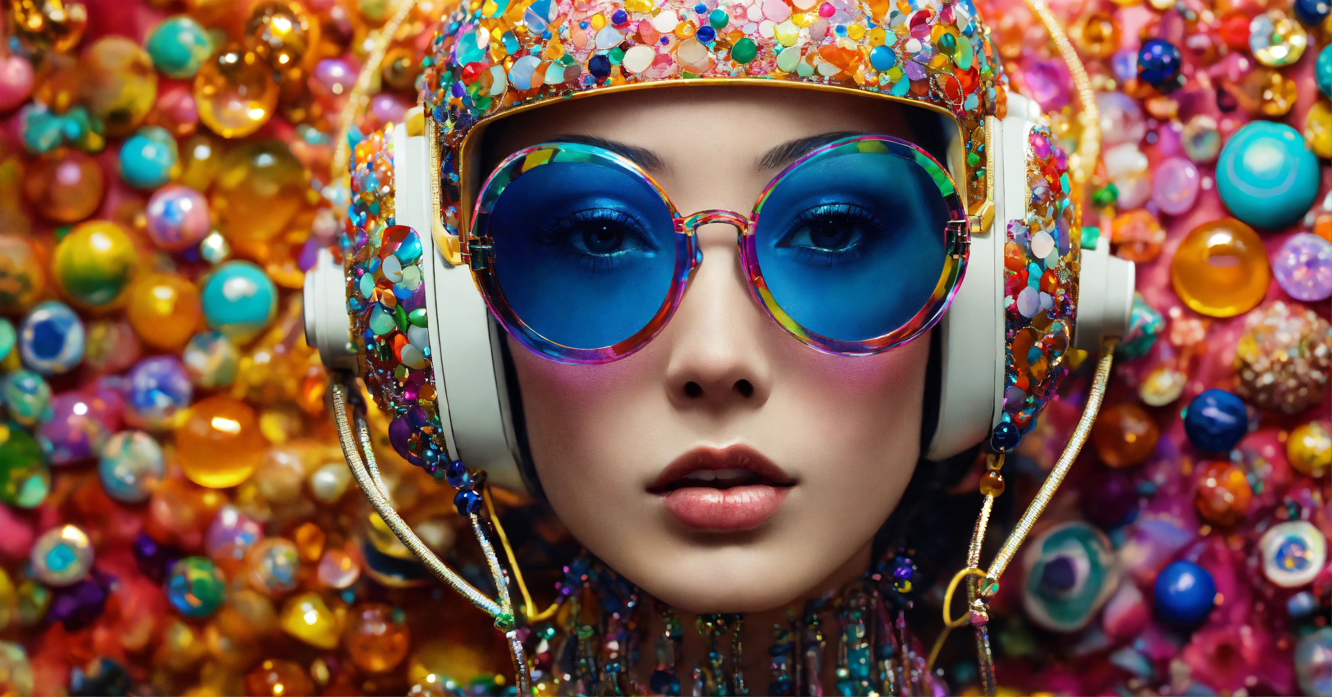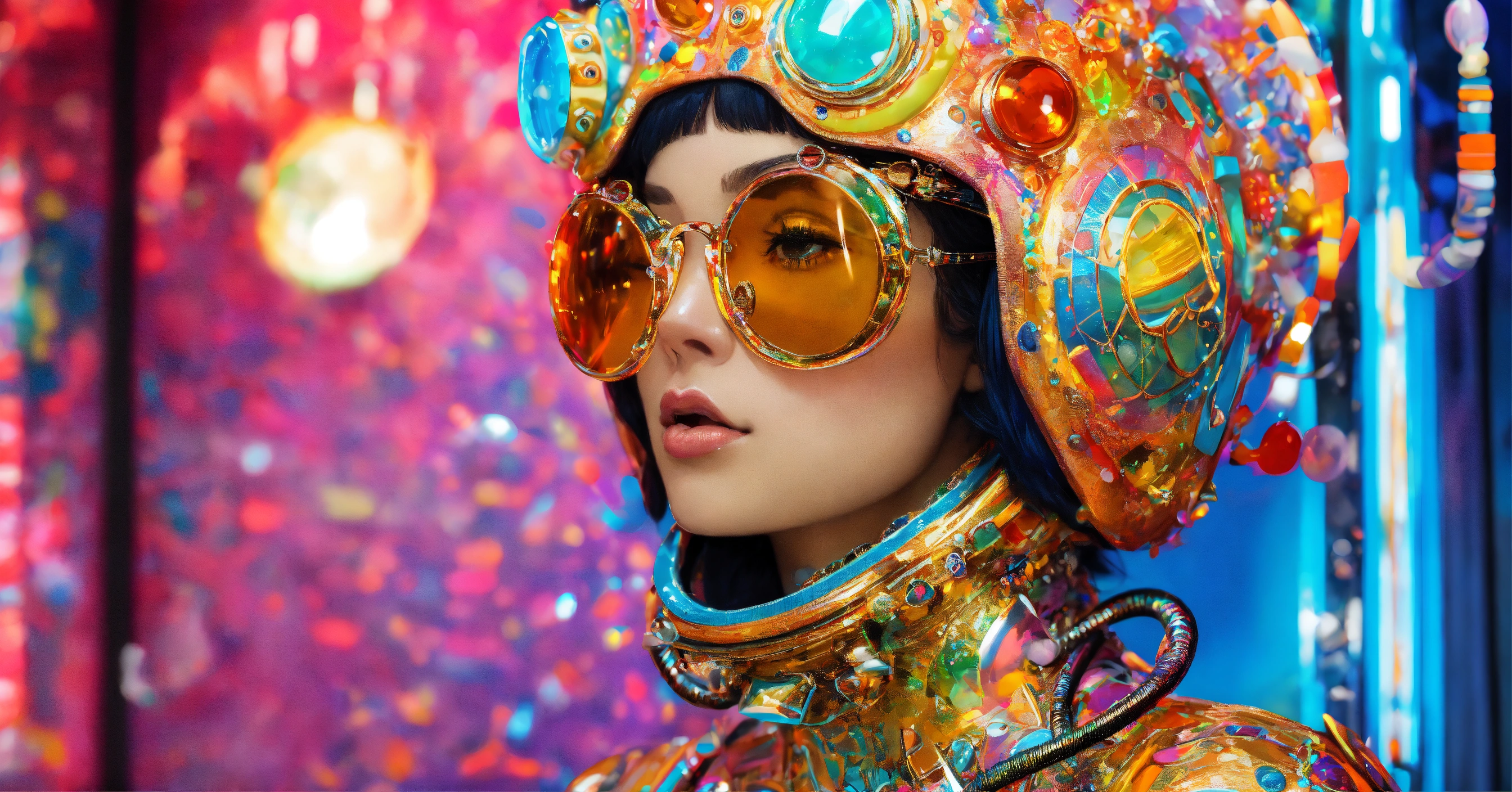 Sergio lopez, natalie shau, pop art, patterns profile of an astronaut woman in spacesuit decorated with intricate large white and gold gemstones, in a vibrant rainbow colors with metallic accents rounded cables and wires, transparent color shells crystal-clear helmet with holographic patterns profile of an eccentric individualenvironment map with large multicolor gemstones and, in a vibrant rainbow colors with metallic accents rounded cables and wires, transparent color shells and wires shape a full 16k wearing a big full highly detailed colorful sunglasses, volumetric lighting, art by yayoi kusama, phuoc quan
