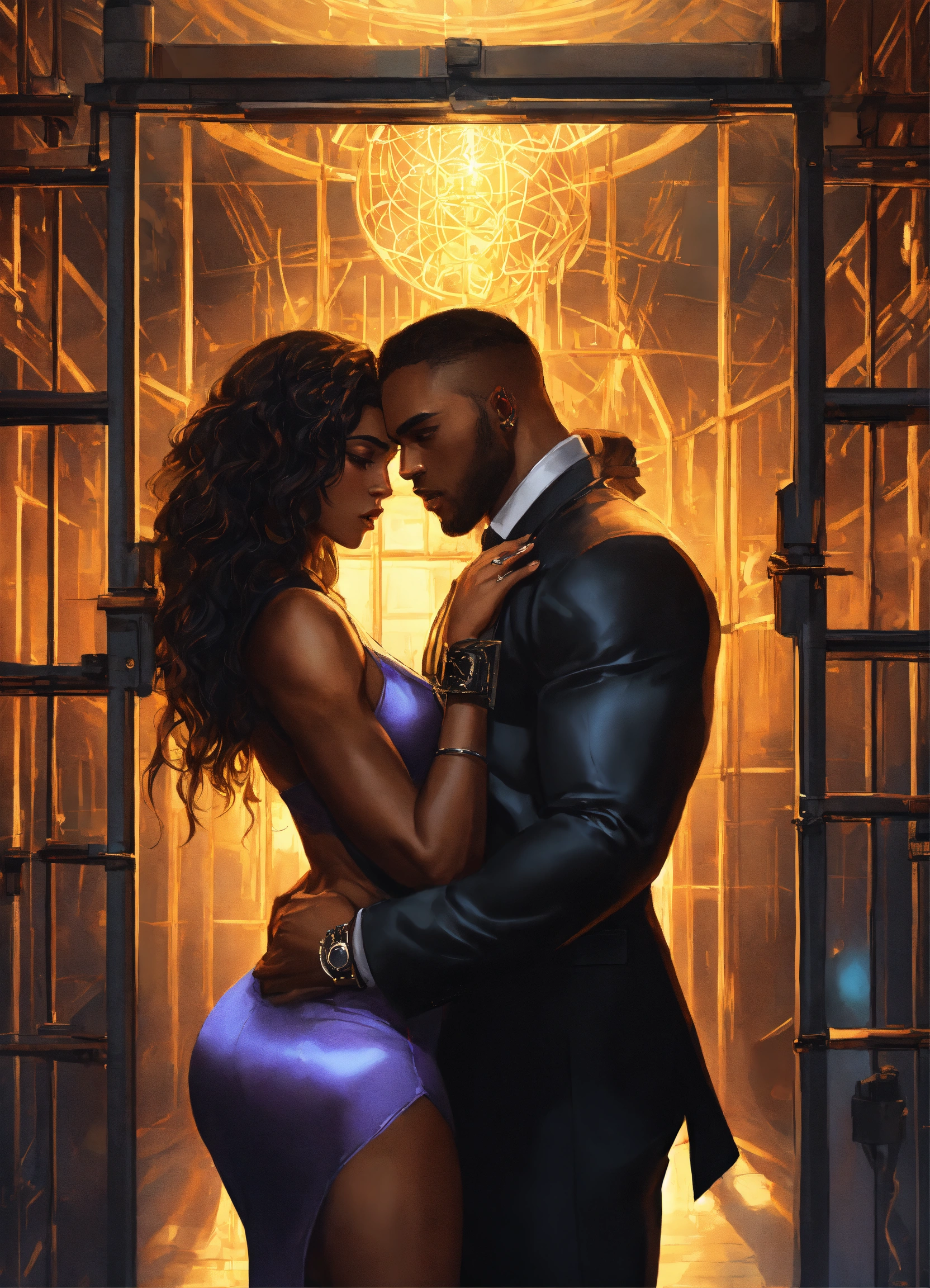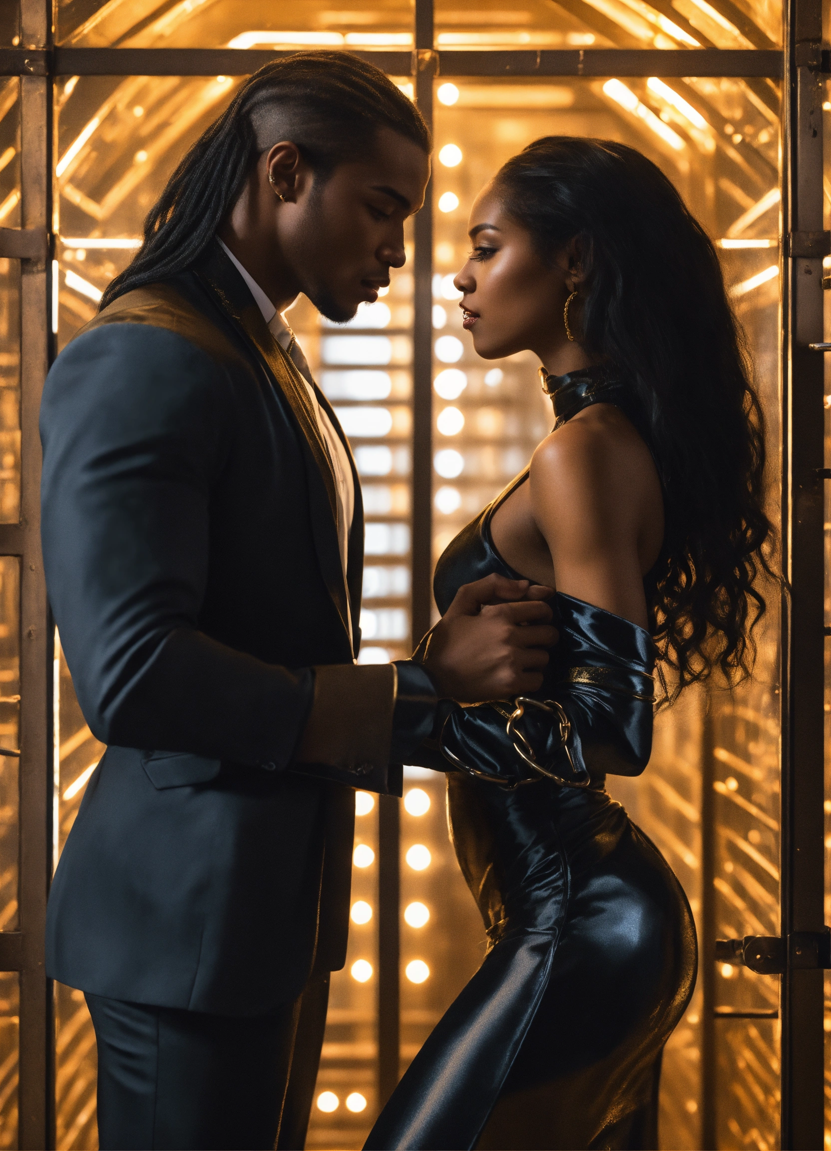 A male vampire, a huge strong huge muscular black male vampire wearing a modern formal suit embracing a beautiful hand cuffed black girl, a beautiful perfect soft girl with long flowing hair, long hair. flowing hair, wearing a resplendent gold dress and handcuffs in a futuristic glass prison cell in a supernatural prison, fantasy, high detail, realistic photo, high detail, digital painting, cinematic, stunning, hyper-realistic, sharp focus, high resolution 8k, insanely detailed