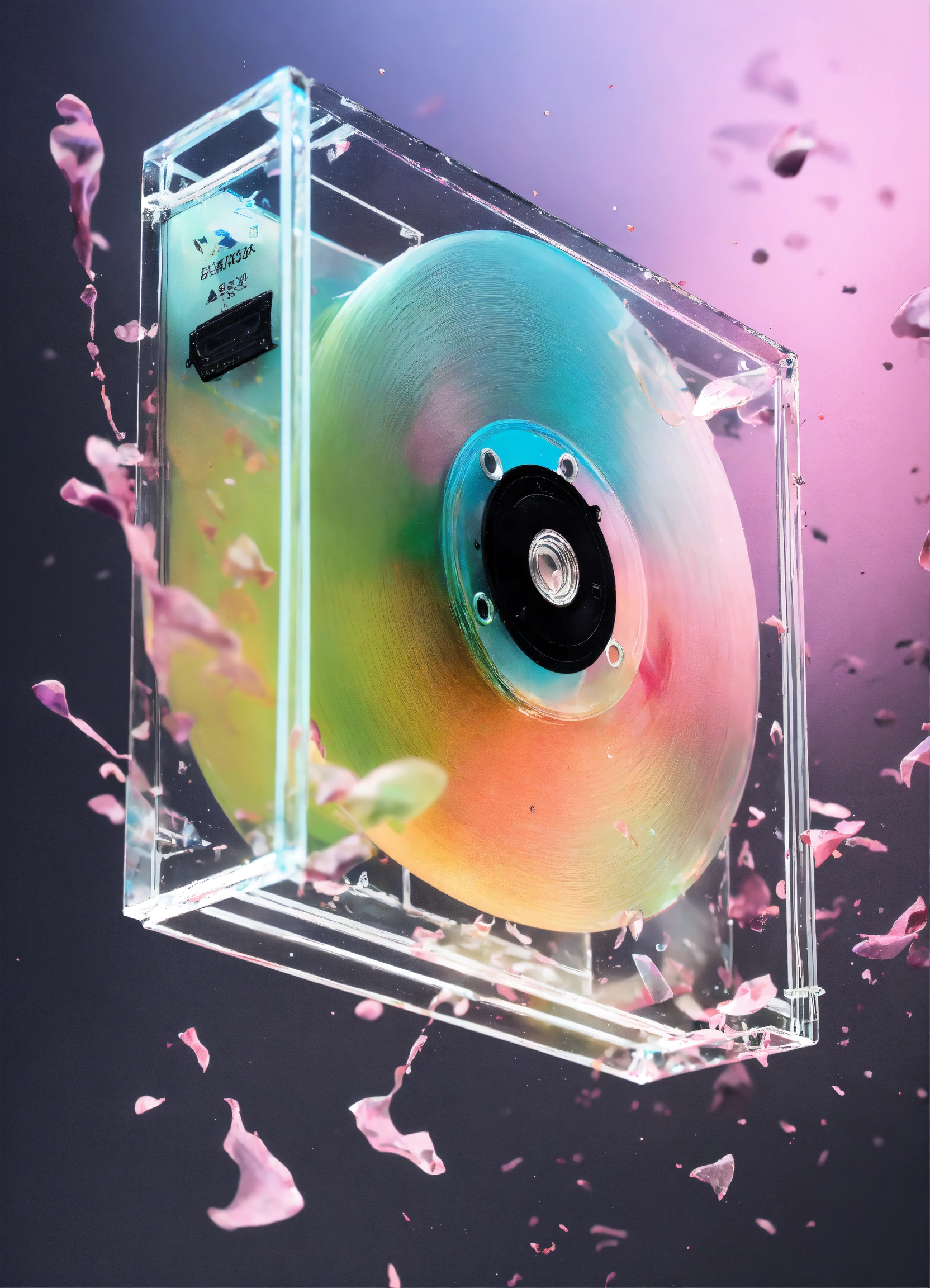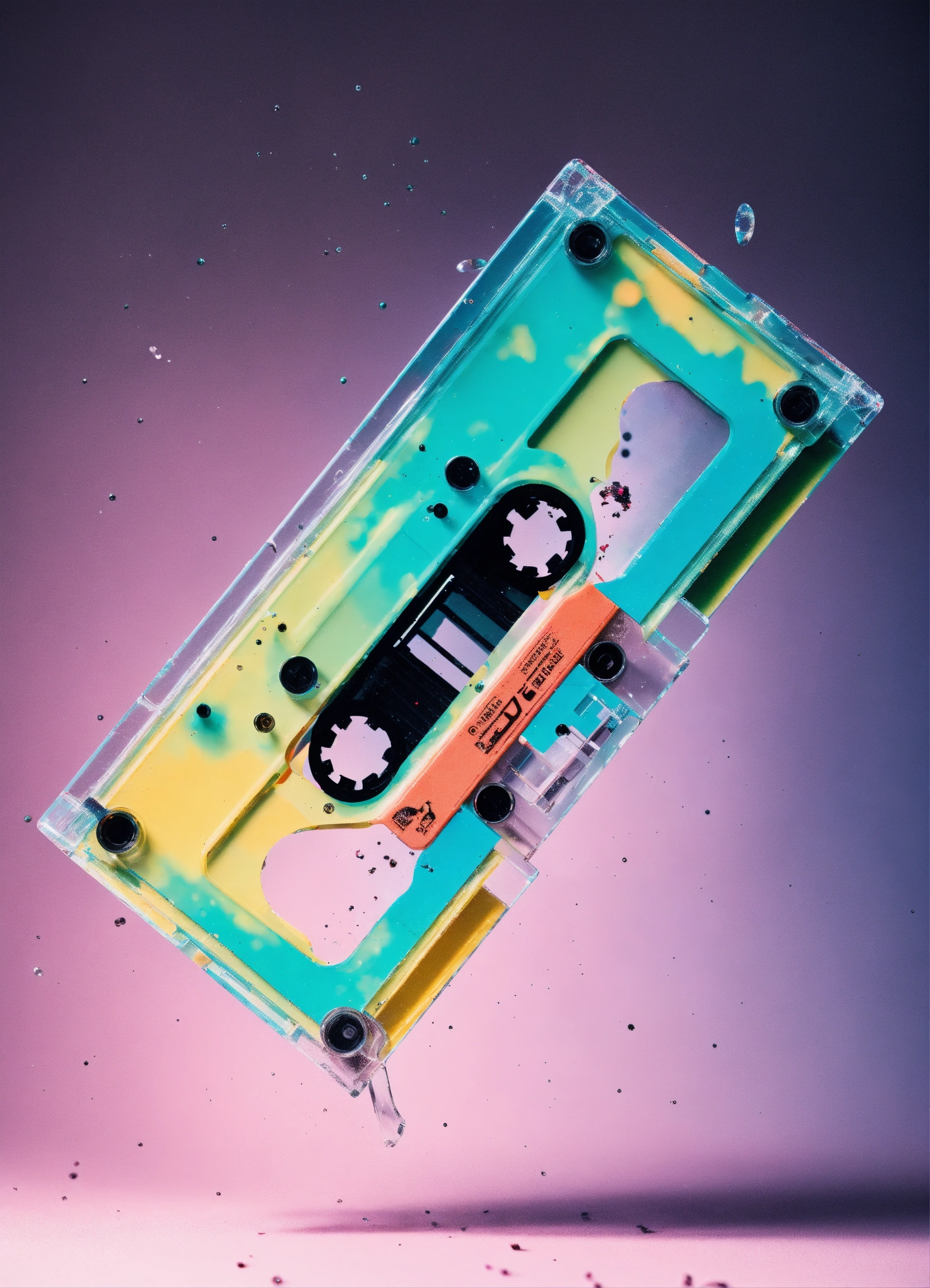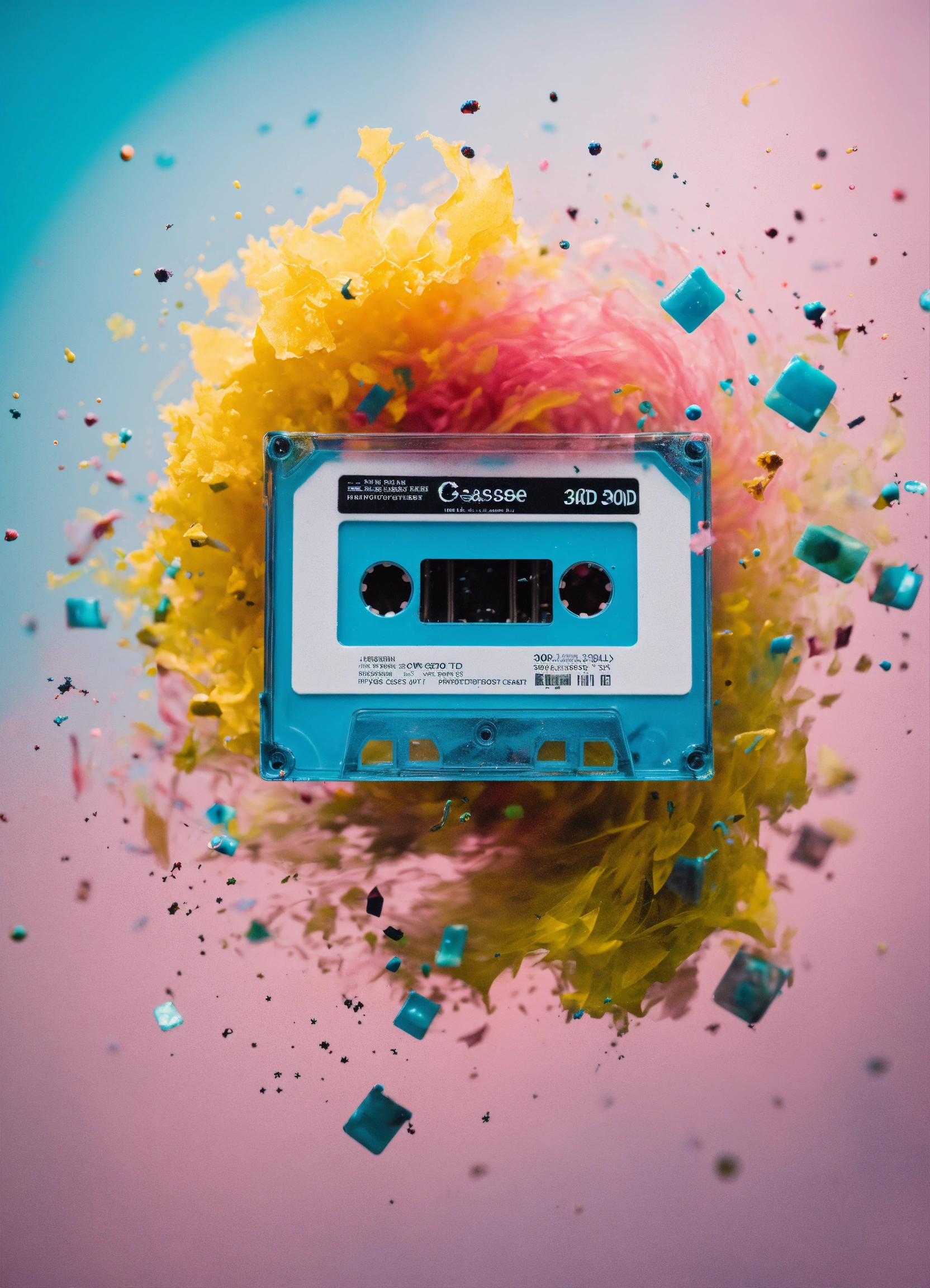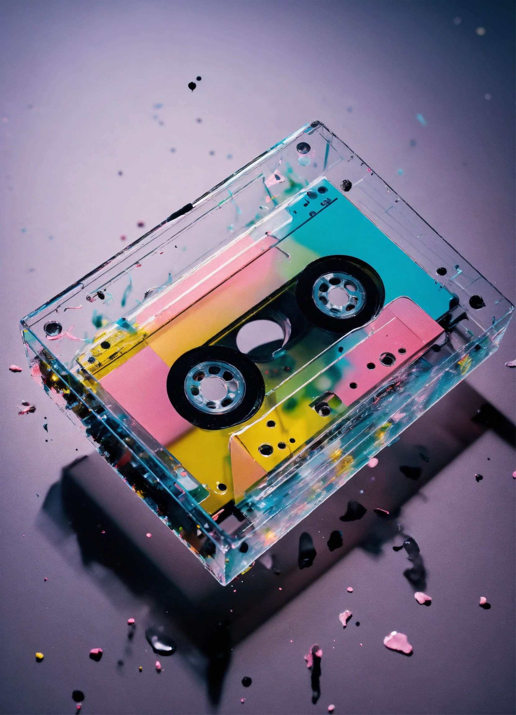 Pastel color low-angle view shot photography of a flying 3d plexiglass cassette, emerges from spiral black ink splatters, 80 degree view