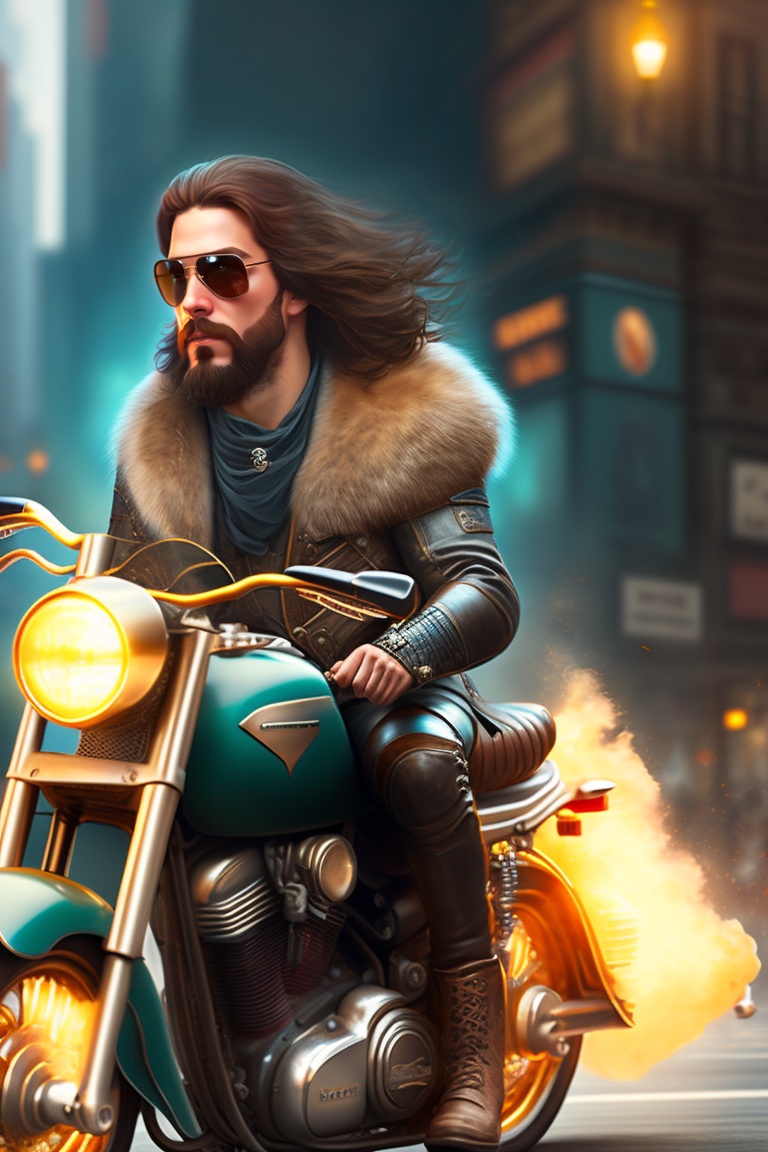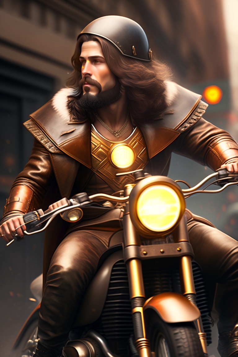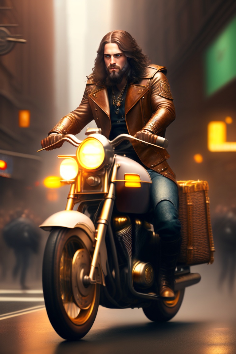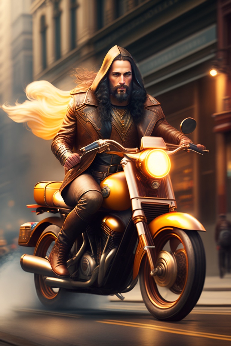 Jesus christ riding a motorbike, steam punk, background nyc, hard light, sharp shape, 8k, melted skin
