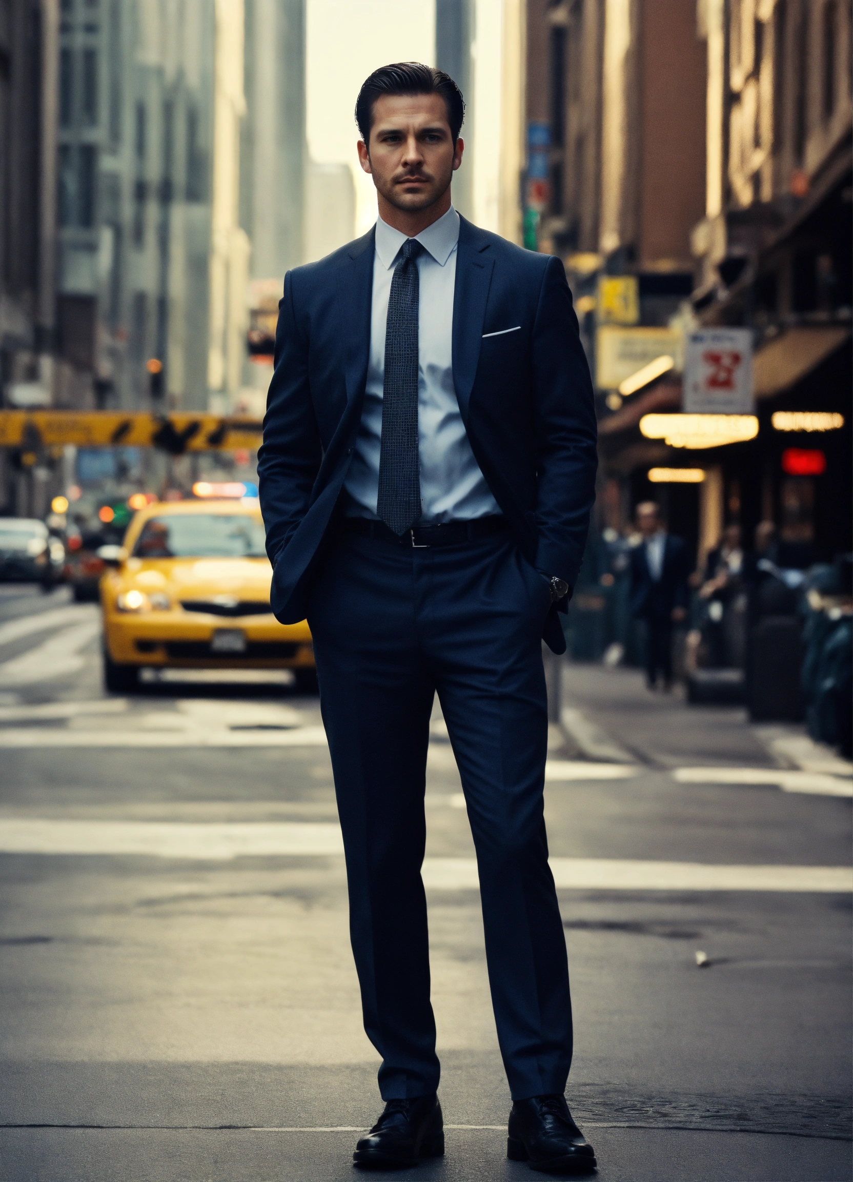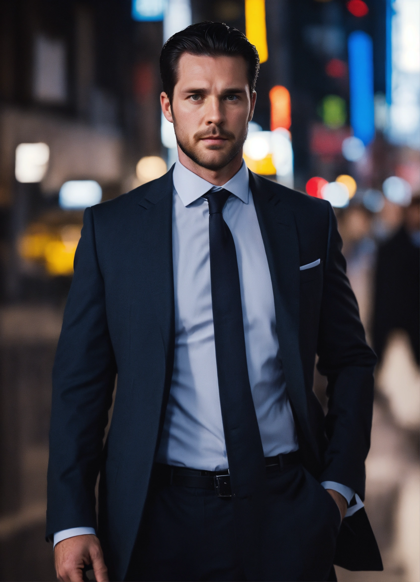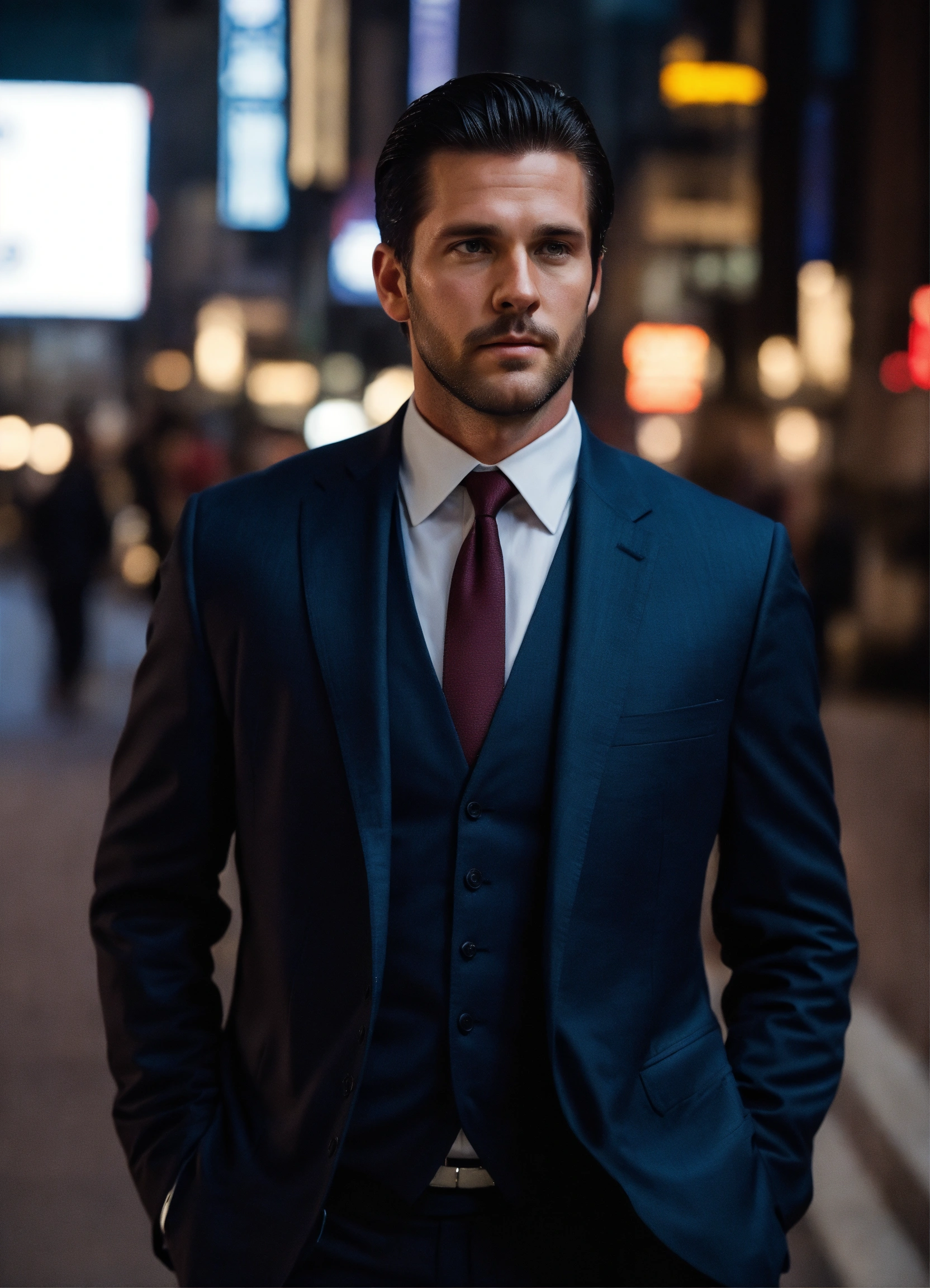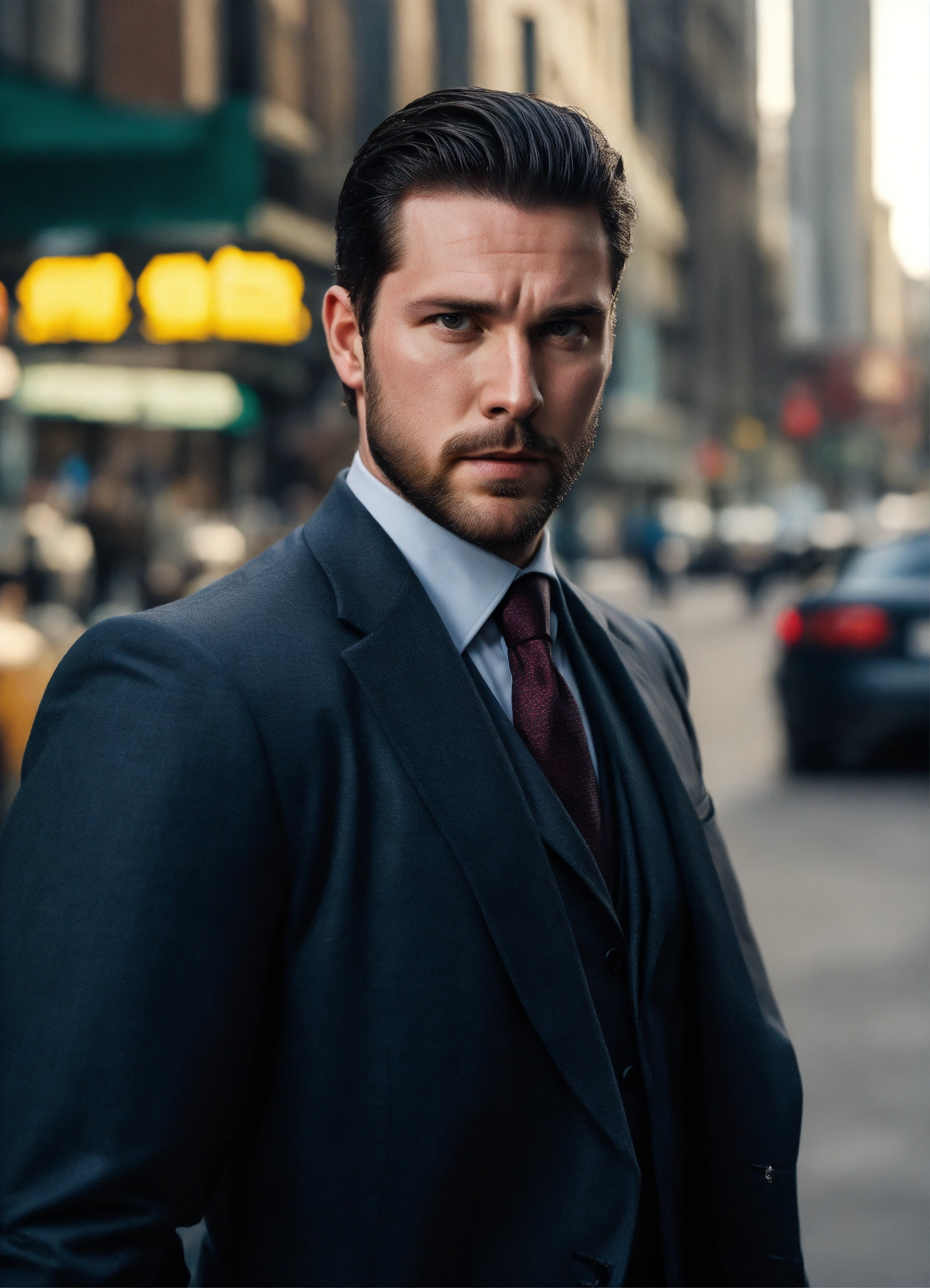 A photo of a movie star handsome white male grizzled investigator. 30 years old, with black slicked-back hair, standing on a busy city street. wearing a suit and tie, his facial expression suspicious and wary.