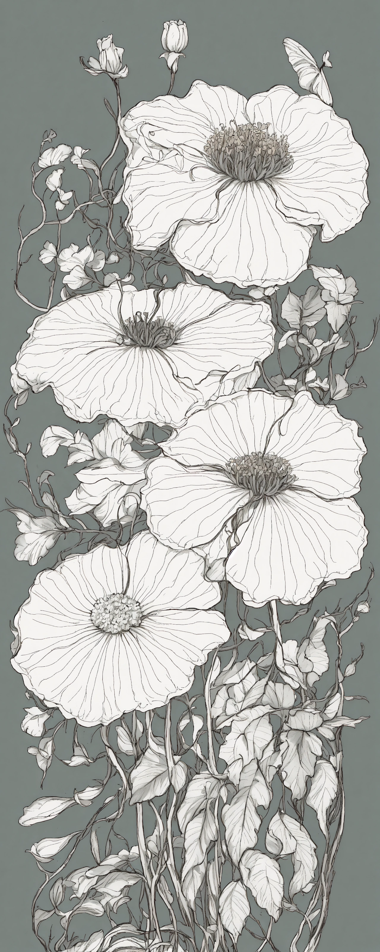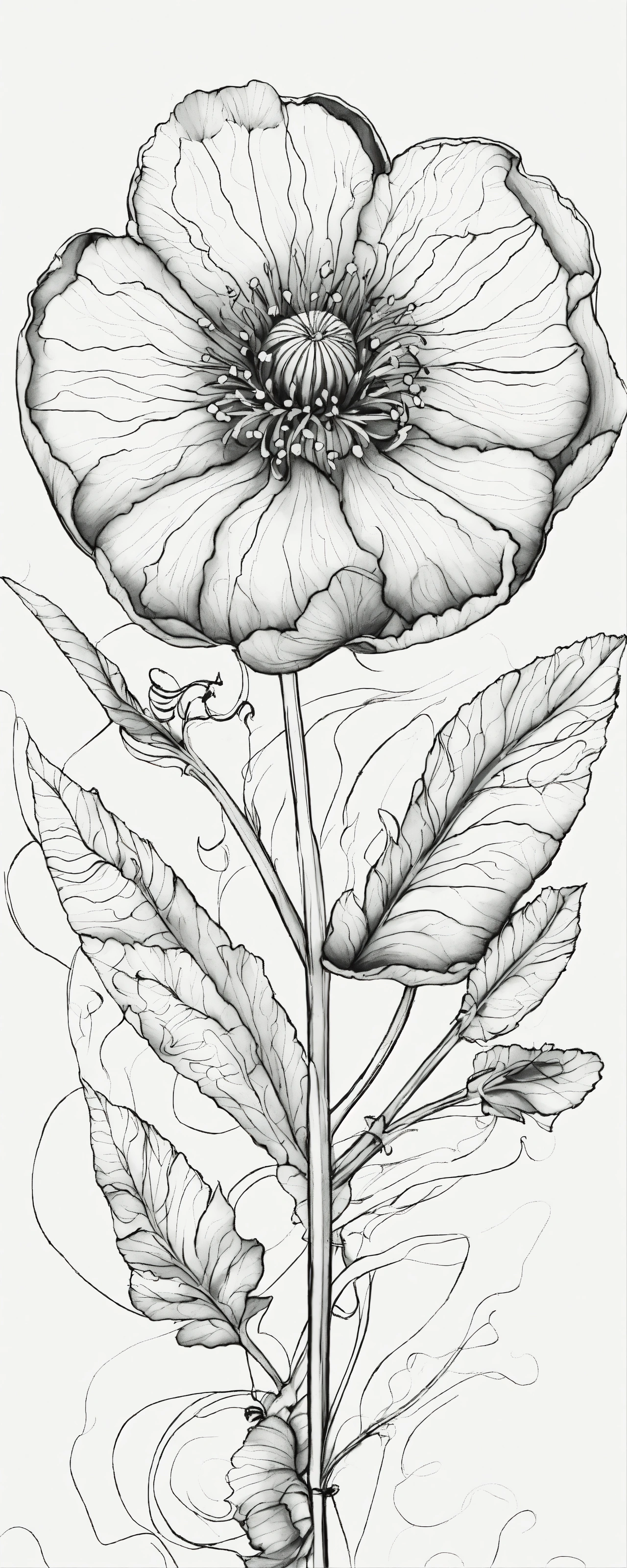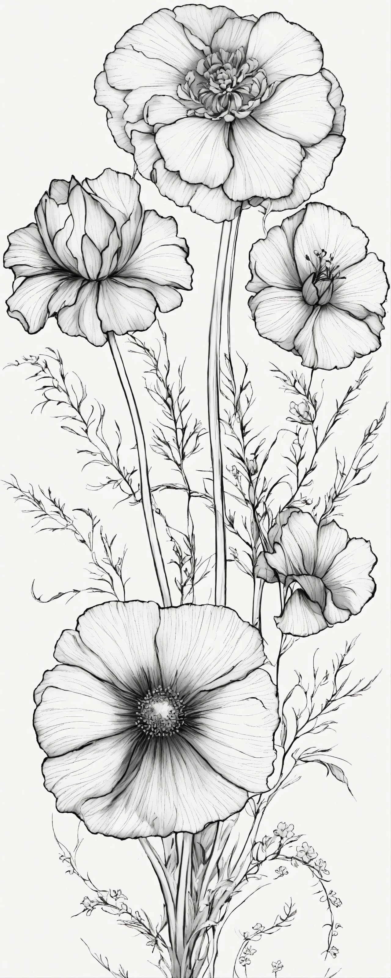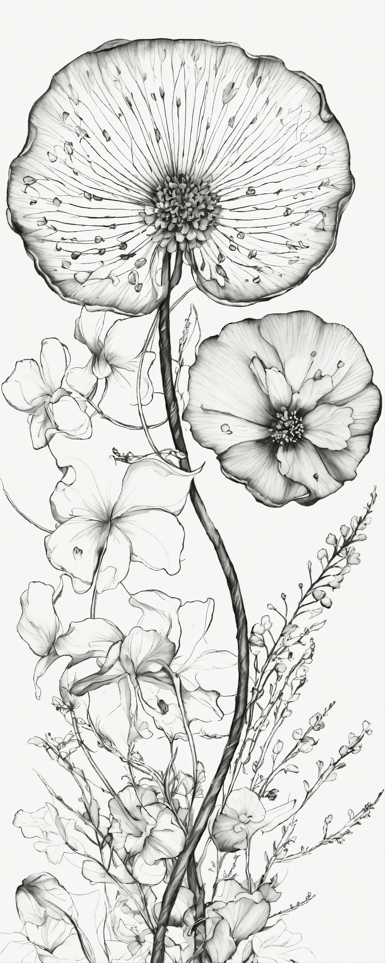 Croquis dessin simple méduses chrysaora pacifica avec des filaments et fleurs exotic mais moins de filaments que de fleures, white background, tattoo style, noir et blanc