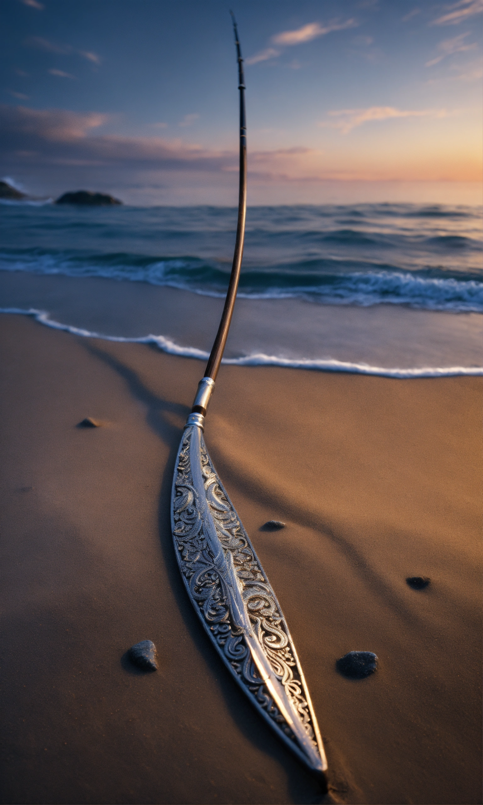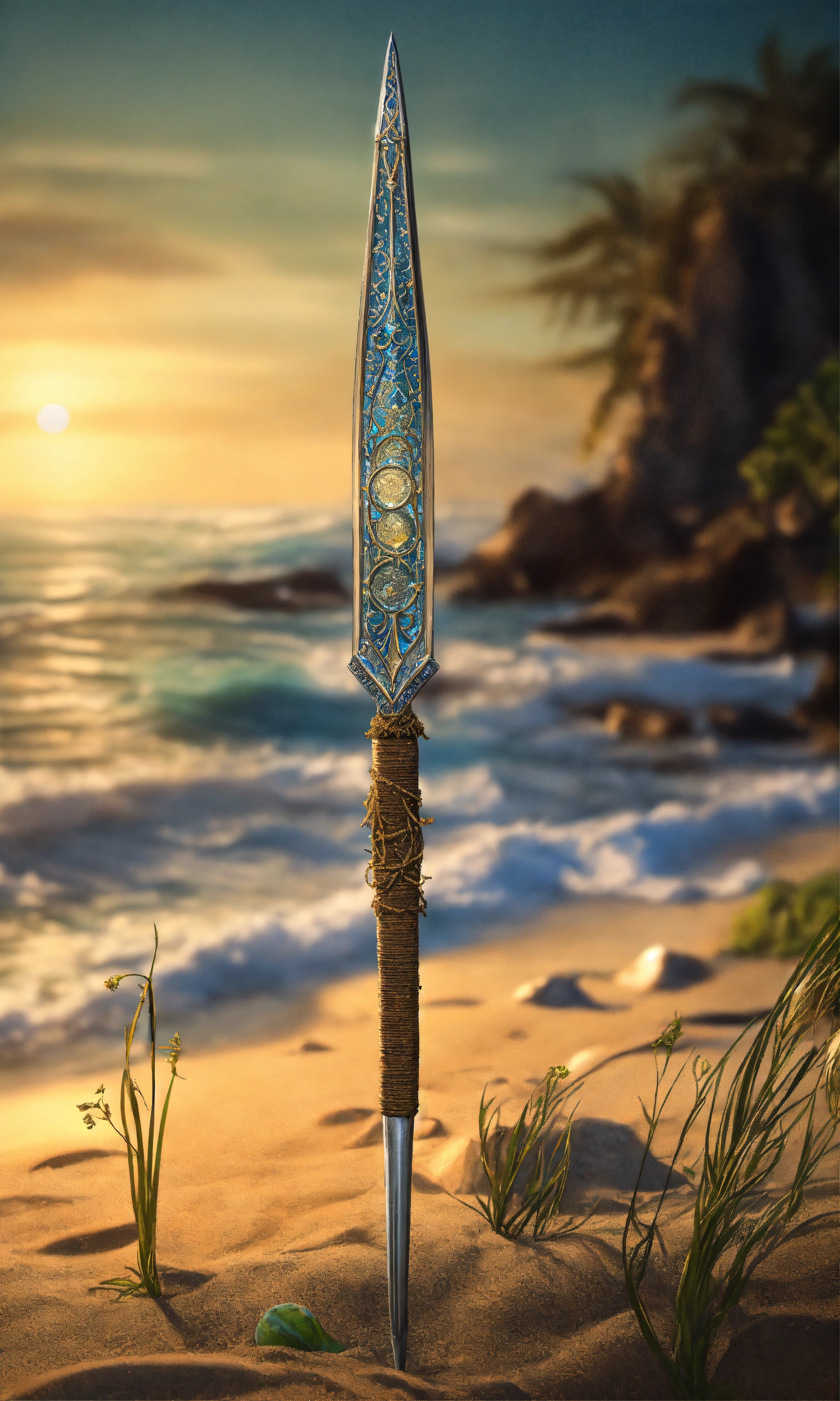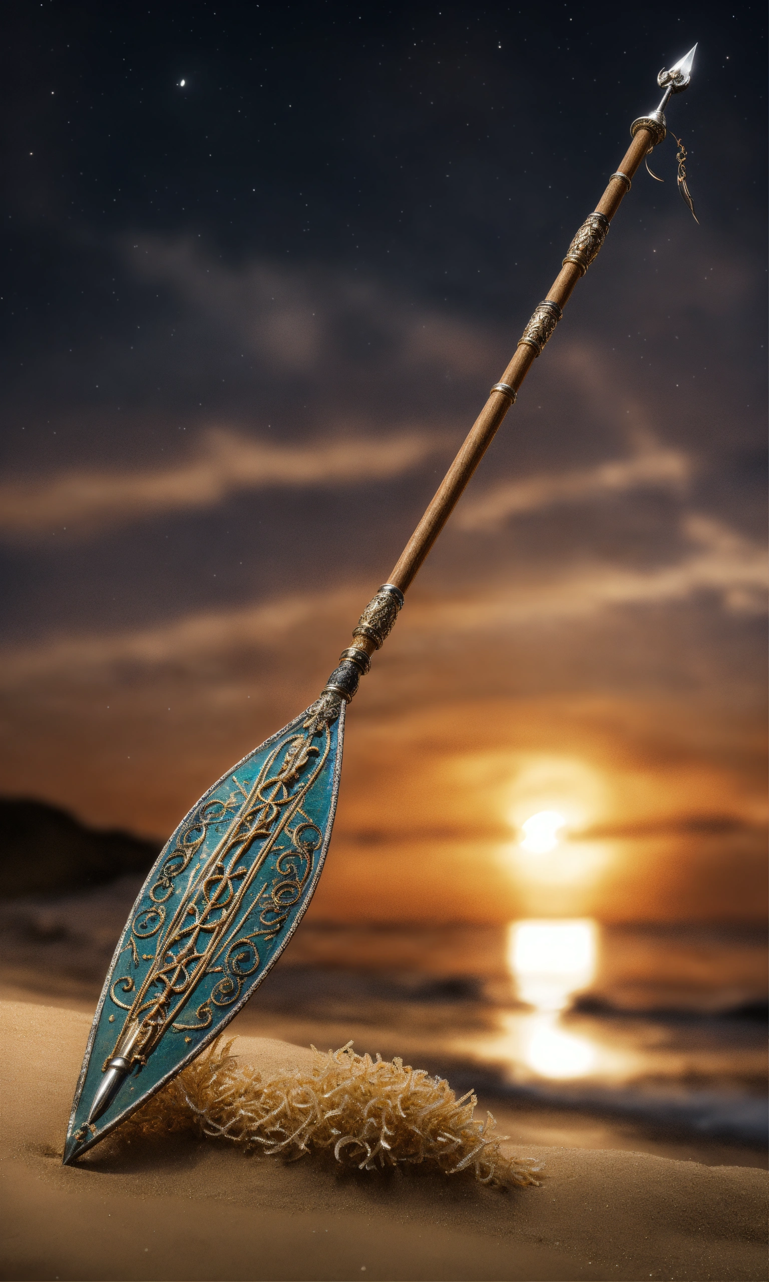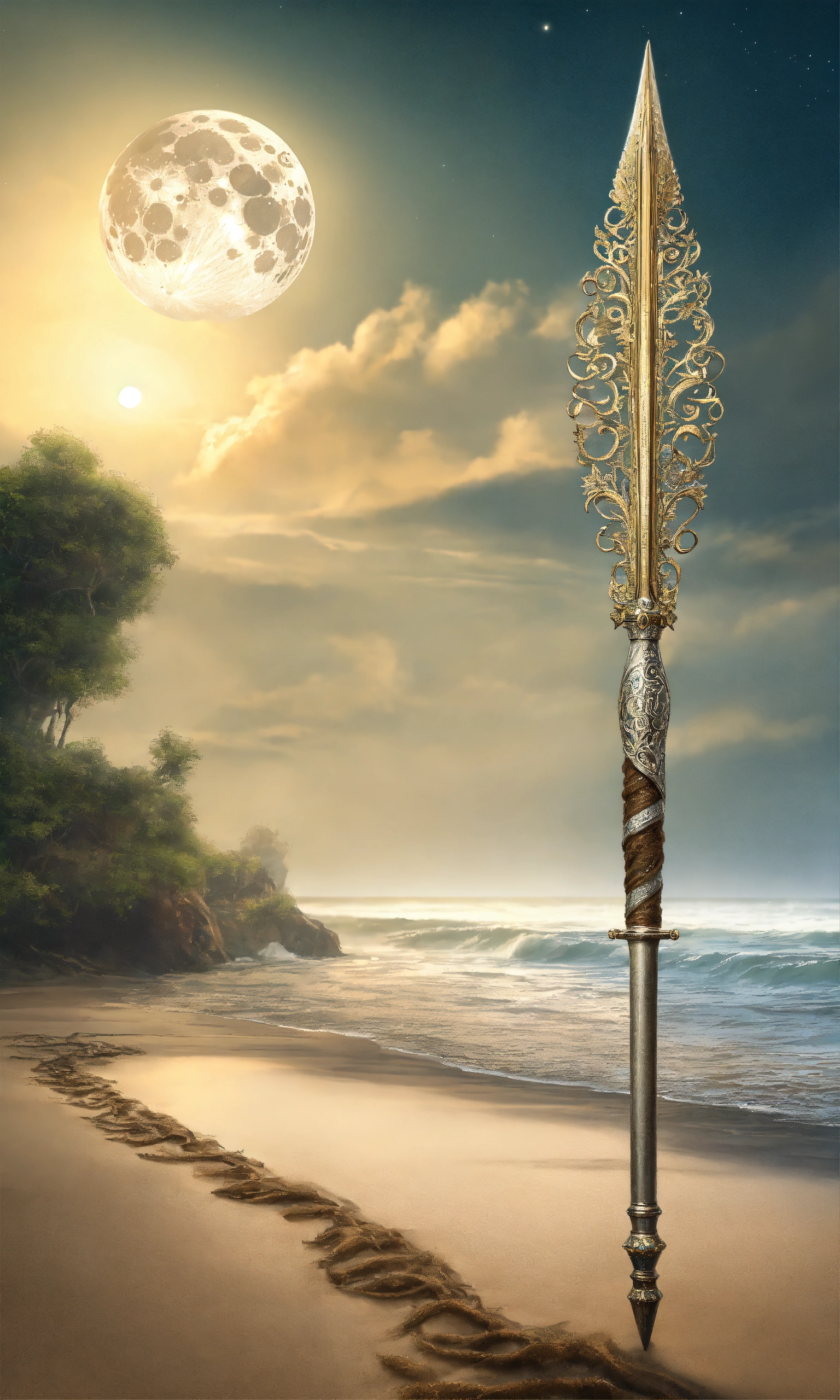 8k, picture of a narrow and delicate toothed fishing spear with barbs made of lunar-silver, highly ornamented, at the bottom there is an eyelet to which a twenty meter long tow line made of braided seaweed is attached, very detailed, ultra realistic, stuck with the bottom end deep in the sand on the beach in a lonely bay, moonlight, fantasy, medieval.