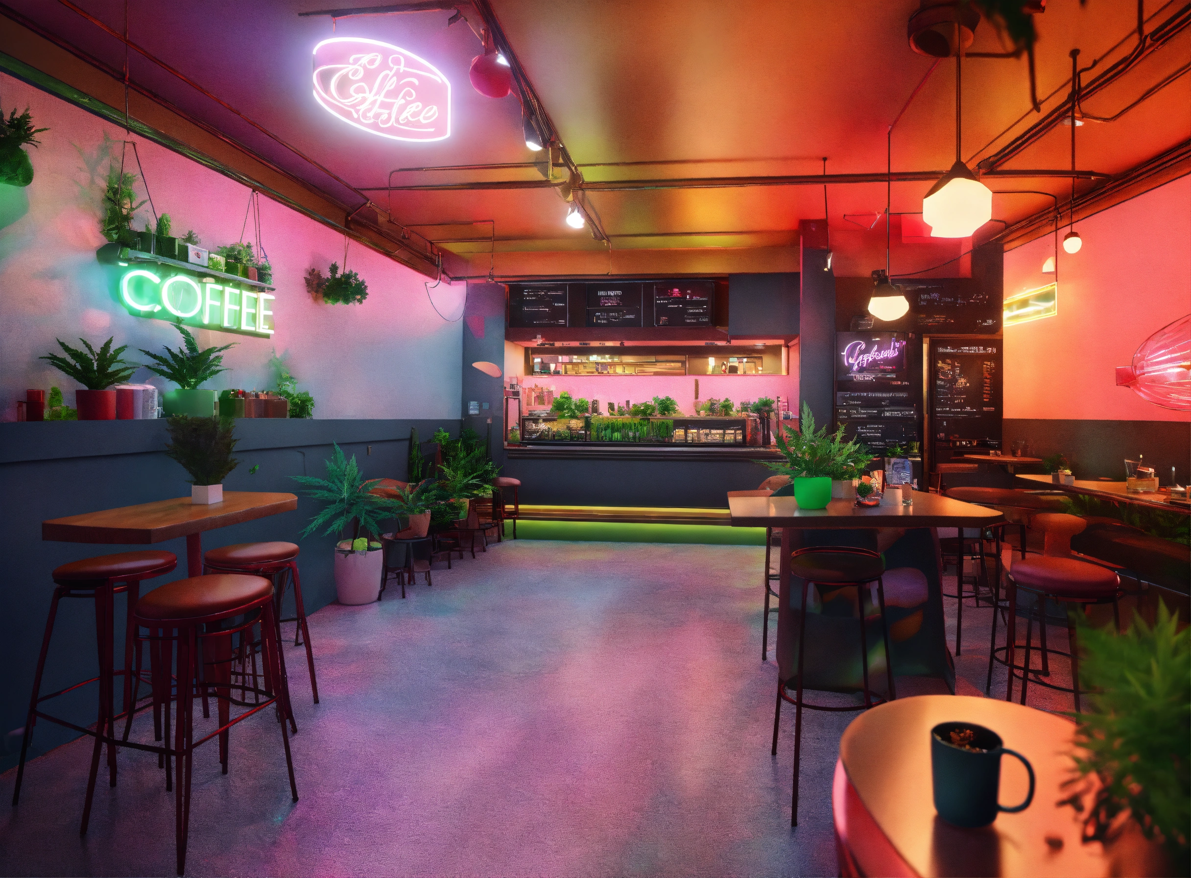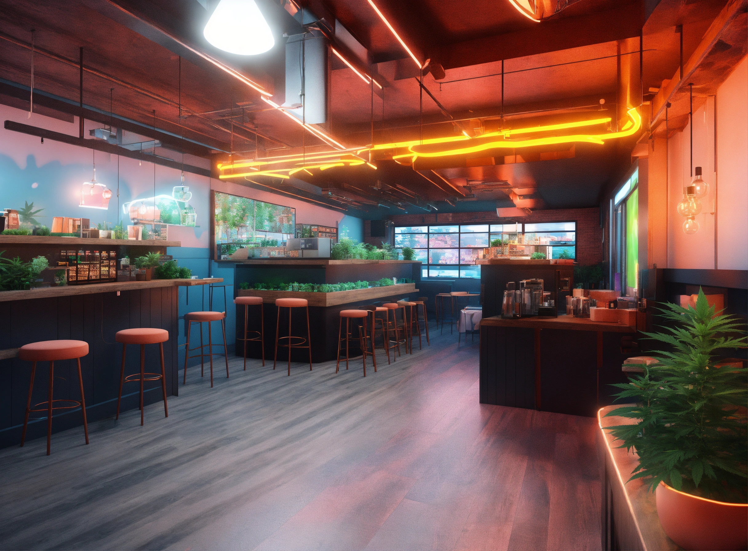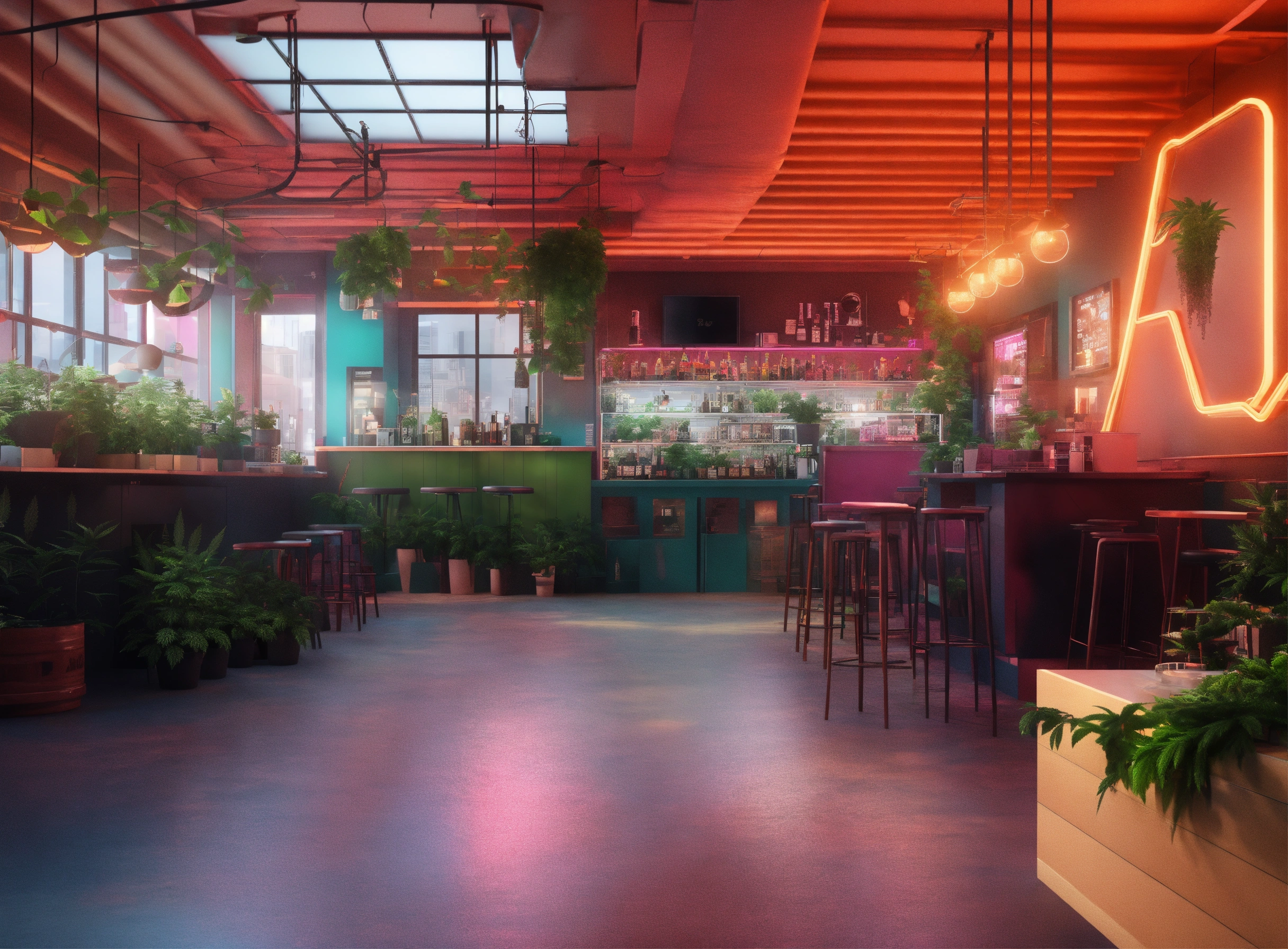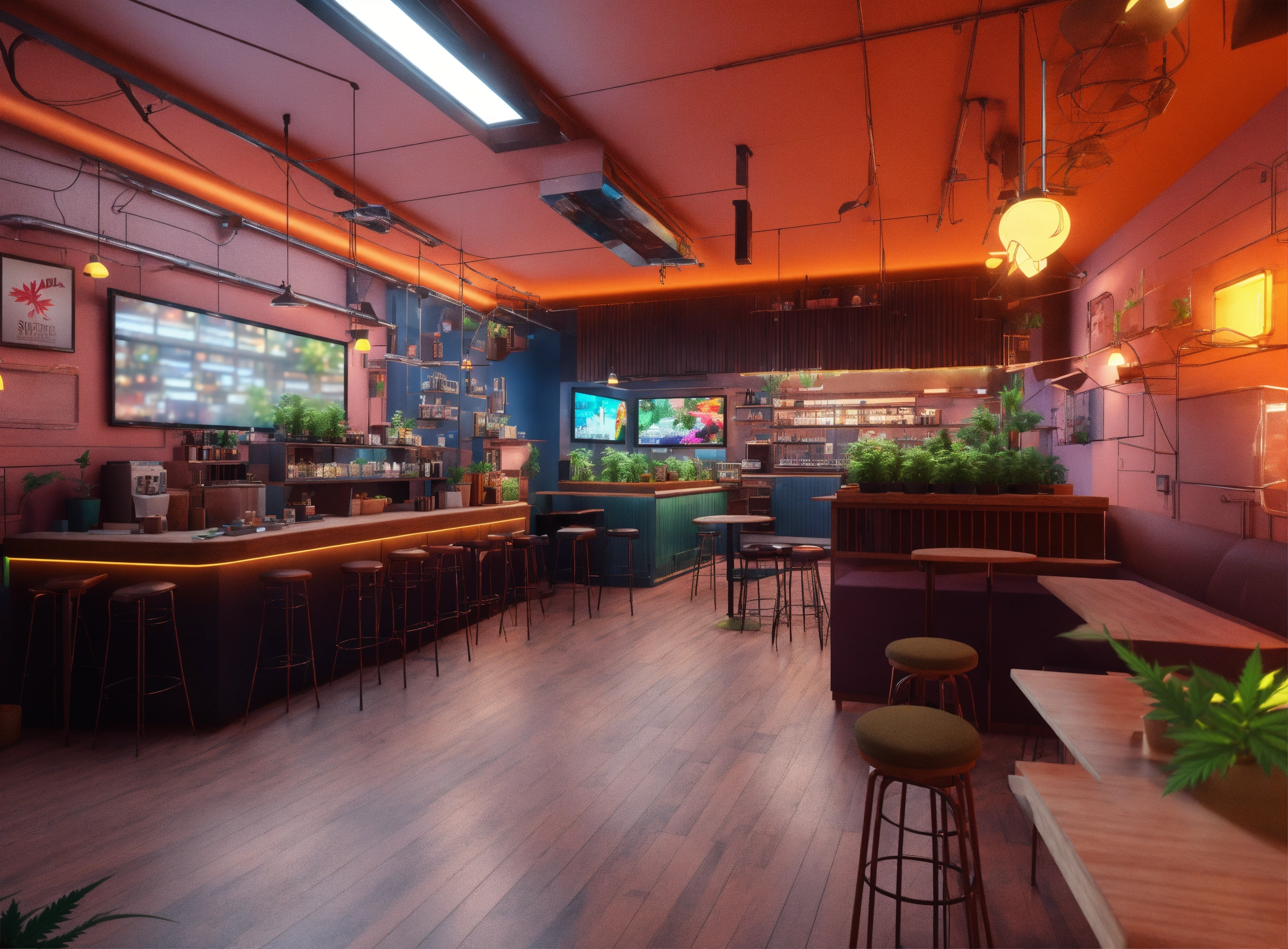 A photorealistic interior 3d render of coffeeshop in cozy neon style with a bar in the middle, no one window, tv on the walls, glass grow box with cannabis plant inside, vray, arnold