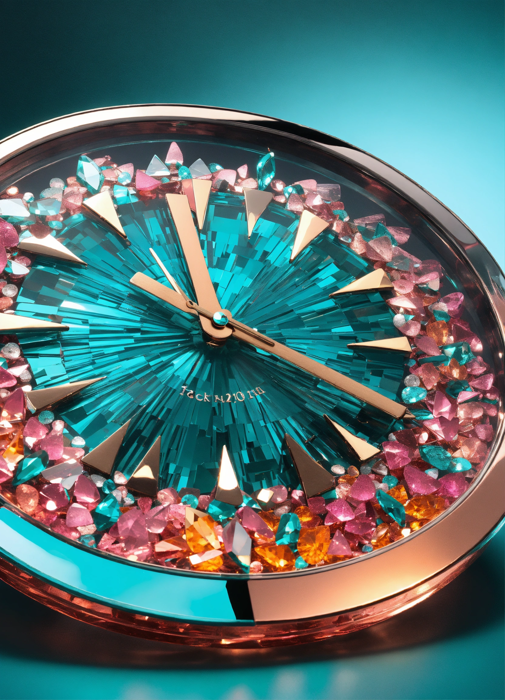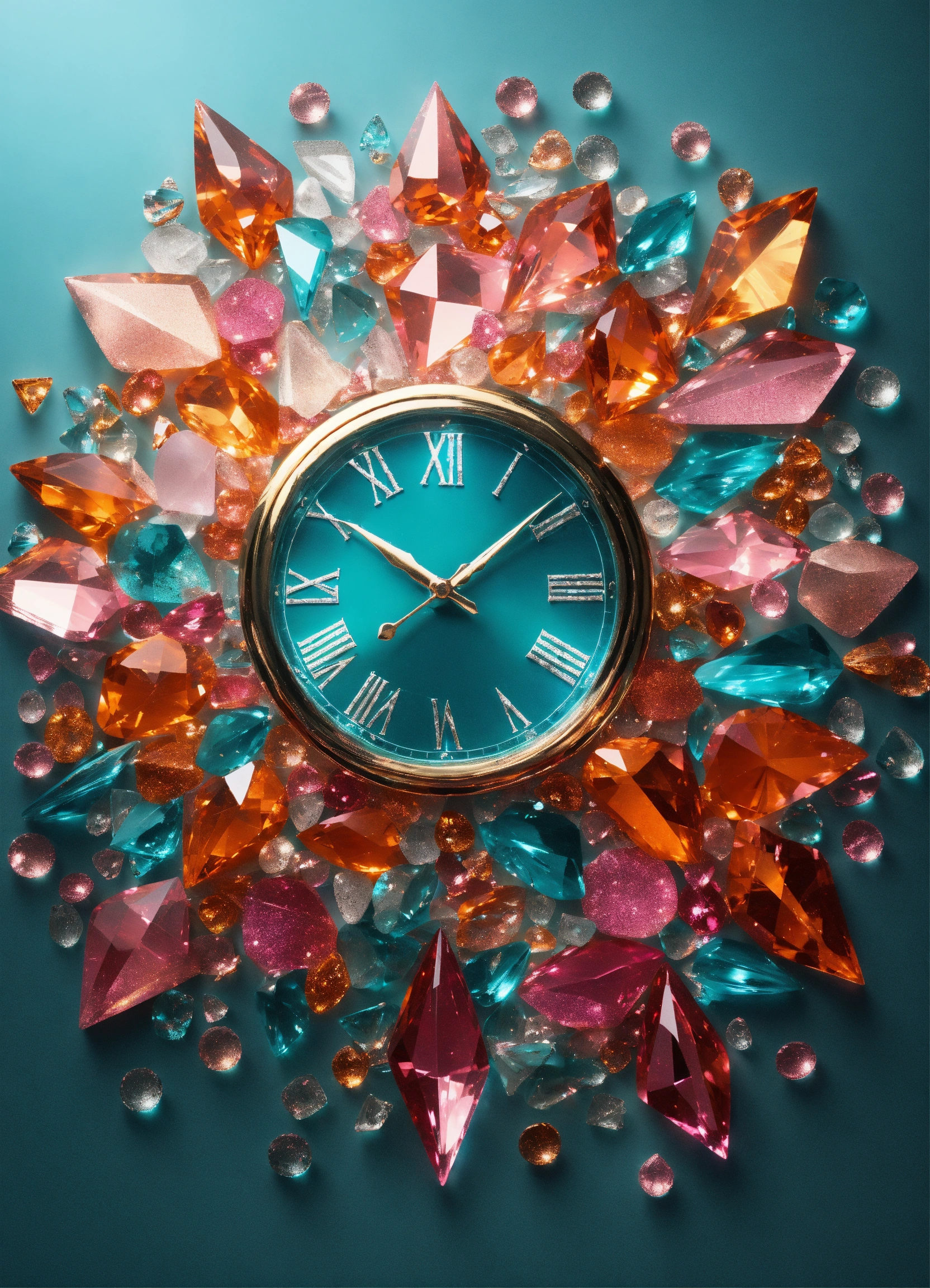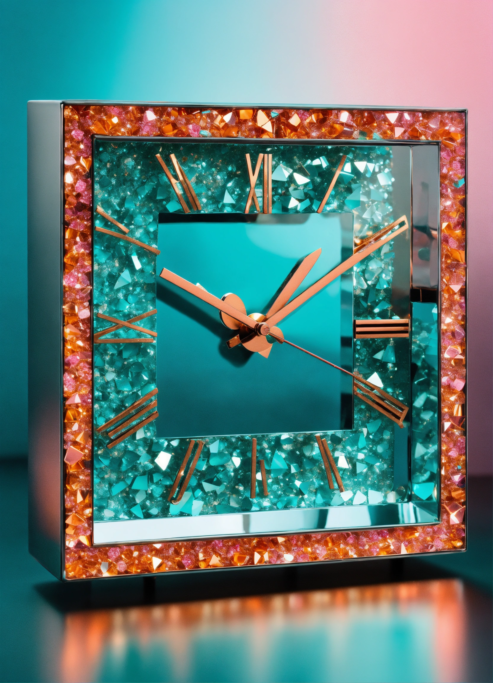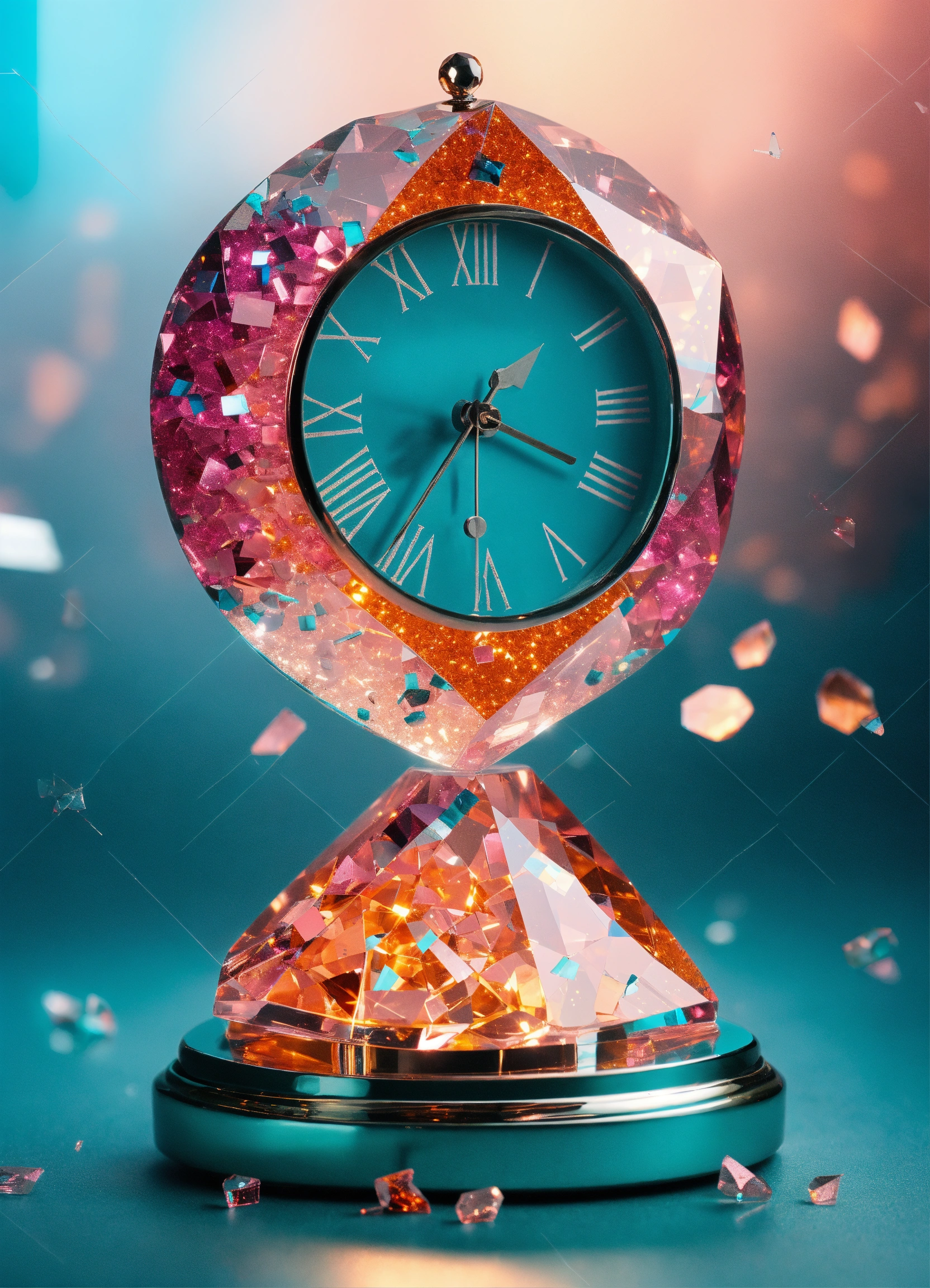 Clock made of sparkling diamond glass fragments in deep turquoise, orange and pink shades. shiny, elegant. light background