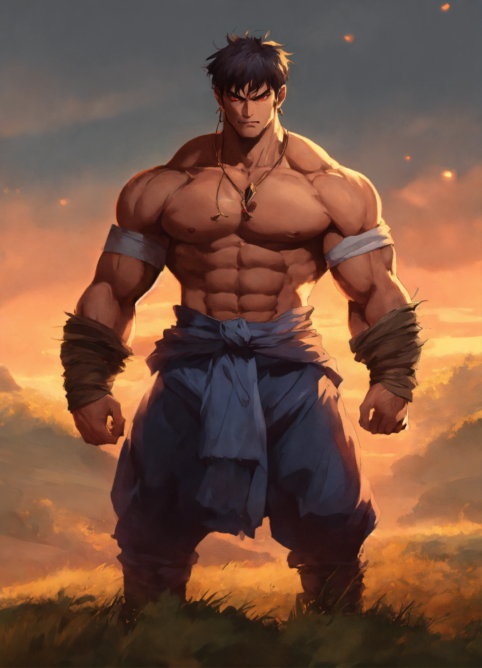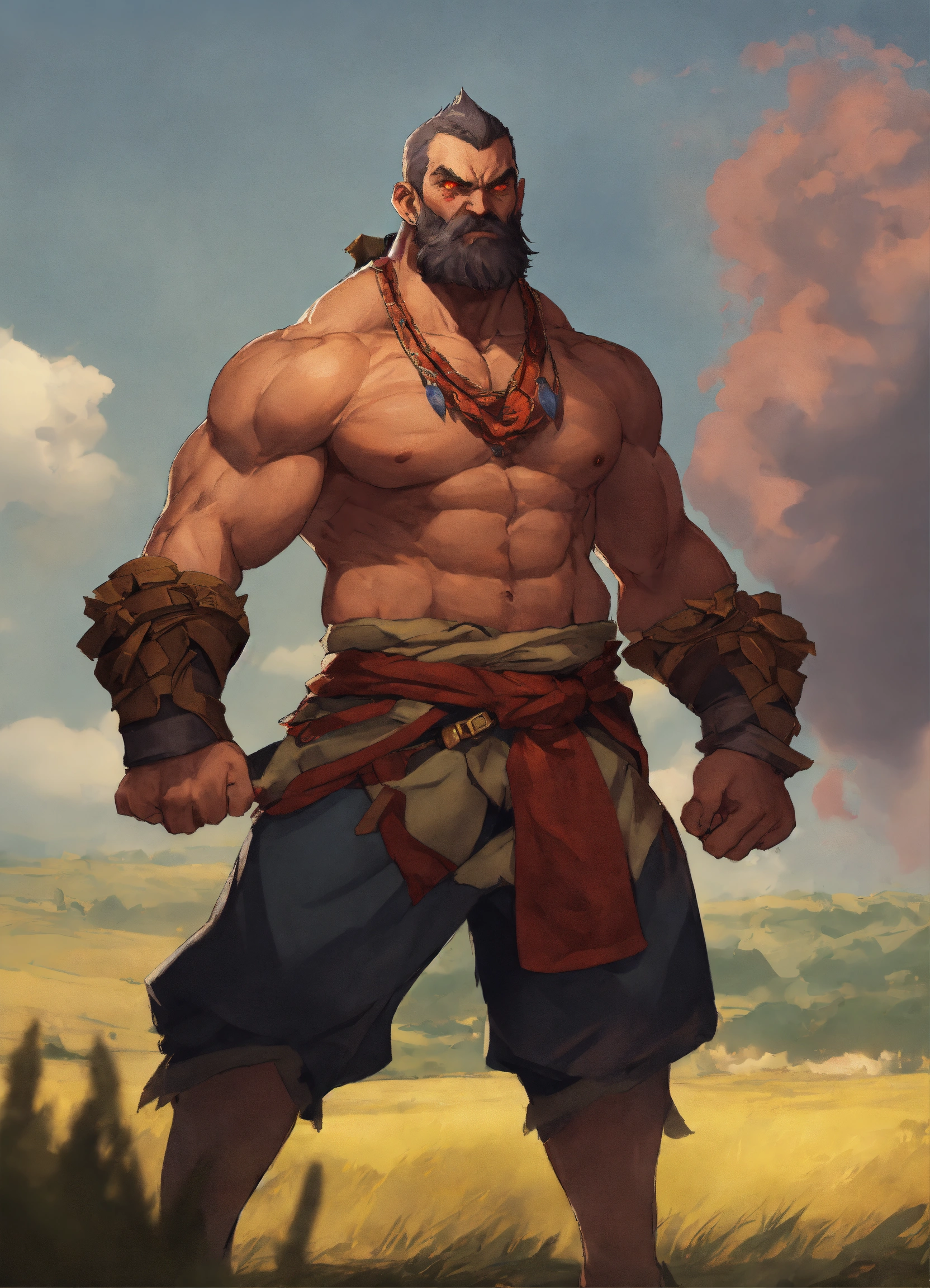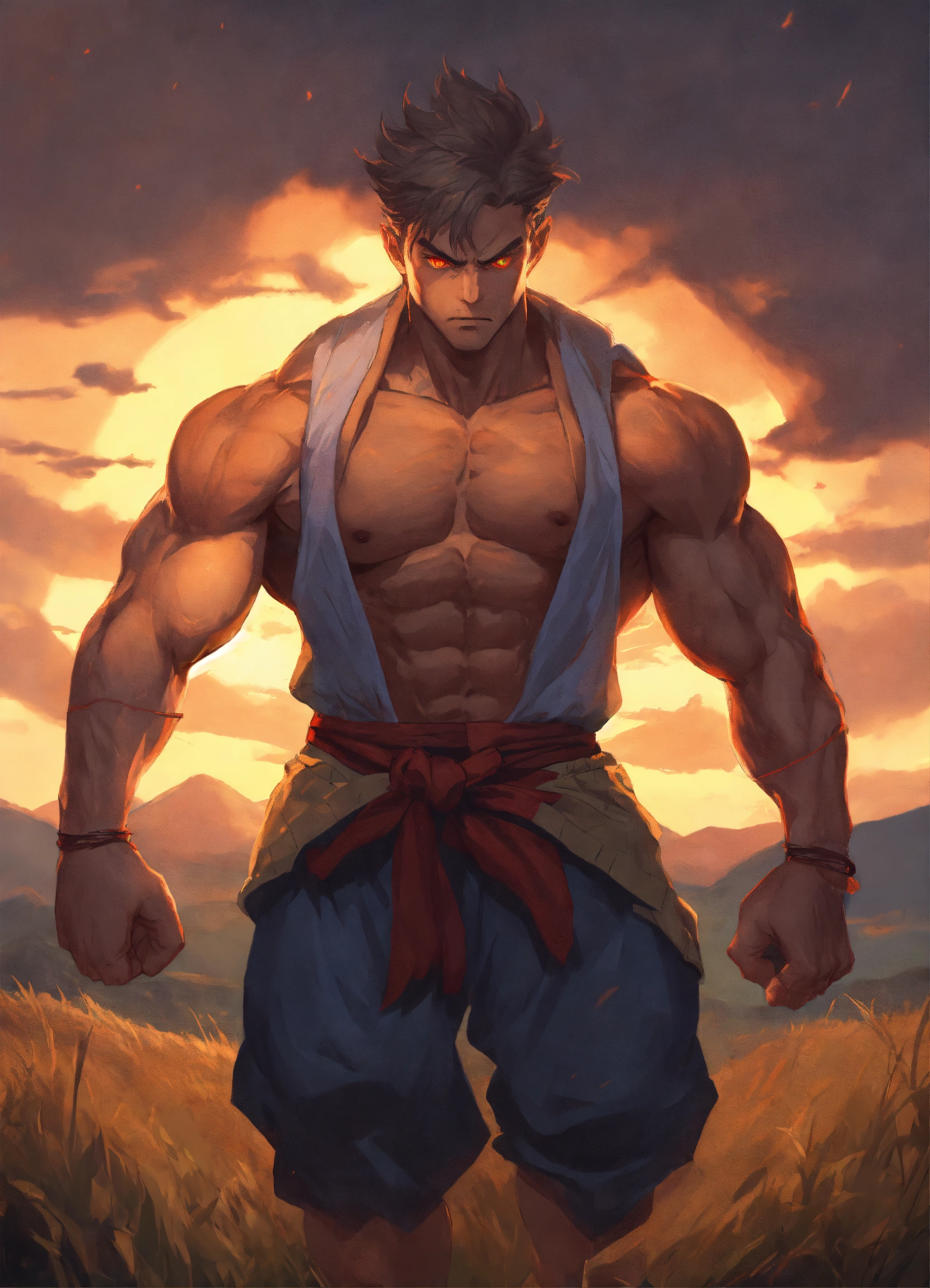 Man with short hair, glowing eyes, 4 arms, muscular, evil aura, plain country landscape, old fashioned cloths, worrier, sakuna, monster, multiple arms, realistic