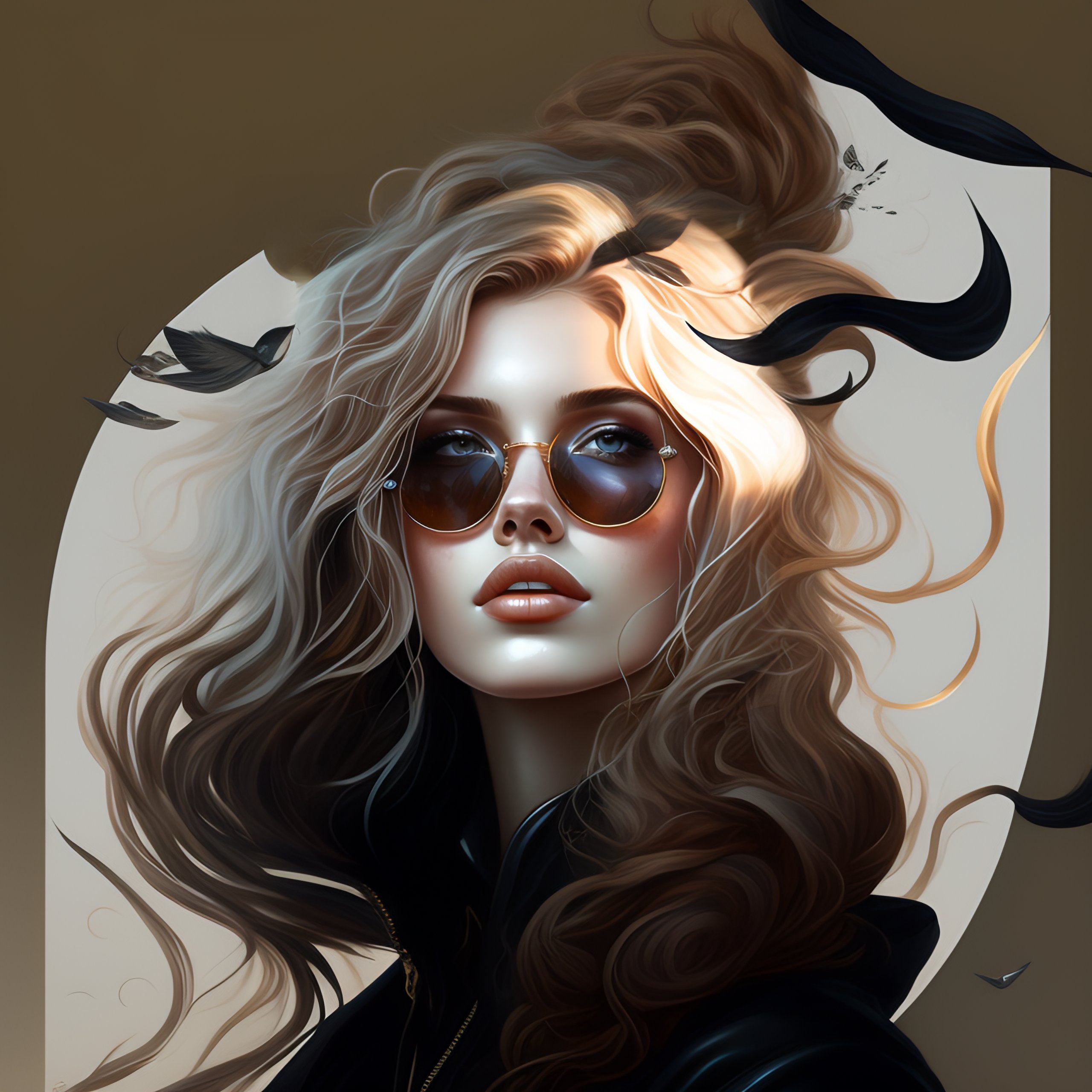 Black round shades, a full body portrait of a beautiful wild, intricate, elegant, highly detailed, digital painting, artstation, concept art, smooth, sharp focus, illustration, brown hair, black jacket, youthful, hannah murray, round face, messy hair, hippy, freckles