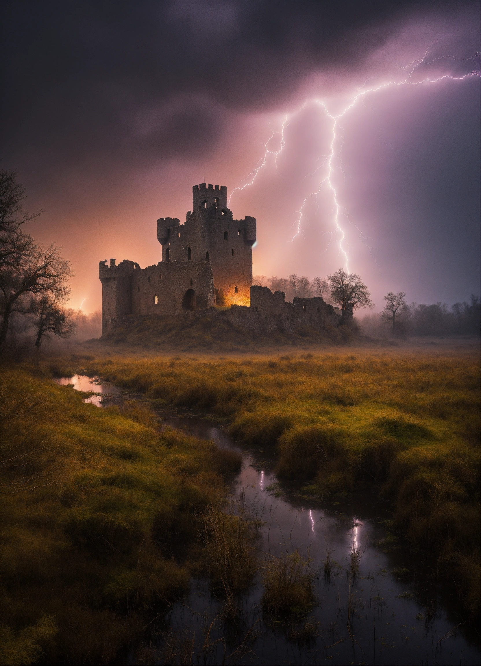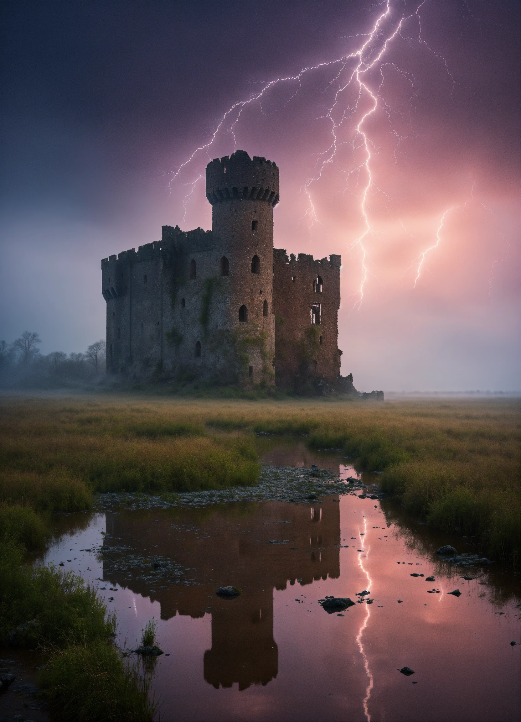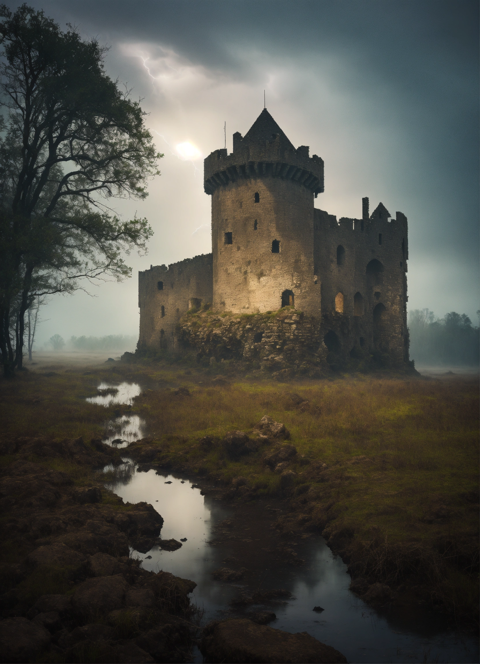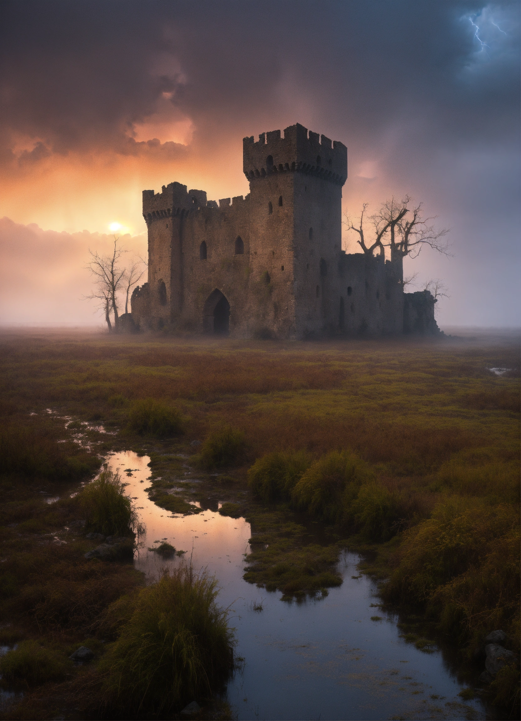Ruin of a stone castle in the middle of a foggy barren swamp landscape, medieval setting, evening lightning