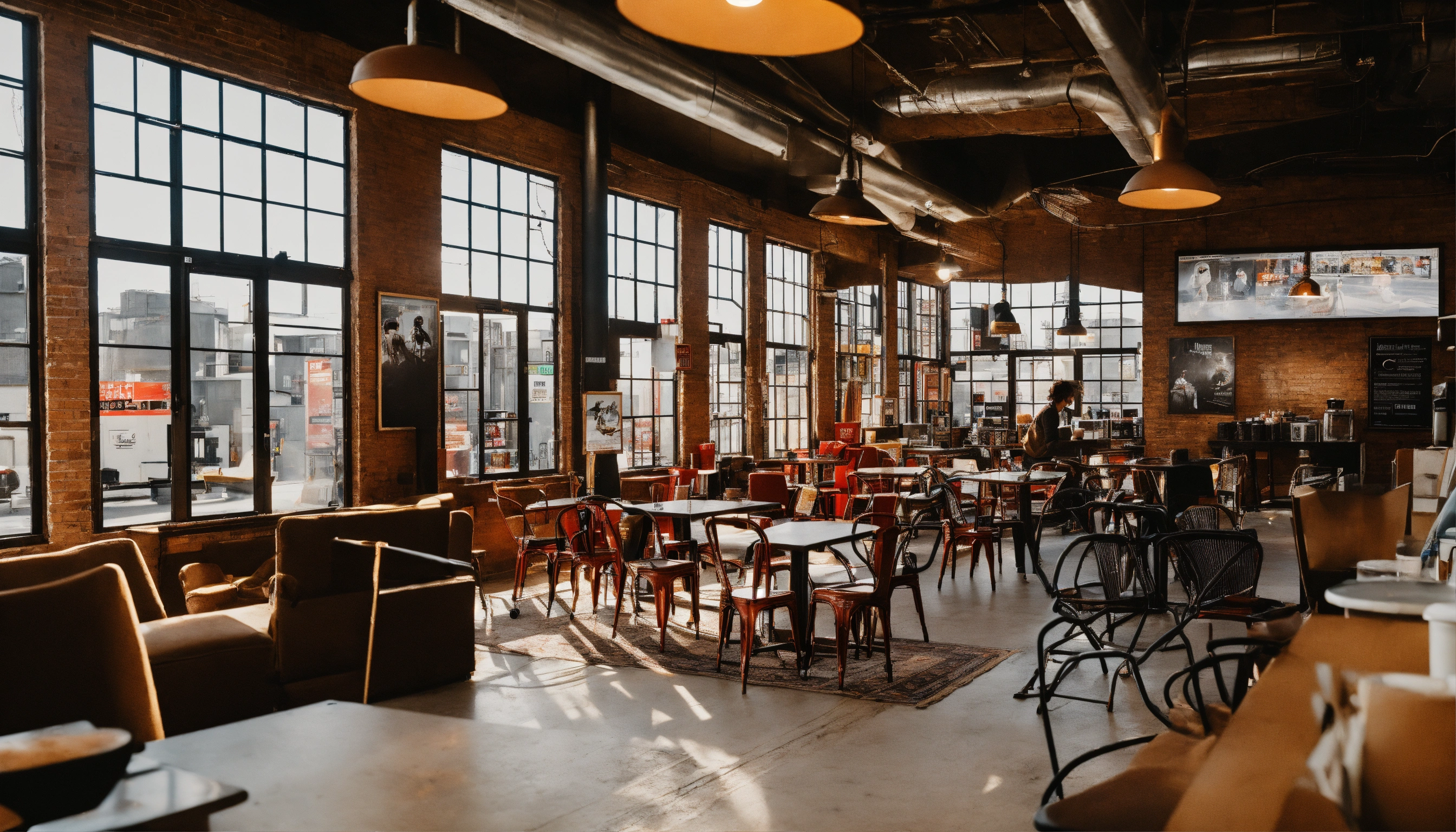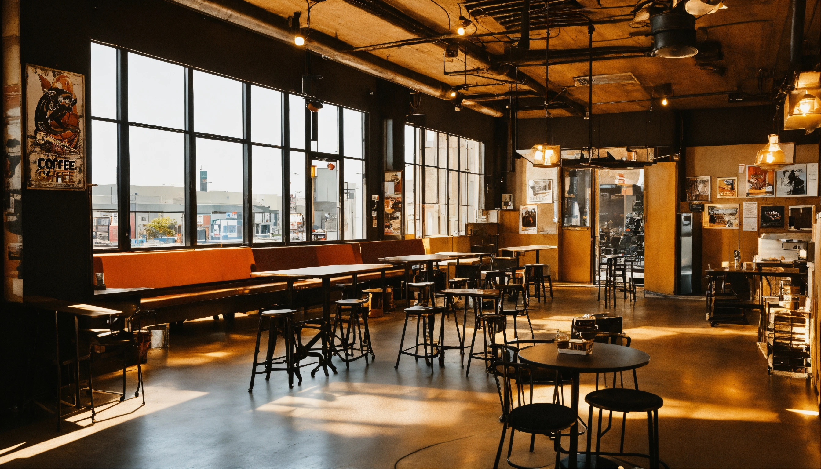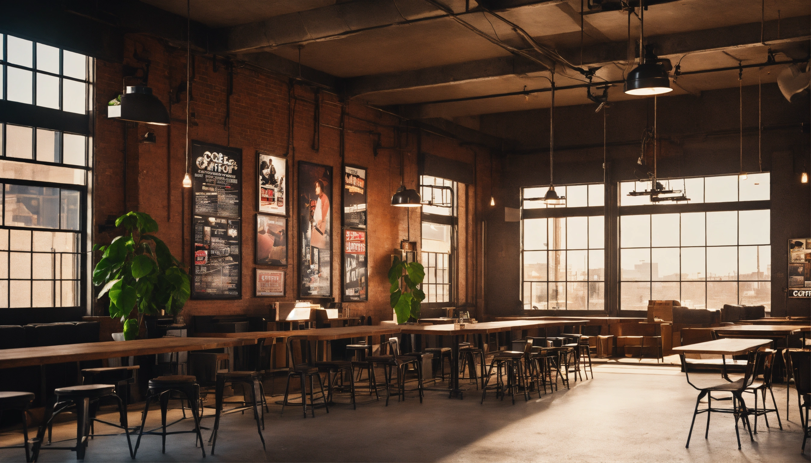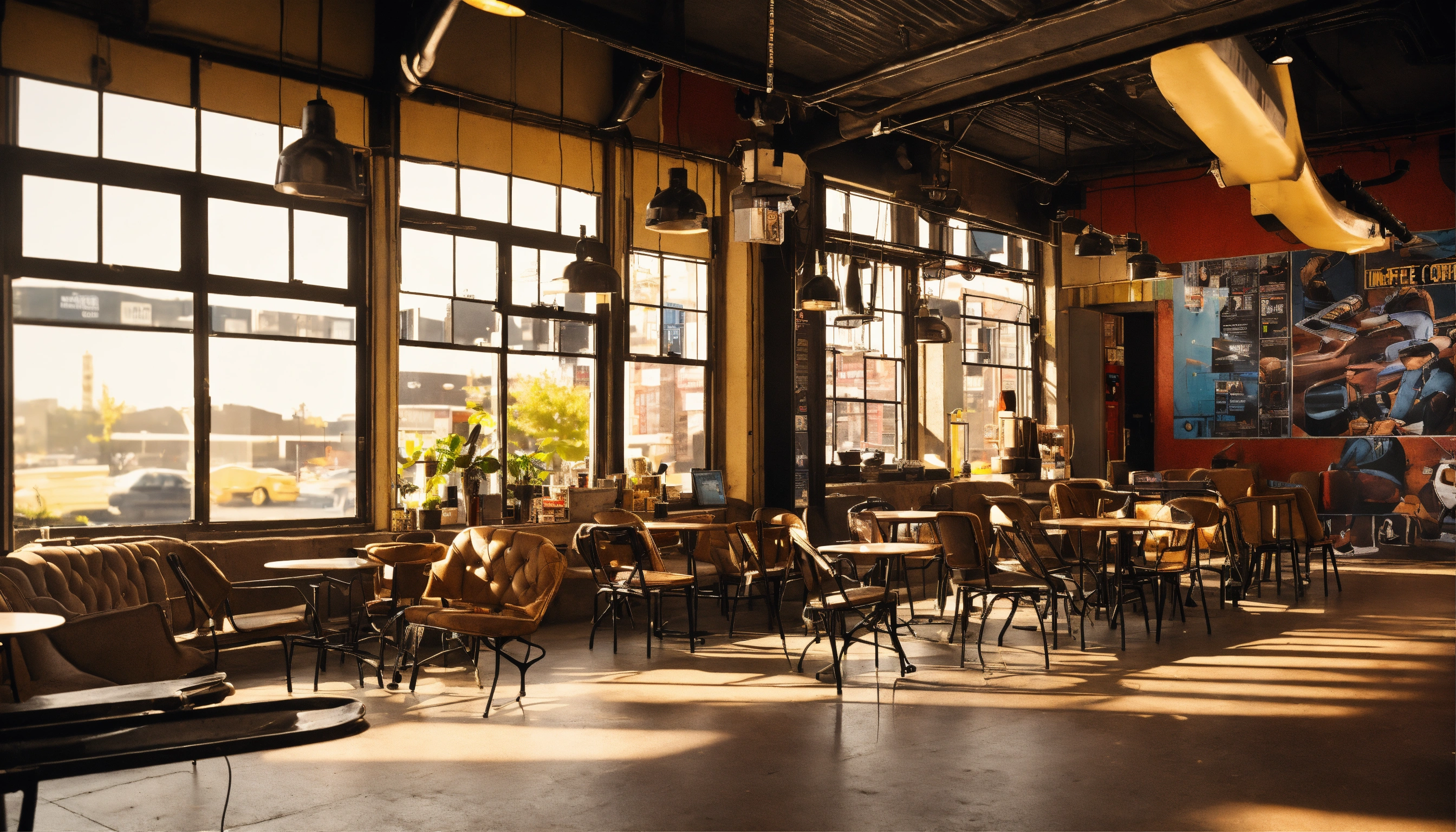 Cool coffee shop closed, interior, big windows, skater vibe decoration, cool chairs, cleaning, boxes, posters on walls, cinematic, industrial, skater