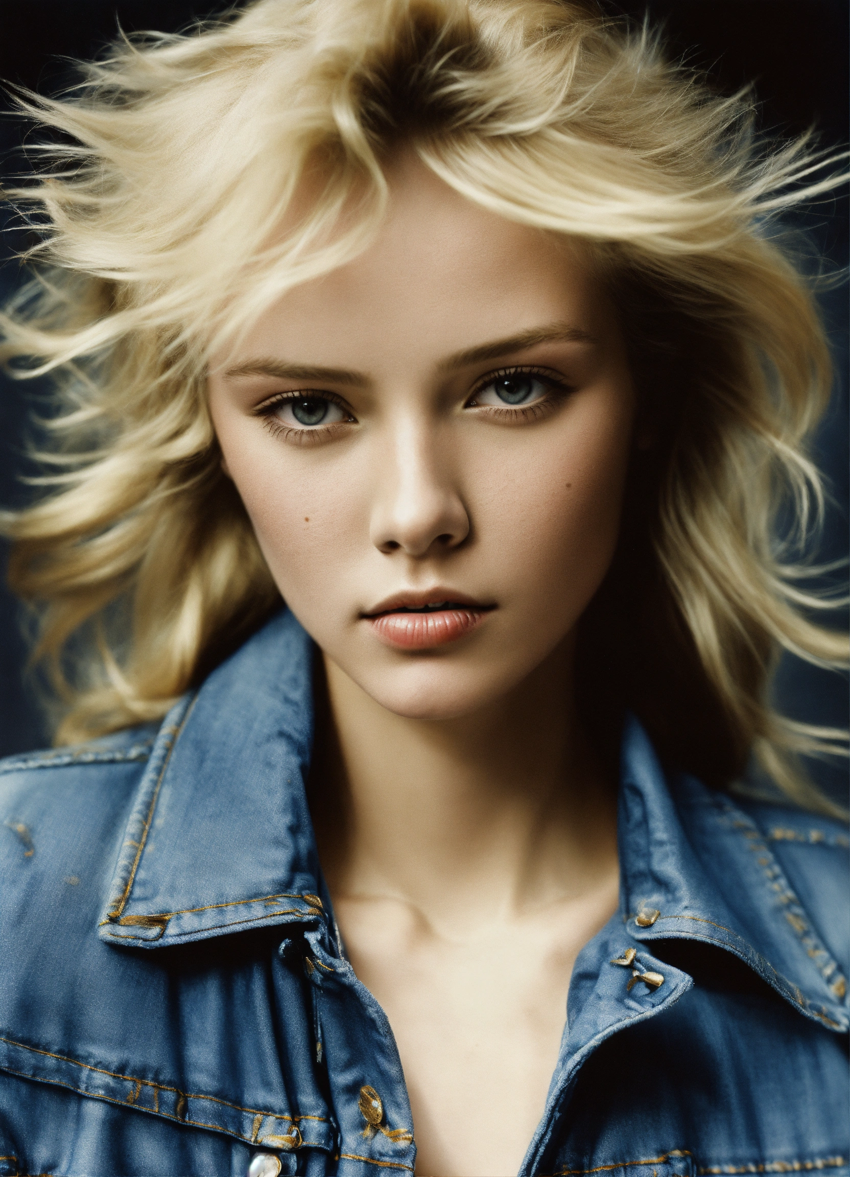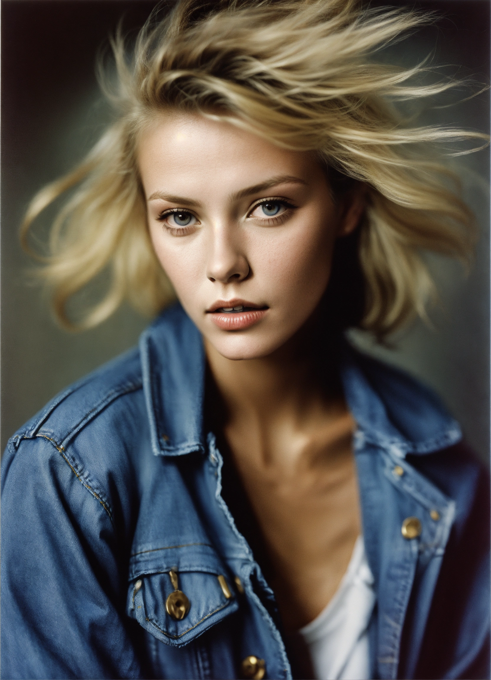 A mysterious photo of a blond girl in a denim jacket, very short wild spikes photorealistic portrait, by richard avedon.