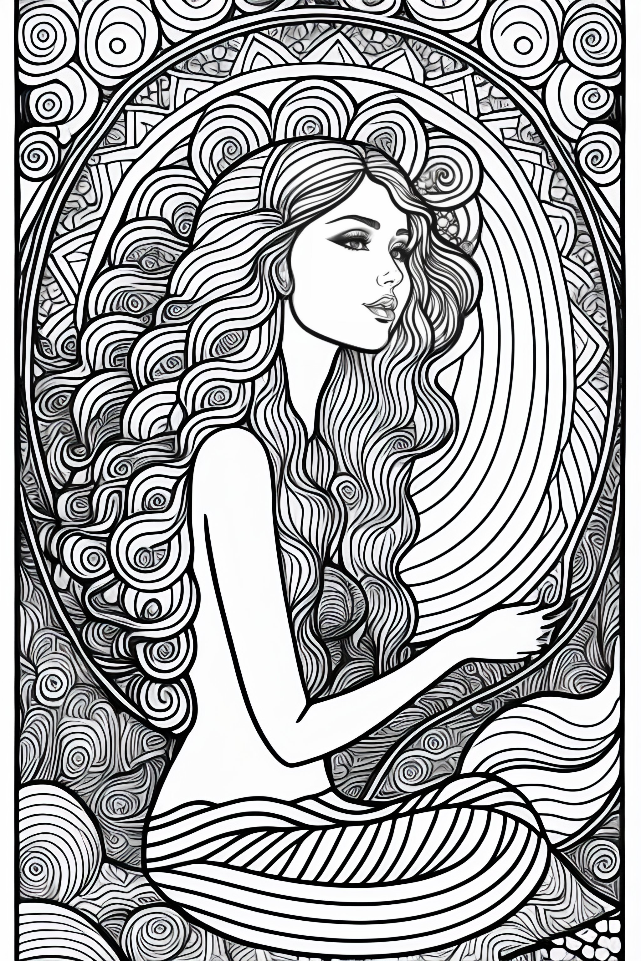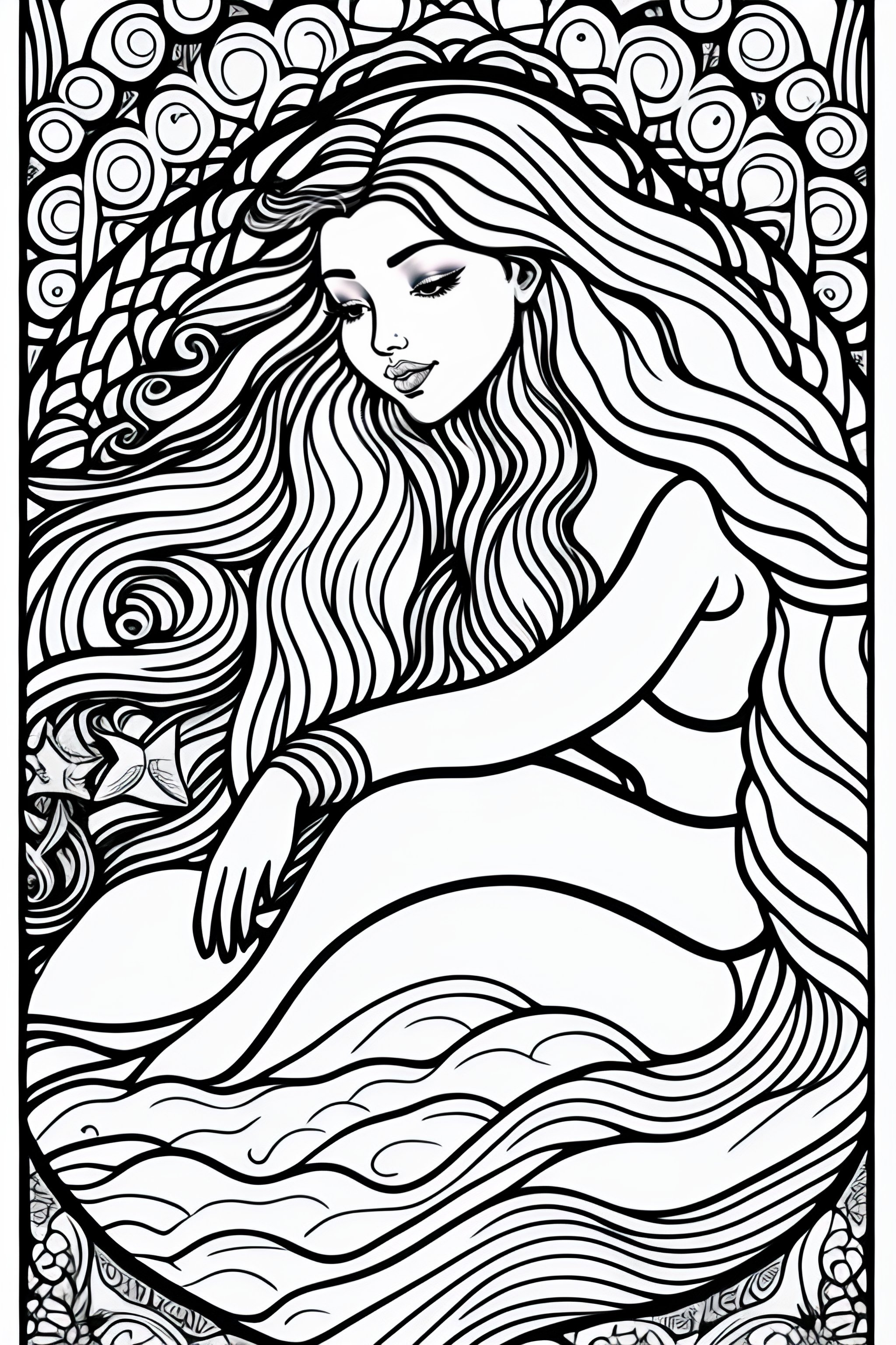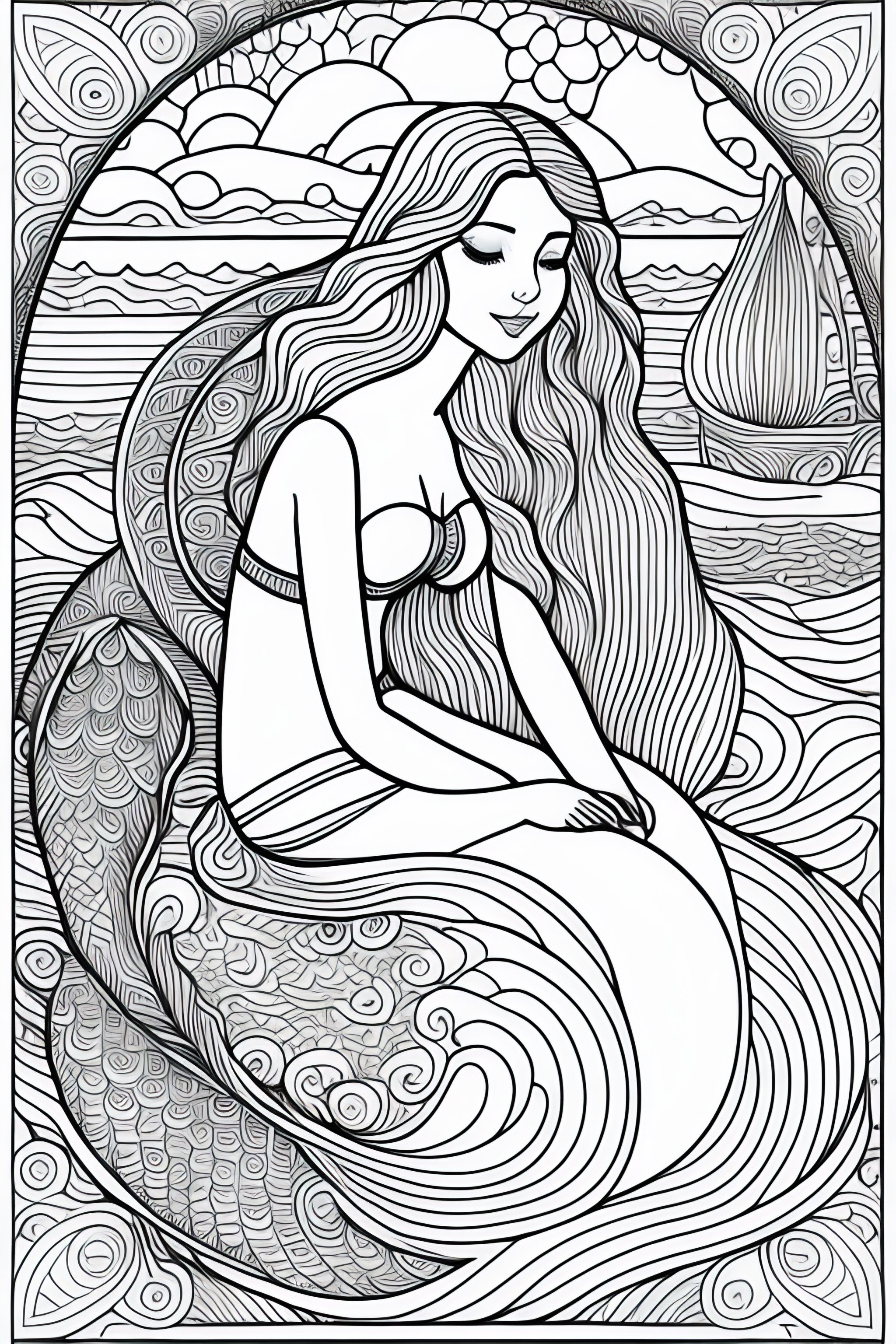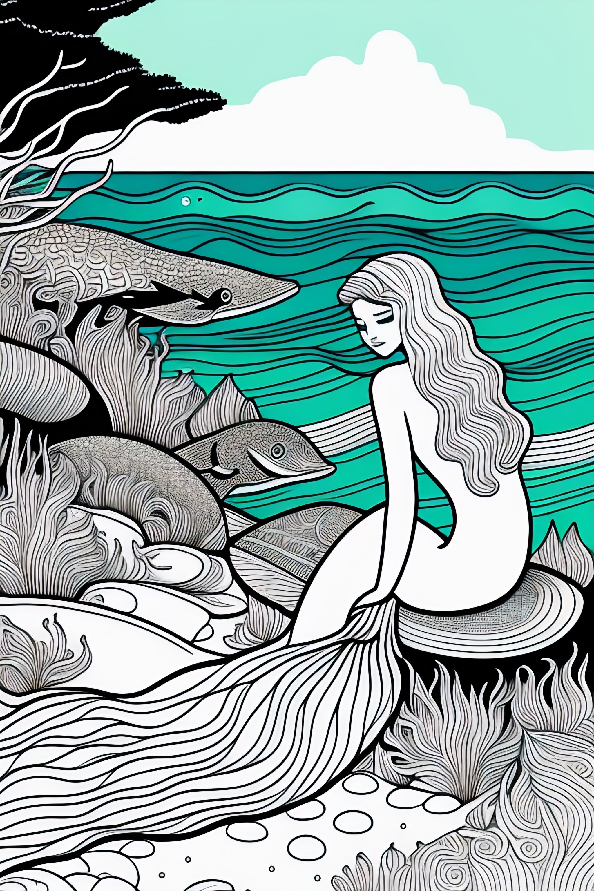 Coloring page for teen mermaid clean line art detailed white space for coloring mermaid sitting on a beach --ar 2:3