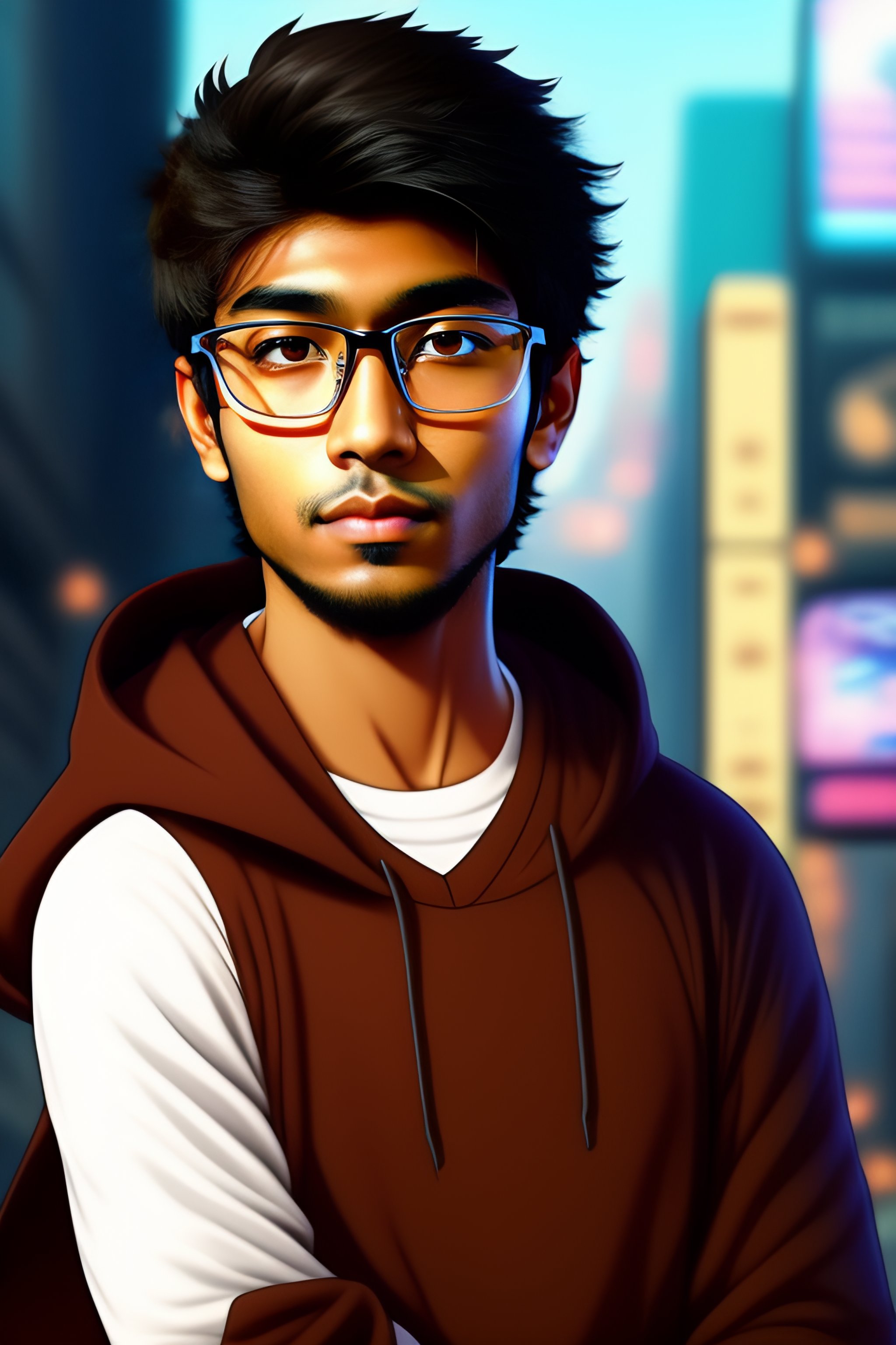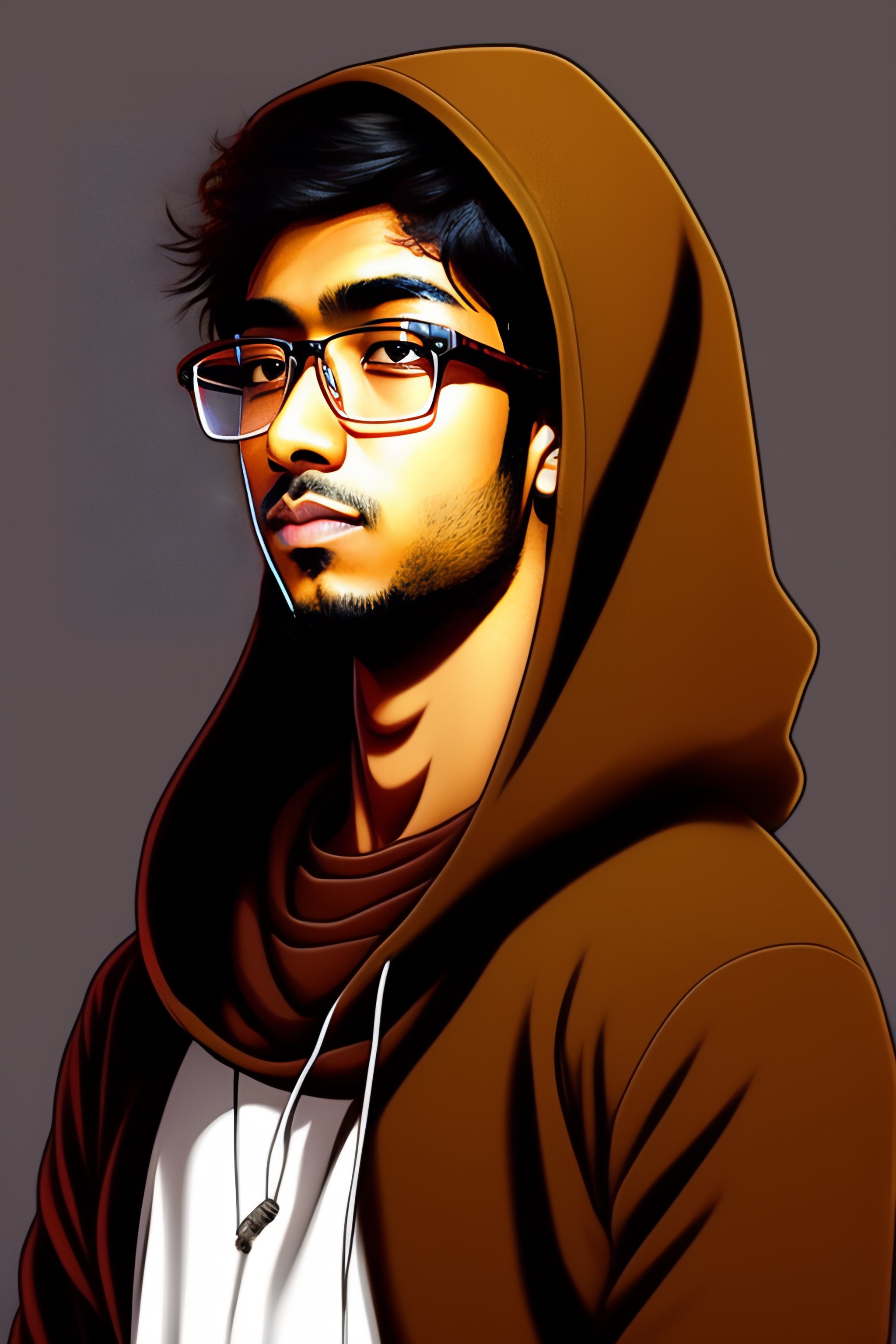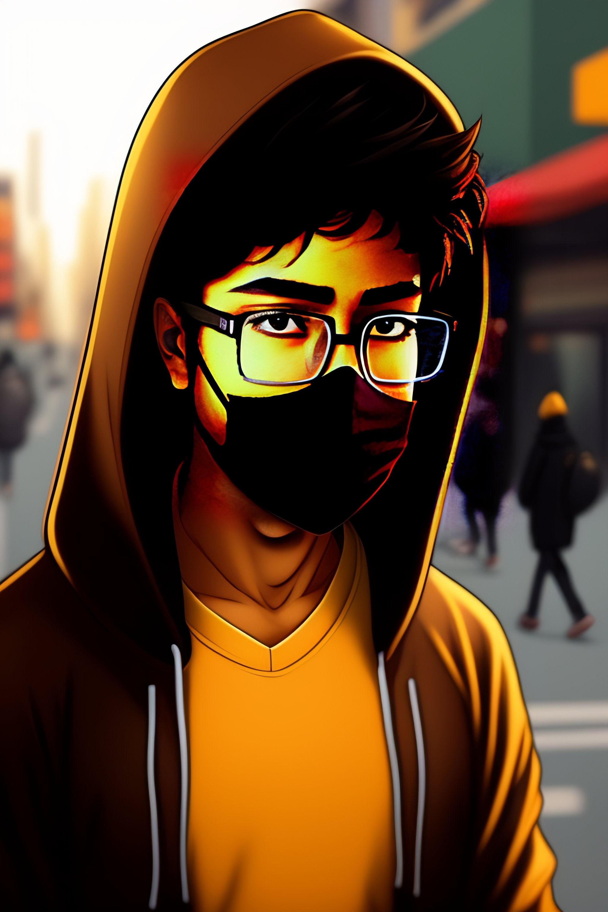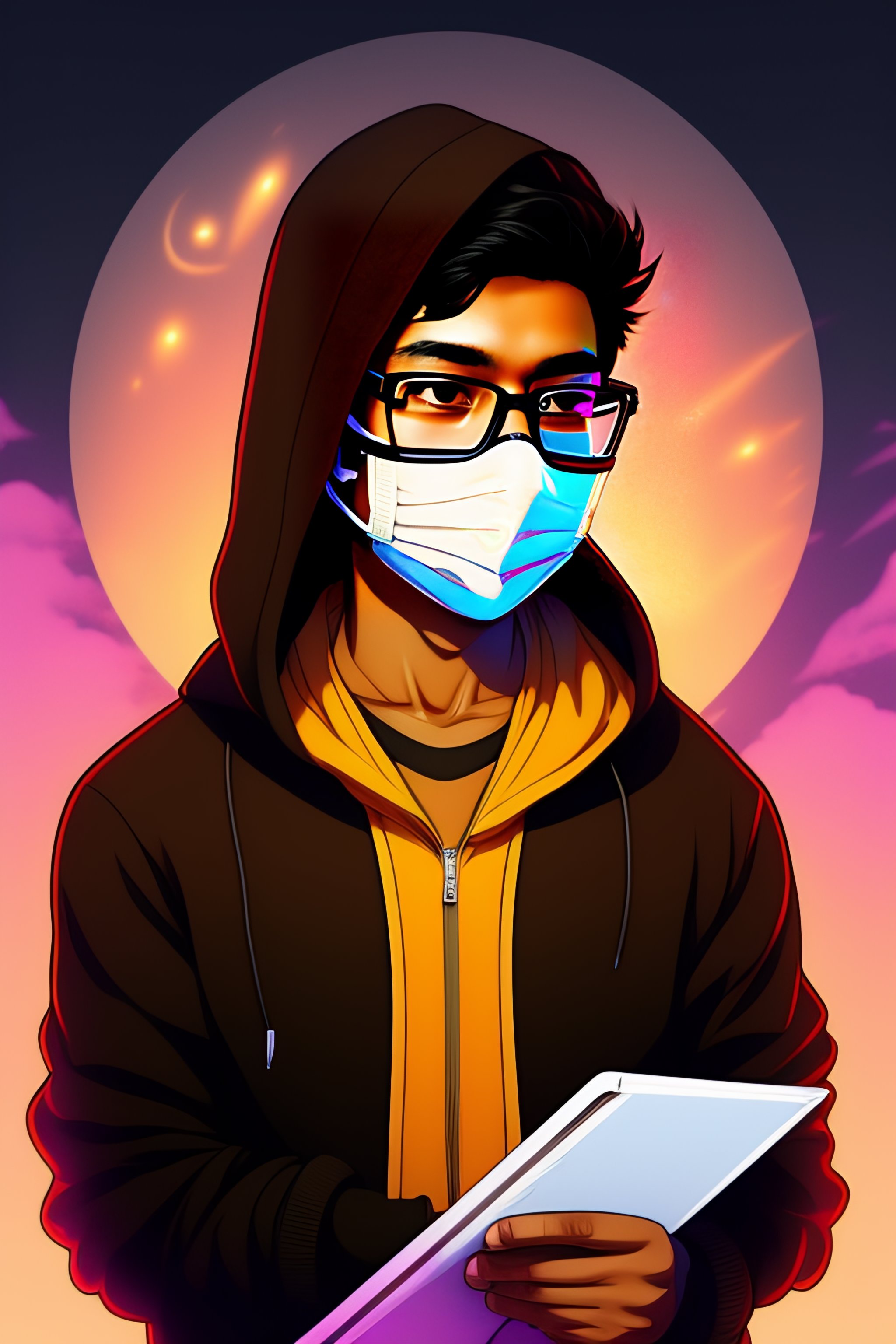 Anime brown guy in black hoodie, wearing mask, indian, coder, brown face, glasses, light brown skin, hacker, no expression, no emotion, no background, anime style, manga, cartoon, anime