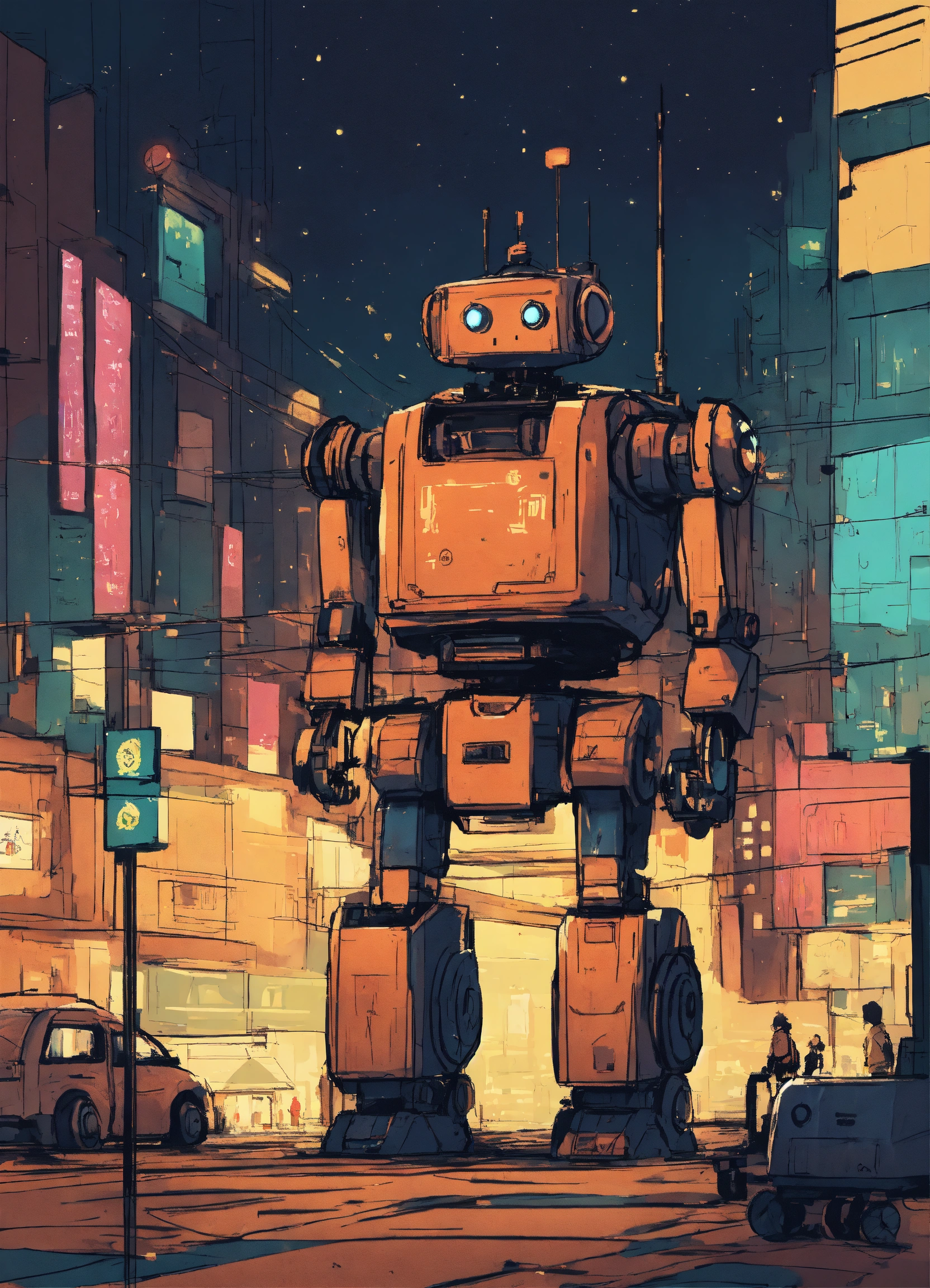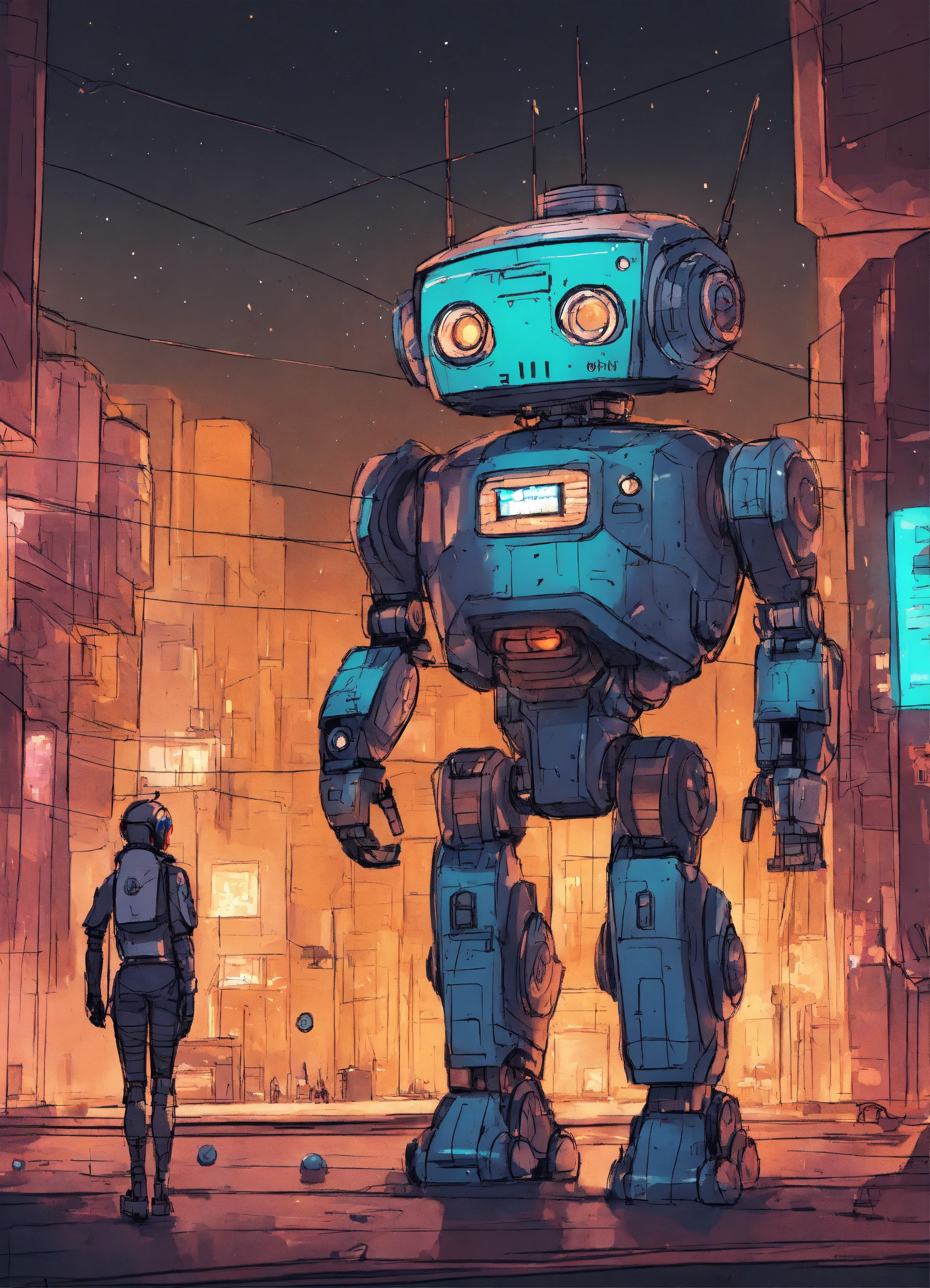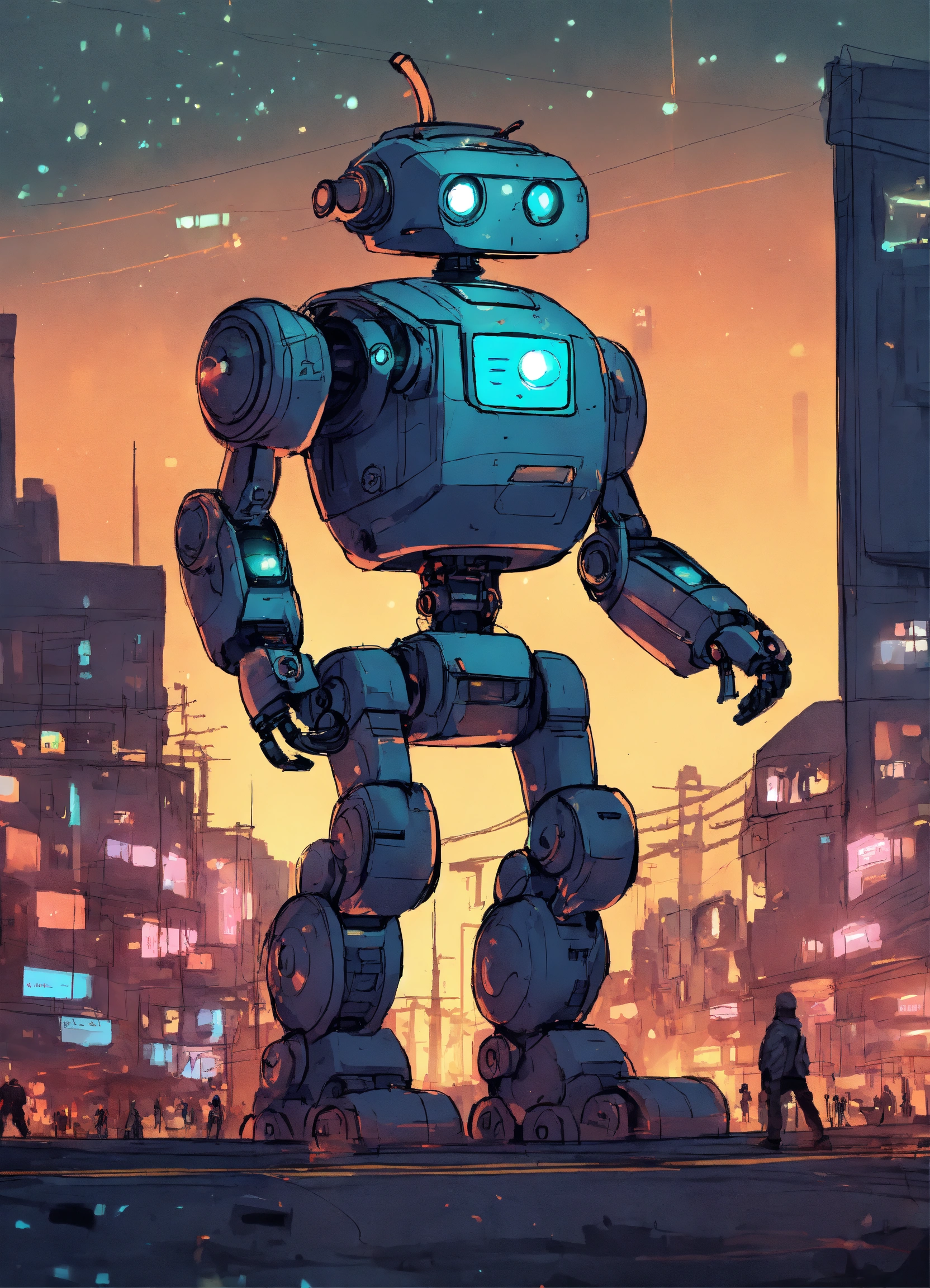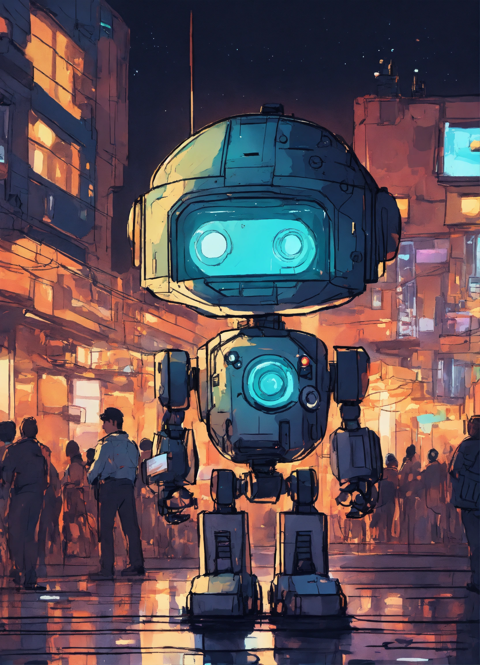 Minimalist color sketch of sci-fi cute robot in a massive crowded scifi city at night, sketch, rough, first draft, intricate details, cute expression, big eyes