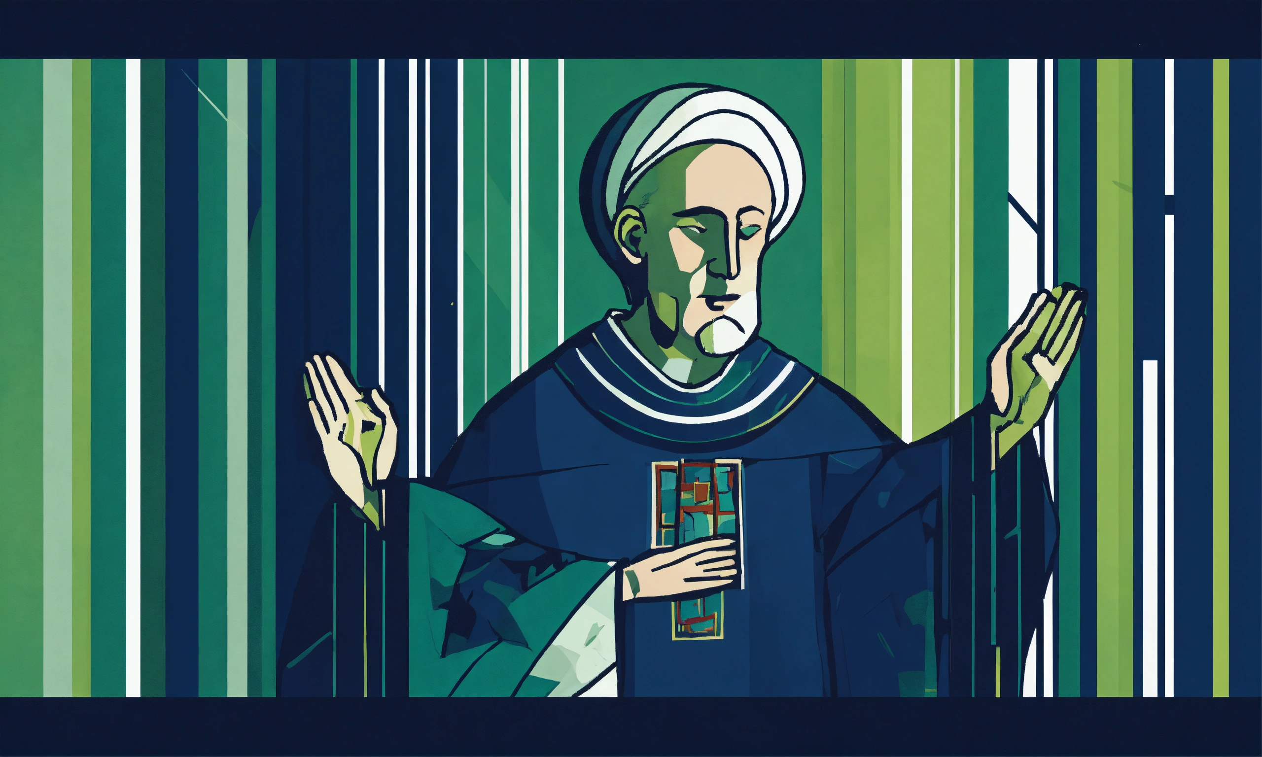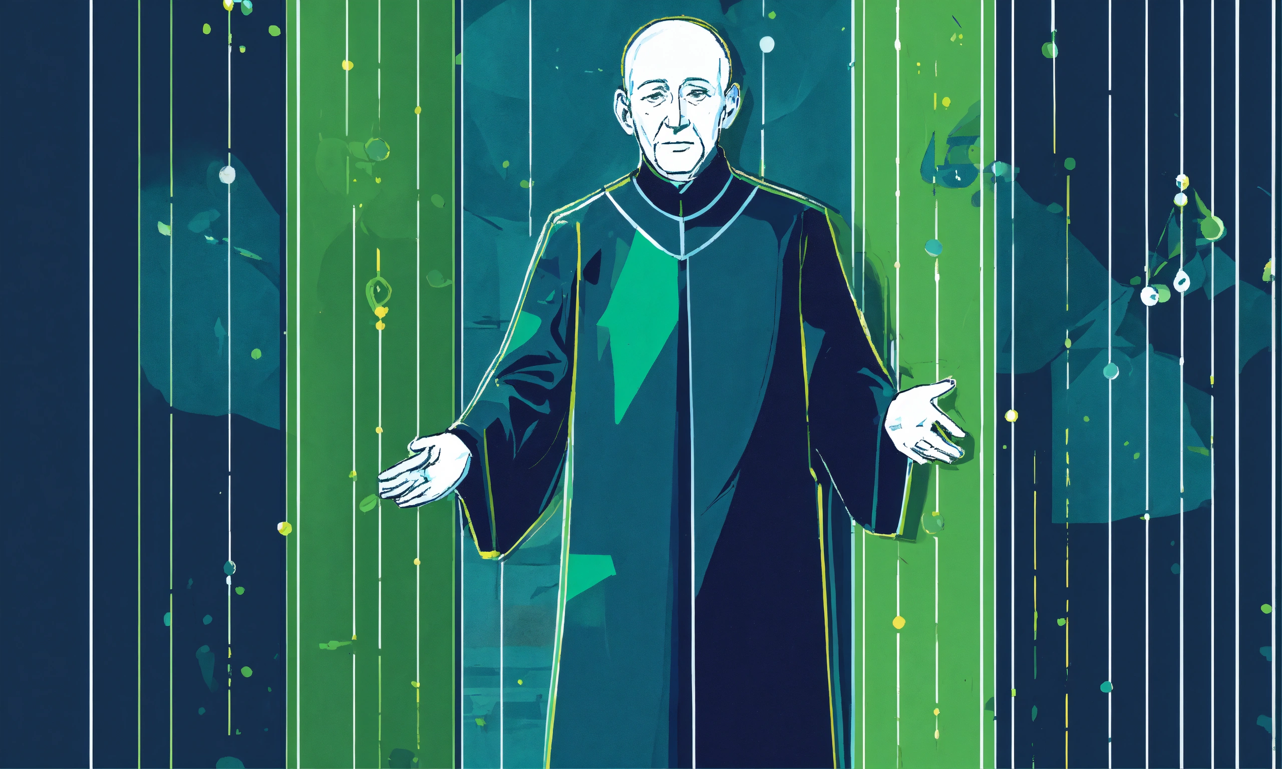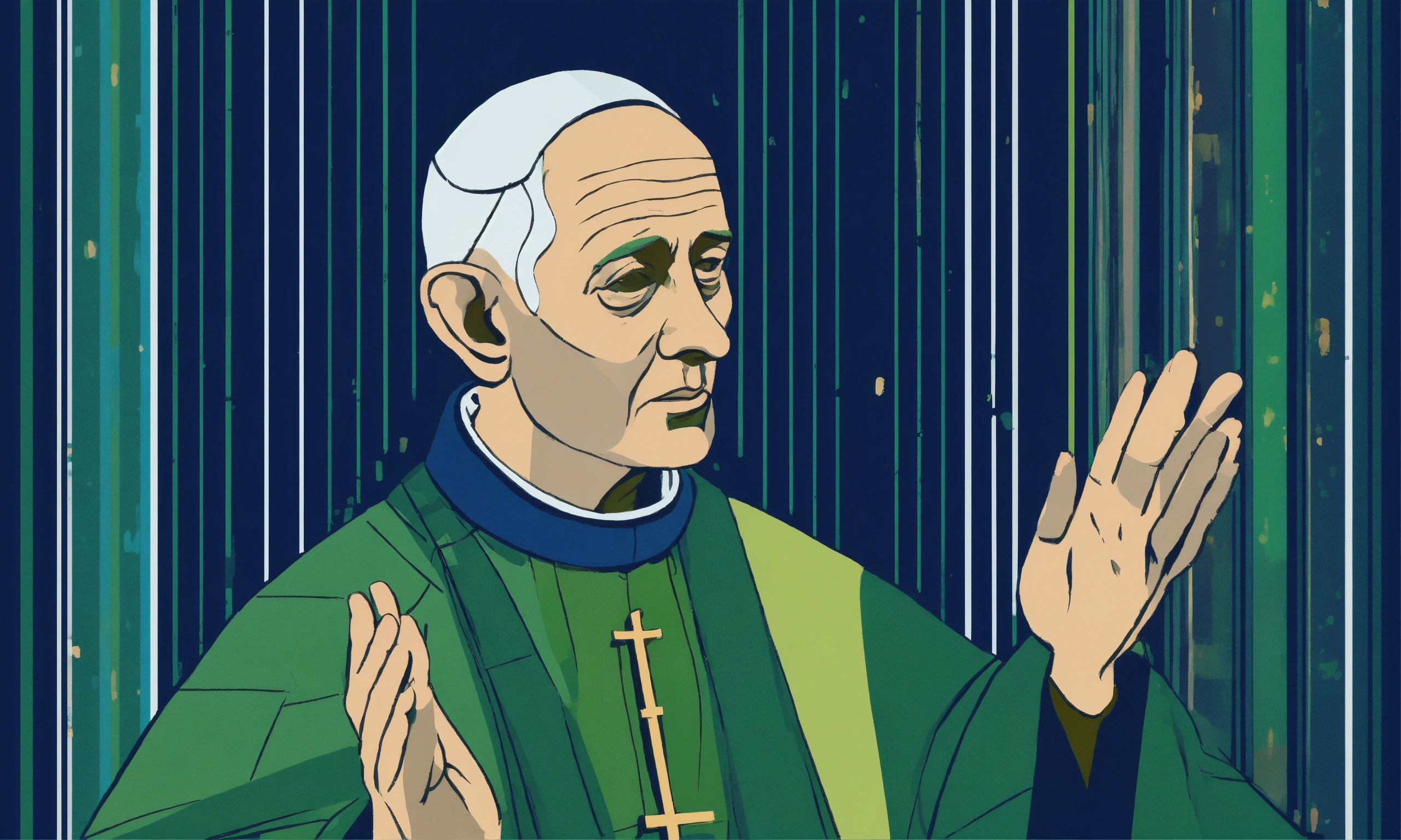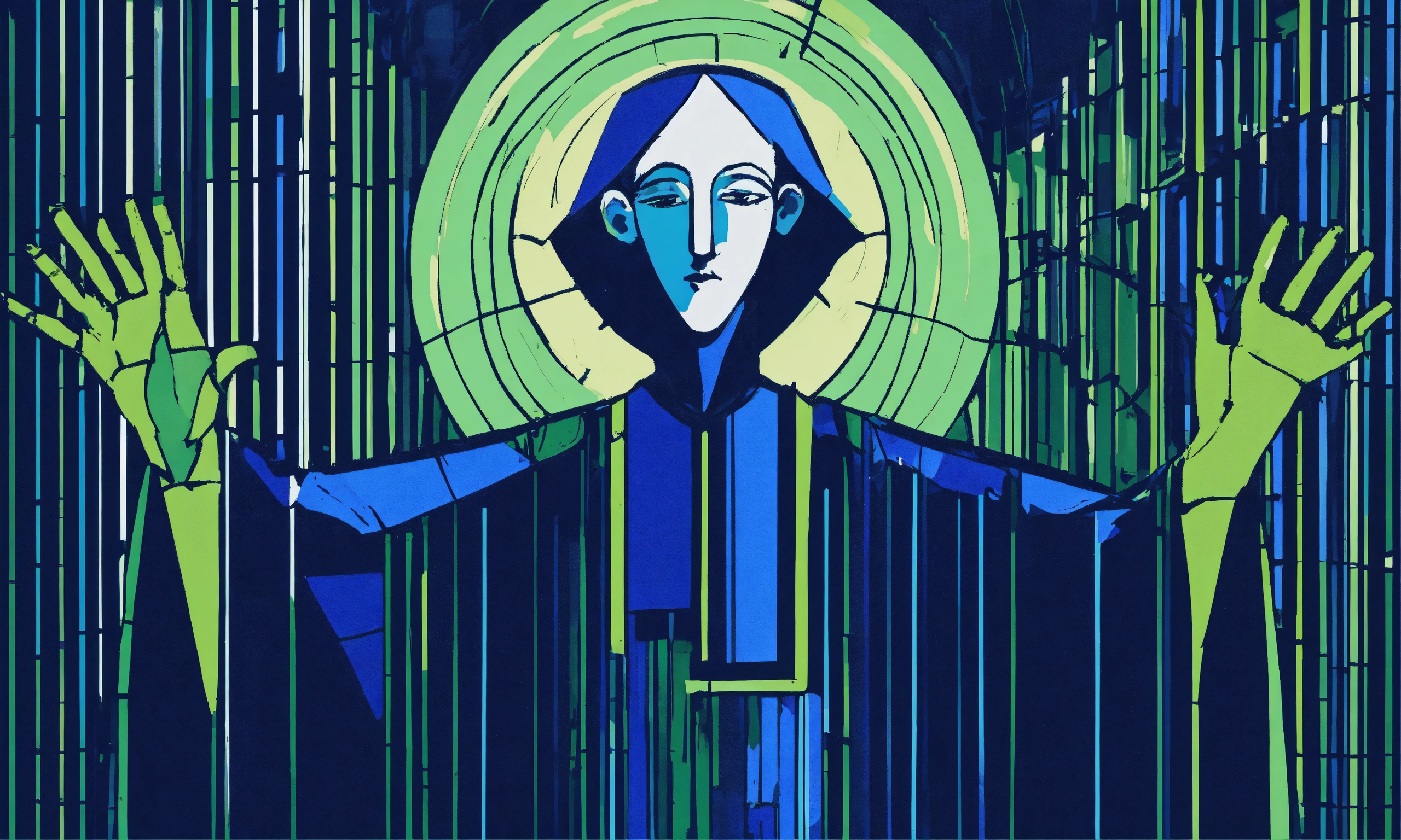 Illustration of a priest talking with hands up, maatrix in the style of picasso, dark blue, light green, white, data lines